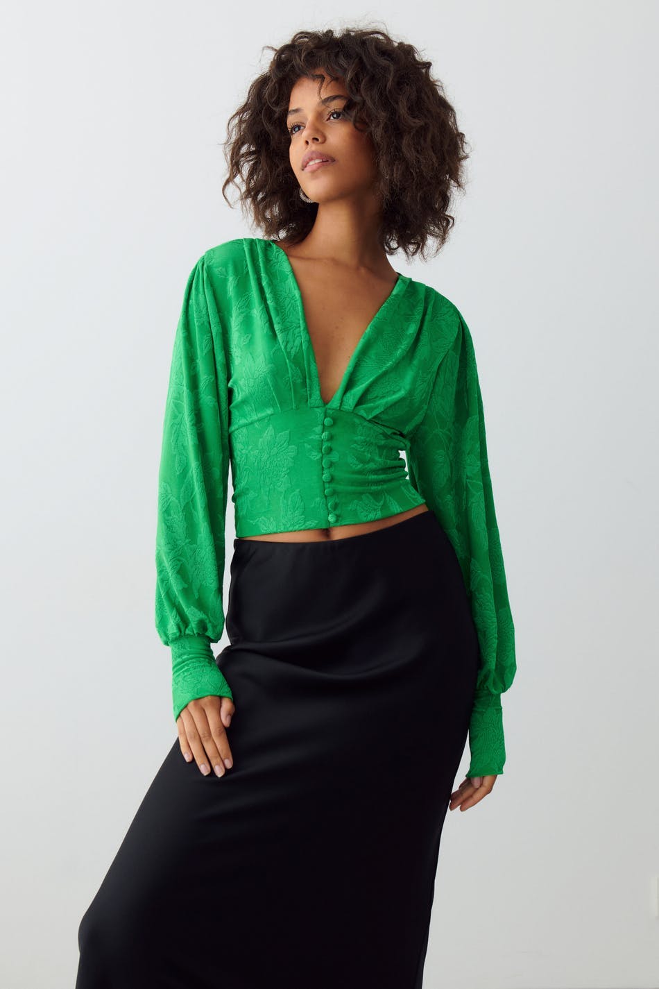 Langärmliges Oberteil aus Jersey mit tiefem Ausschnitt. Das Oberteil ist grün und hat ein elastisches, strukturiertes Material. Es hat Ballonärmel und eine abgeschnittene Länge.