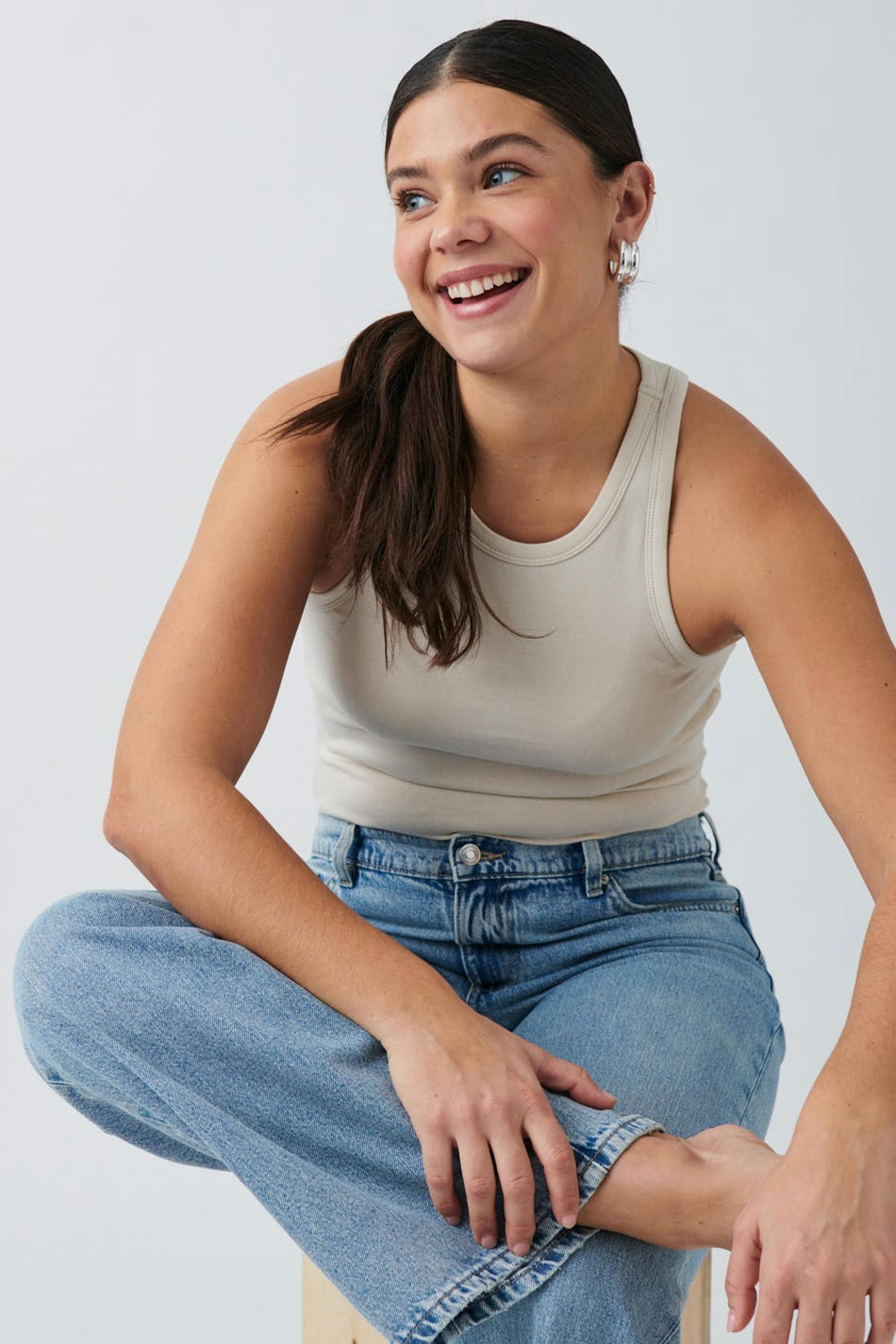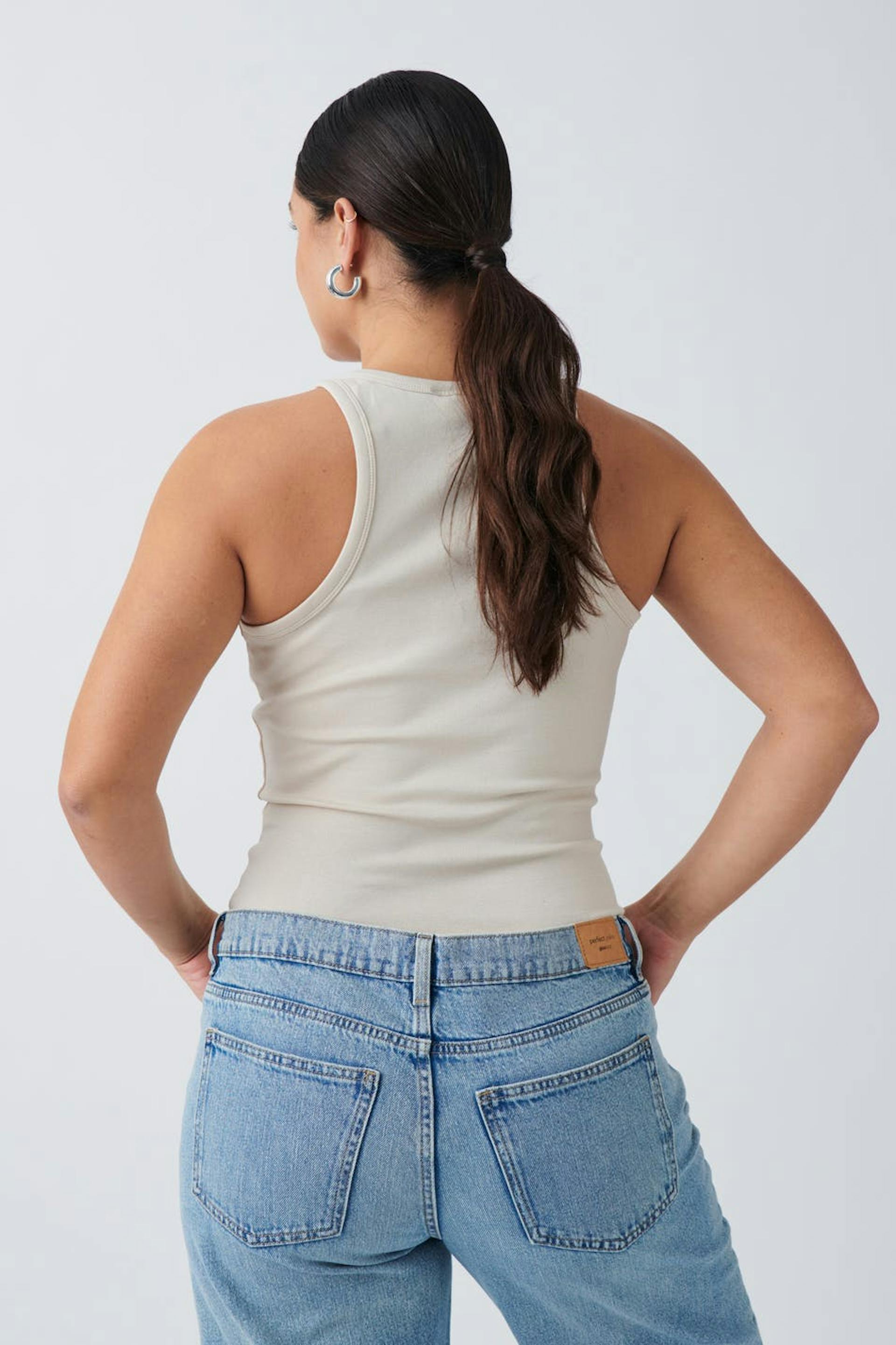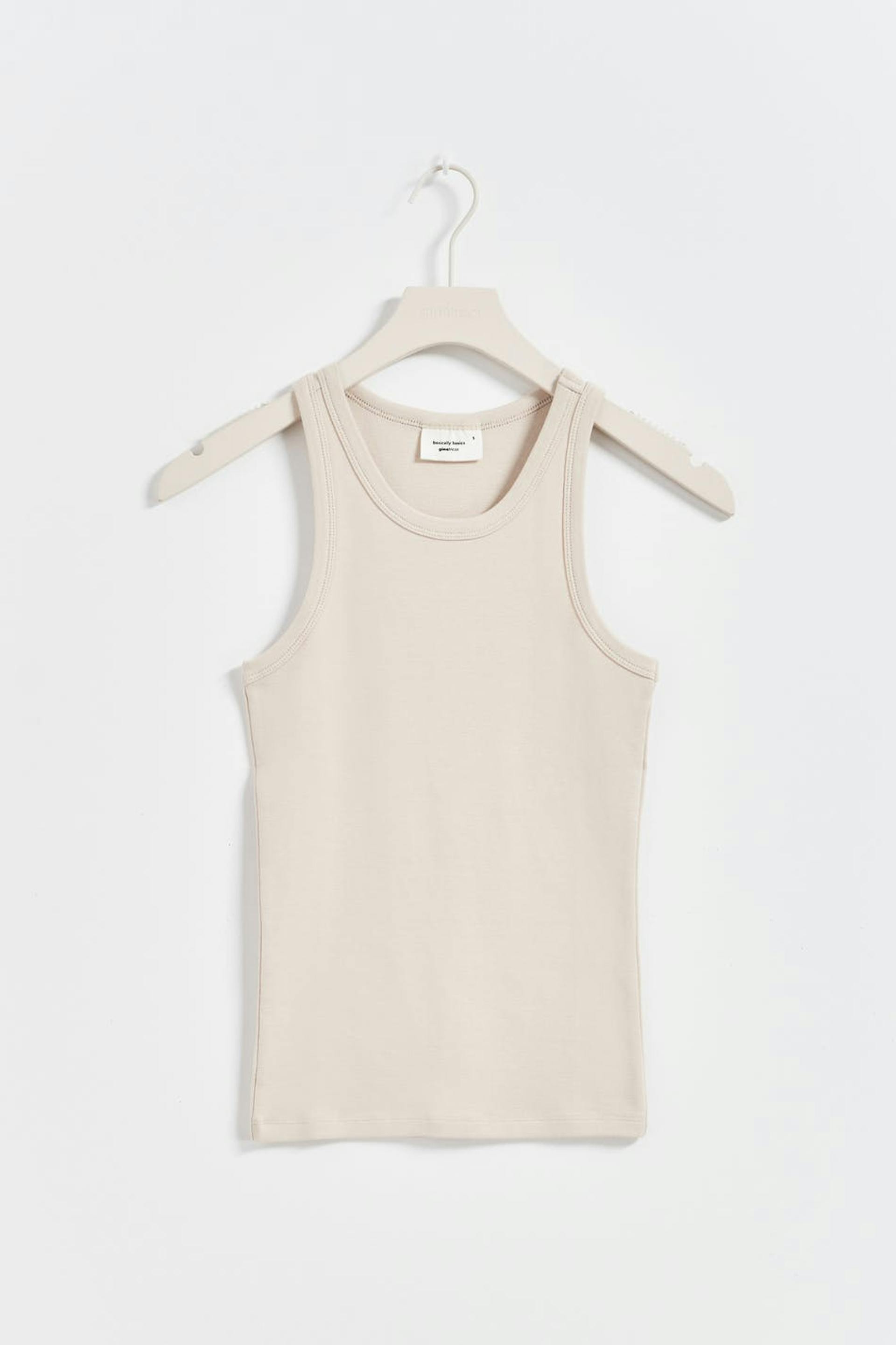Geripptes Oberteil aus Jersey mit einer taillierten Passform. Das Oberteil ist beige und hat figurbetonte Passform. Es hat Schrägbänder am Ausschnitt.