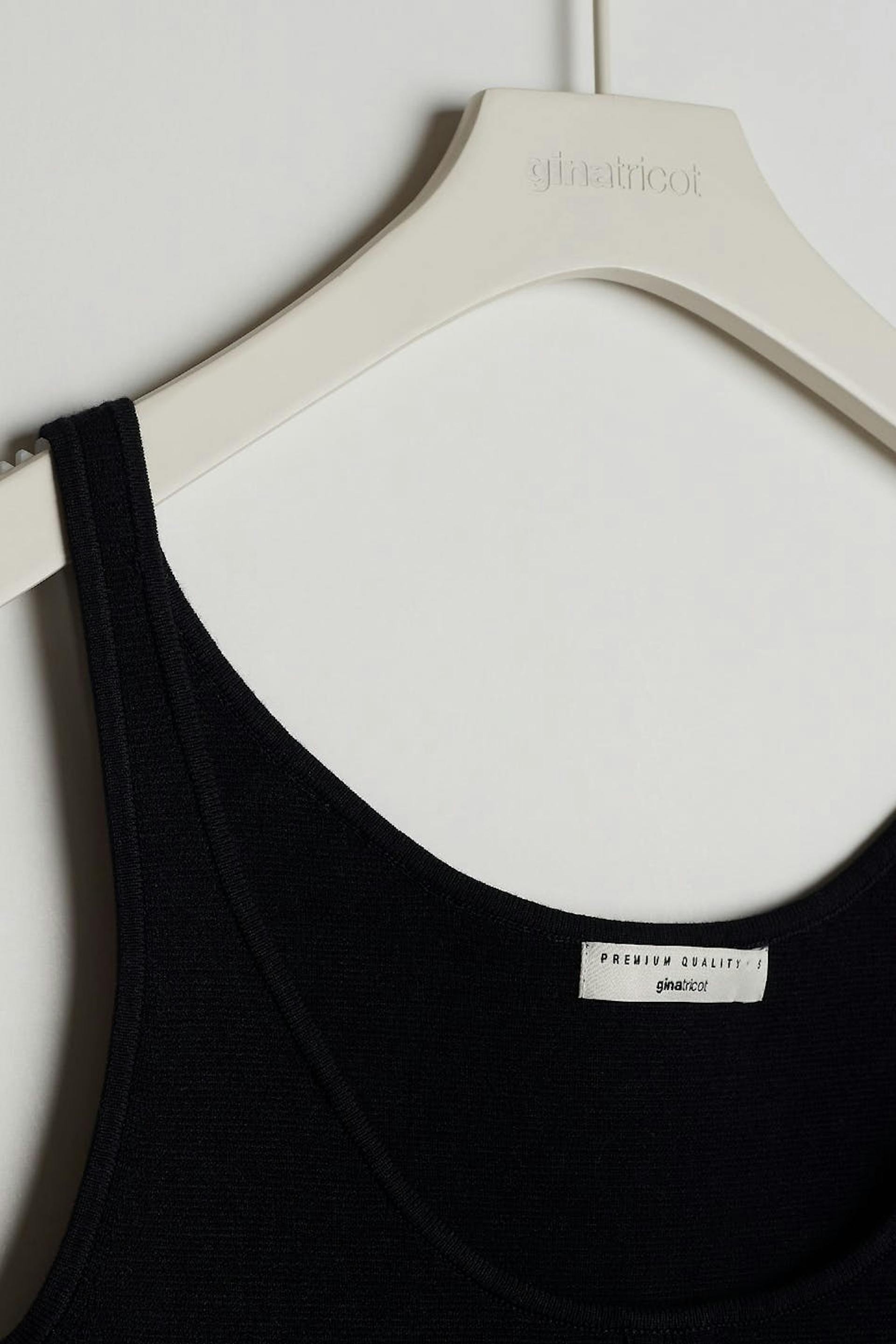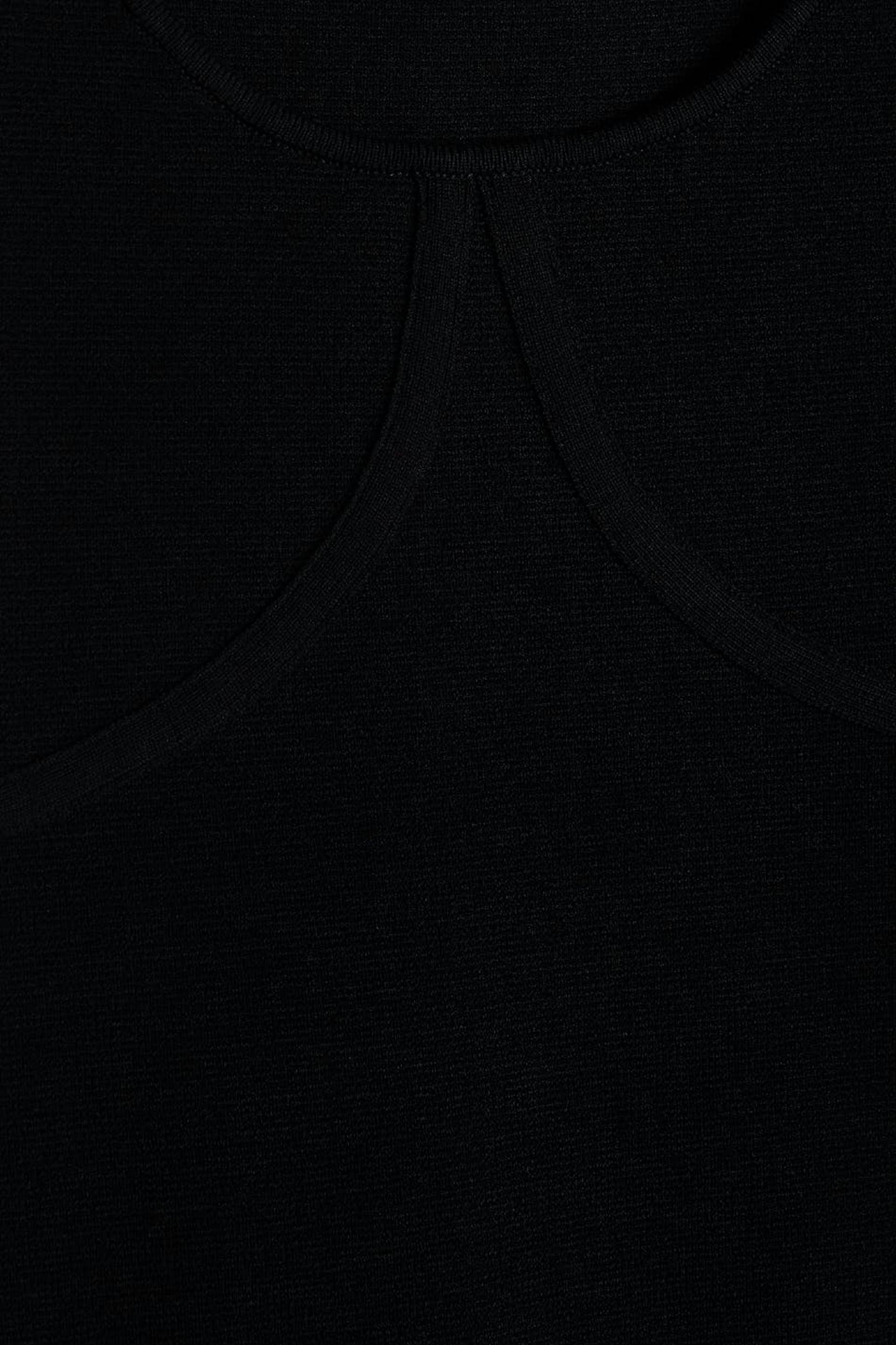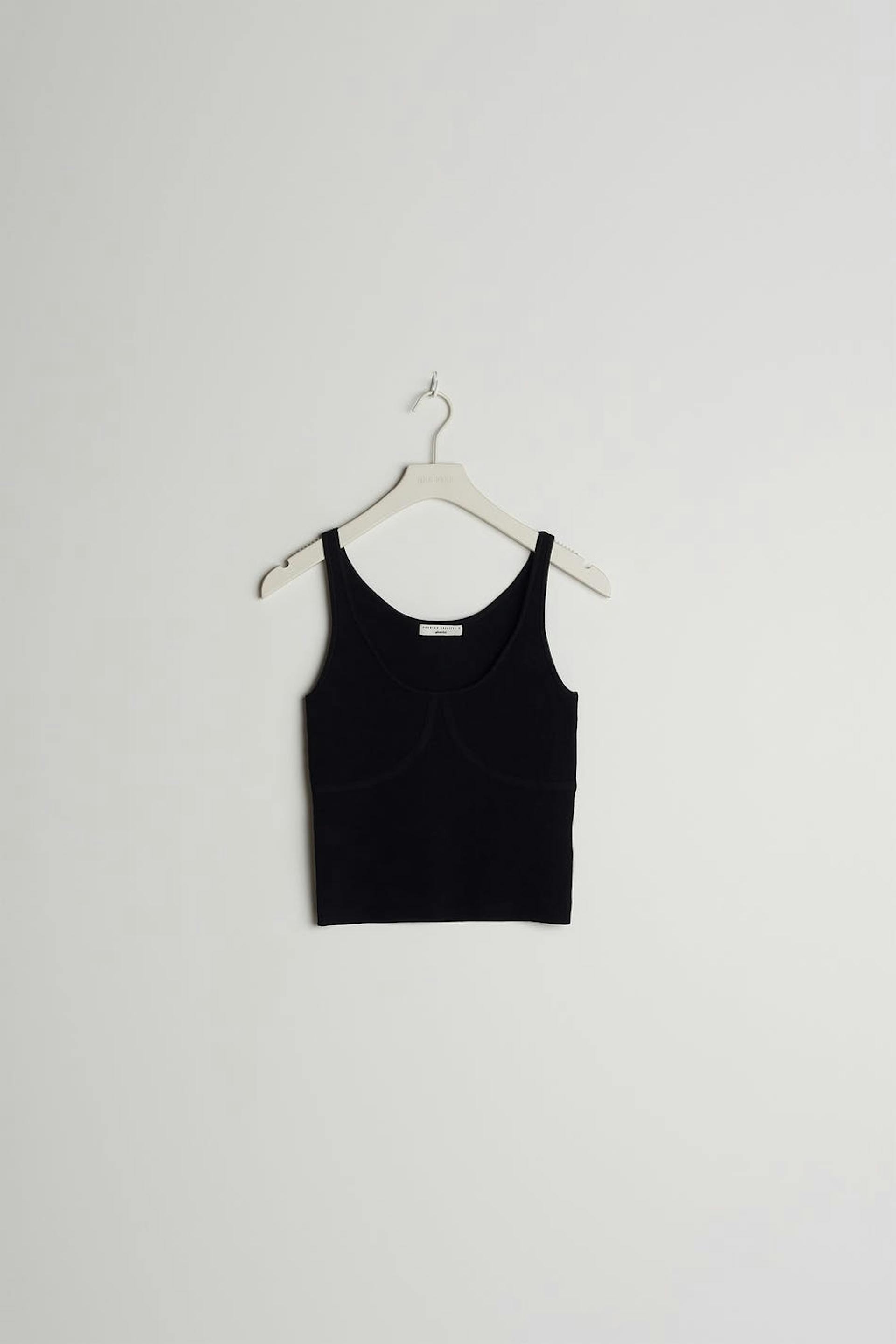 Ärmelloses Top mit einem Rundhalsausschnitt. Das Top ist schwarz und hat eine taillierte Passform. Es hat ein gestricktes, elastisches Material und ein Naht-Detail unter der Büste.