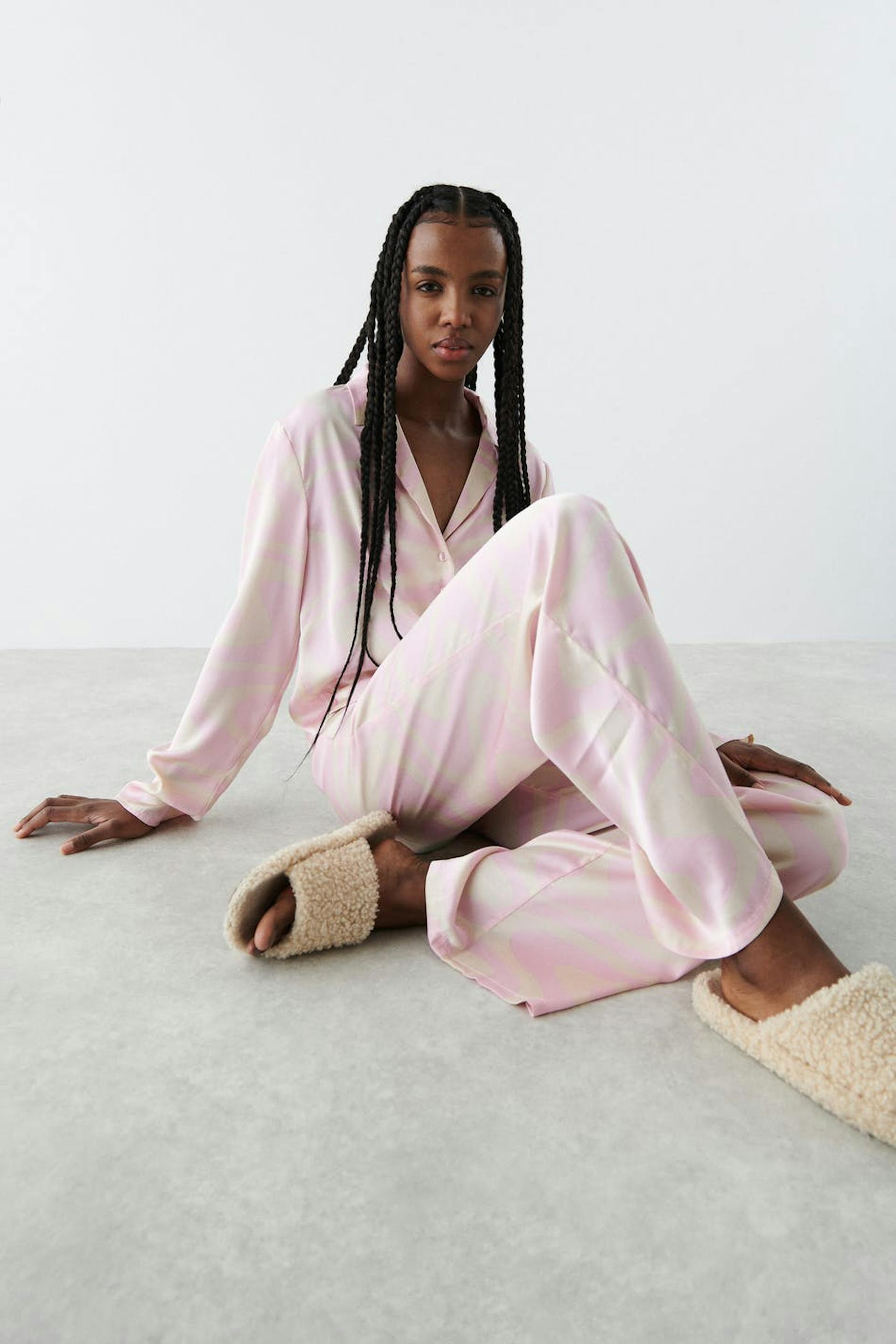 Pyjama-Shirt aus Satin mit Knopfleiste vorne. Das Hemd ist rosa und hat ein Wellenmuster. Es hat einen klassischen Hemdkragen mit Revers und etwas kürzer Länge.