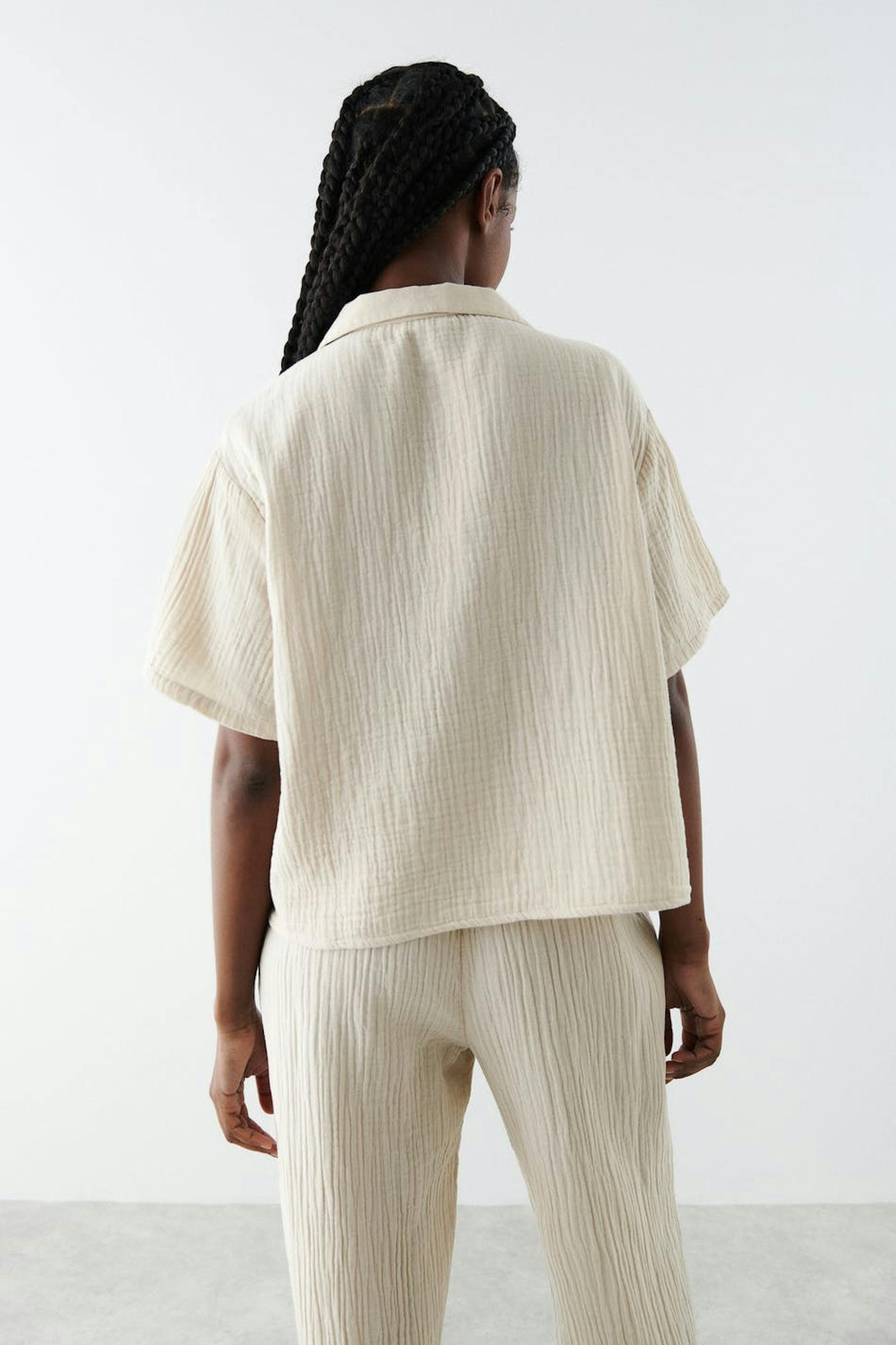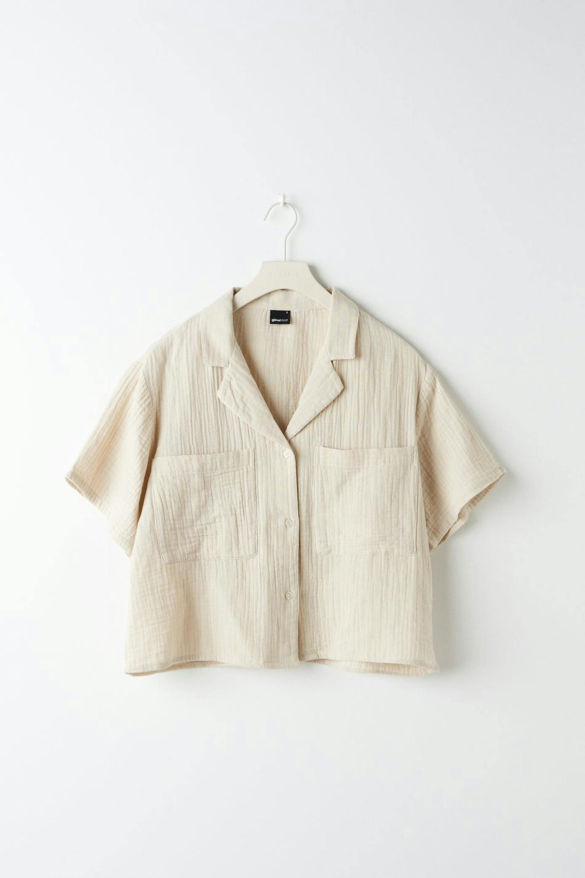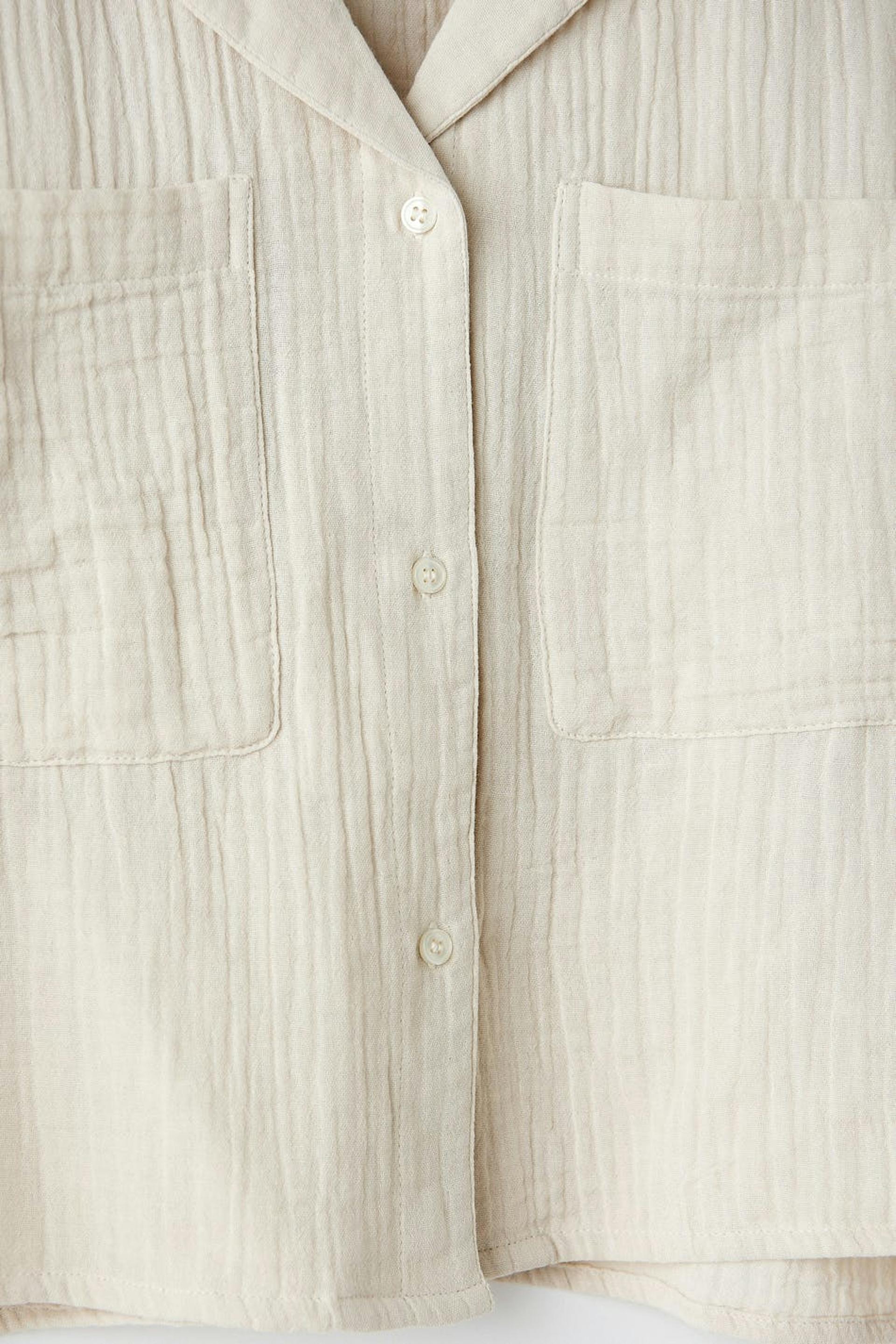 Kurzärmliges Pyjama-Shirt in Seersucker-Qualität mit Brusttaschen. Das Hemd ist beige und hat einen Kragen. Es hat Knopfleiste vorne und eine abgeschnittene Länge.
