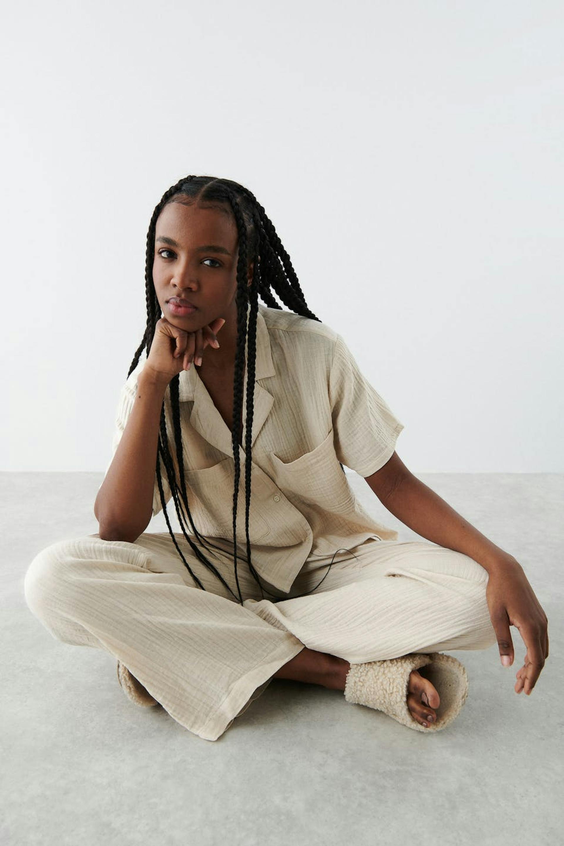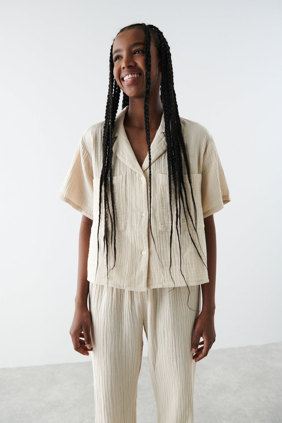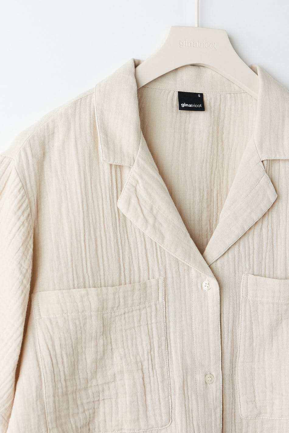Kurzärmliges Pyjama-Shirt in Seersucker-Qualität mit Brusttaschen. Das Hemd ist beige und hat einen Kragen. Es hat Knopfleiste vorne und eine abgeschnittene Länge.
