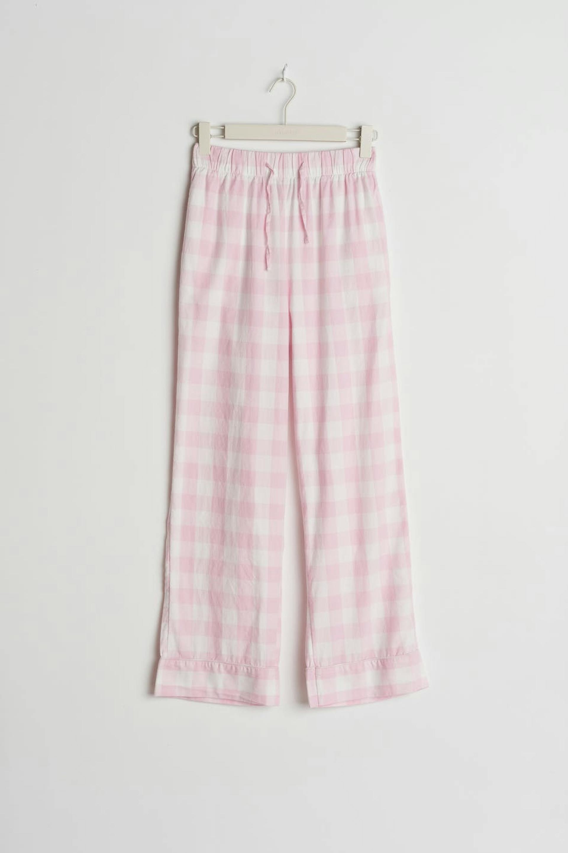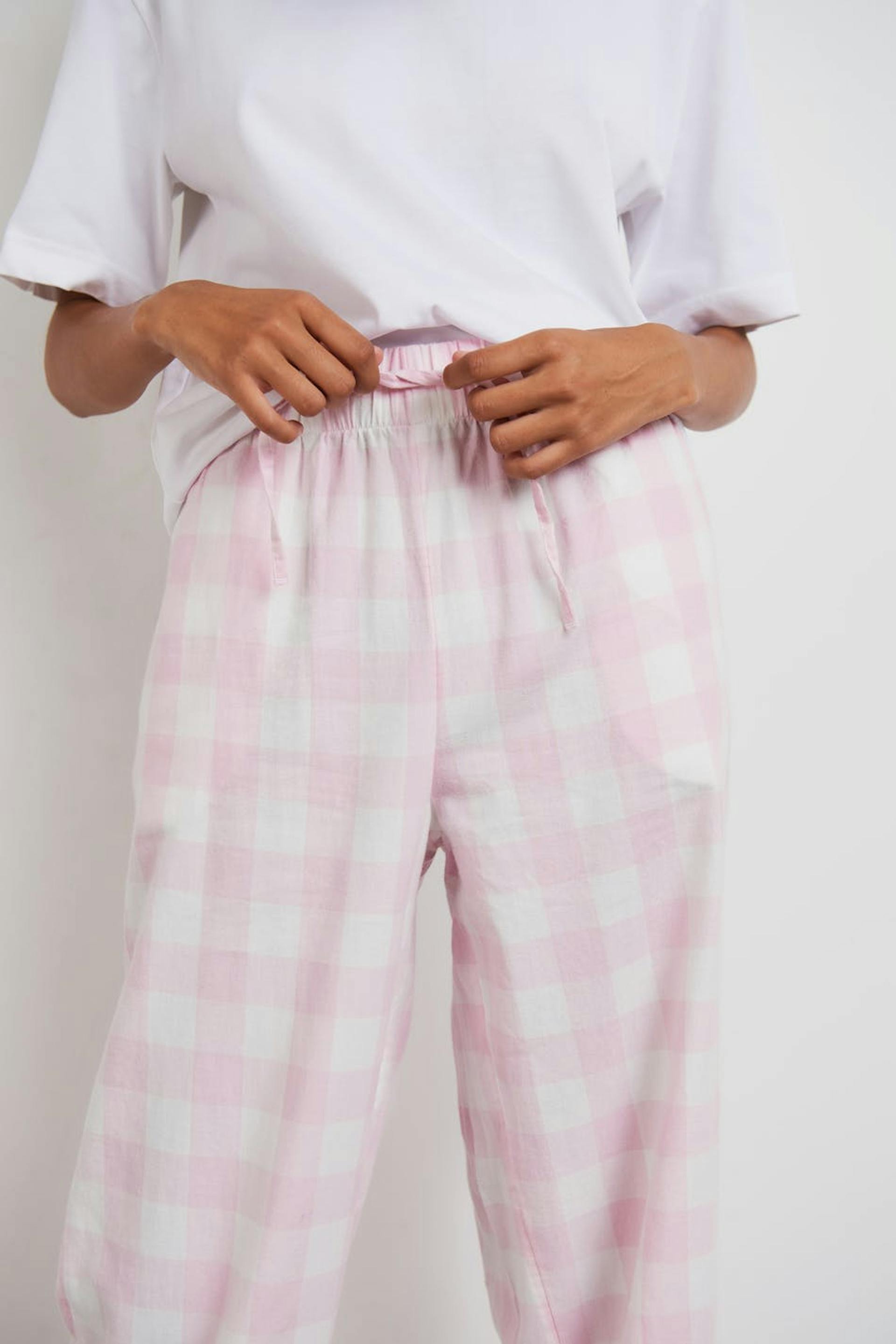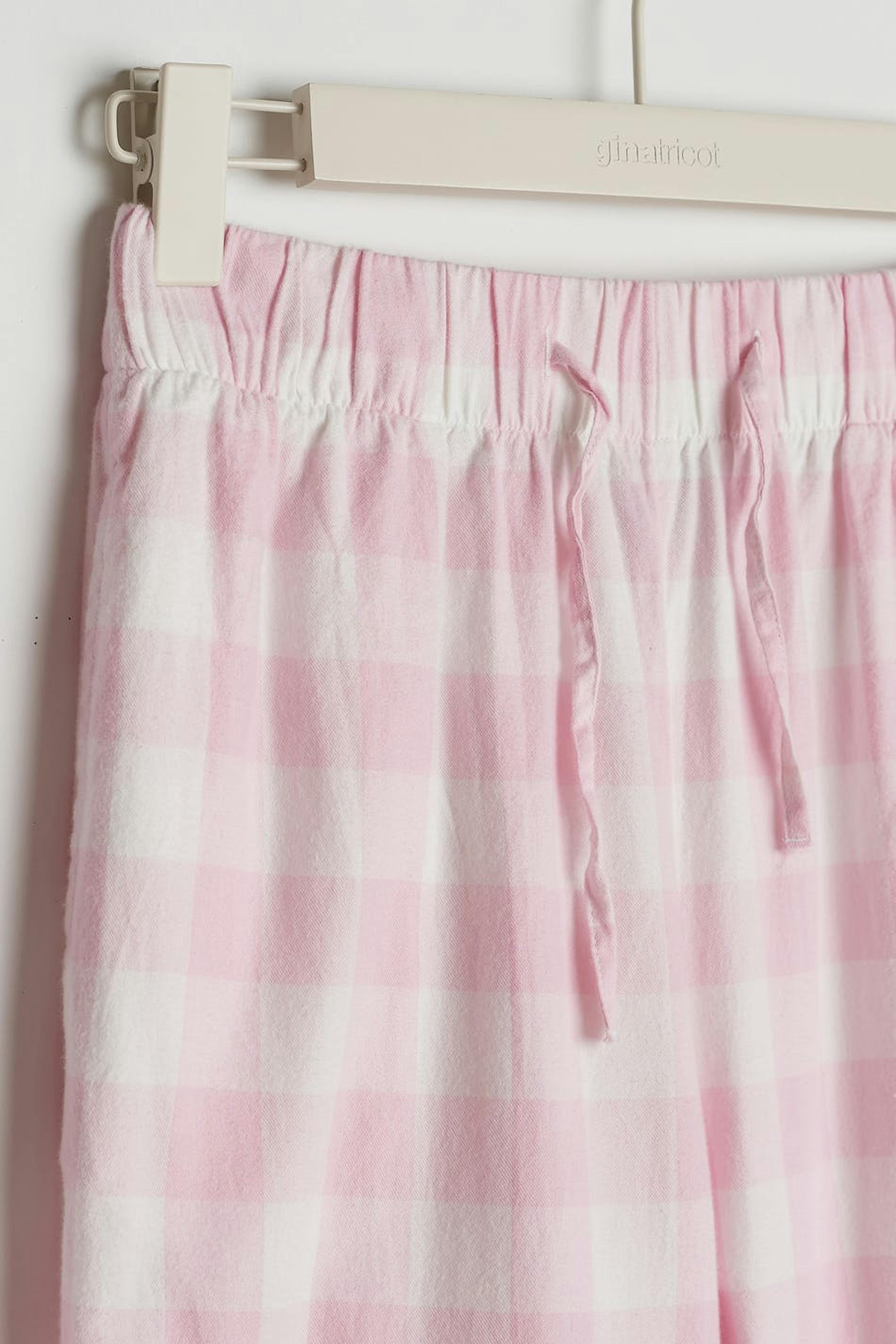 Karierte Pyjama-Trainingshosen mit einem weichen Material aus Baumwolle. Die Pyjama-Trainingshosen sind rosa und haben Gummiband in der Taille mit einer Selbstbindung vorne.