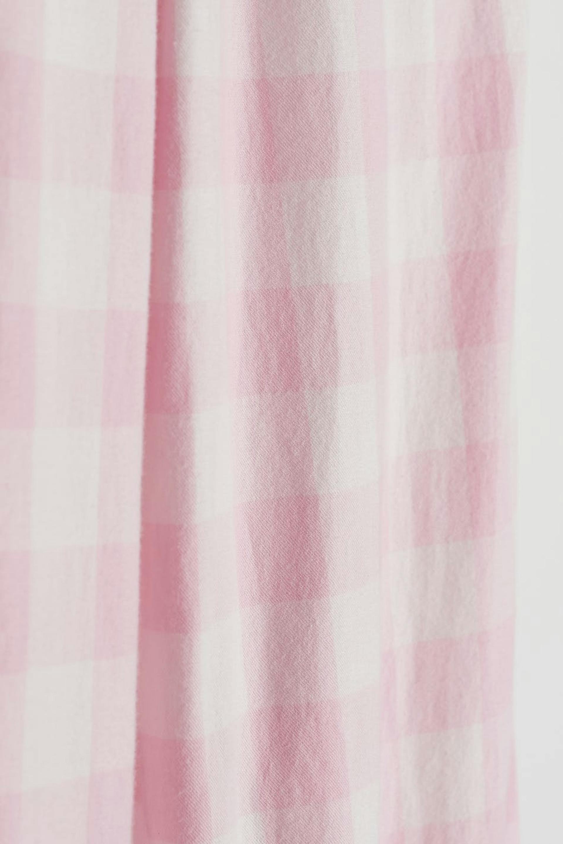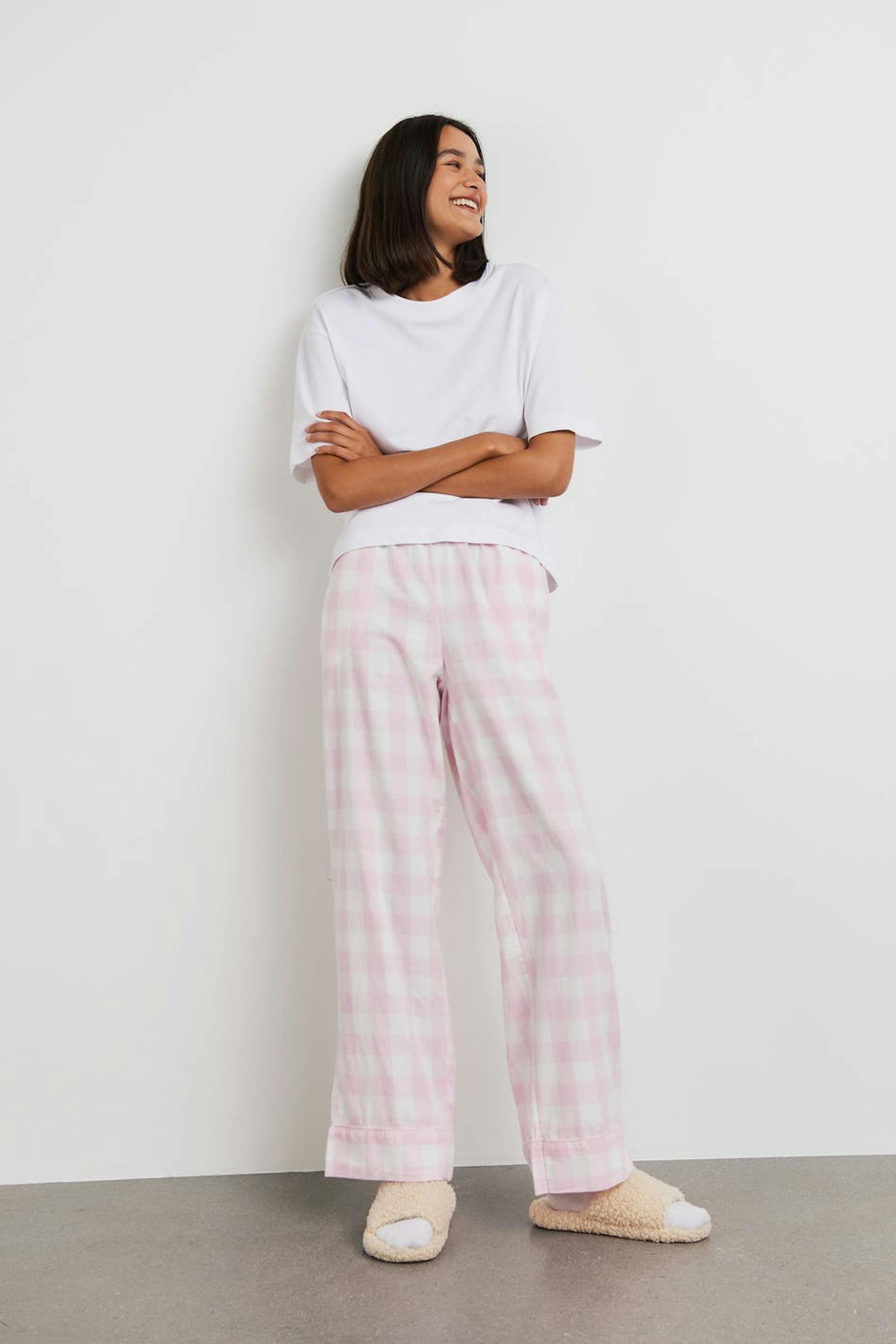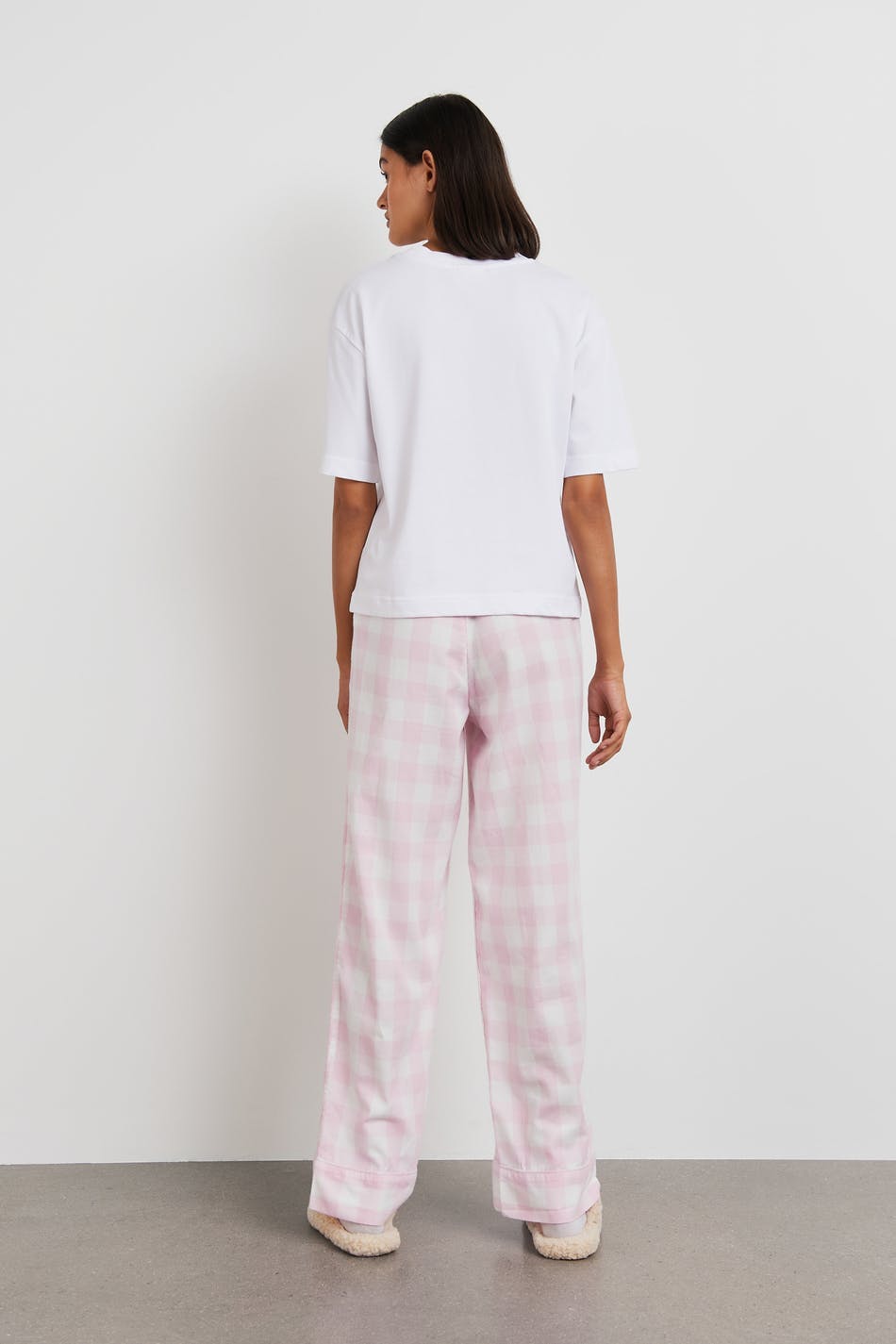 Karierte Pyjama-Trainingshosen mit einem weichen Material aus Baumwolle. Die Pyjama-Trainingshosen sind rosa und haben Gummiband in der Taille mit einer Selbstbindung vorne.