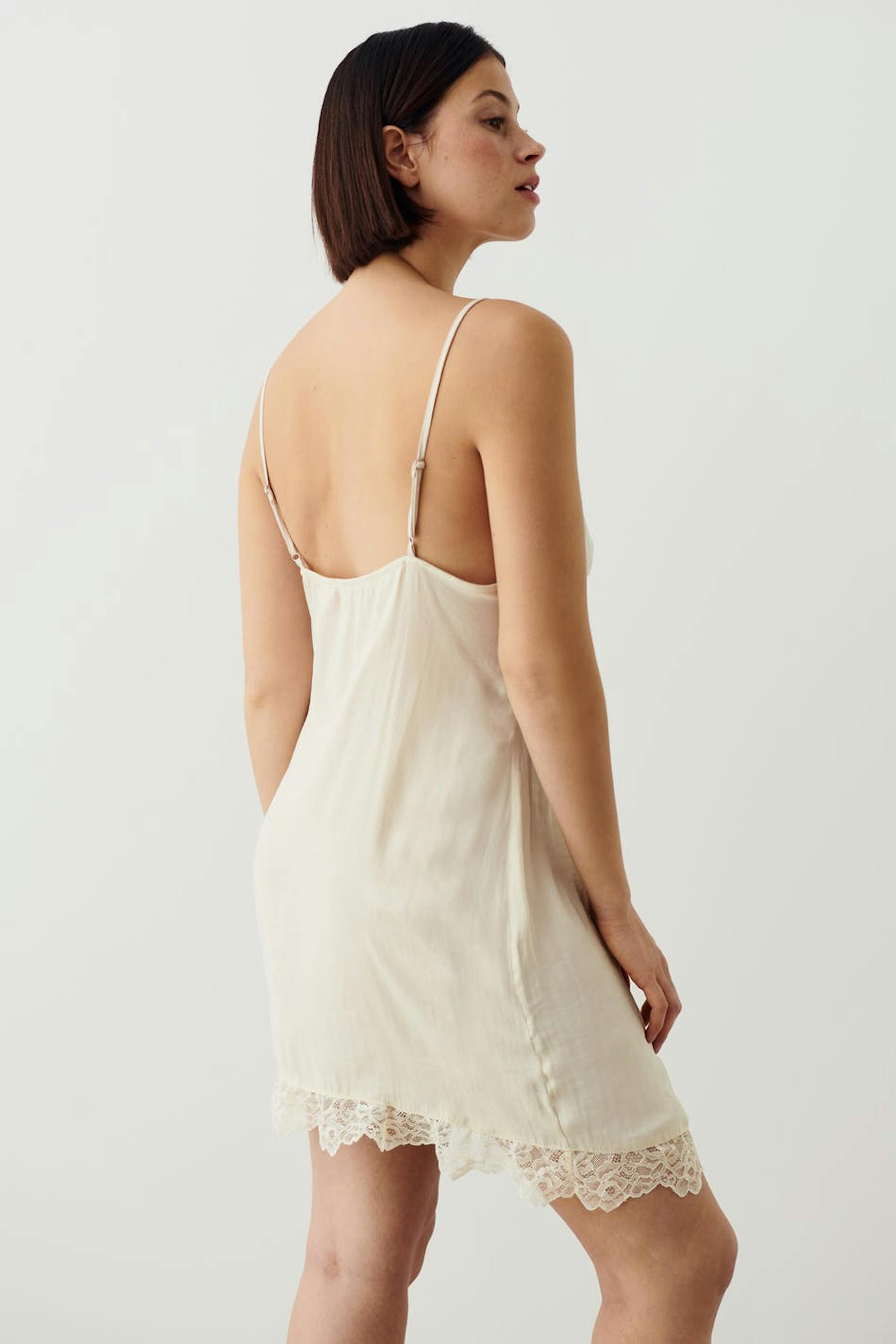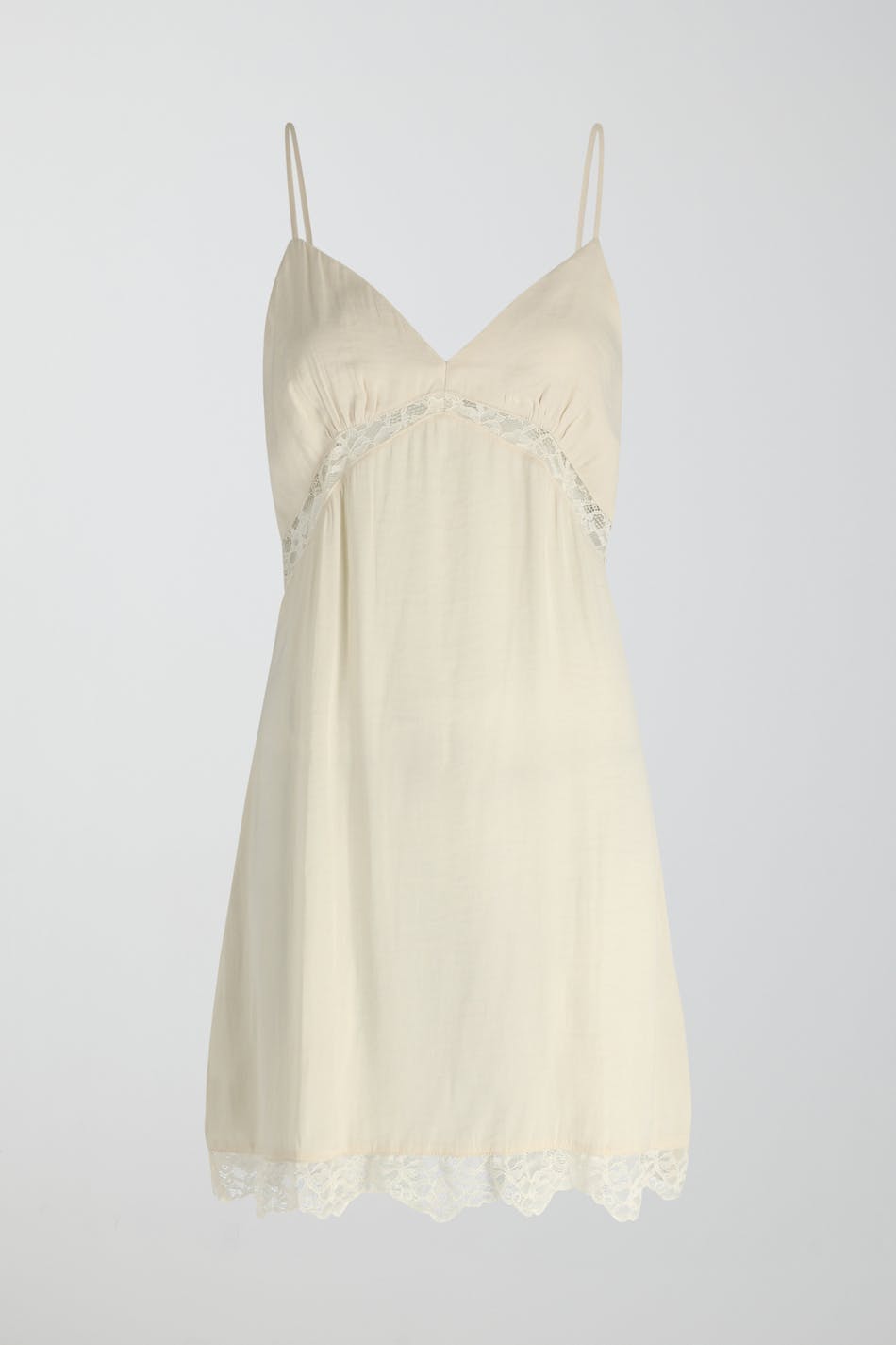 Nachthemd aus Satin mit Spitzendetails. Das Nachthemd ist beige und hat weit-geschnittenen Style. Es hat verstellbare Trägerbänder, V-Ausschnitt und taillierte Passform an der Büste.