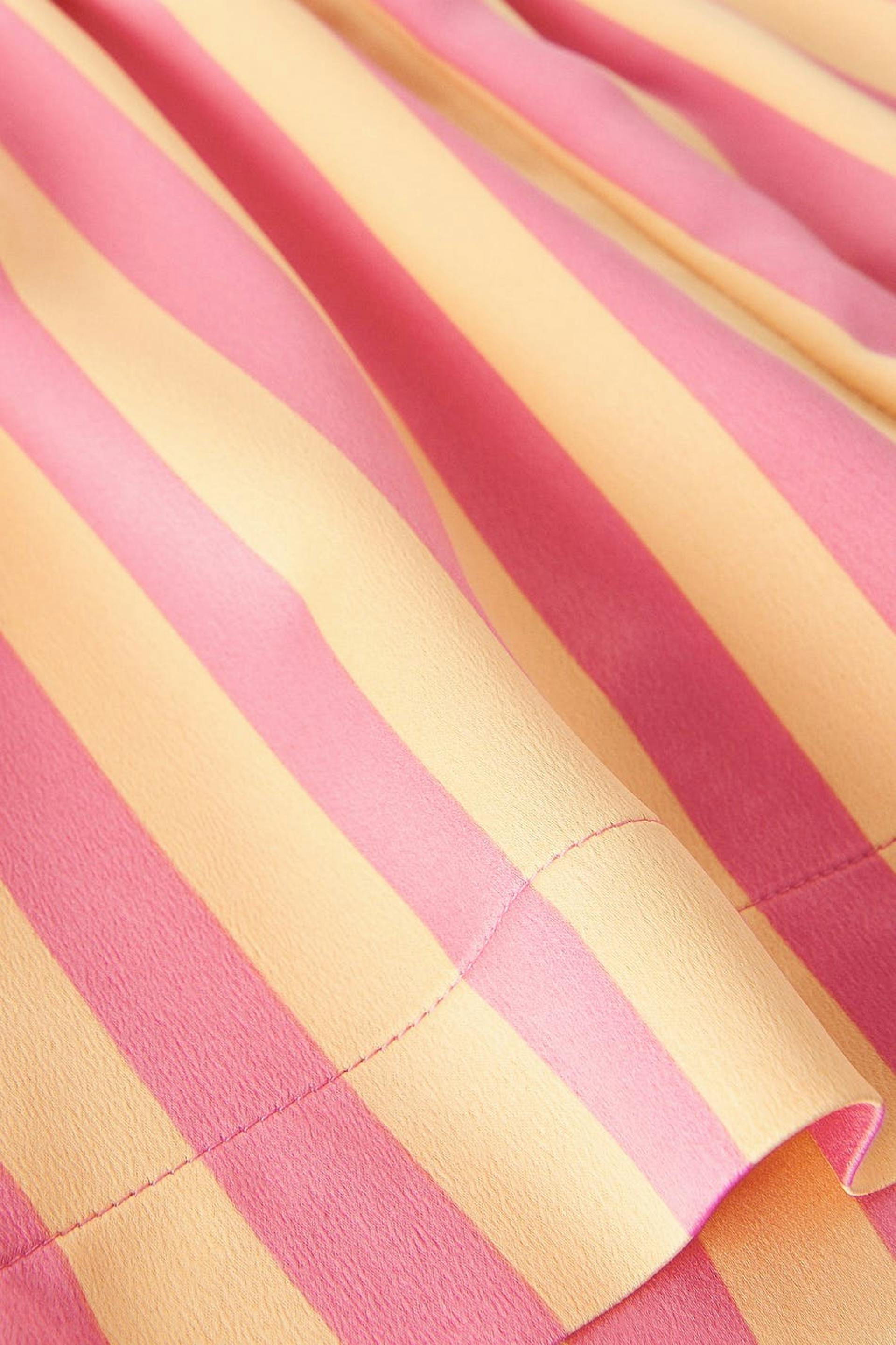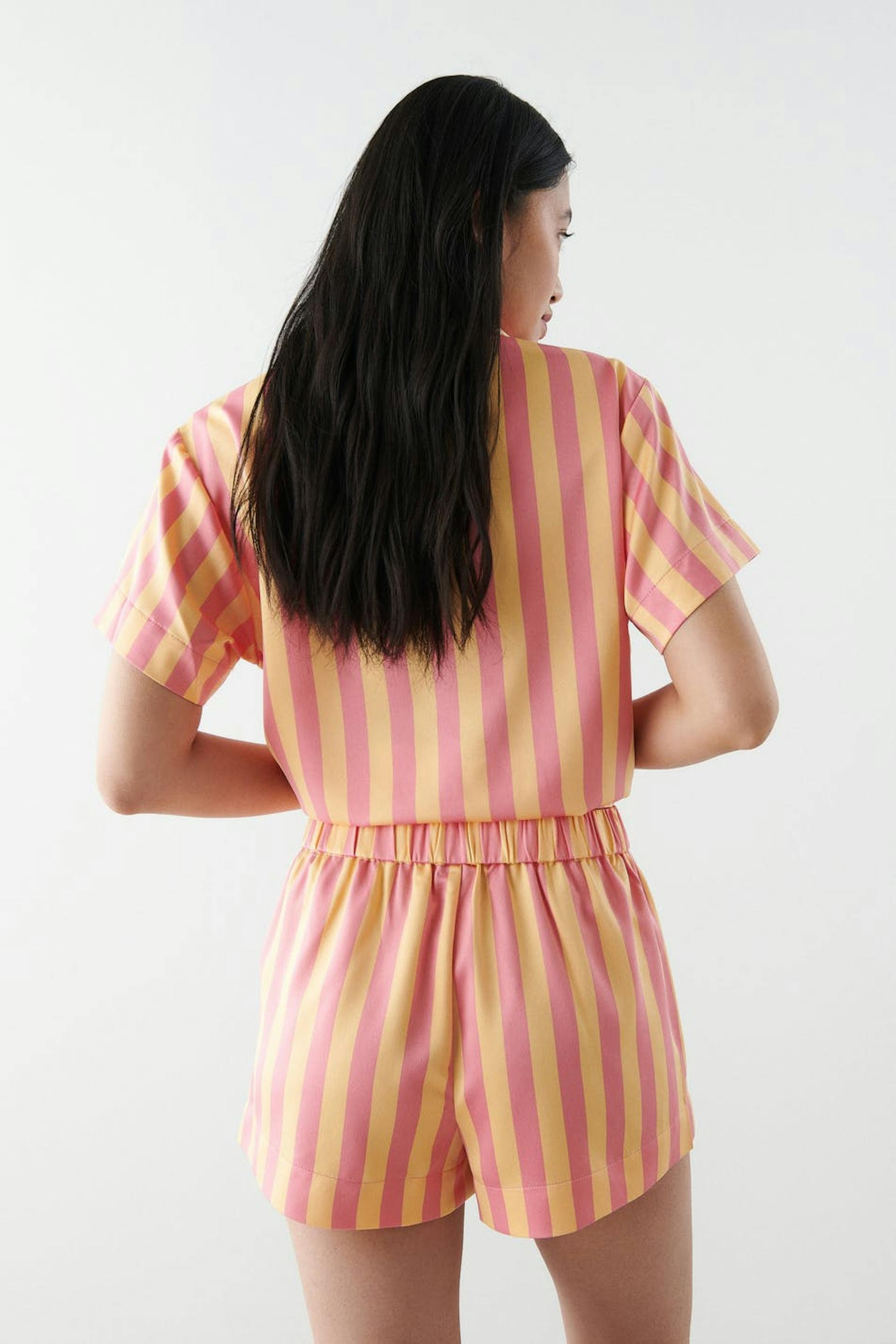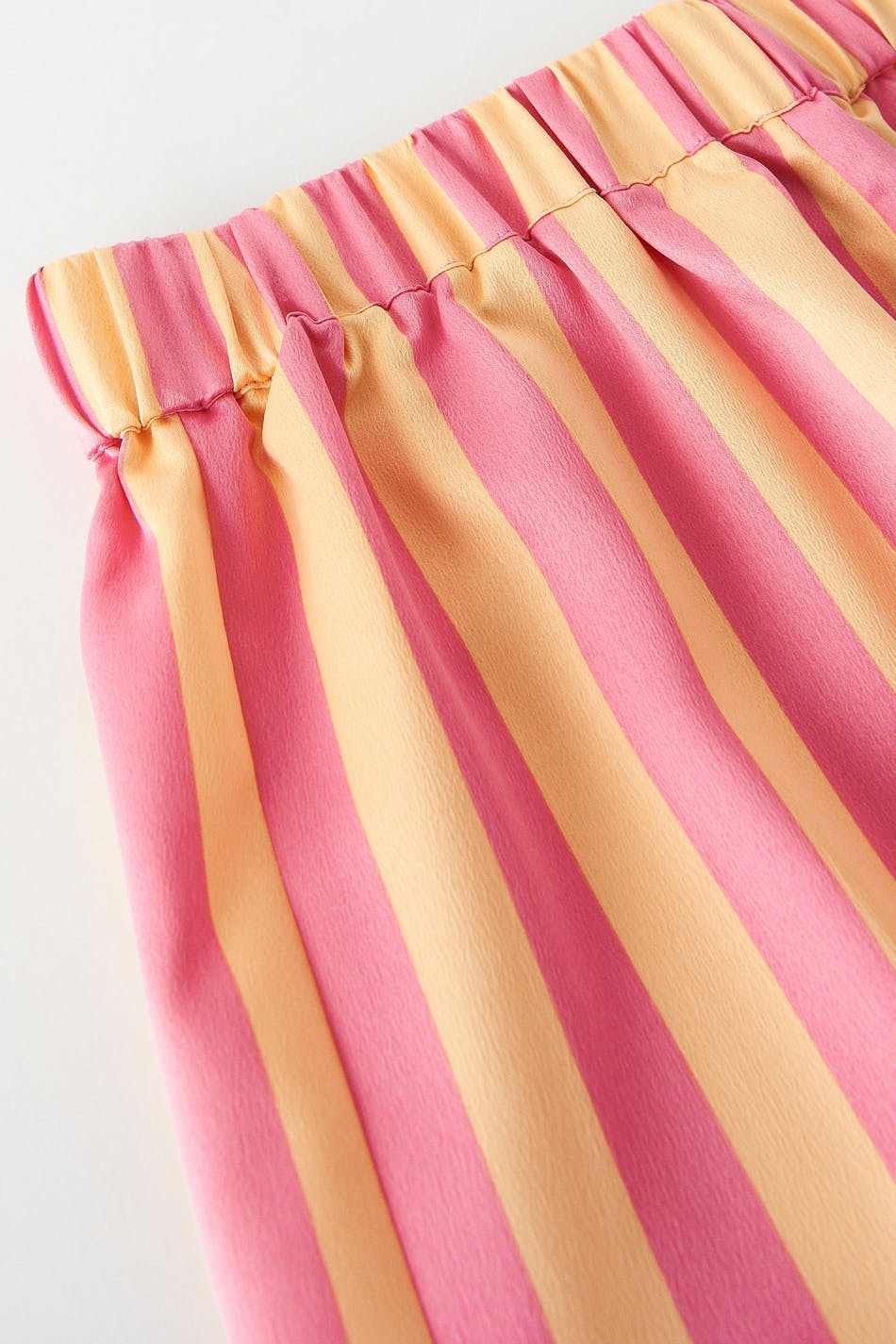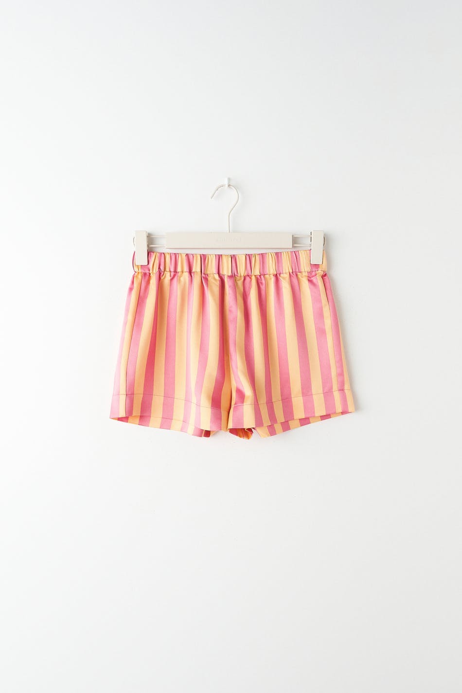 Gestreifte Pyjama-Shorts mit weit-geschnittenen Style. Die Shorts sind rosa, gelb und kurz. Sie haben Gummiband in der Taille und eine weiche Qualität aus Satin.