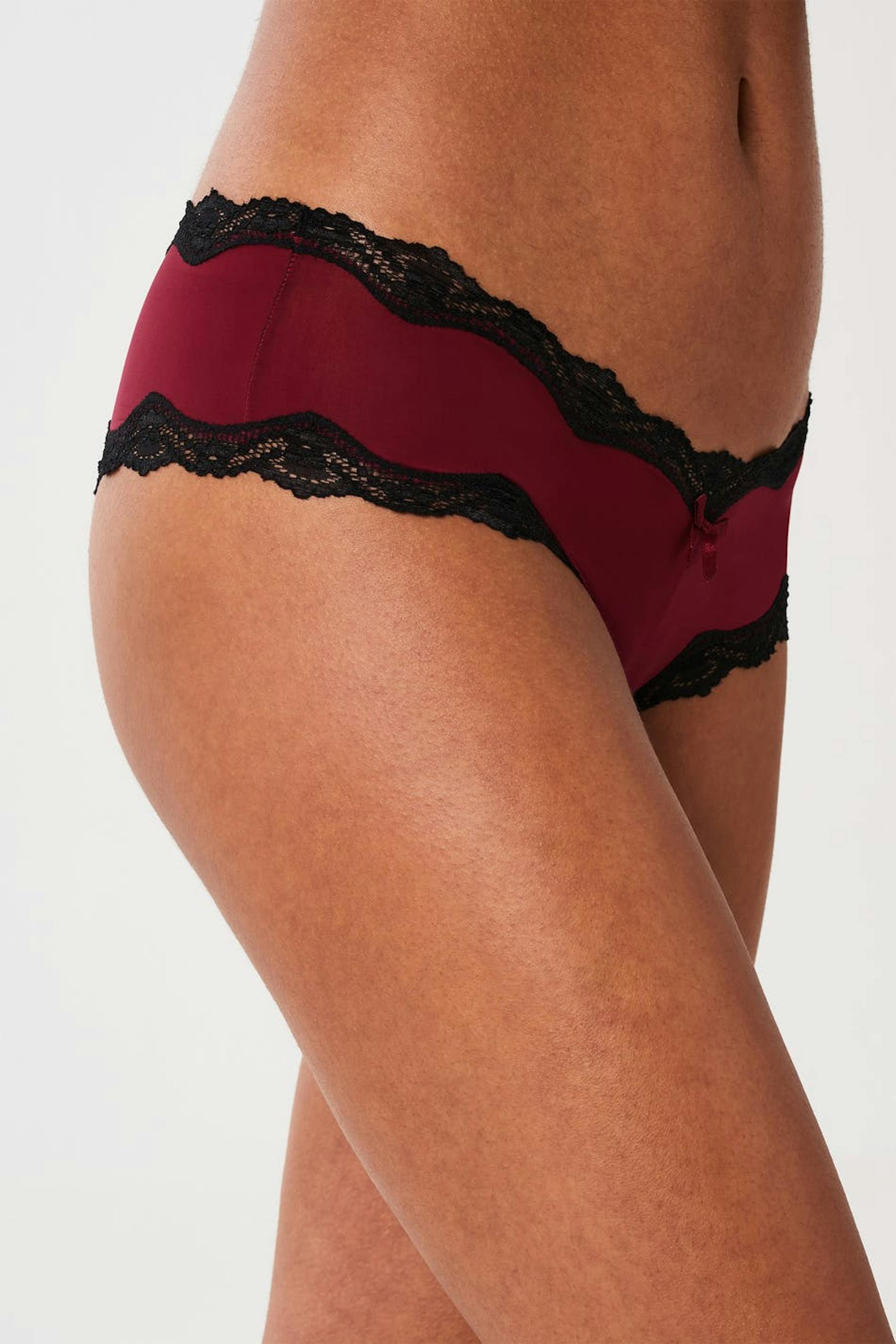 Höschen mit einer taillierten Passform. Das Höschen ist rot und hat Kanten aus Spitze. Es ist hergestellt aus Mikrofaser und hat eine tiefe Taille.