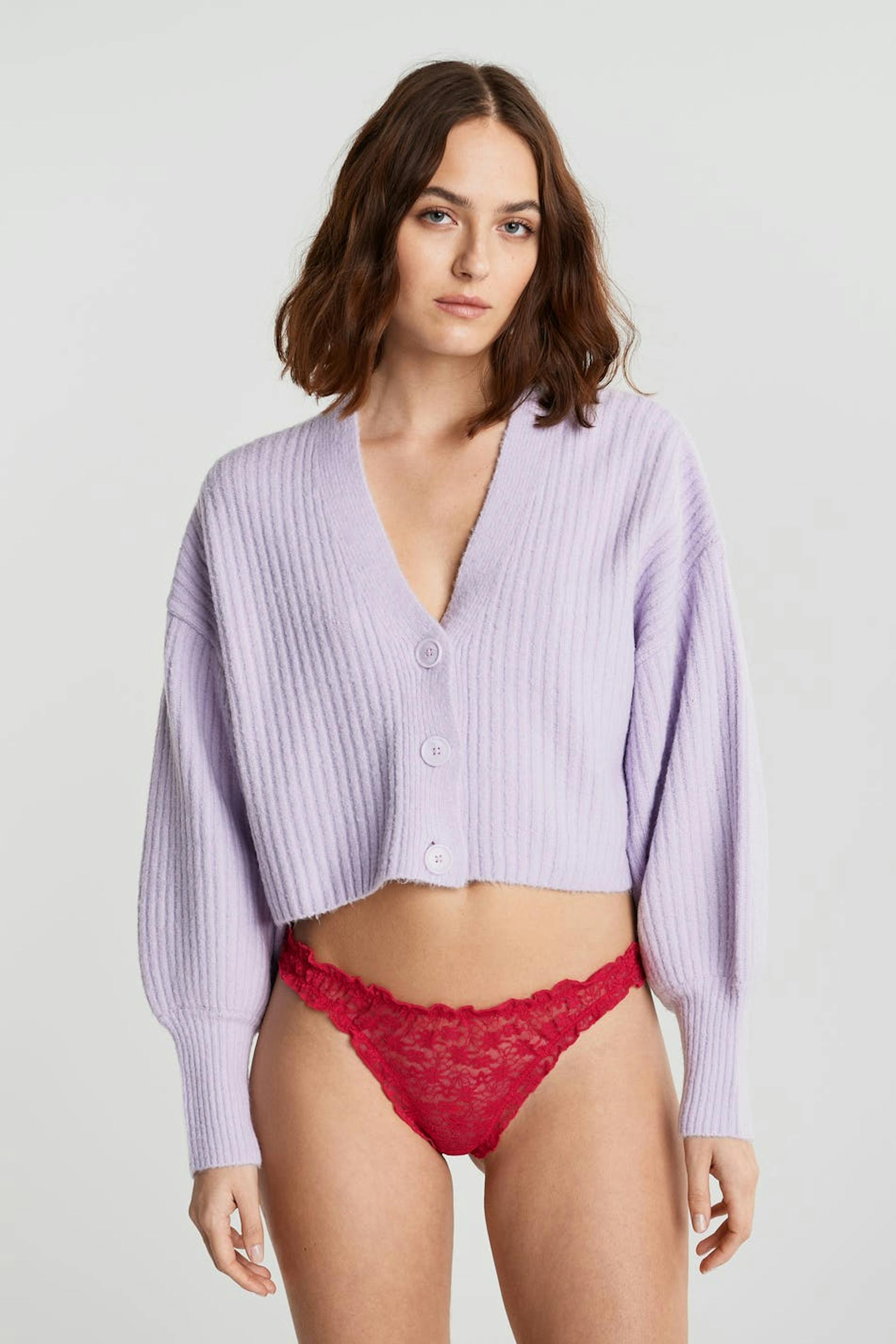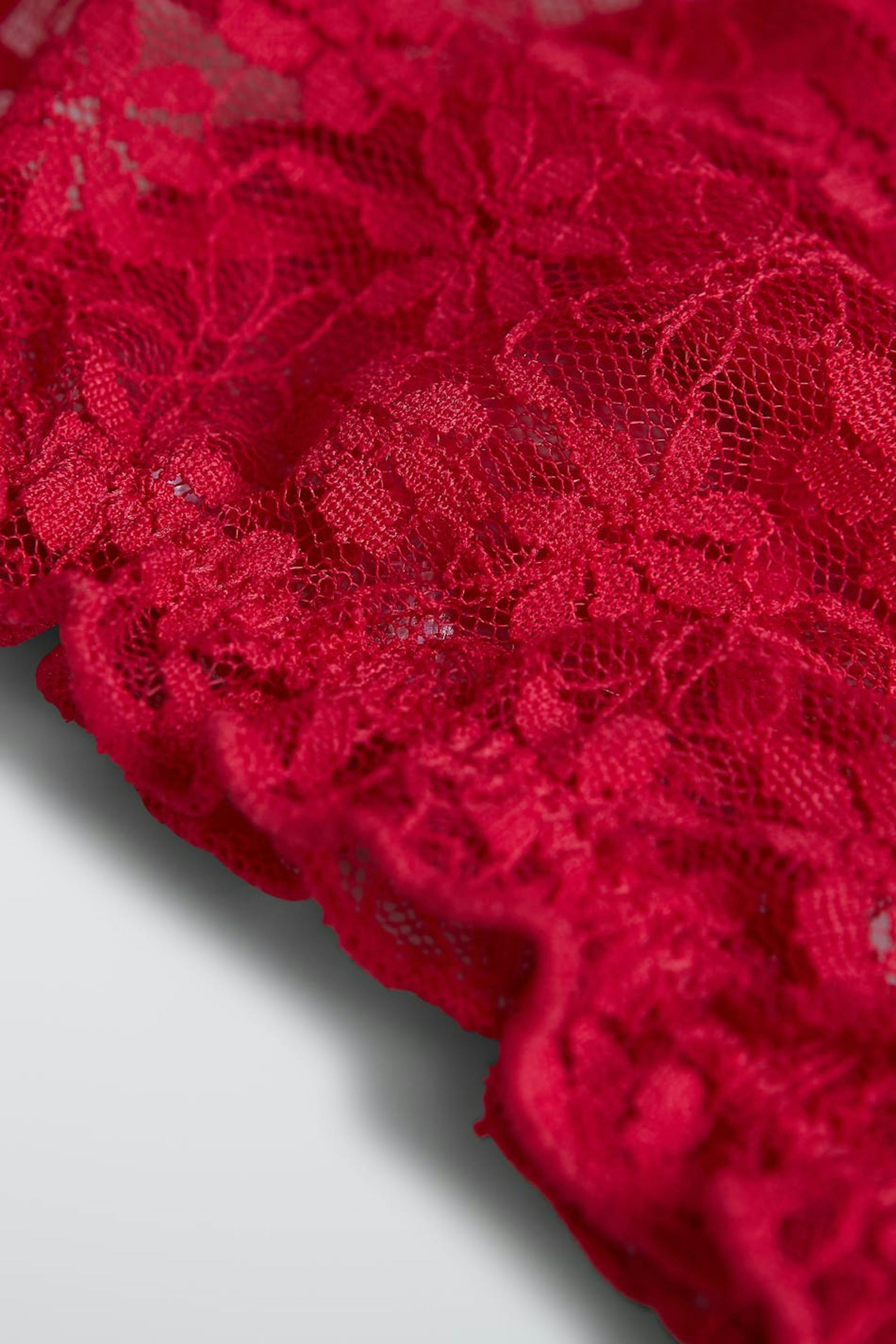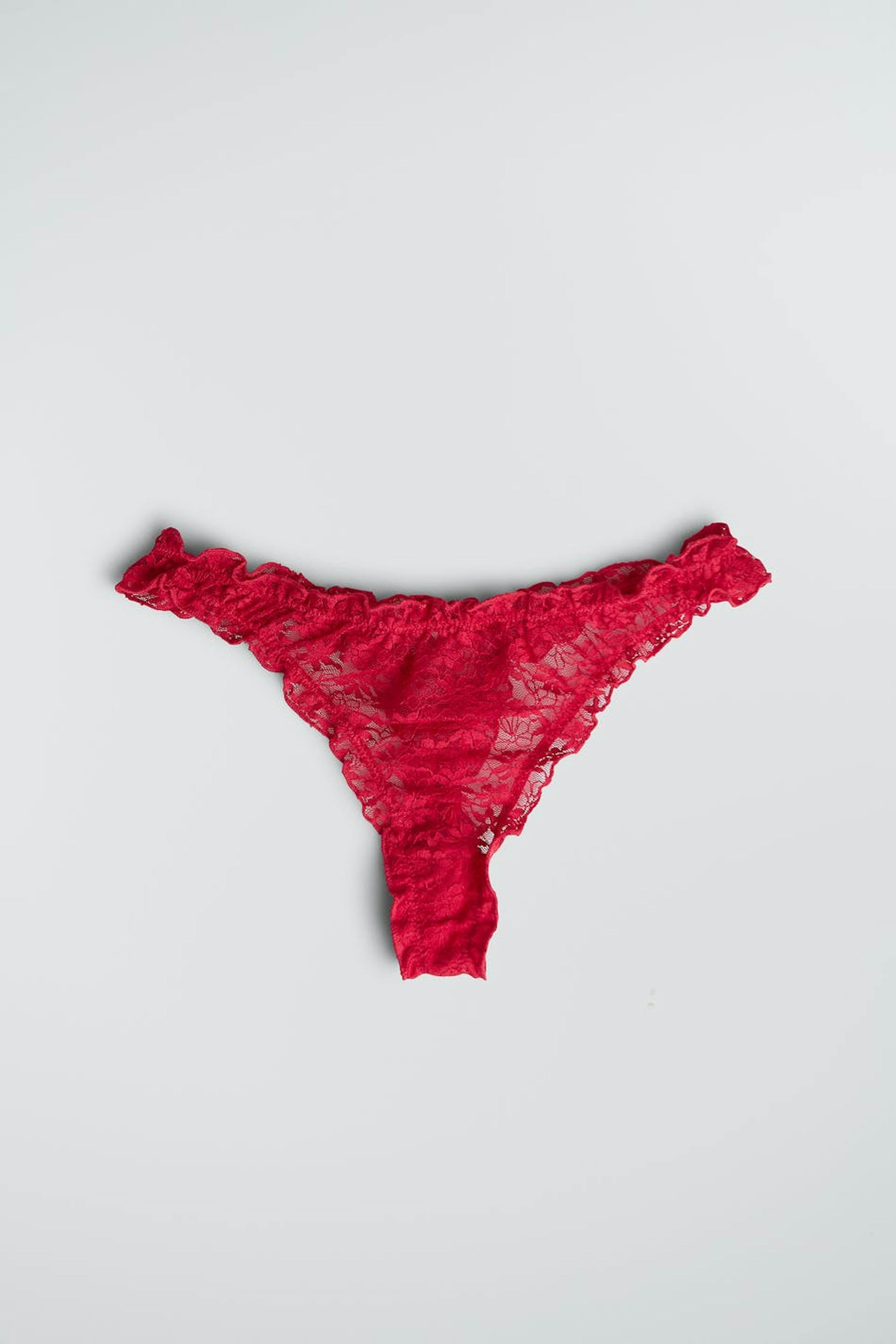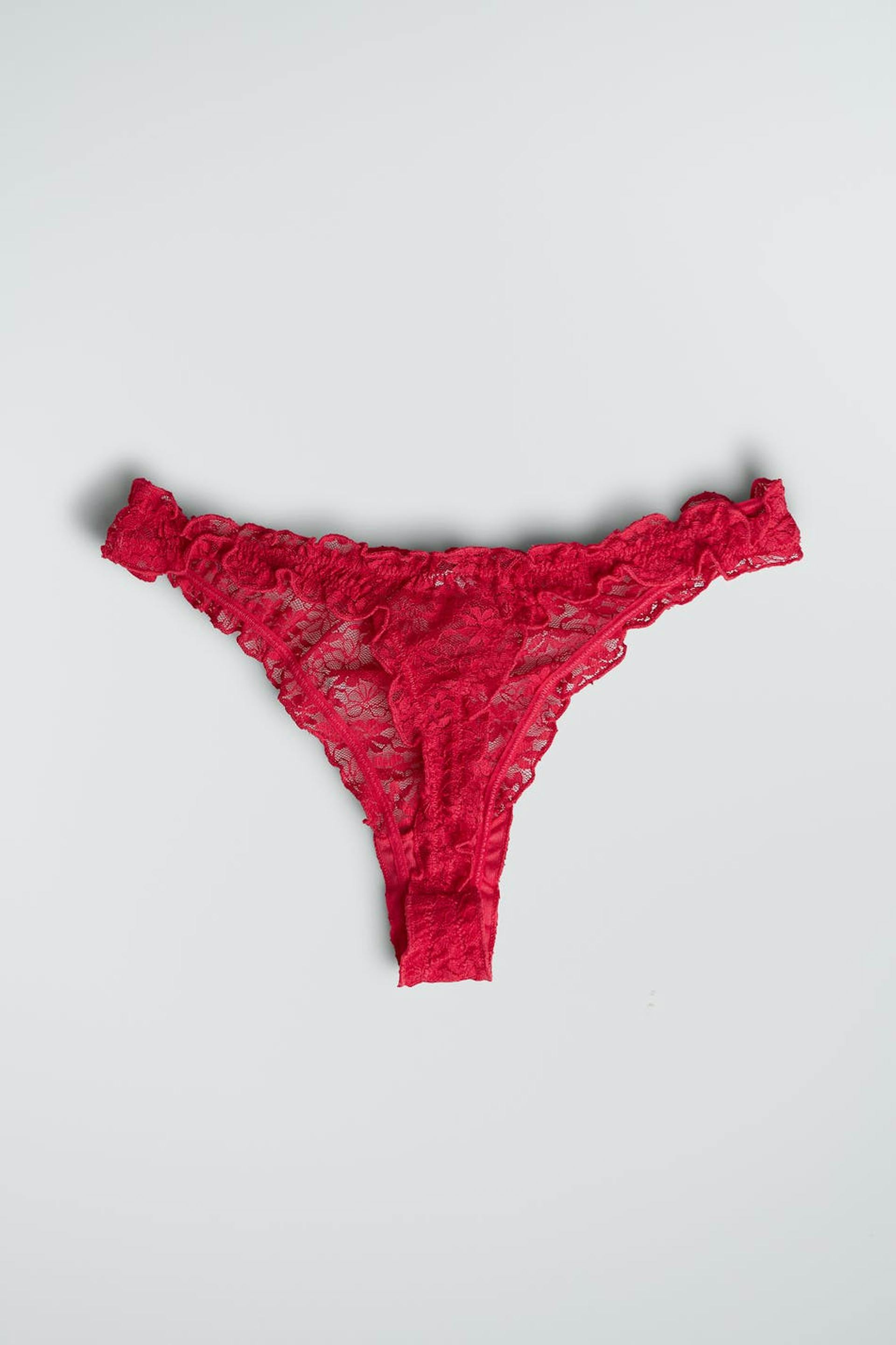 Stringtangas mit Rüschenröcken am Rand. Die Stringtangas sind rot und haben Futter aus Baumwolle zwischen den Beinen. Sie sind hergestellt aus Spitze.