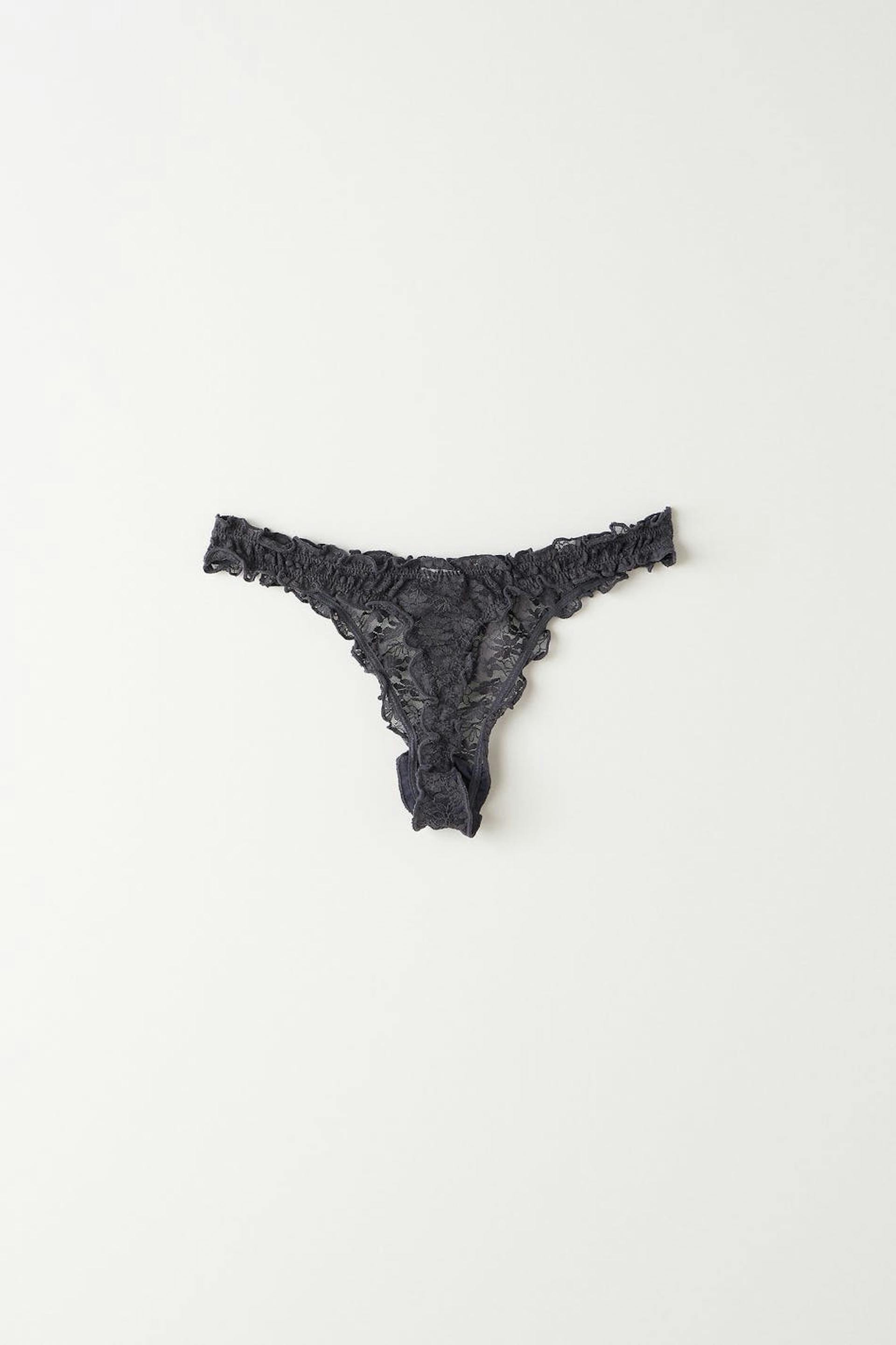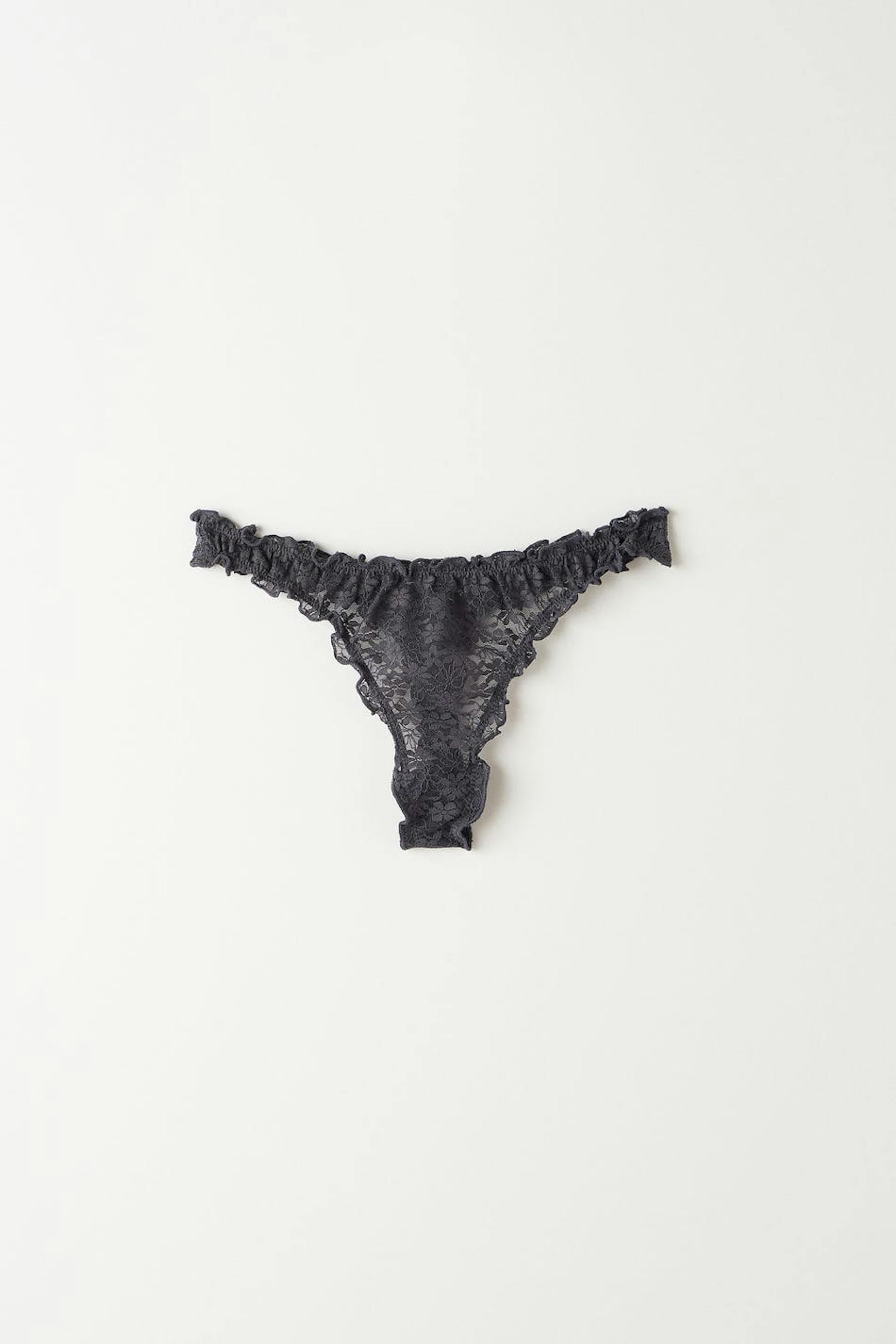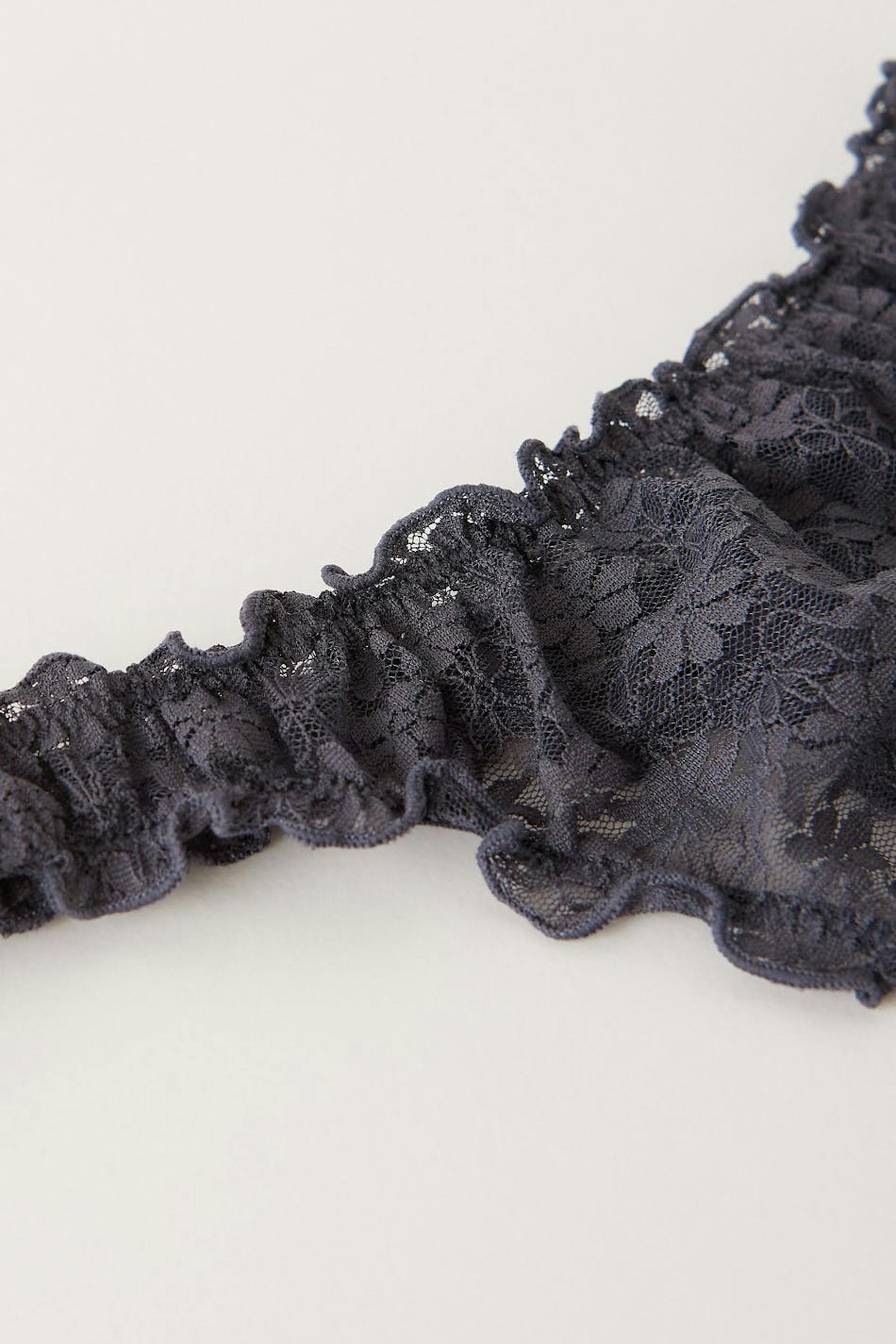 Spitzene Stringtangas mit Rüschenkanten. Die Stringtangas sind grau und haben ein Futter aus Baumwolle zwischen den Beinen.