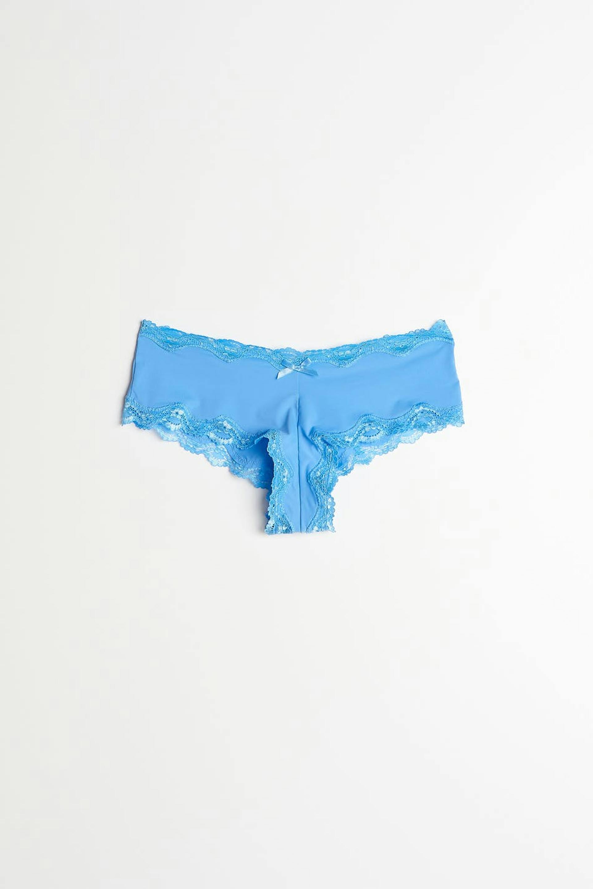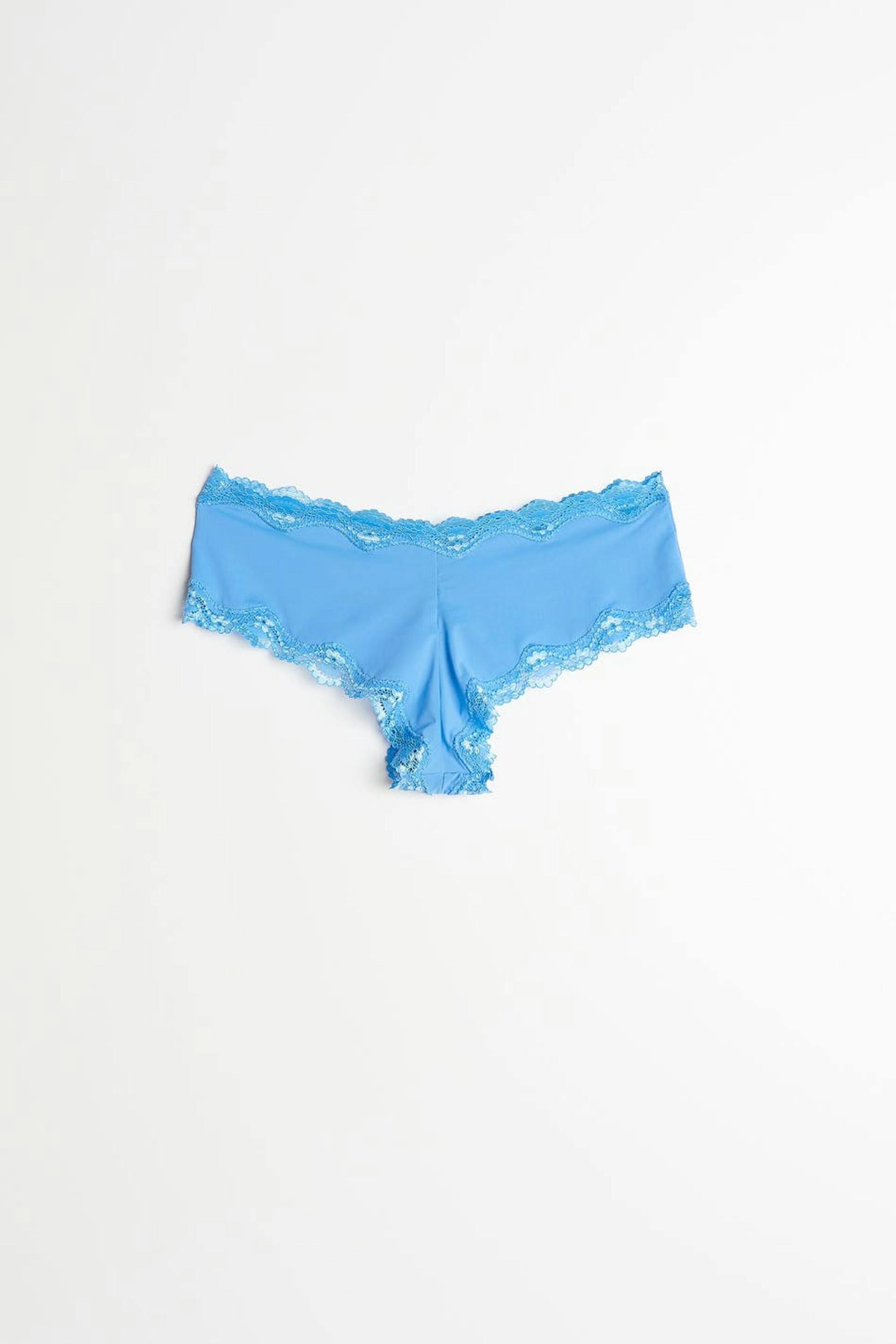 Weiches Höschen mit Spitzendetails. Das Höschen ist blau. Es ist hergestellt aus Mikrofaser.