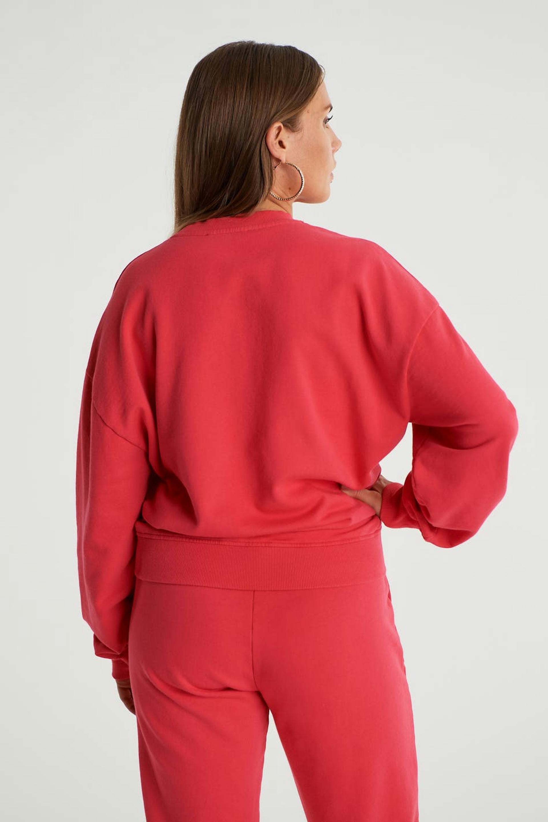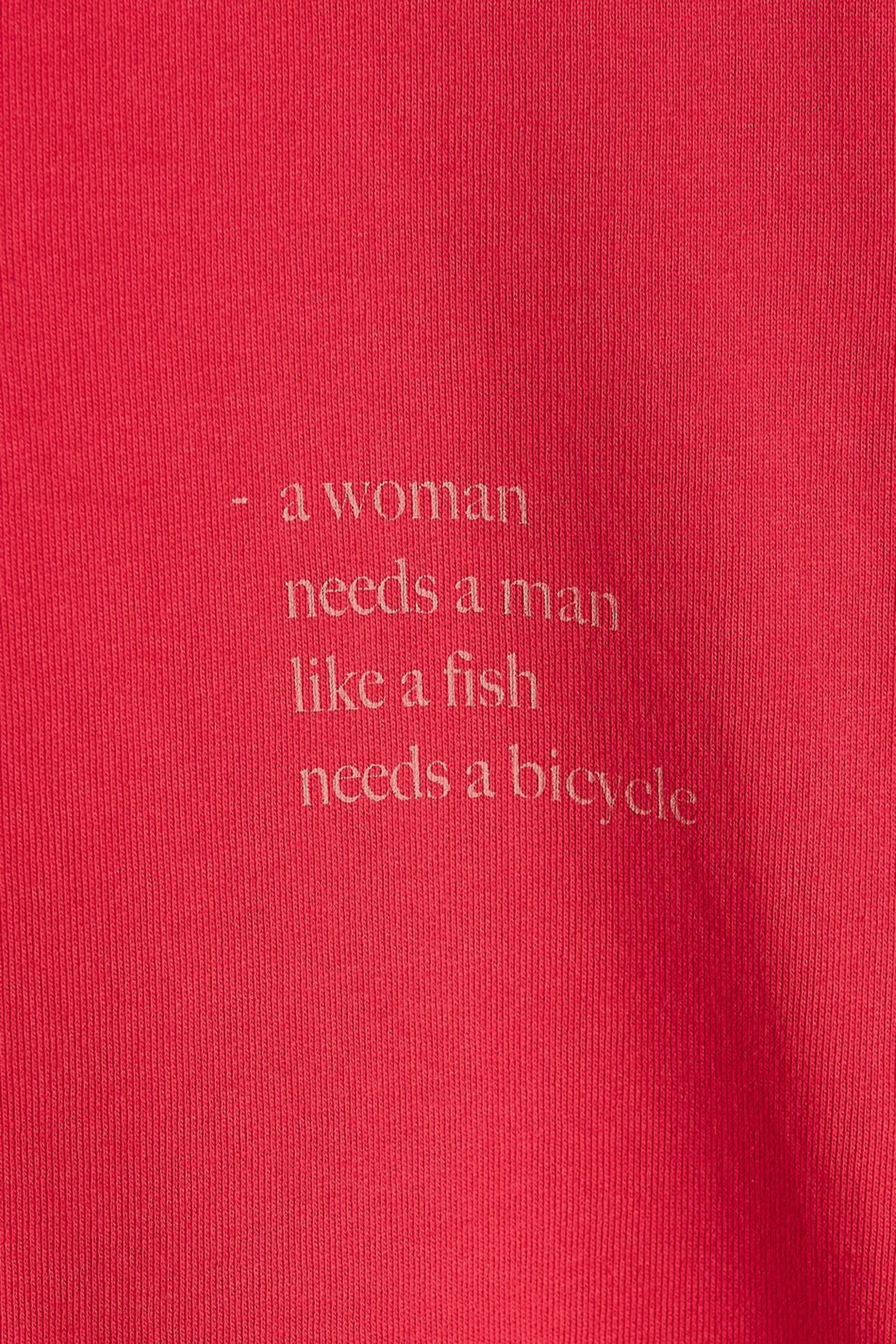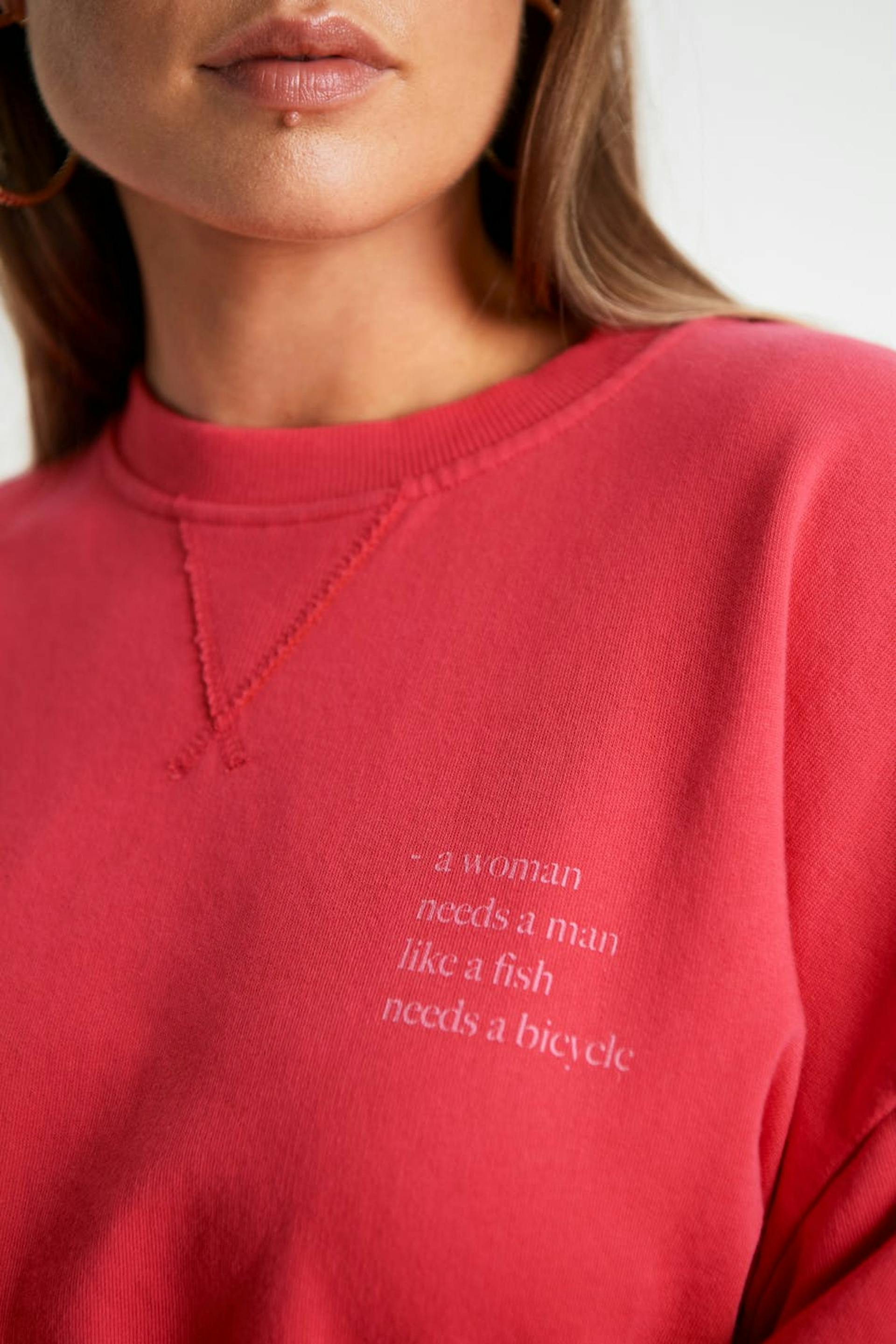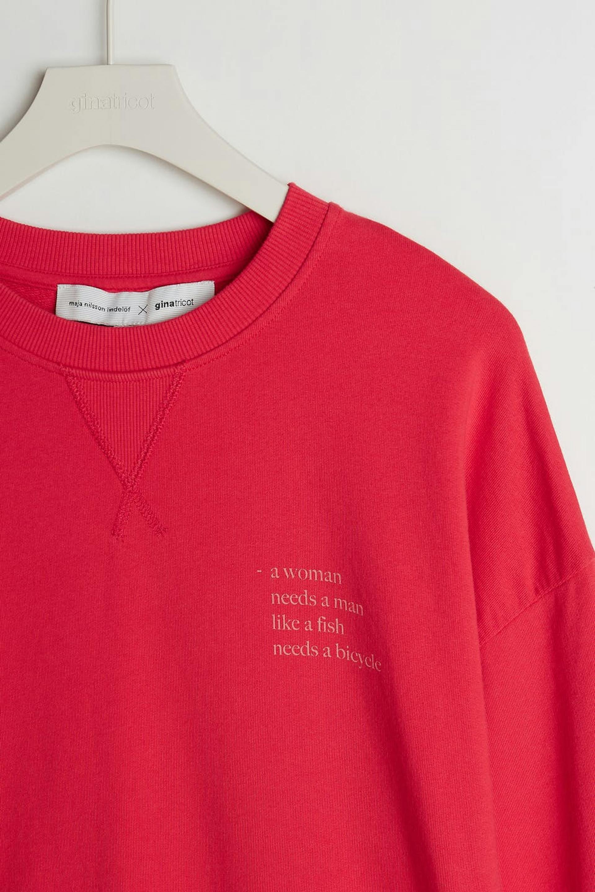 Maja X Gina tricot. Sweatshirt mit einer normaler Passform. Das Sweatshirt ist rosa und hat eine übergroße Passform. Es hat Naht-Details bis zum Hals und einen Druck mit einem Text auf der Brust.