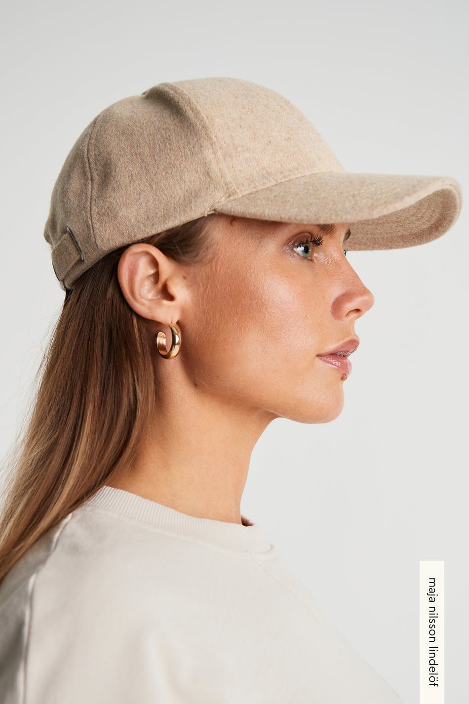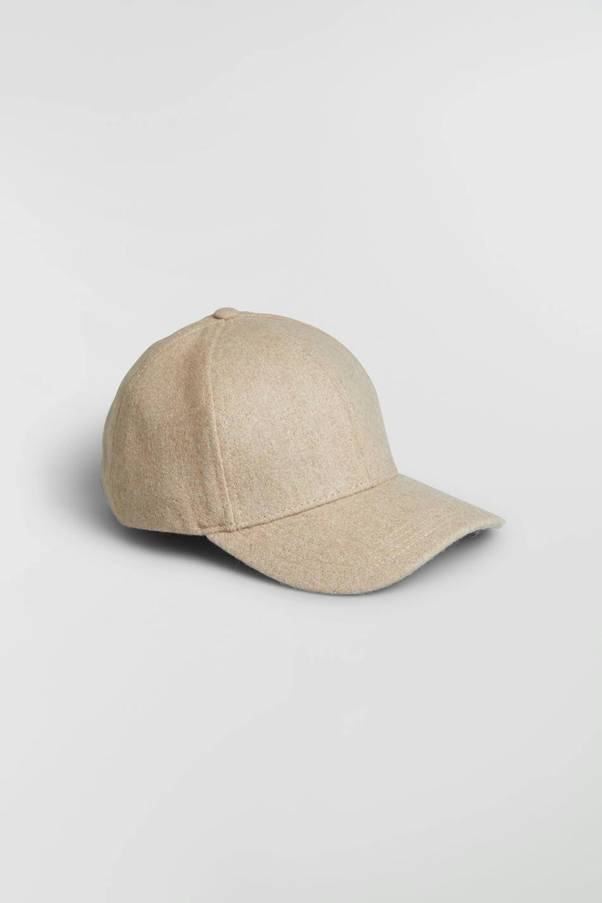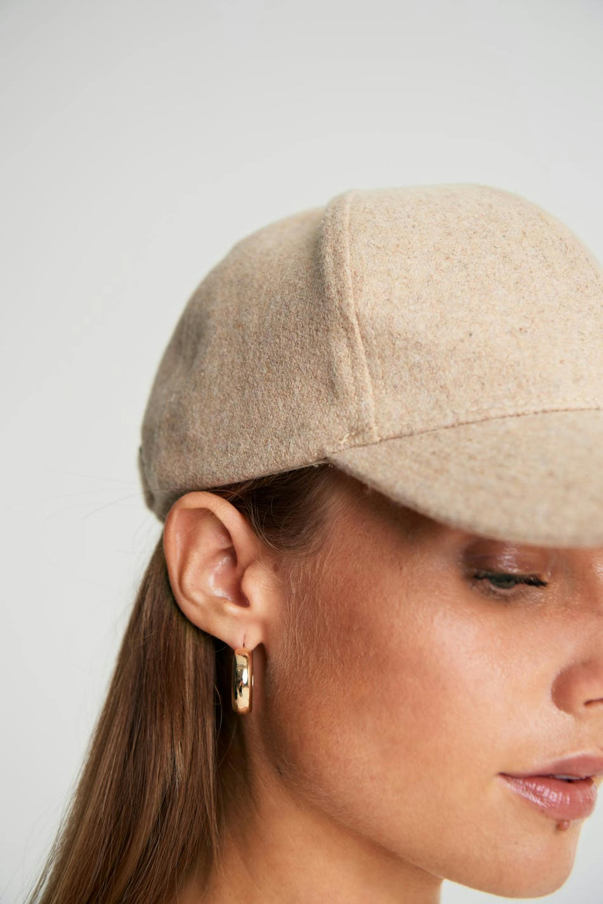Maja X Gina tricot. Modische Kappe. Die Kappe ist beige. Sie ist hergestellt aus Wolle.