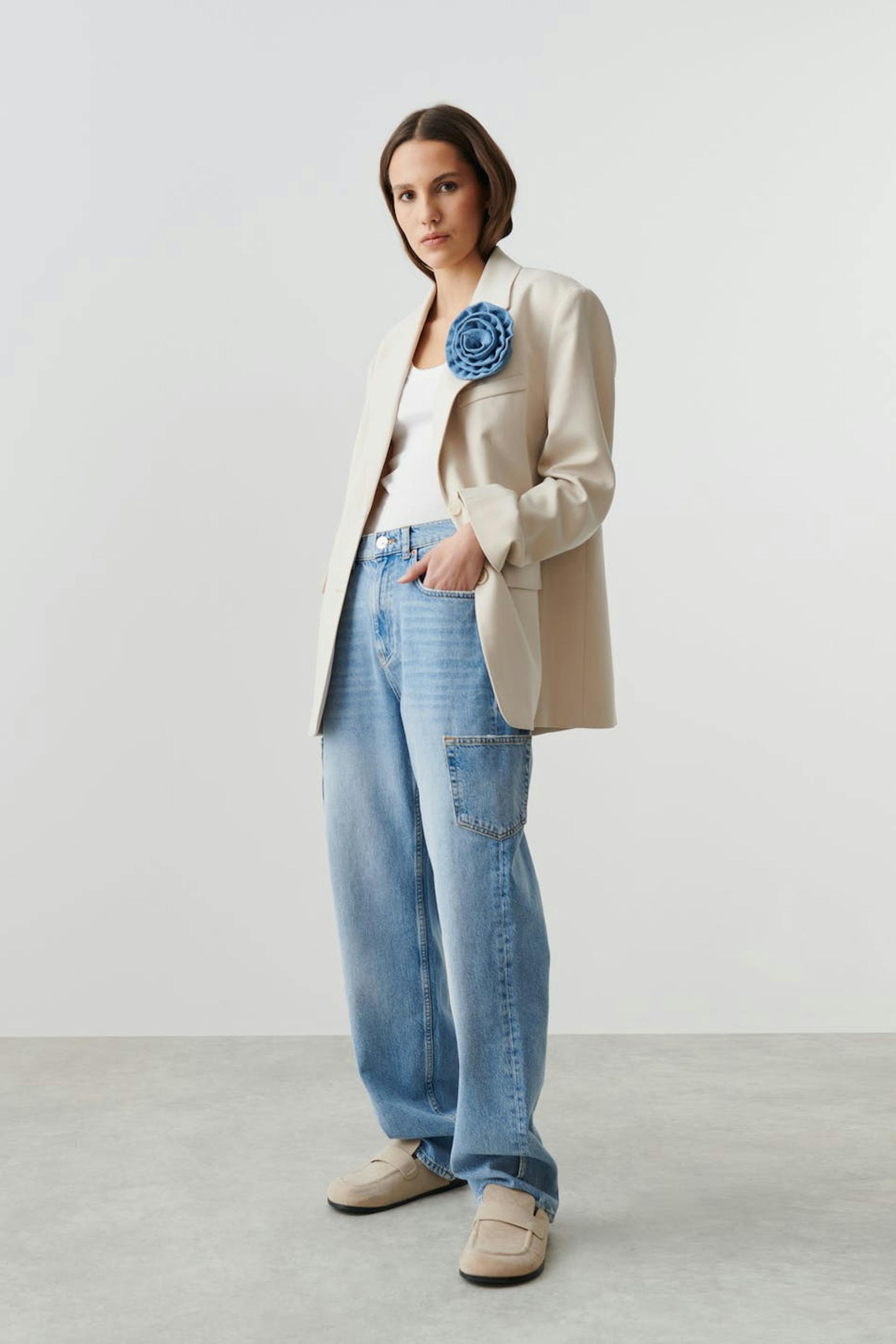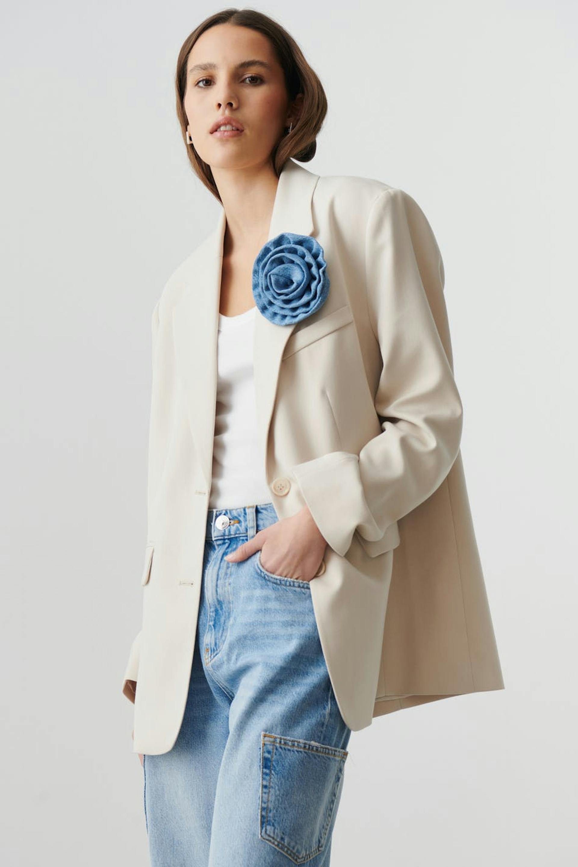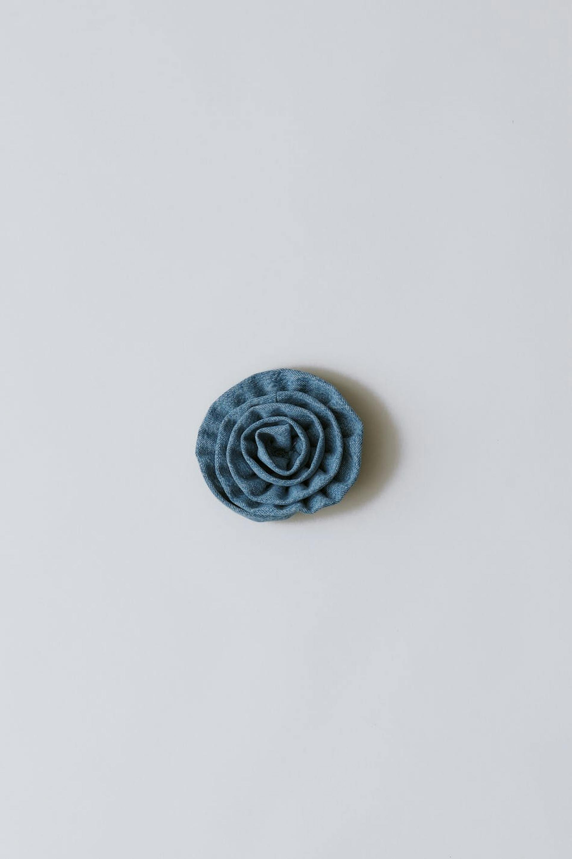 REMADE DENIM COLLECTION. Brosche aus Denim in Form einer Blume.