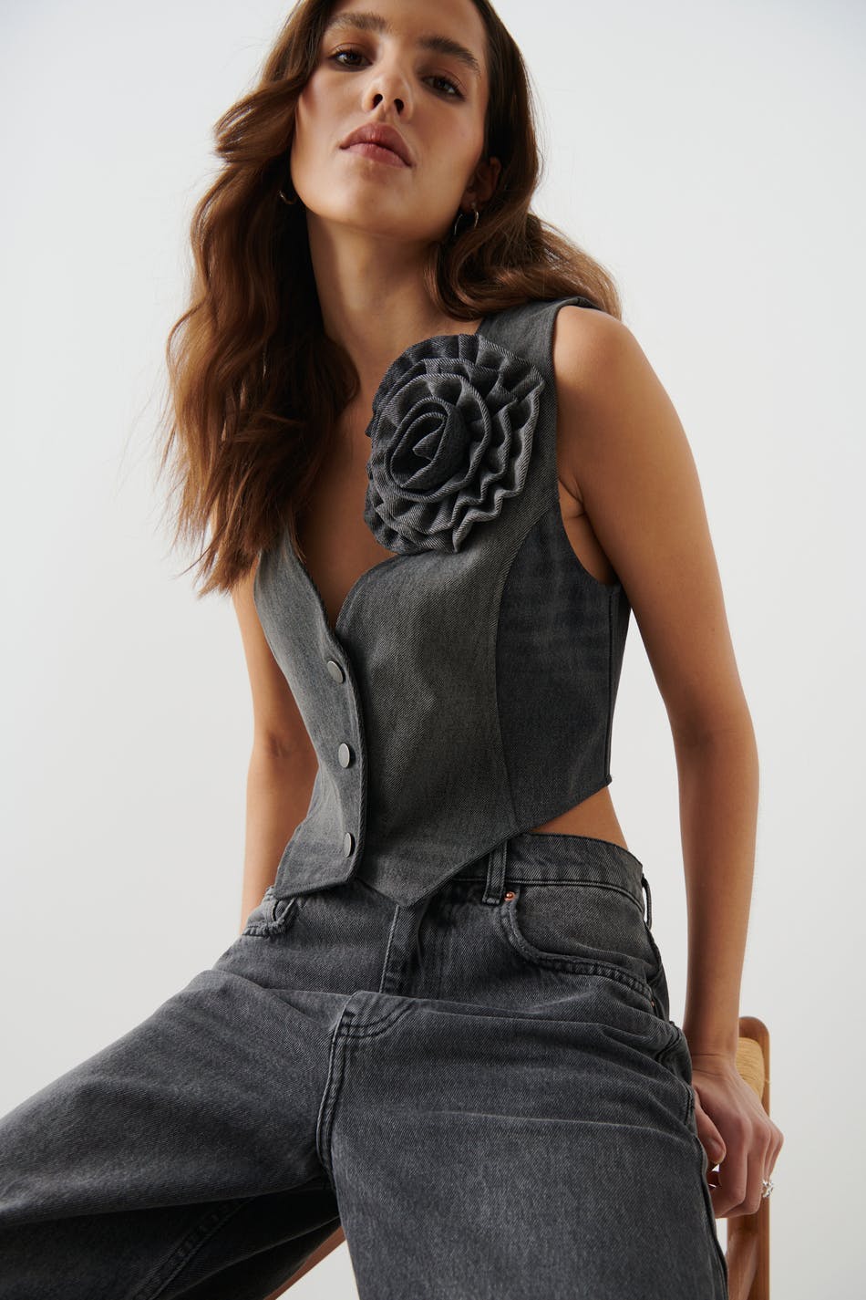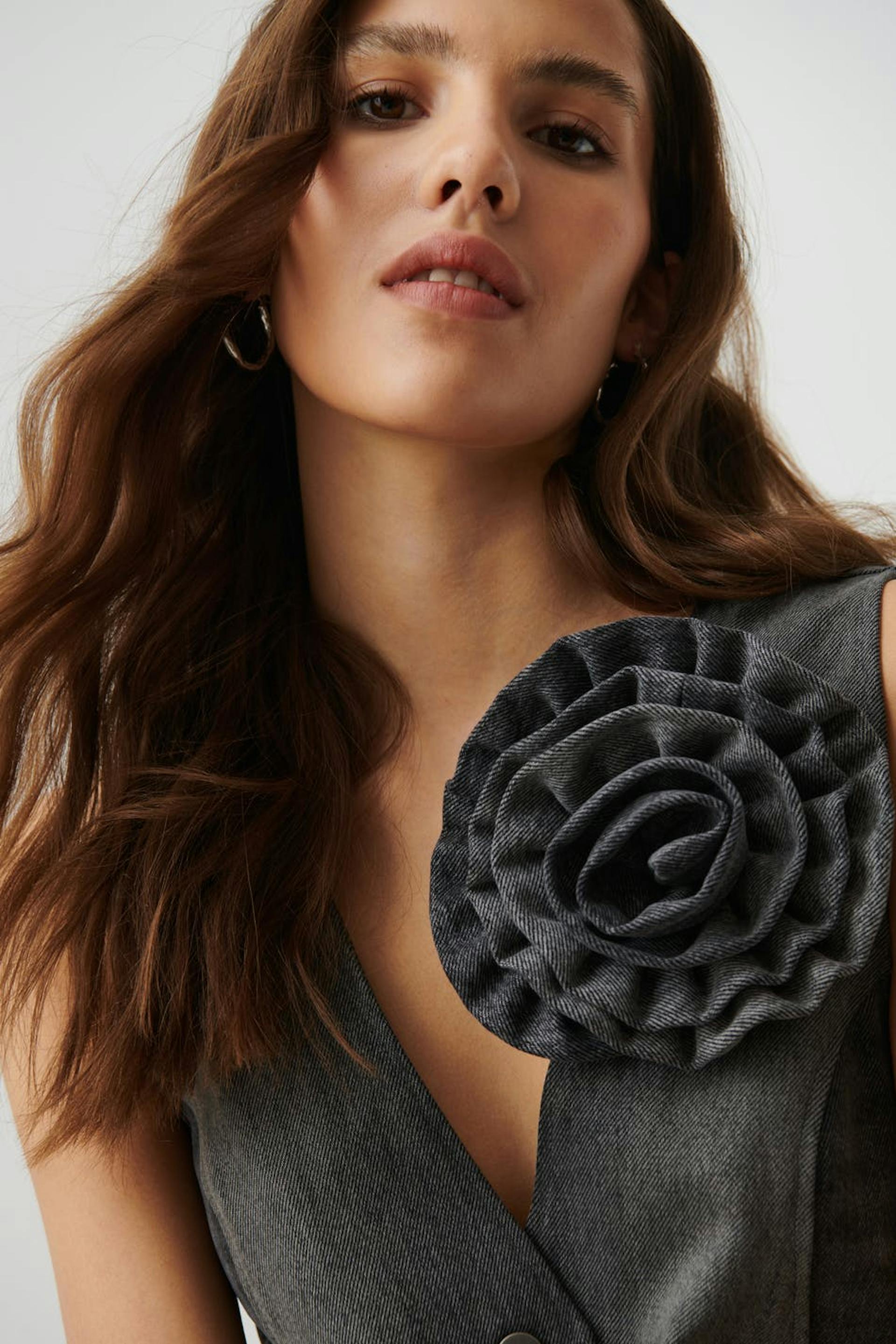 REMADE DENIM COLLECTION. Große Brosche aus Denim in Form einer Blume.
