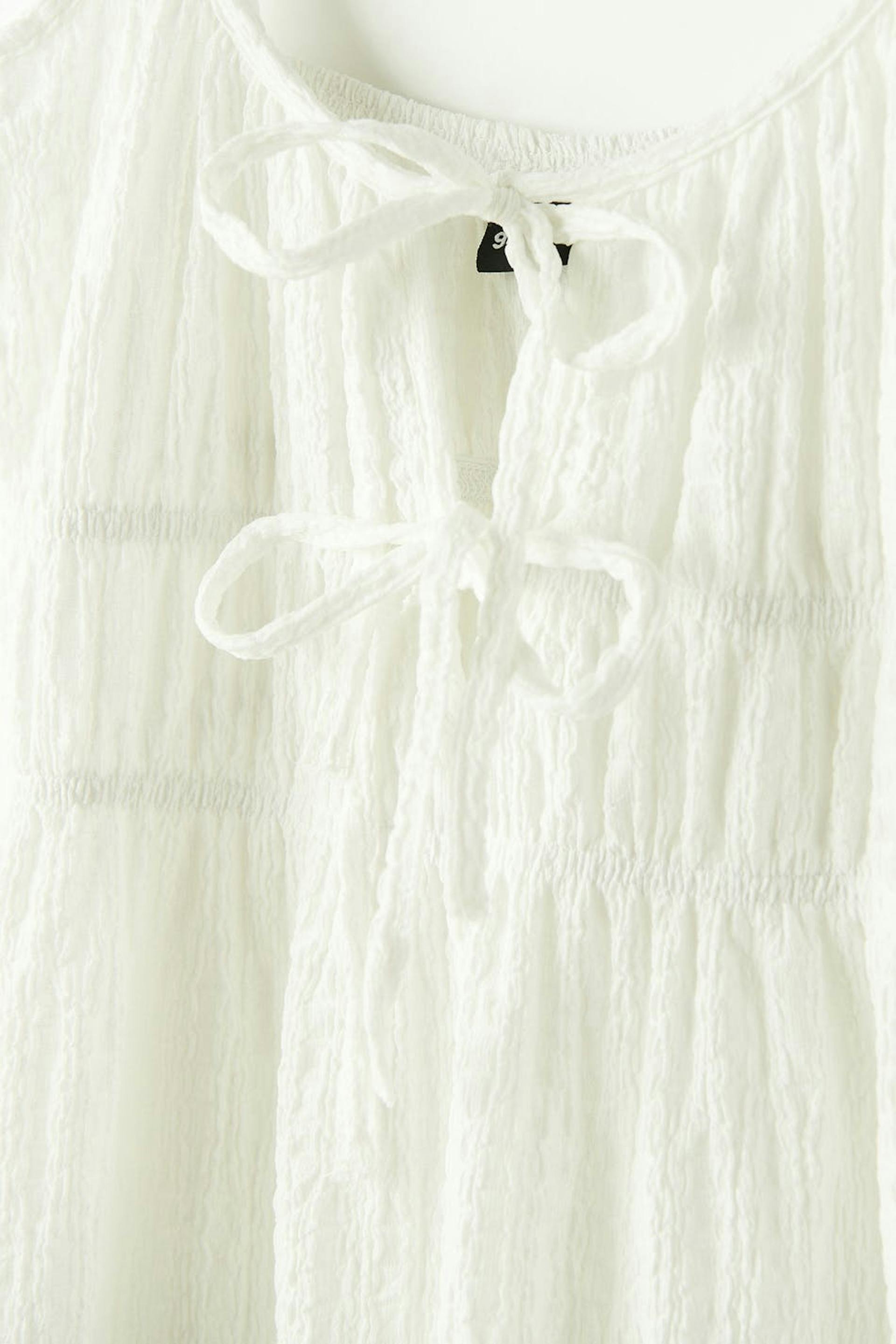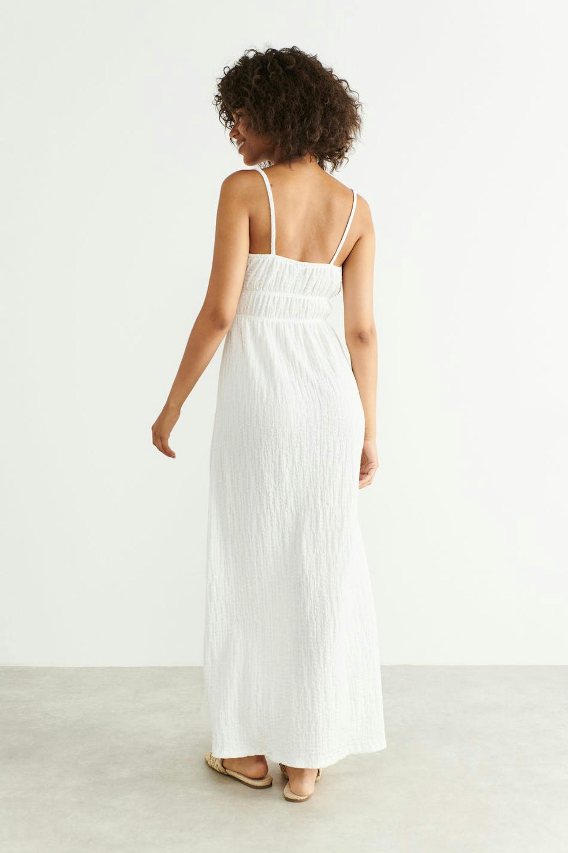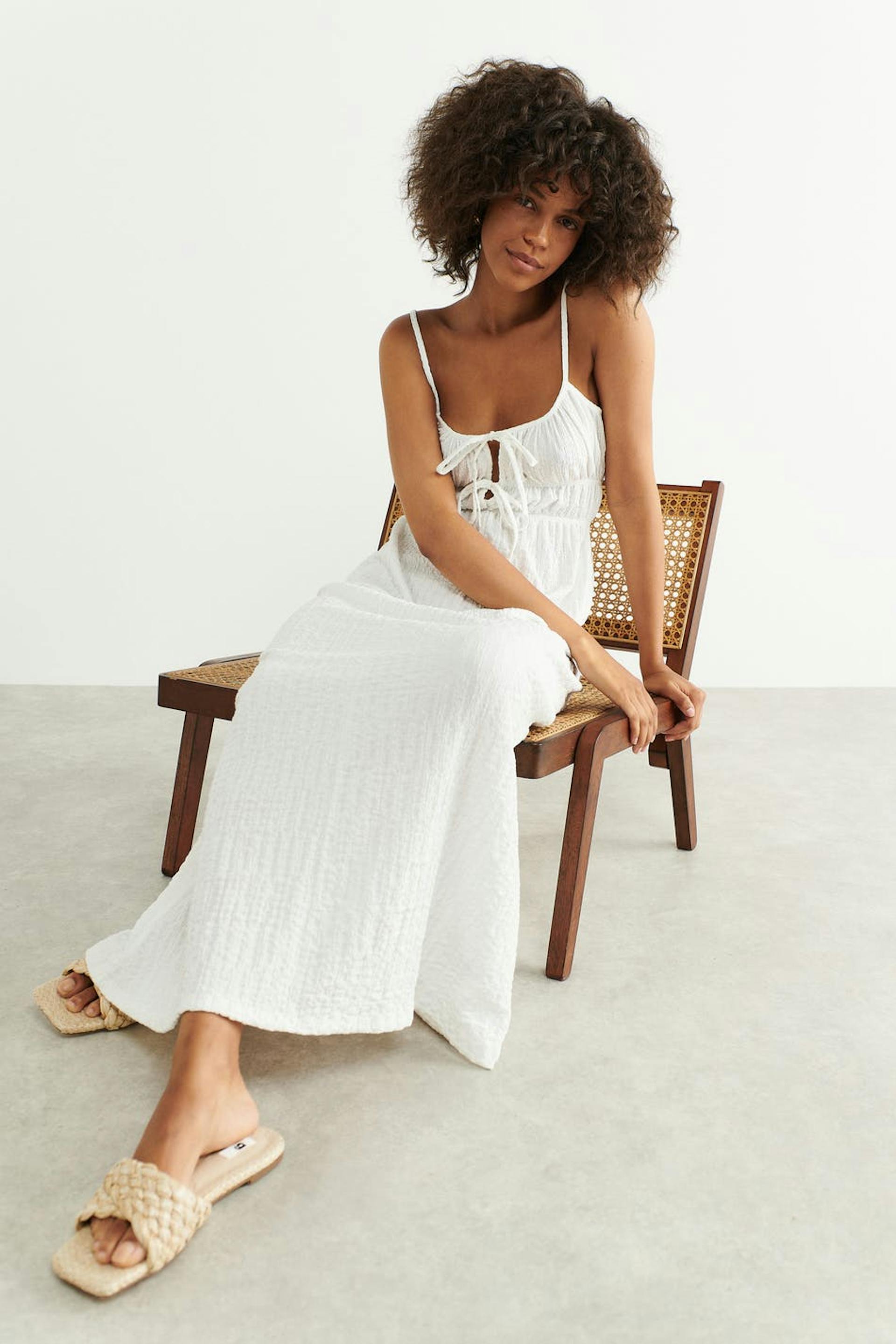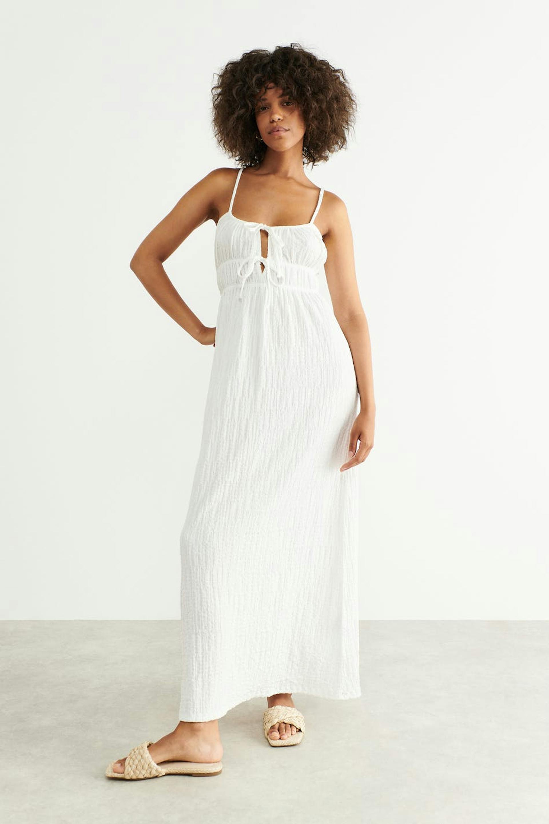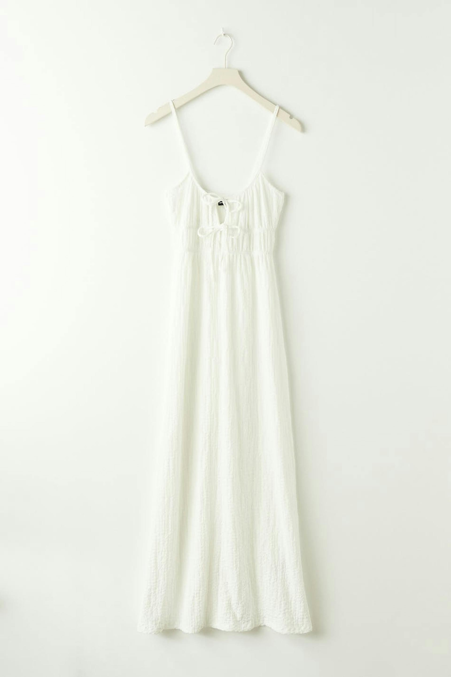 Maxikleid aus Jersey mit einer Oversize-Passform. Das Kleid ist weiβ und hat Knoten-Details vorne.