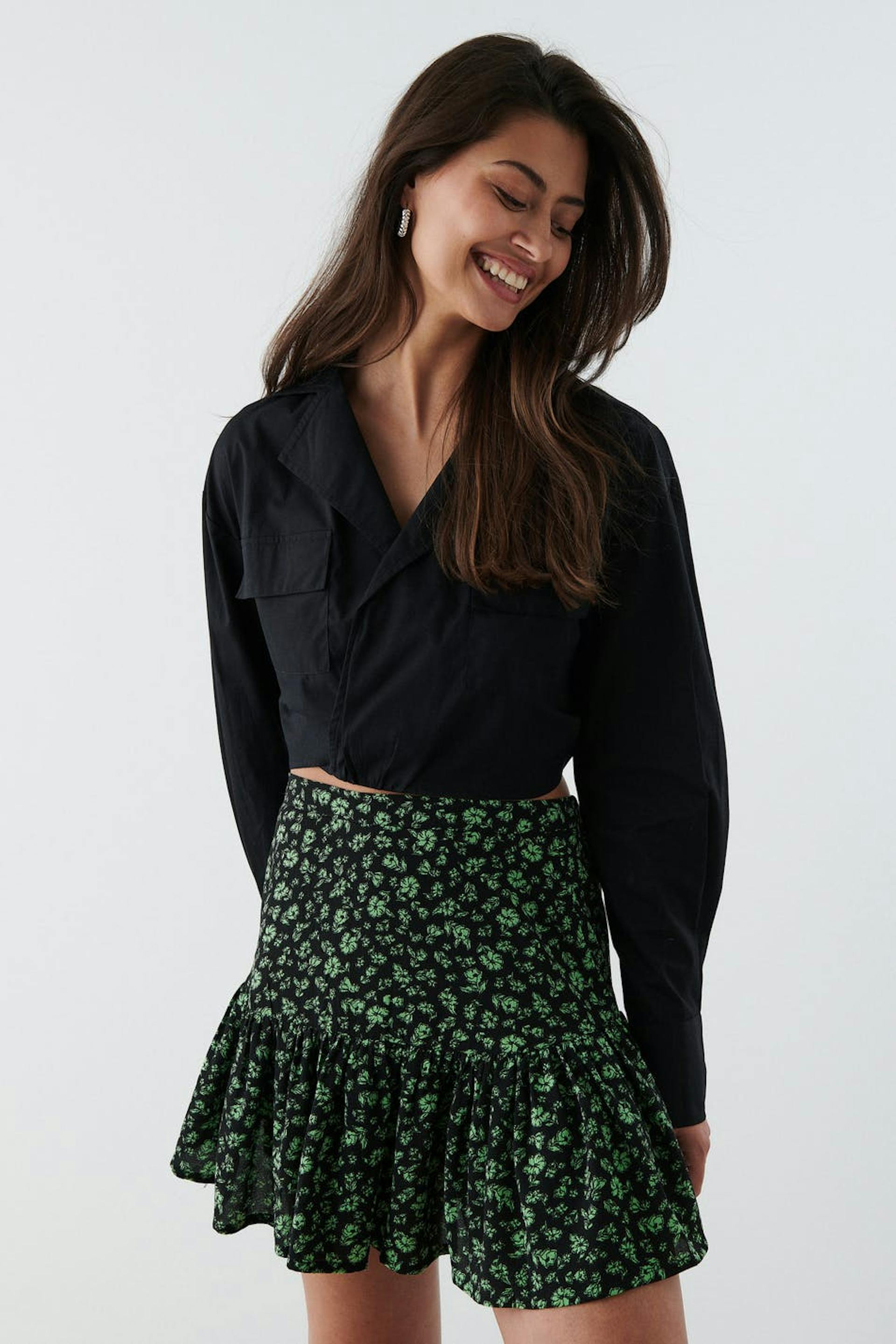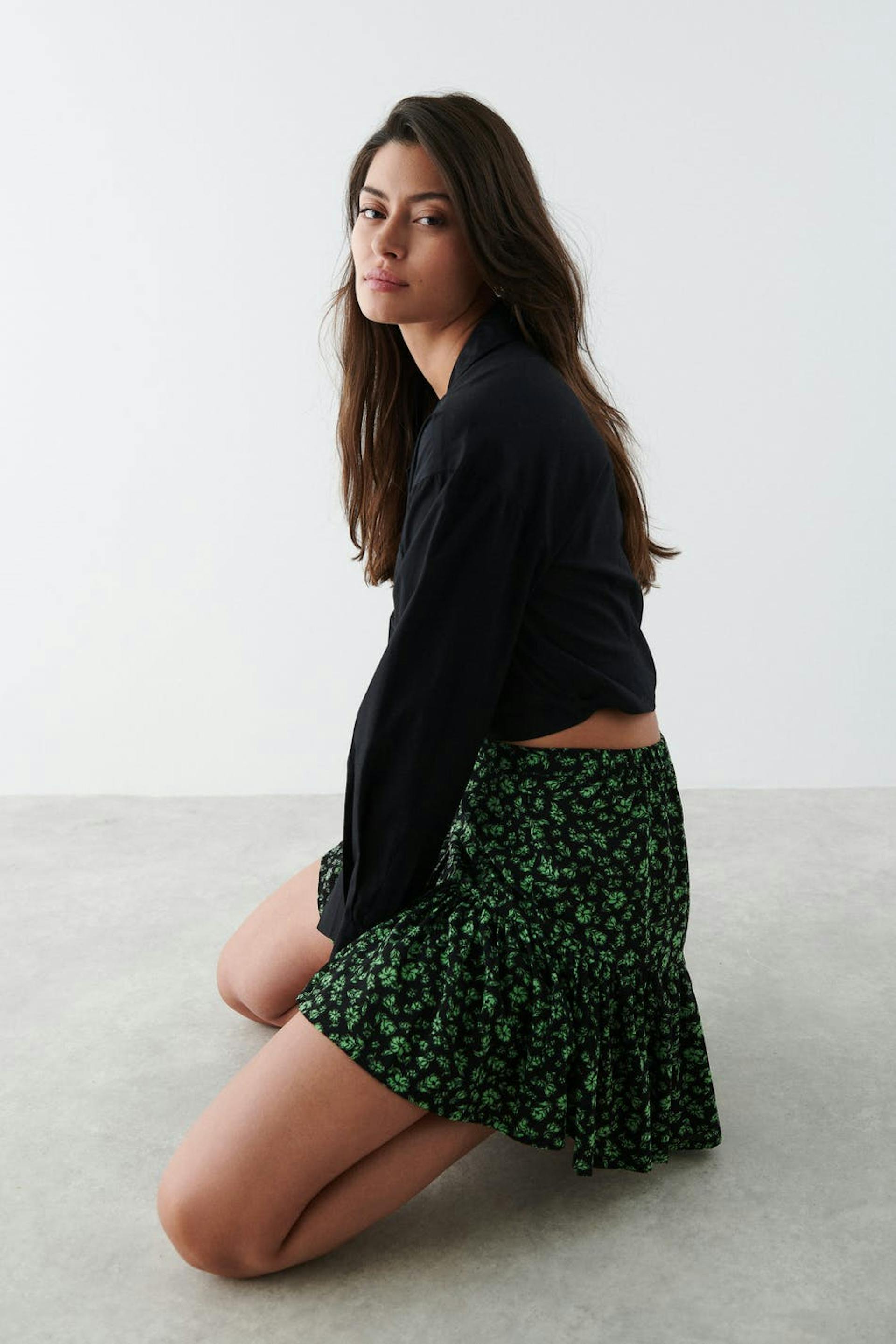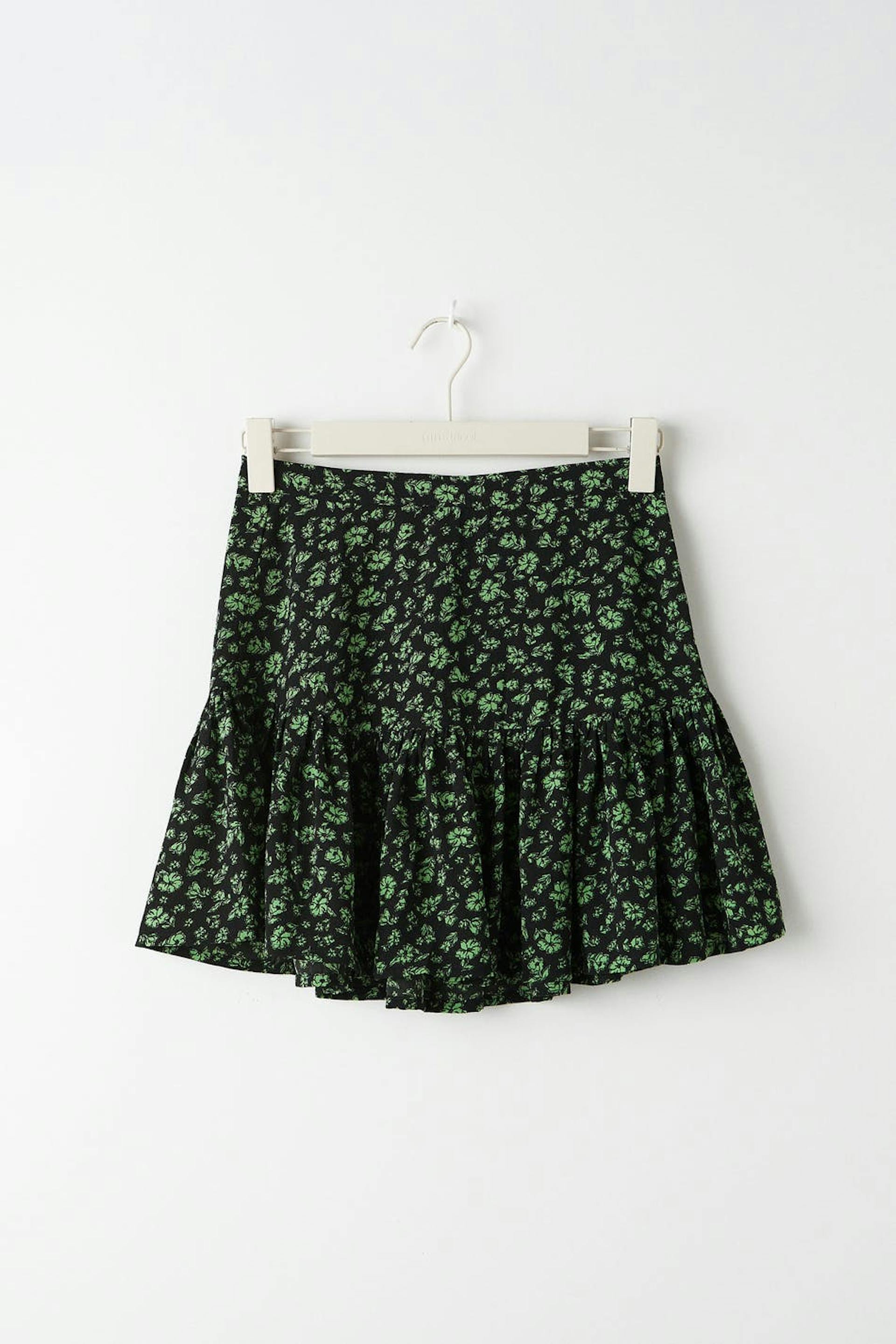 Blumiger Rüschenrock mit Gummiband hinten. Der Rock ist grün, schwarz und kurz. Er hat ein Material aus recyceltem Polyester.