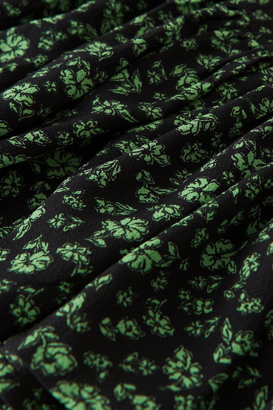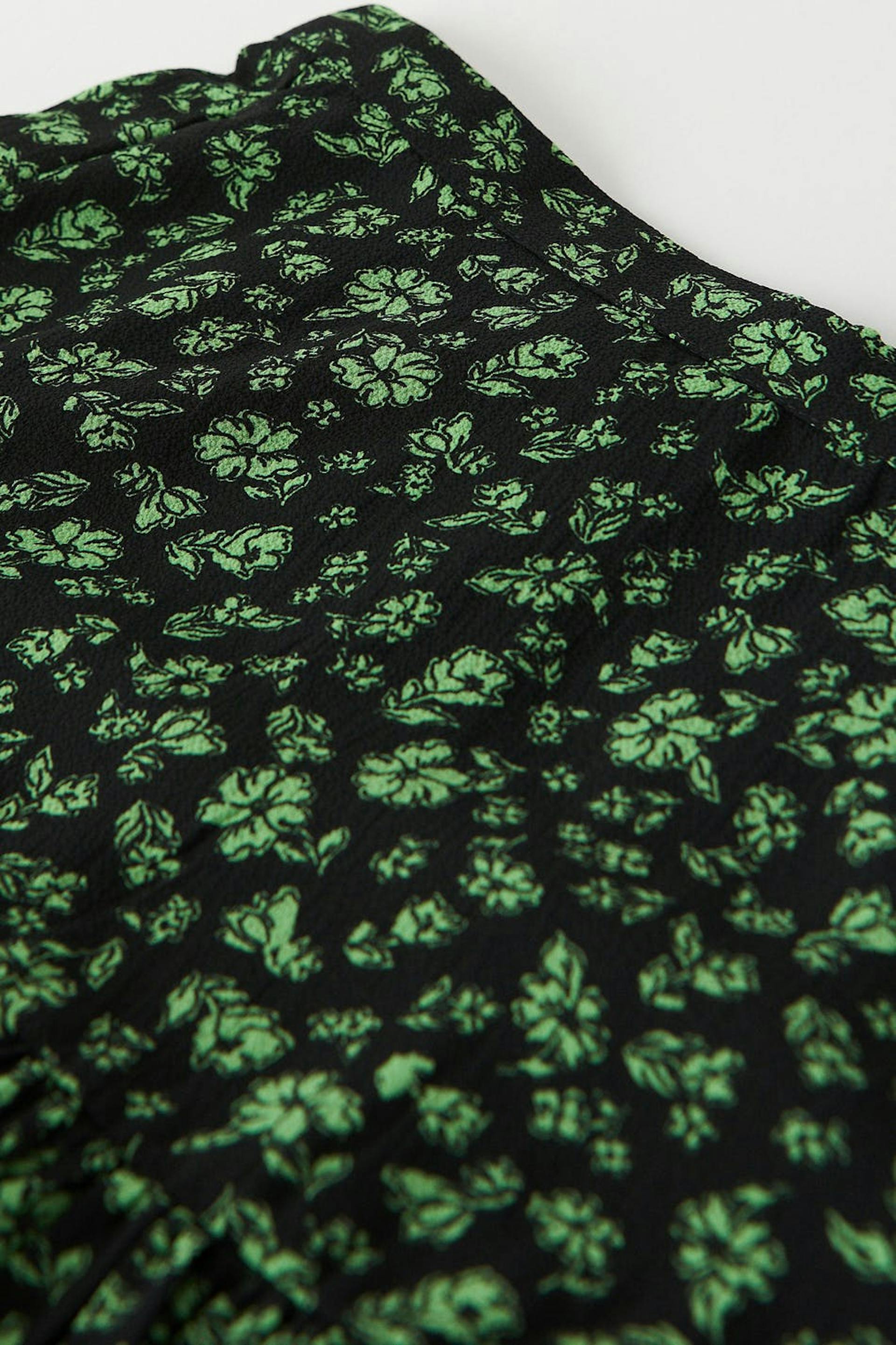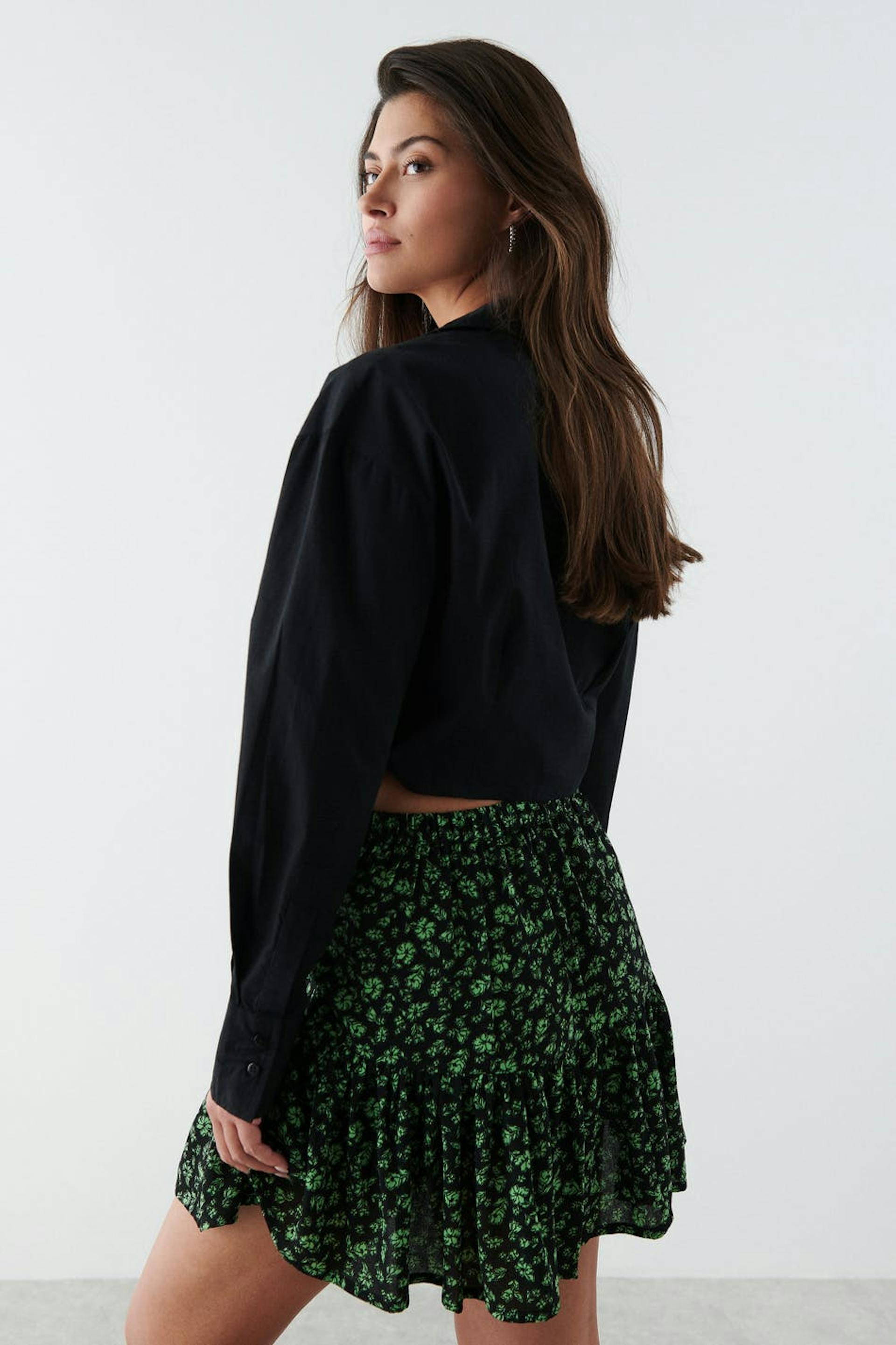 Blumiger Rüschenrock mit Gummiband hinten. Der Rock ist grün, schwarz und kurz. Er hat ein Material aus recyceltem Polyester.