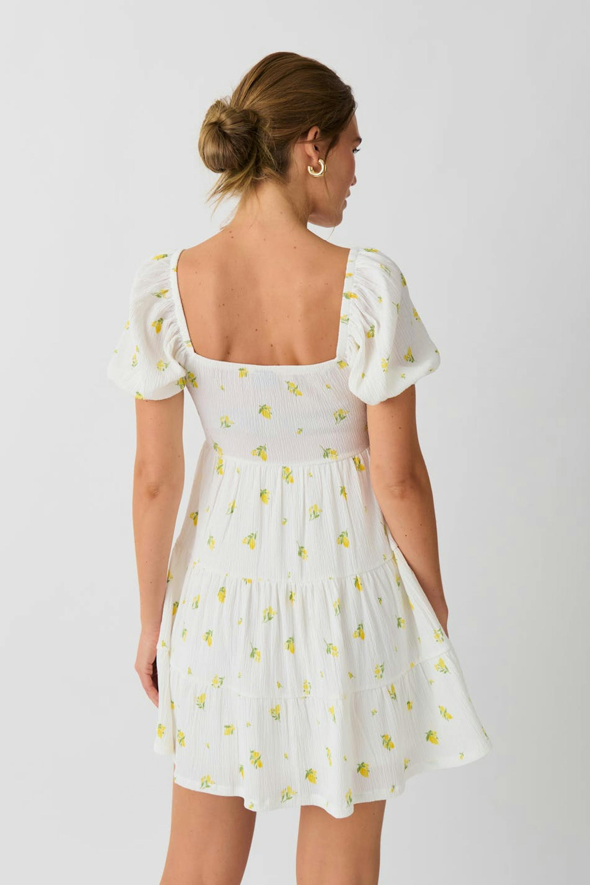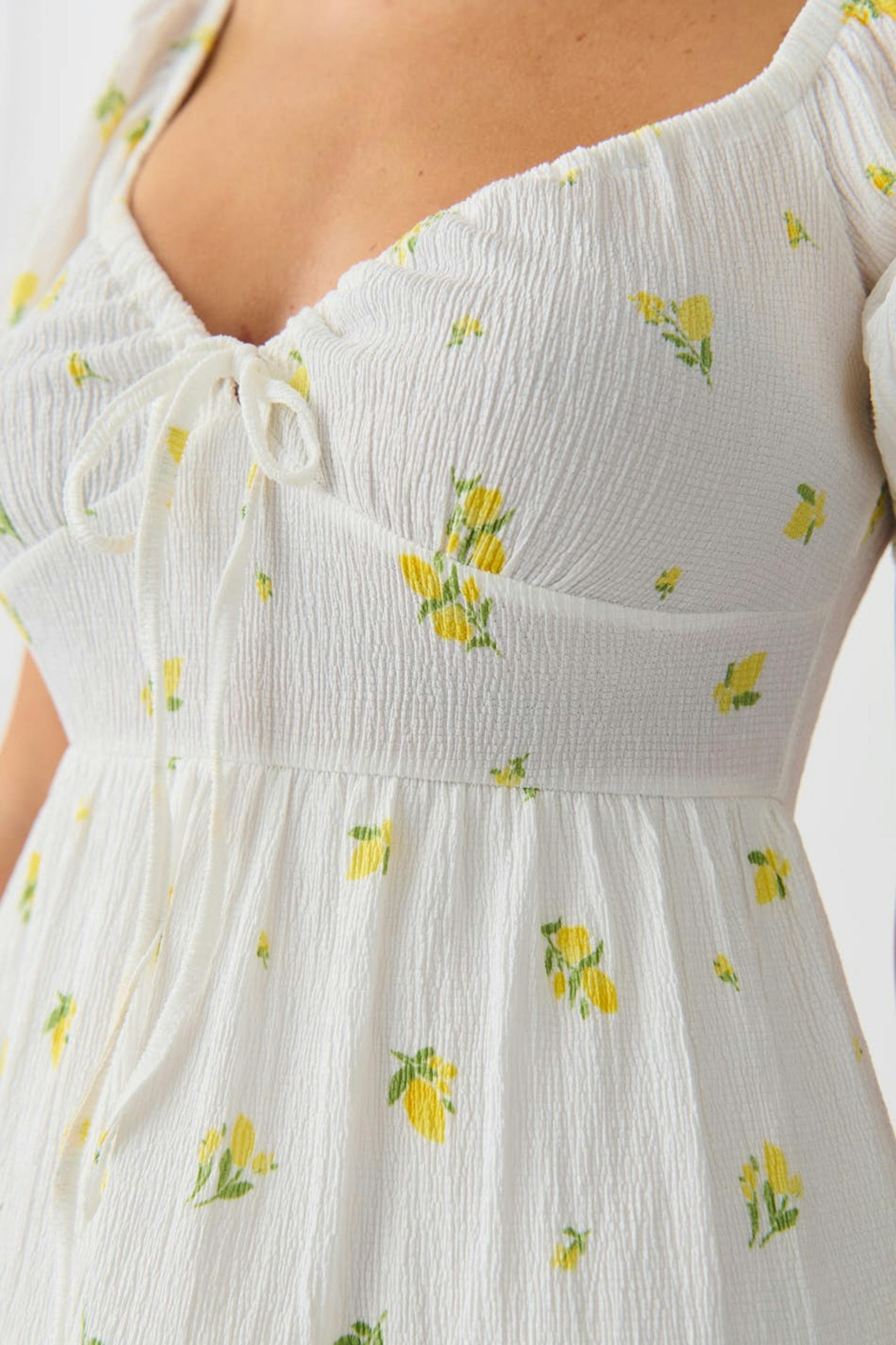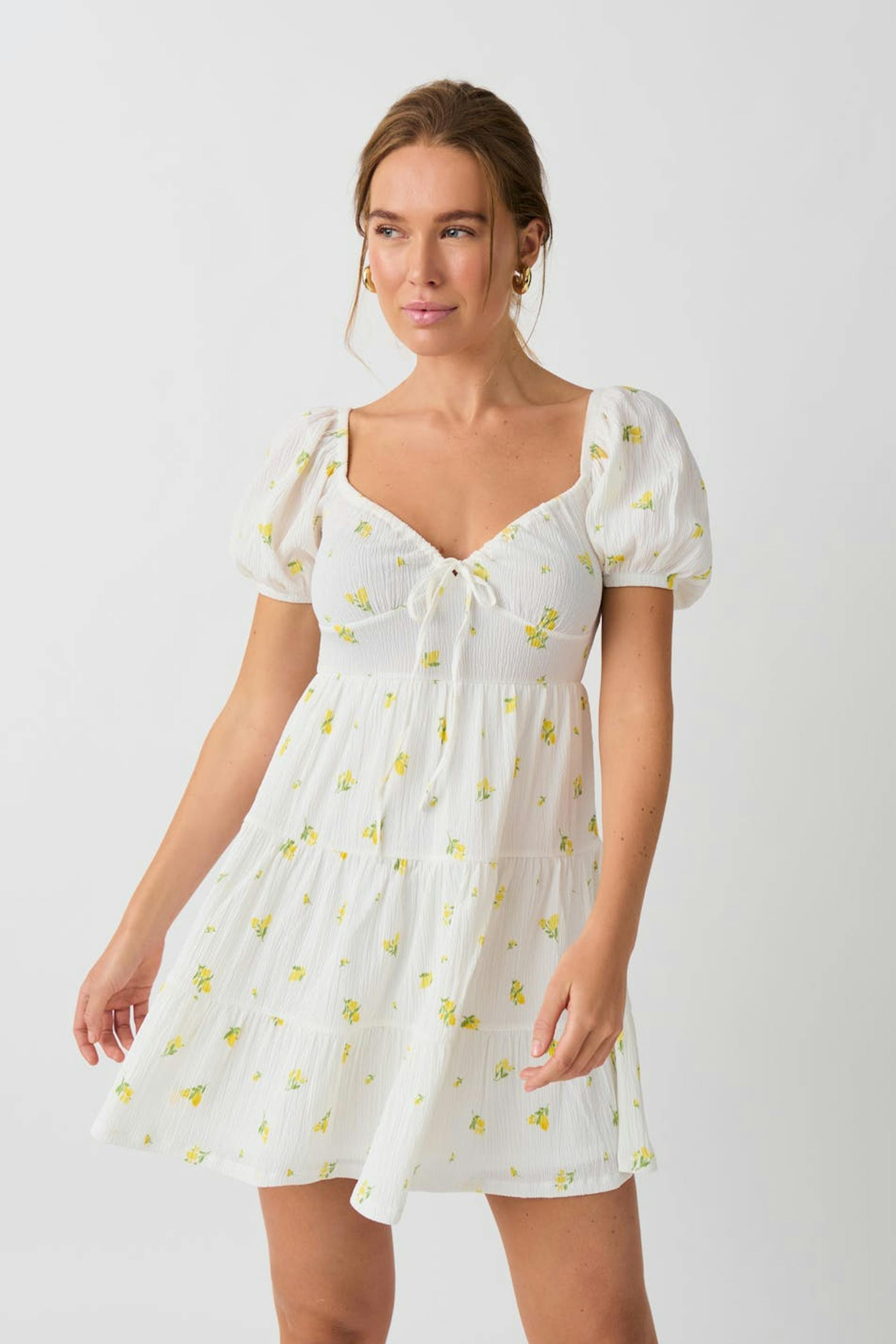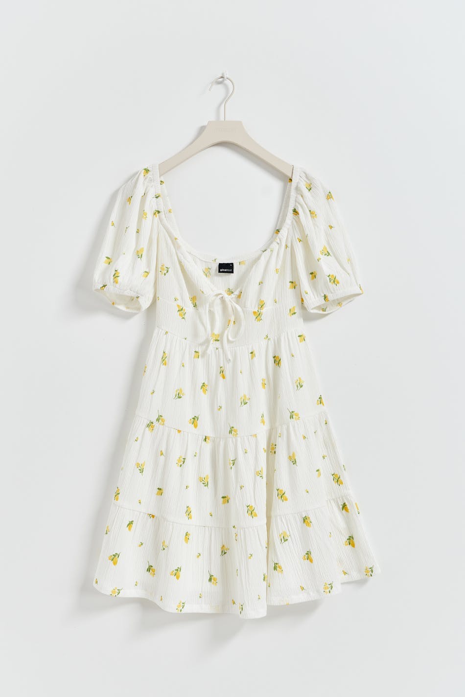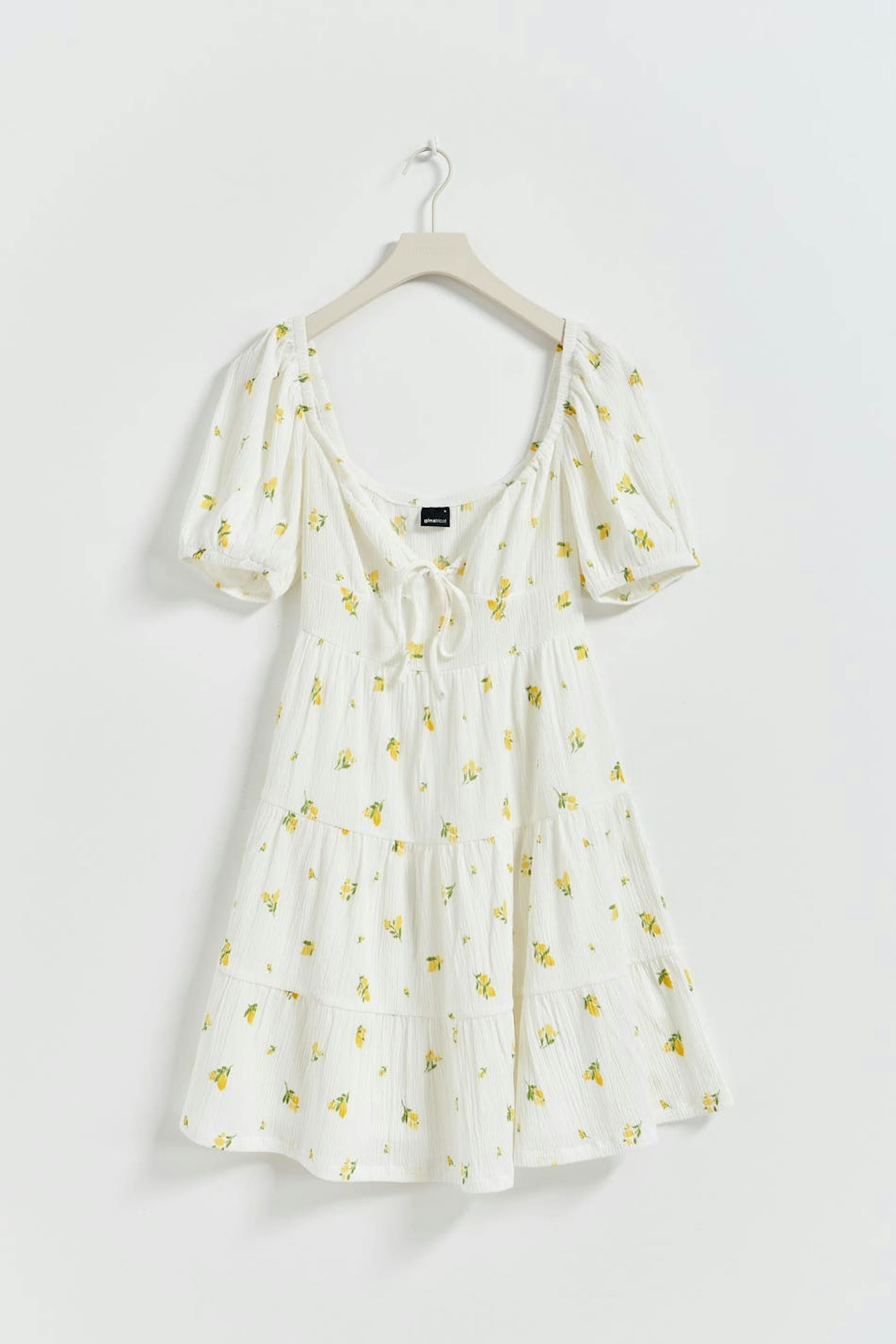 Blumiges Kleid aus Jersey mit Rüschen-Details an der Unterkante. Das Kleid ist weiβ, gelb und kurz. Es hat Selbstbindung vorne, normale Passform, V-Ausschnitt, kurzen Puffärmel und Gummiband an den Ärmelenden und um die Schultern herum.