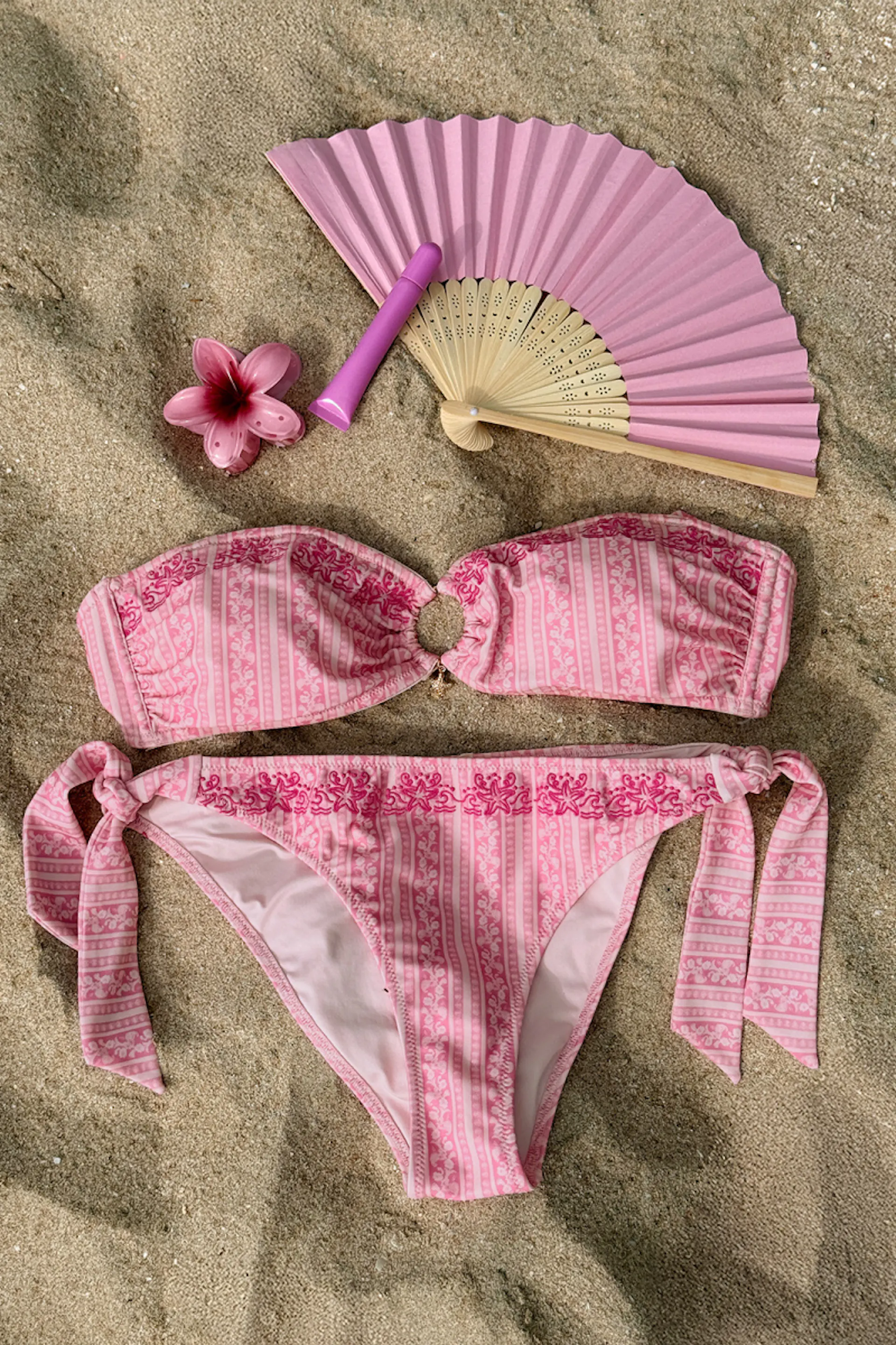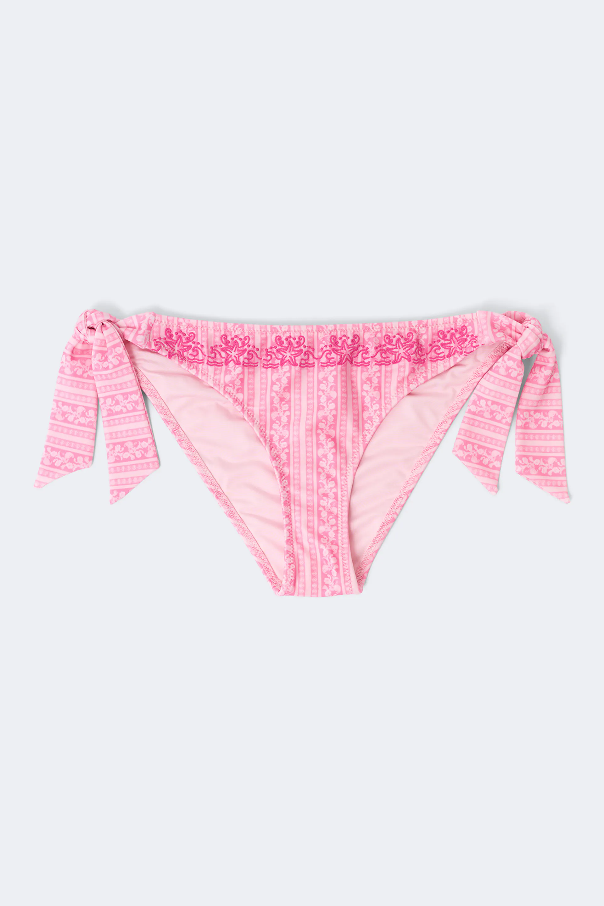 Gemusterte Bikini-Unterteile mit Selbstbindung in den Seiten. Die Höschen sind rosa und haben gestickte Details. Sie haben mittlere Taille und vollständig gefütterte Innenseite.