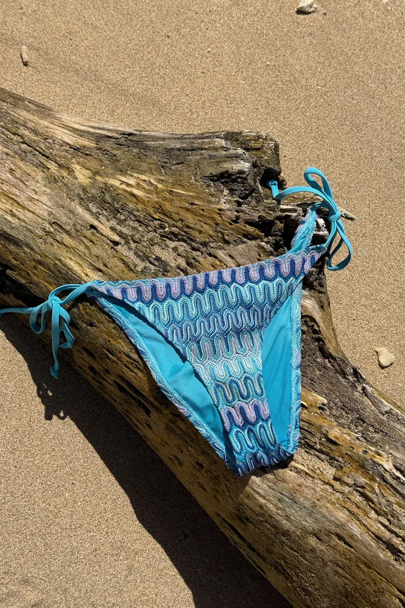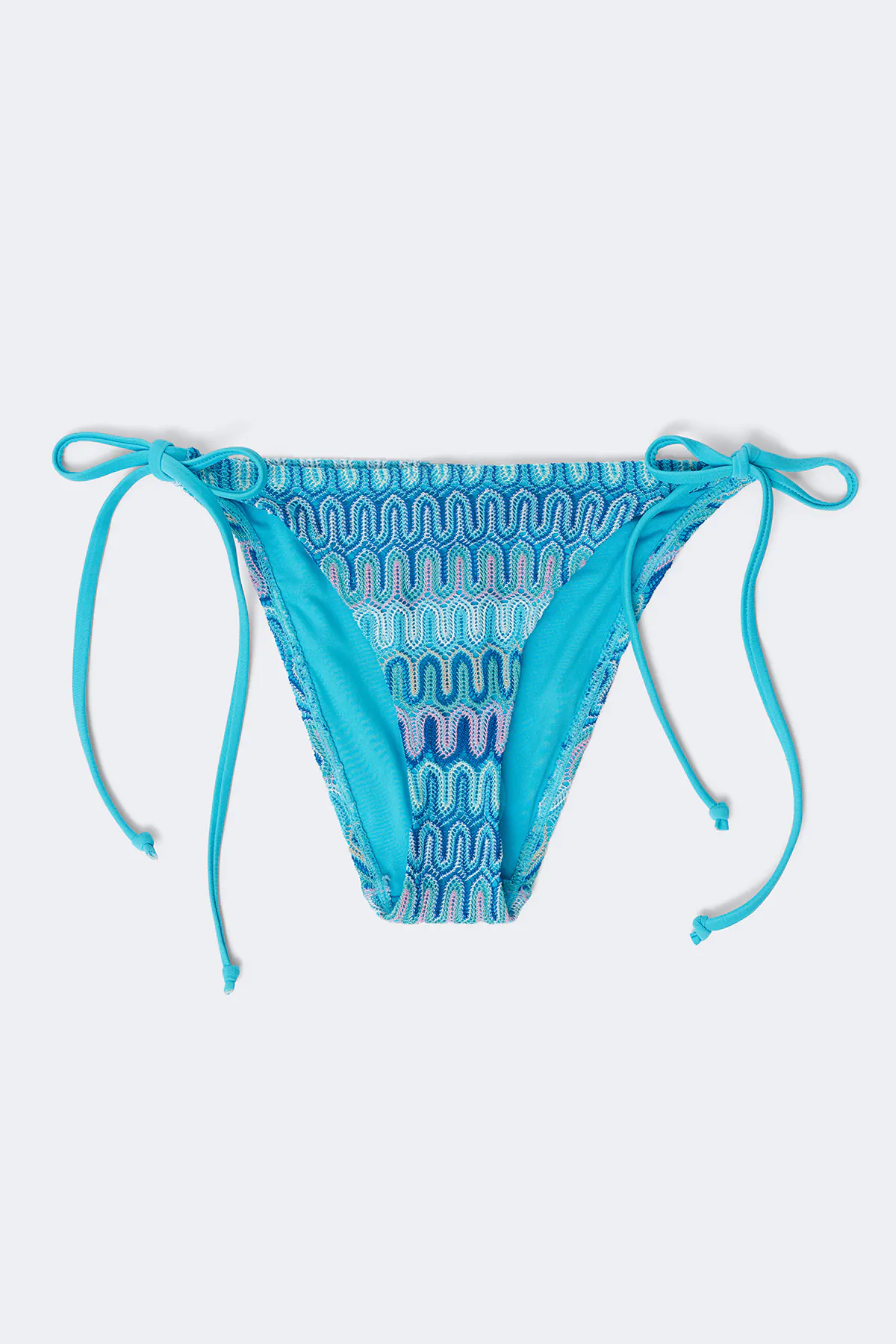Gemusterte Bikini-Unterteile mit Selbstbindung in den Seiten. Die Höschen sind blau und haben elastische Kante. Sie haben gefütterte Innenseite.