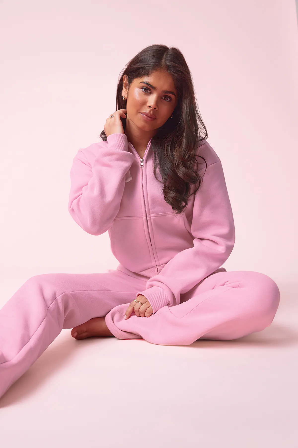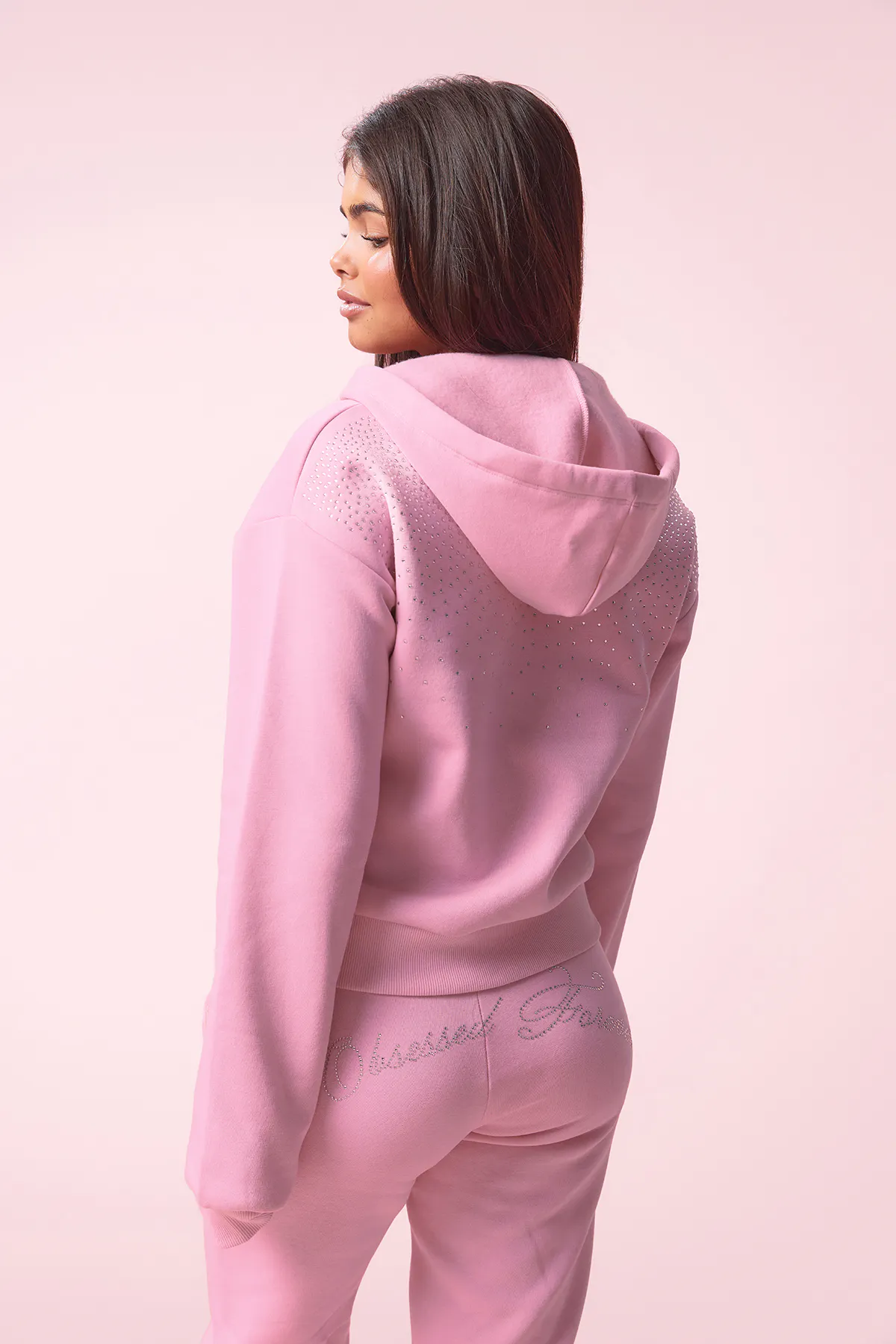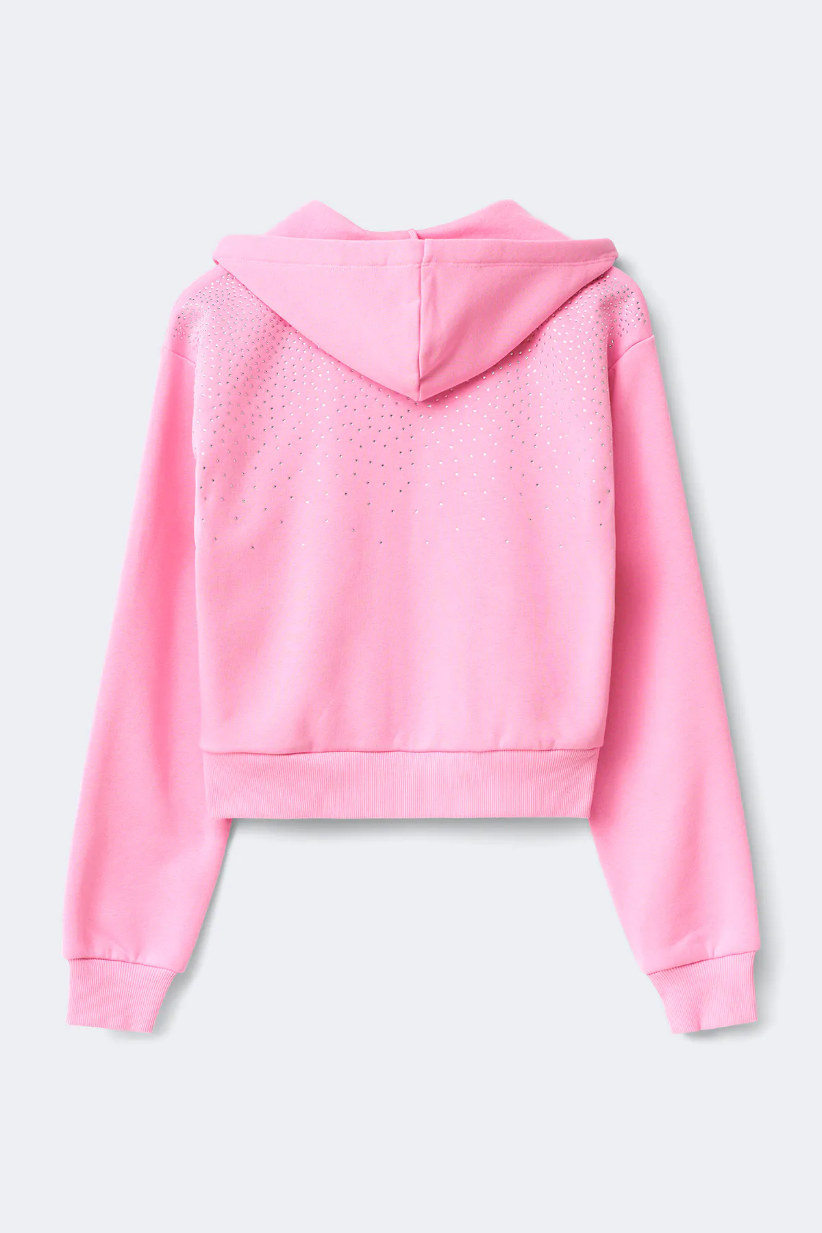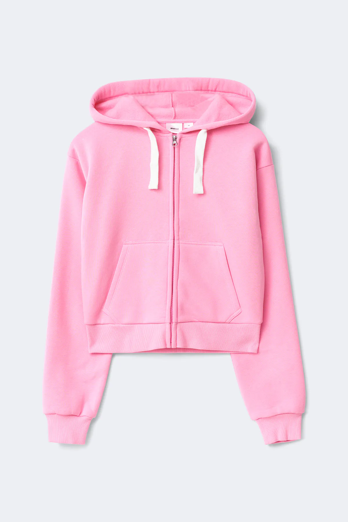 Kapuzenpullover mit Reißverschluss vorne. Der Pullover ist rosa und hat Text auf dem Rücken. Er hat Kapuze mit Kordelzug, Taschen vorne, Bündchen an den Ärmelenden und an der Unterkante, weichen Stoff und großzügige Passform.
