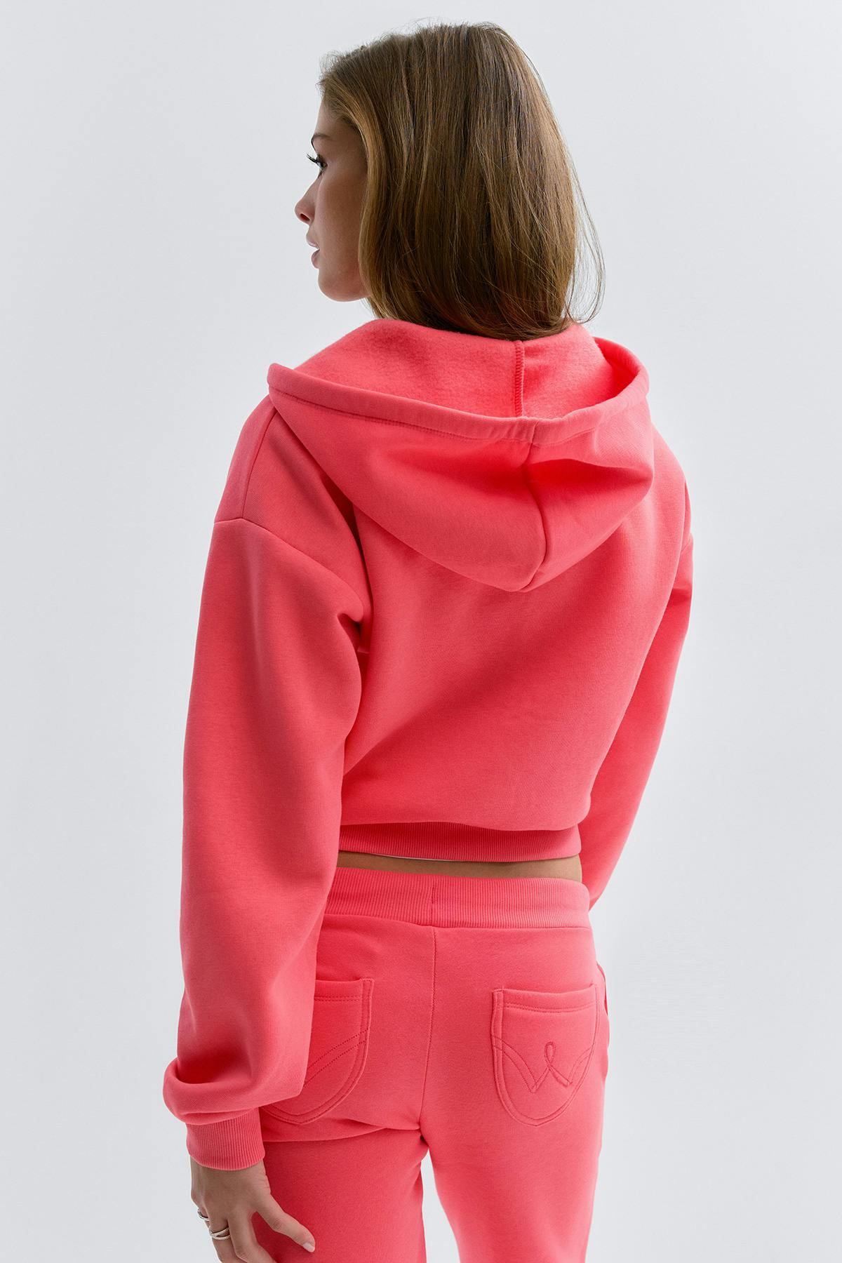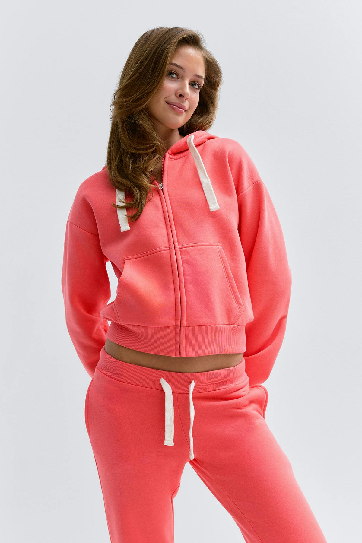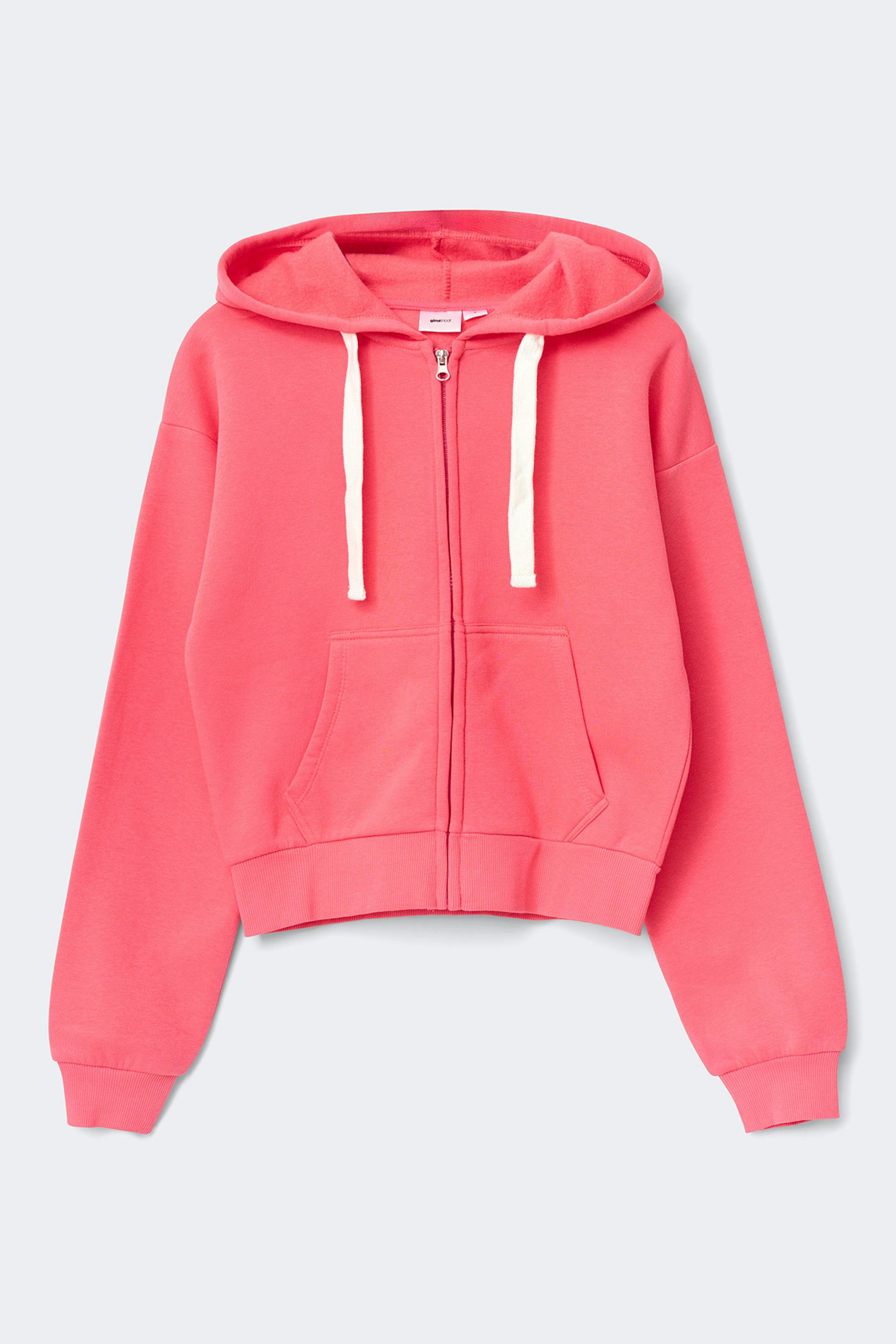 Kapuzenpullover mit Reißverschluss vorne. Der Pullover ist koralle und hat Kapuze mit Kordelzug. Er hat Taschen vorne, Bündchen an den Ärmelenden und an der Unterkante, weichen Stoff und großzügige Passform.