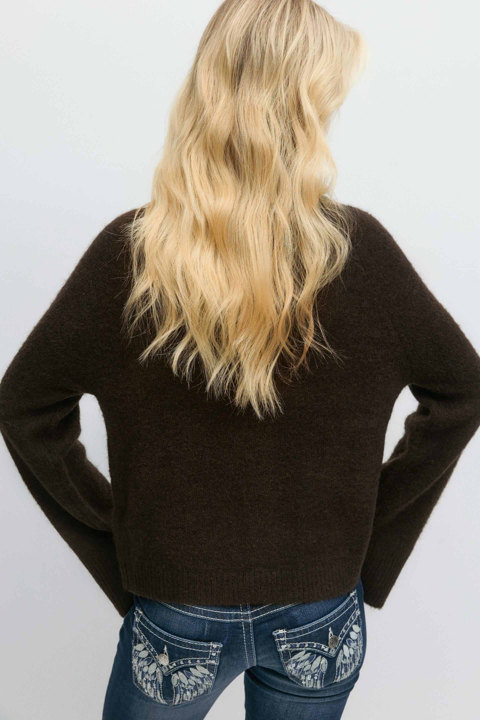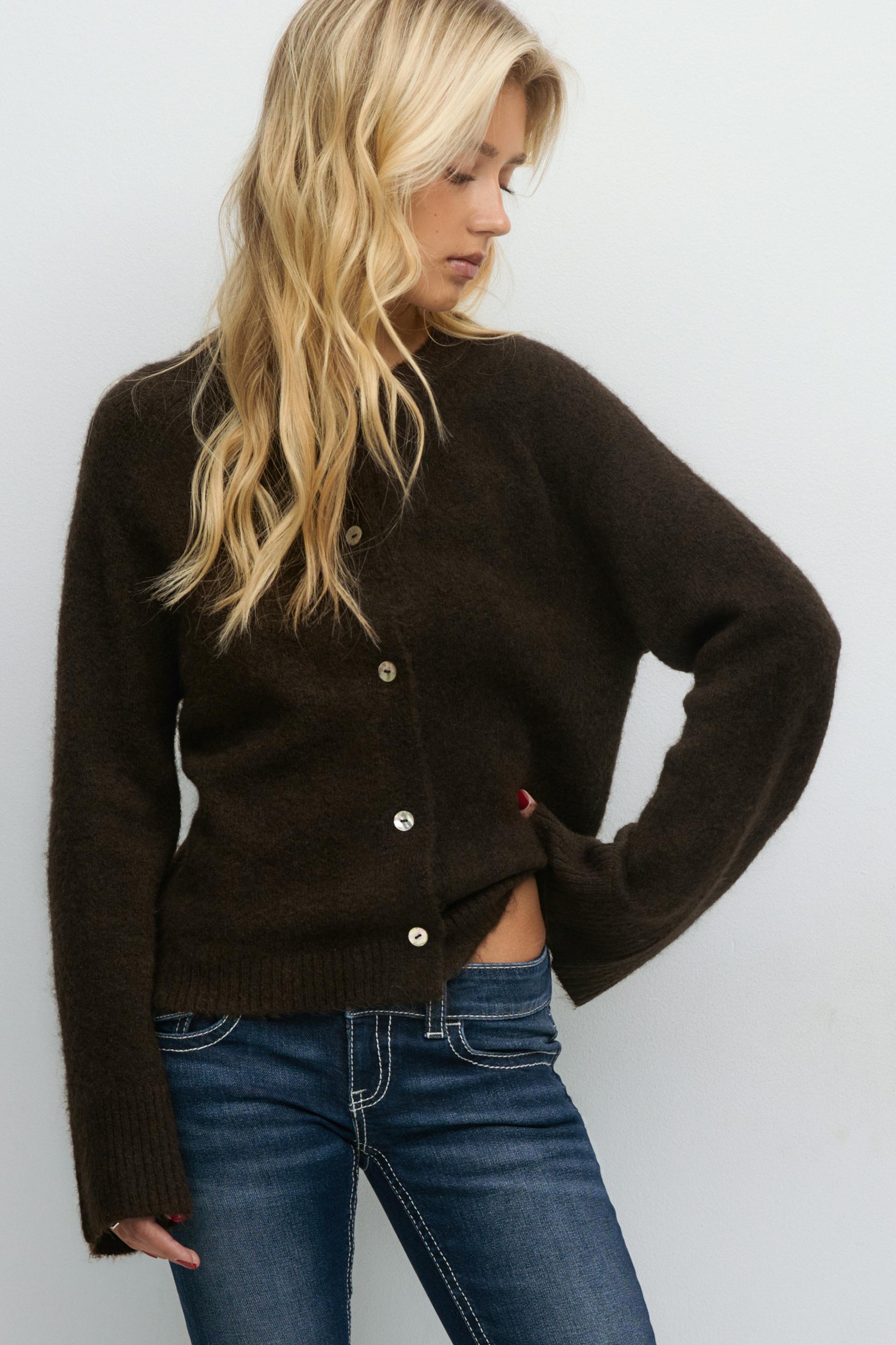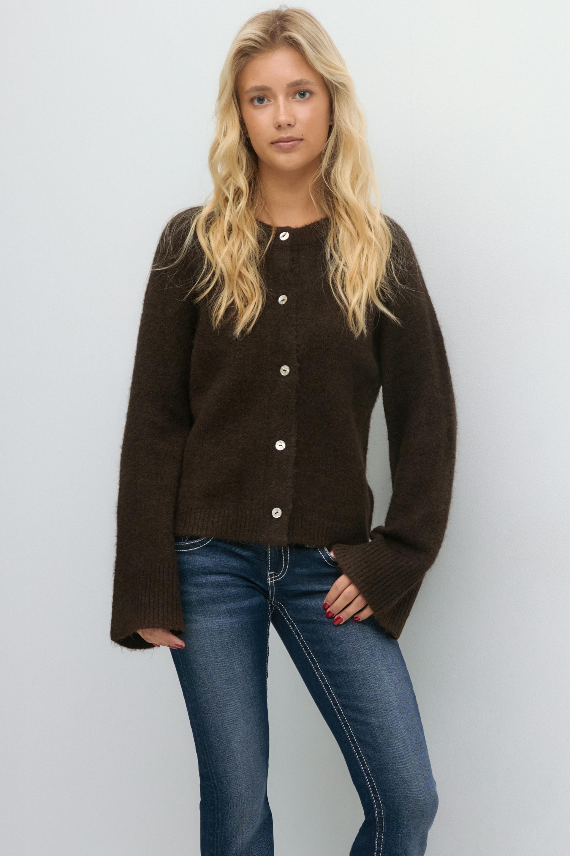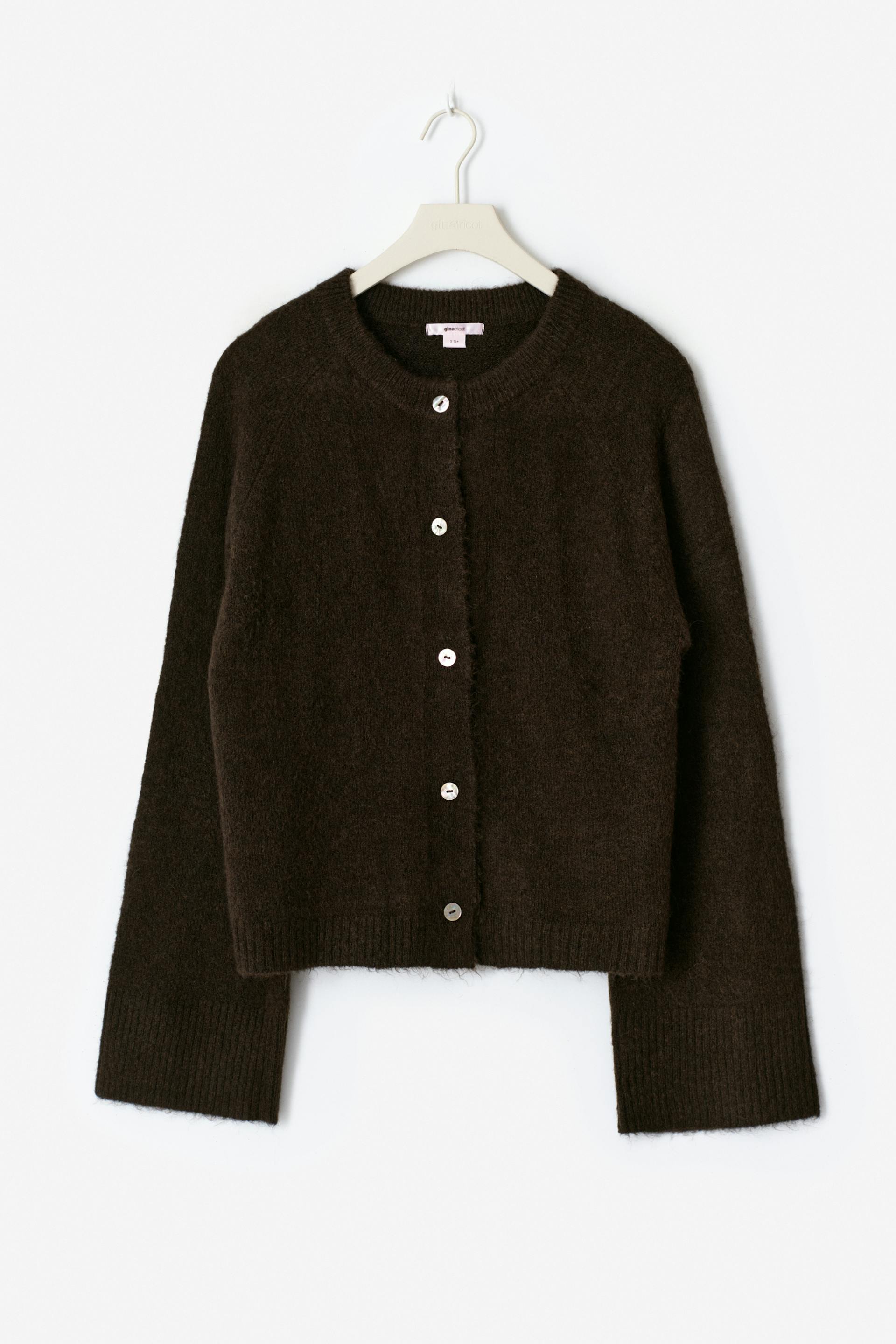 Strickjacke aus Wollmischung mit Knöpfen. Der Cardigan ist braun und hat Rundhalsausschnitt. Er hat normale Passform, lange Ärmel und Rippenstrick.