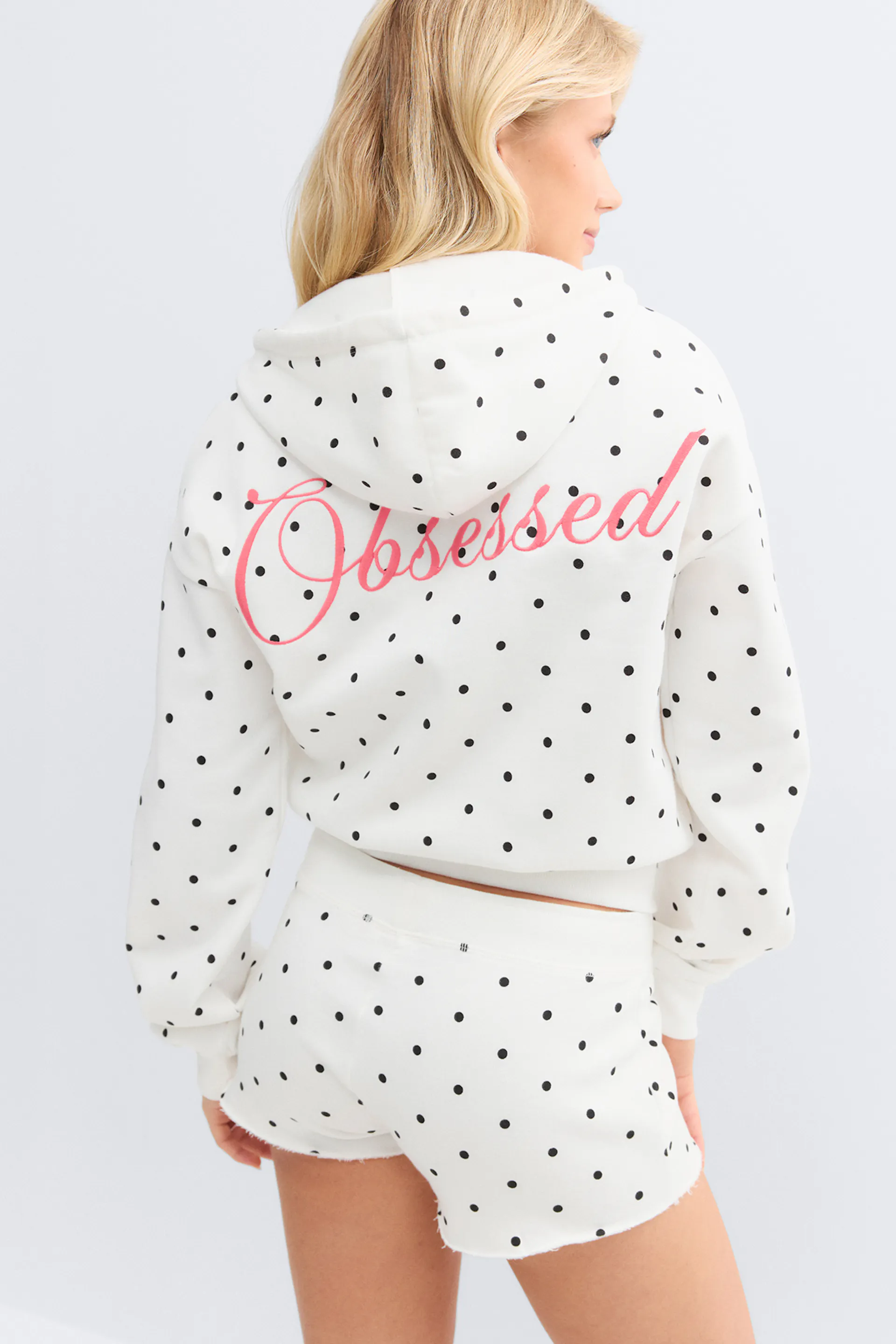 Weißer Kapuzenpullover mit Reißverschluss, Kapuze, Kordelzug und schwarzen Tupfen, kombiniert mit einer passenden weißen Lounge-Shorts mit elastischem Kordelzug und Tupfen.
