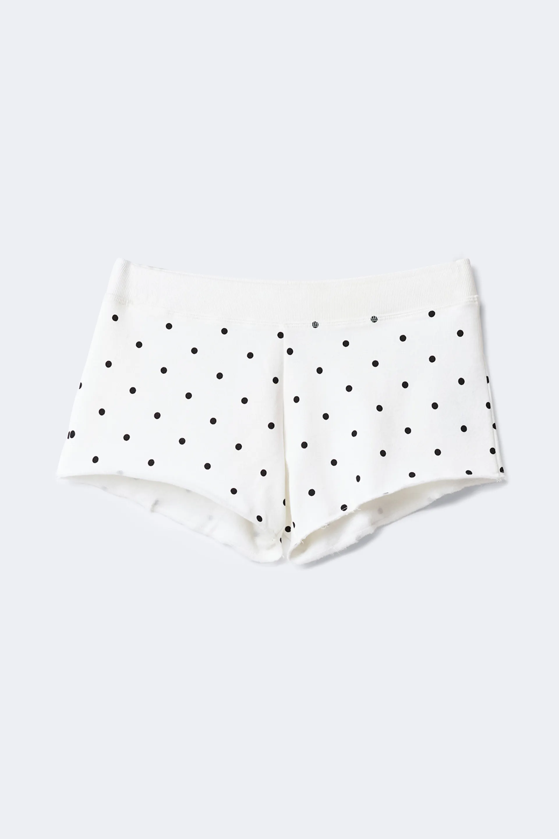 Gepunktete Sweatshorts mit umgefaltener Taille. Die Sweatshorts sind weiβ und schwarz und haben tiefe Taille mit Kordel. Sie haben weiches Material, figurbetonte Passform und normale Größe.
