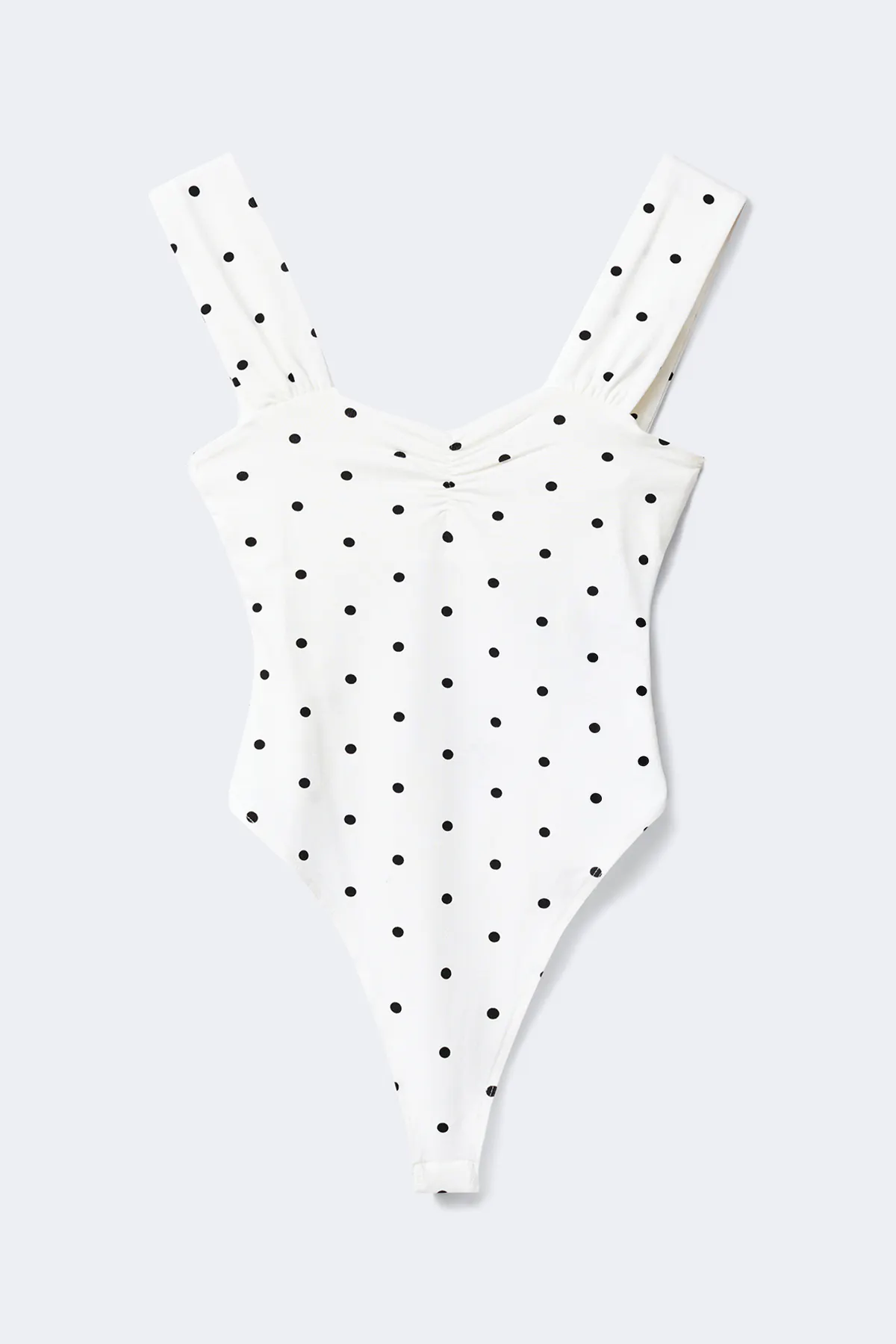 Gepunkteter Body mit breiten Trägerbändern. Der Body ist weiβ, schwarz und ärmellos und hat gerüscht Detail am Ausschnitt. Er hat figurbetonte Passform und weiches, elastisches Material.
