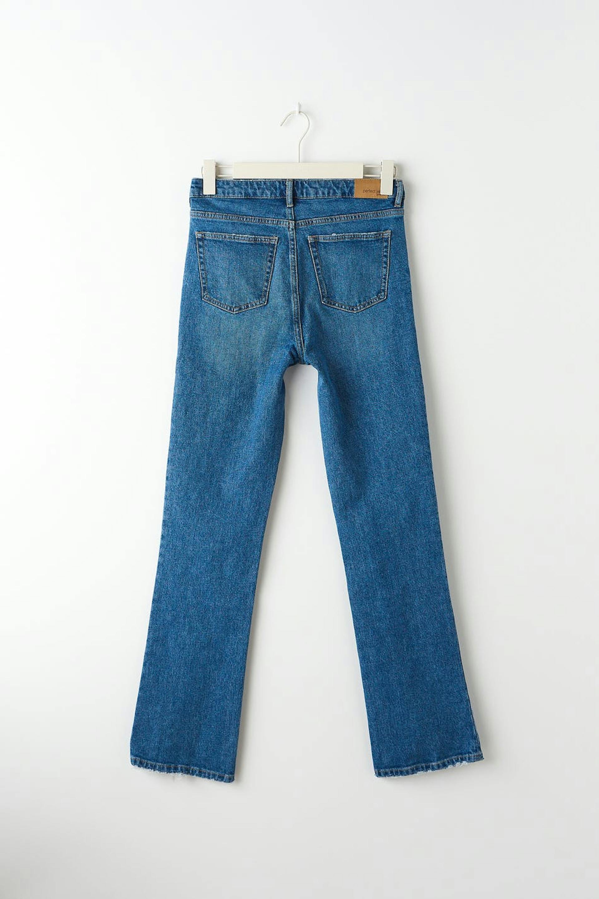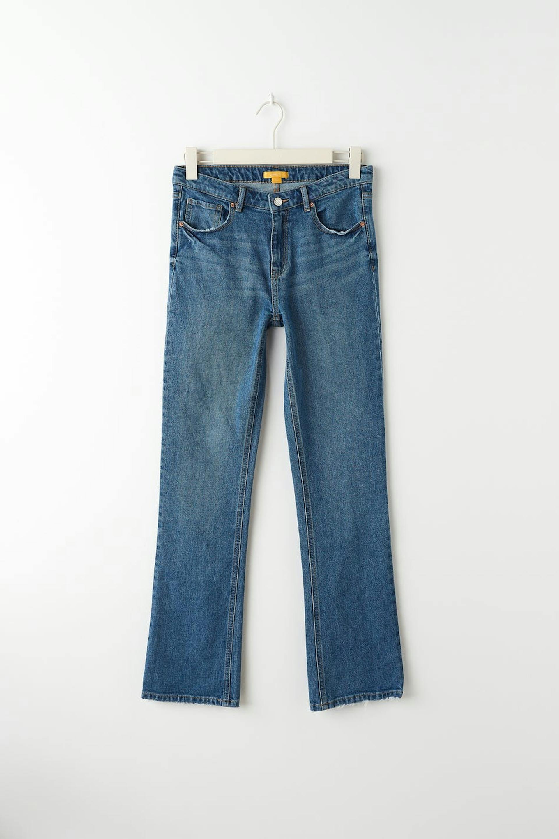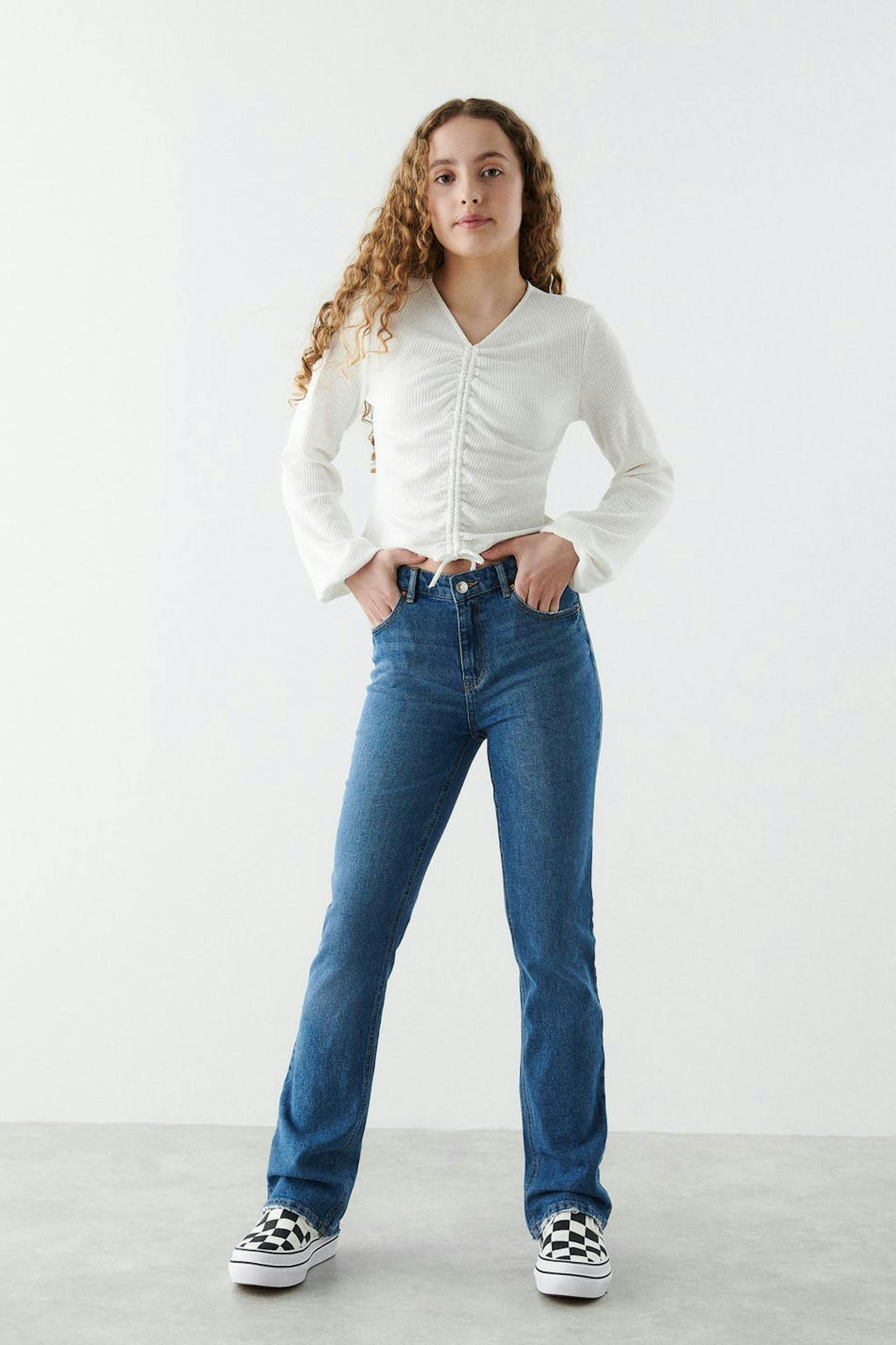 Y2K Bootcut-Jeans von aus unserem Young-Sortiment mit tiefer Taille. Die Jeans ist blau und hat ausgestellte Hosenbeine mit voller Länge. Sie hat Reißverschluss, einstellbares Gummiband in der Taille und Taschen vorne und hinten.