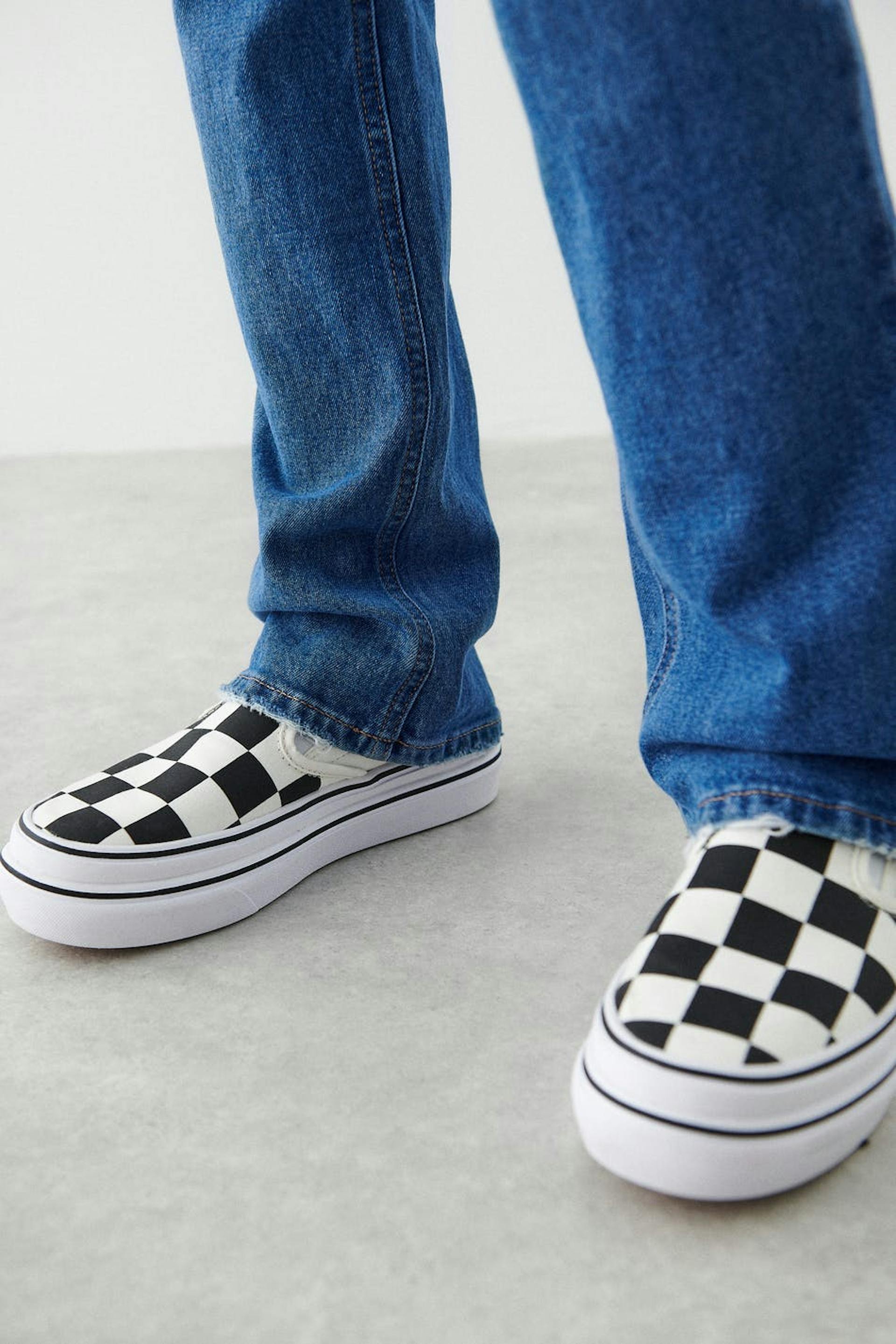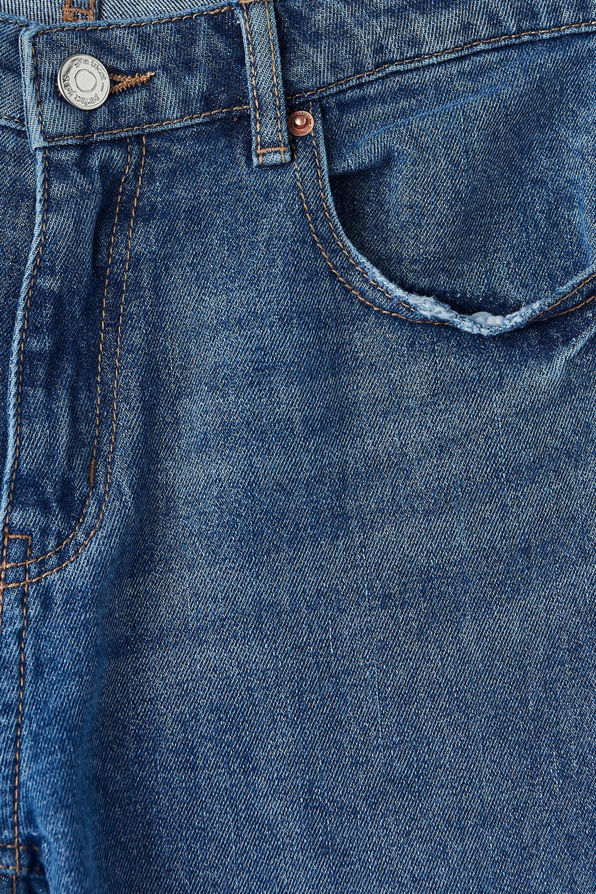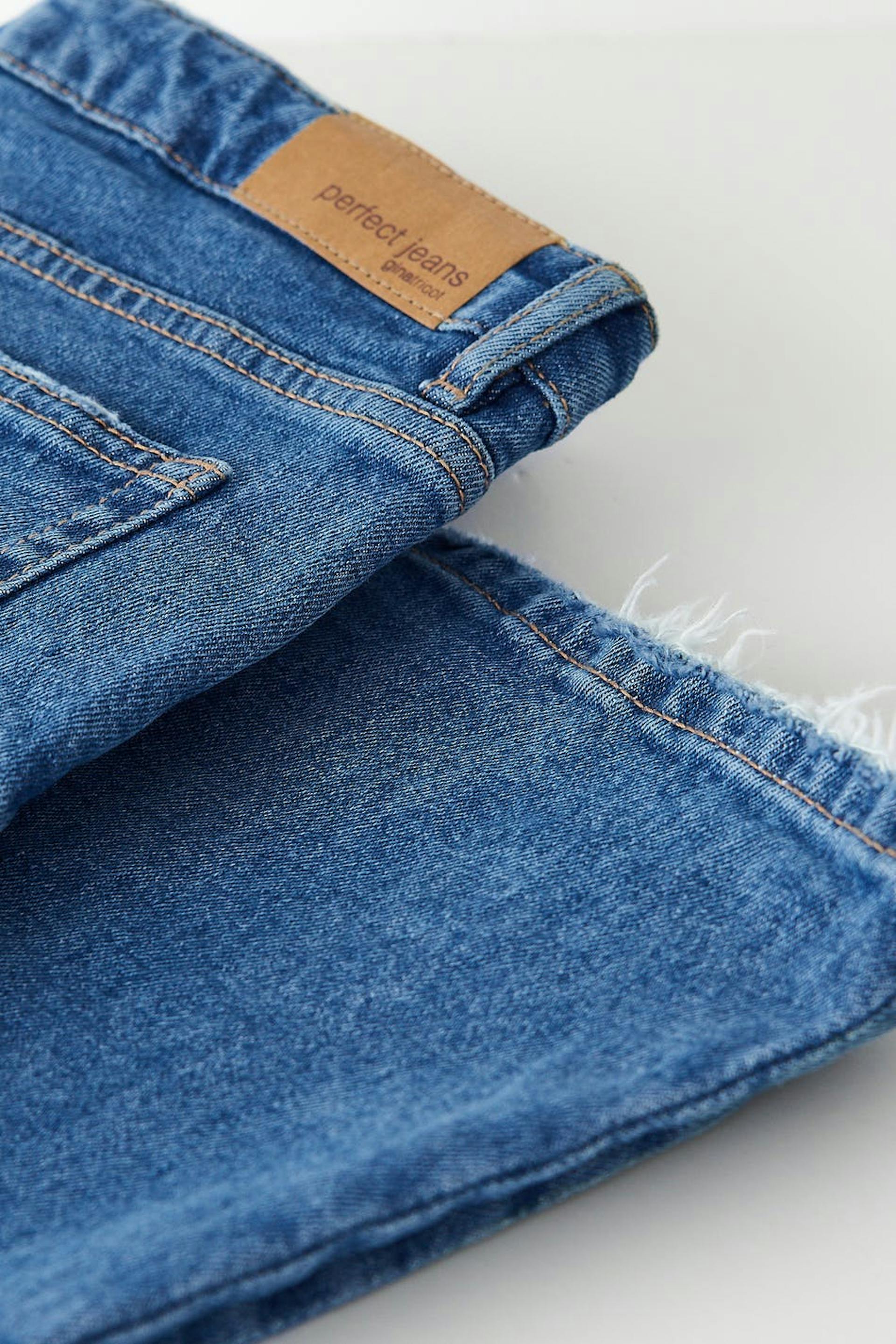 Y2K Bootcut-Jeans von aus unserem Young-Sortiment mit tiefer Taille. Die Jeans ist blau und hat ausgestellte Hosenbeine mit voller Länge. Sie hat Reißverschluss, einstellbares Gummiband in der Taille und Taschen vorne und hinten.