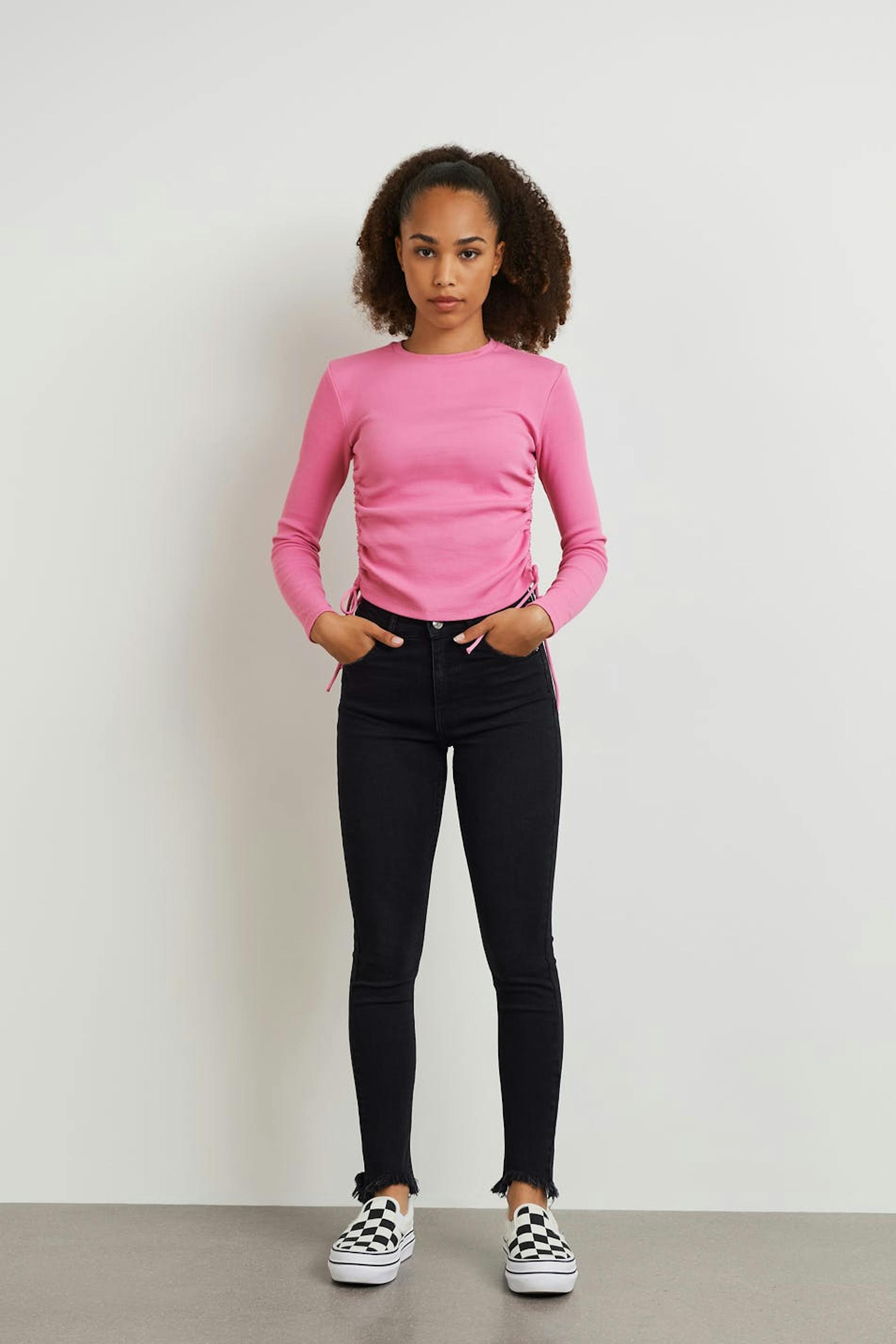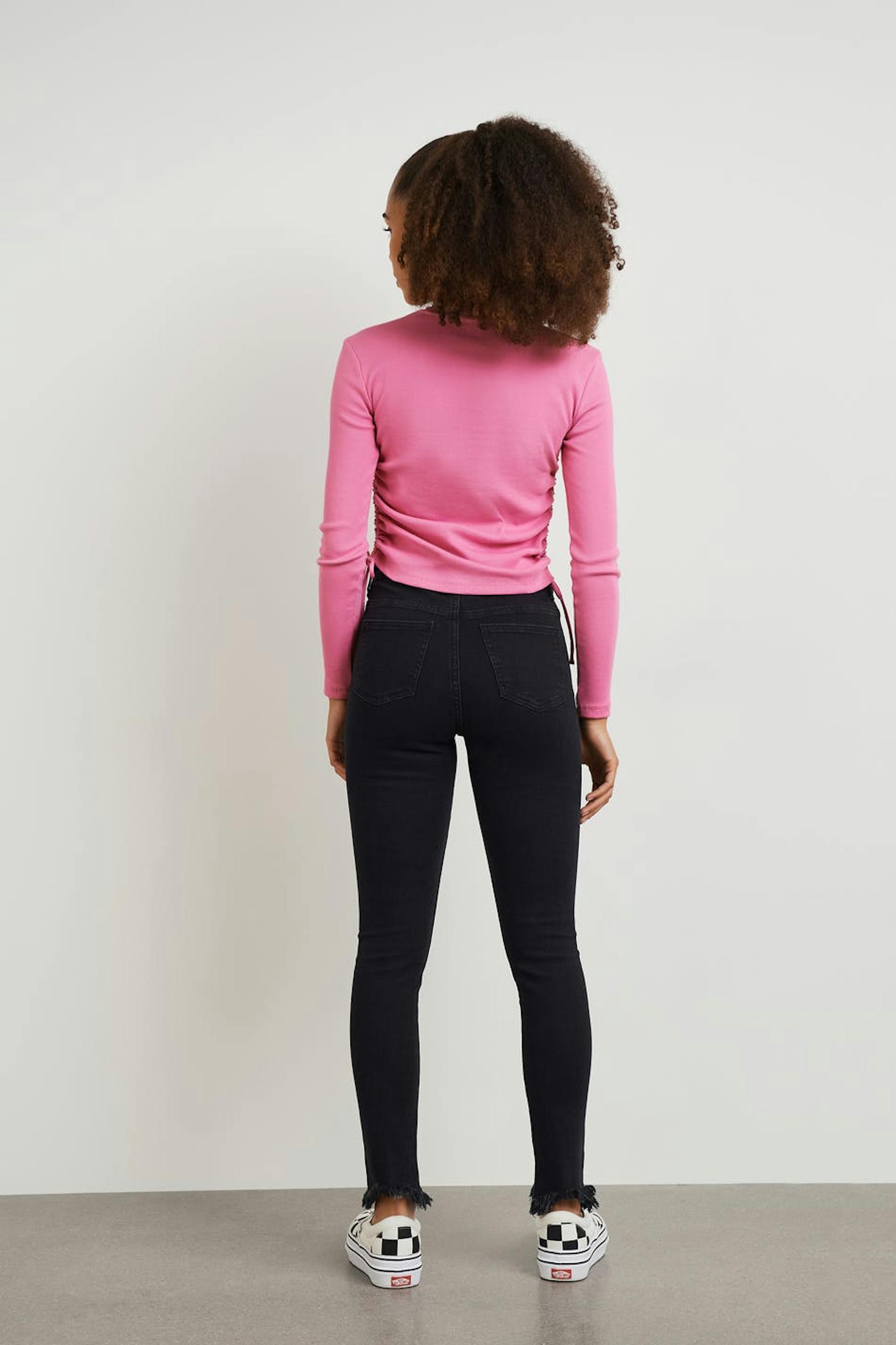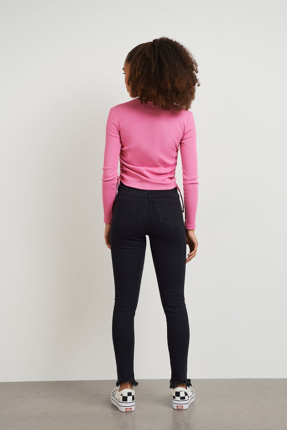 Elastische Skinny-Jeans von aus unserem Young-Sortiment mit hohem Bund. Die Skinny-Jeans ist schwarz und hat eine taillierte Passform. Sie hat schmale Hosenbeine mit einer Knöchellänge, Reißverschluss, ein einstellbares Gummiband in der Taille und Taschen vorne und hinten.