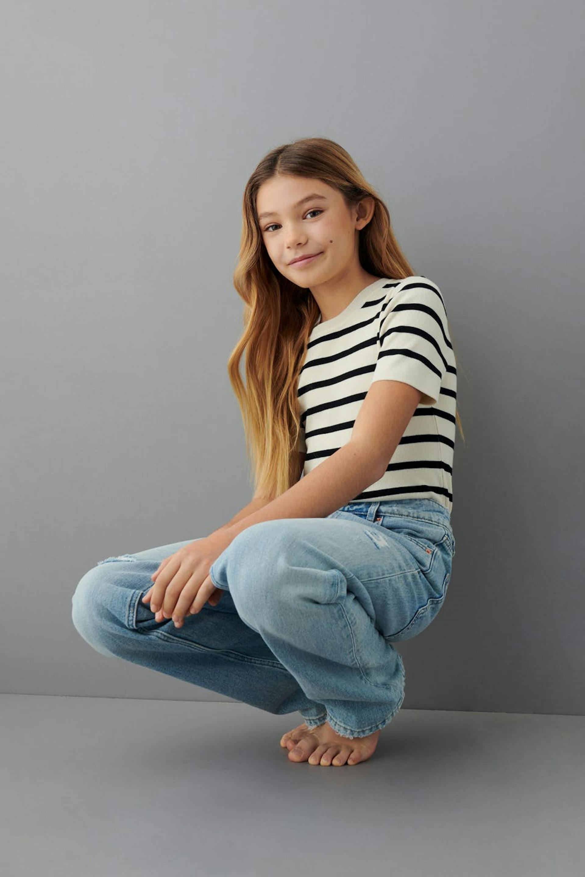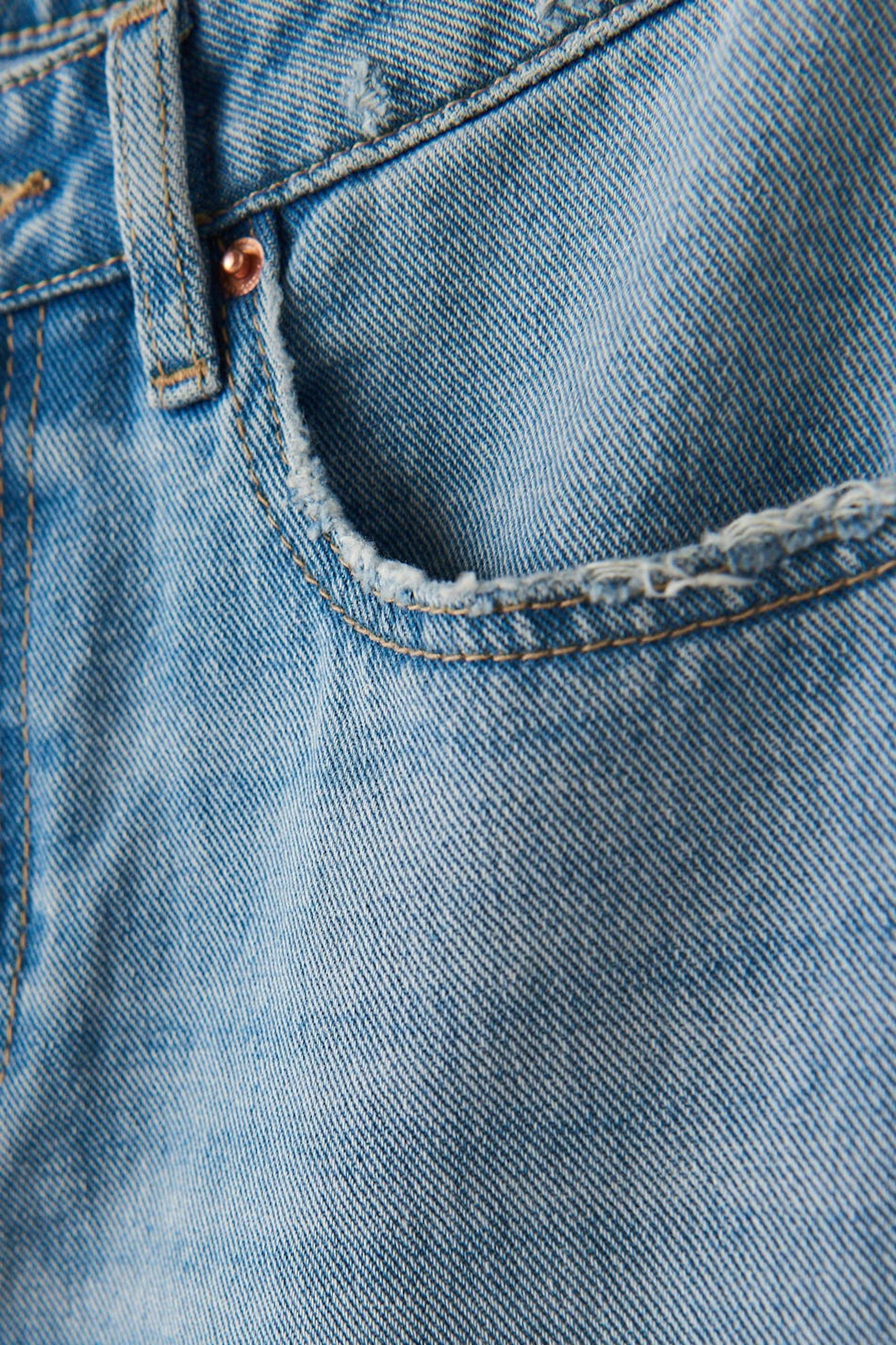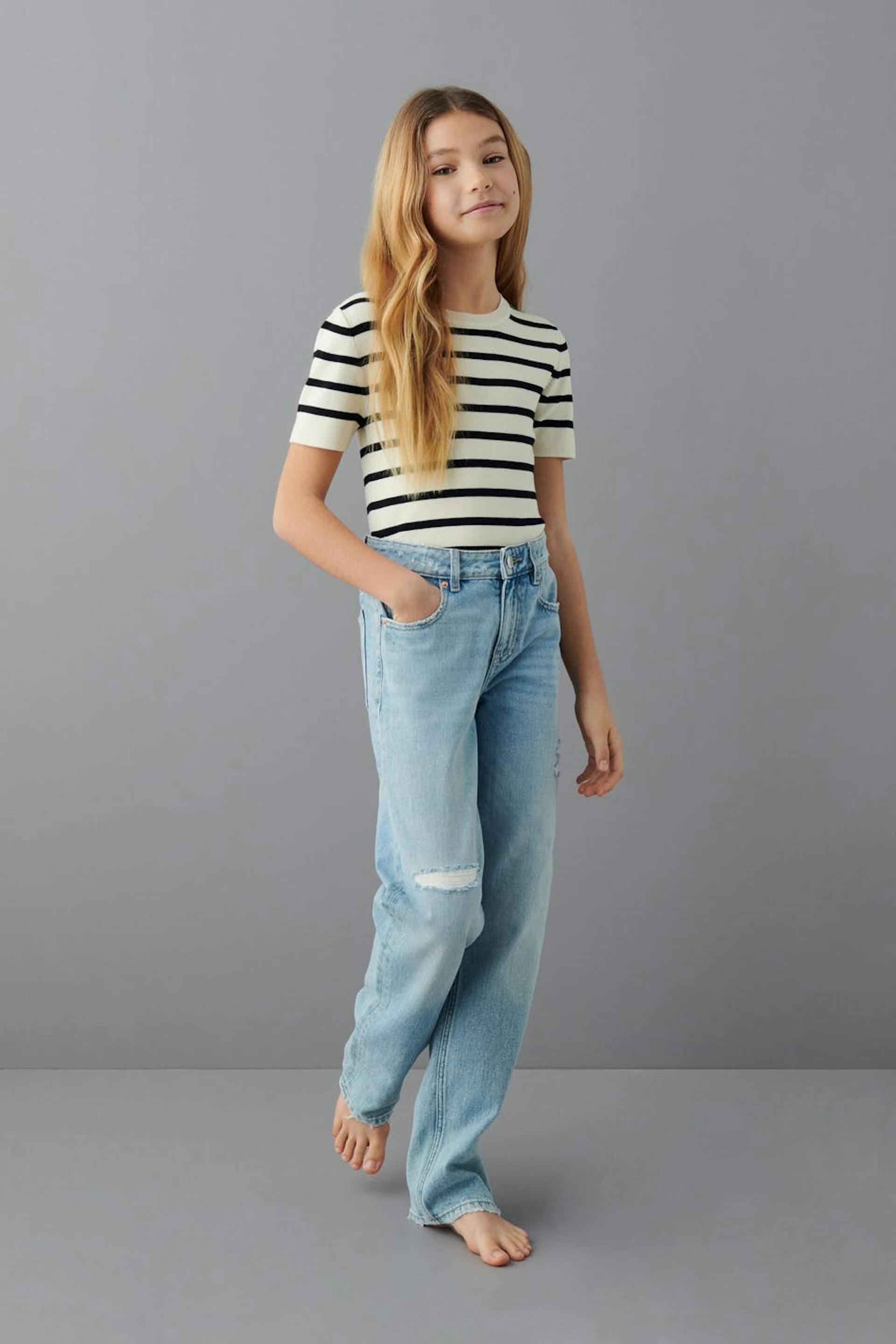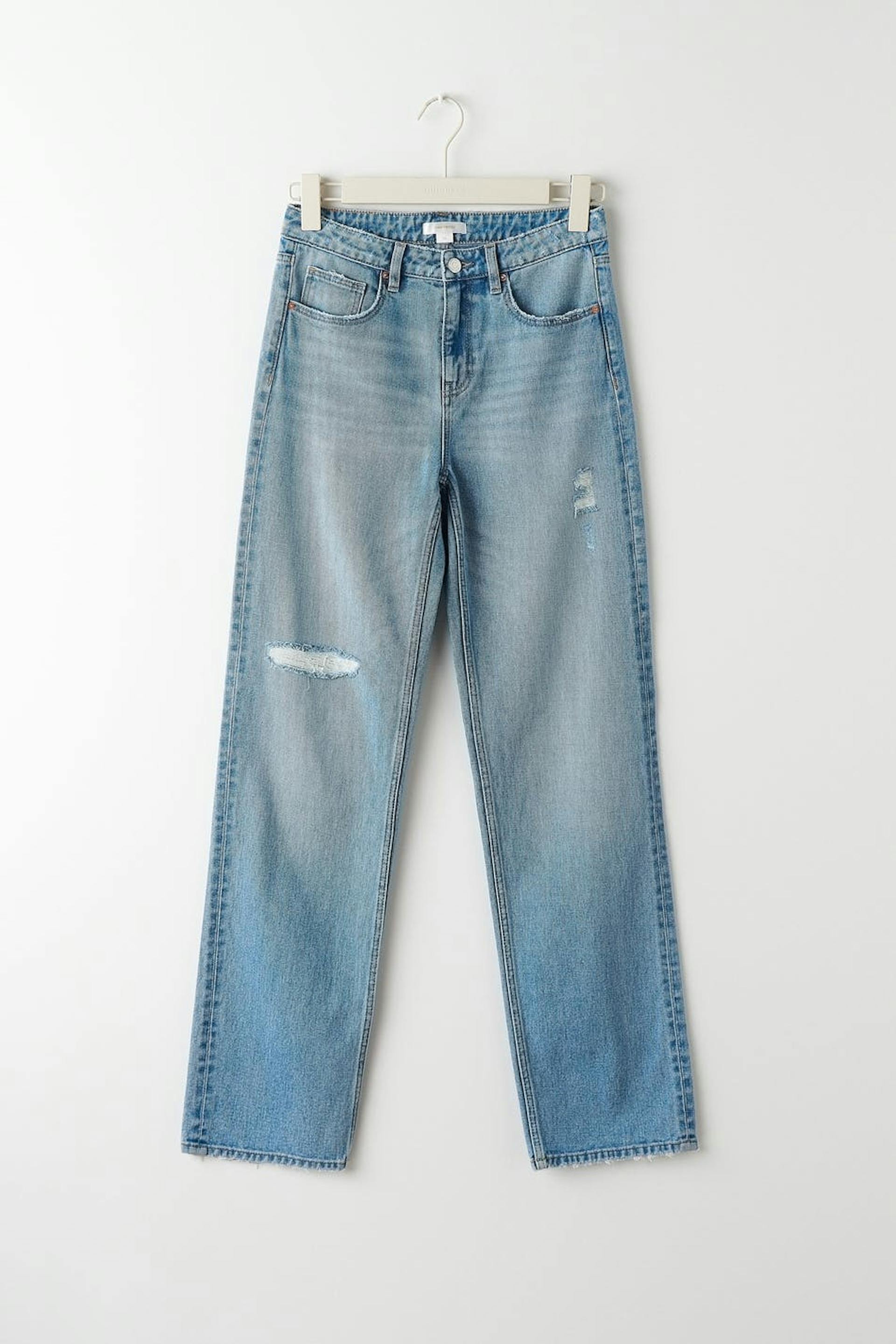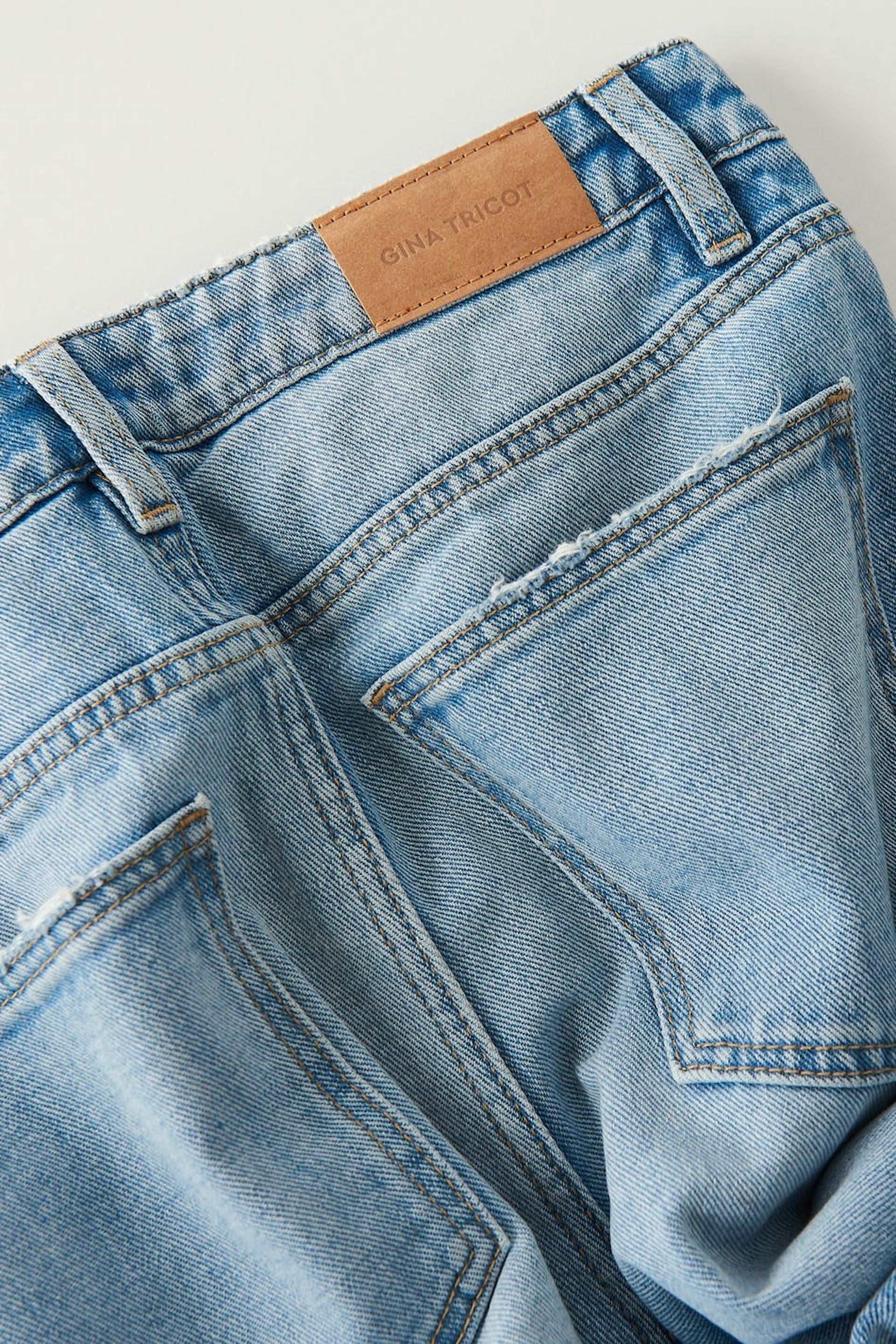 Straight Leg Jeans mit tiefer Taille. Die Jeans ist blau und hat einen geraden Schnitt aus weichem nicht dehnbarem Denim. Sie hat einstellbares Gummiband in der Taille und Taschen vorne und hinten.