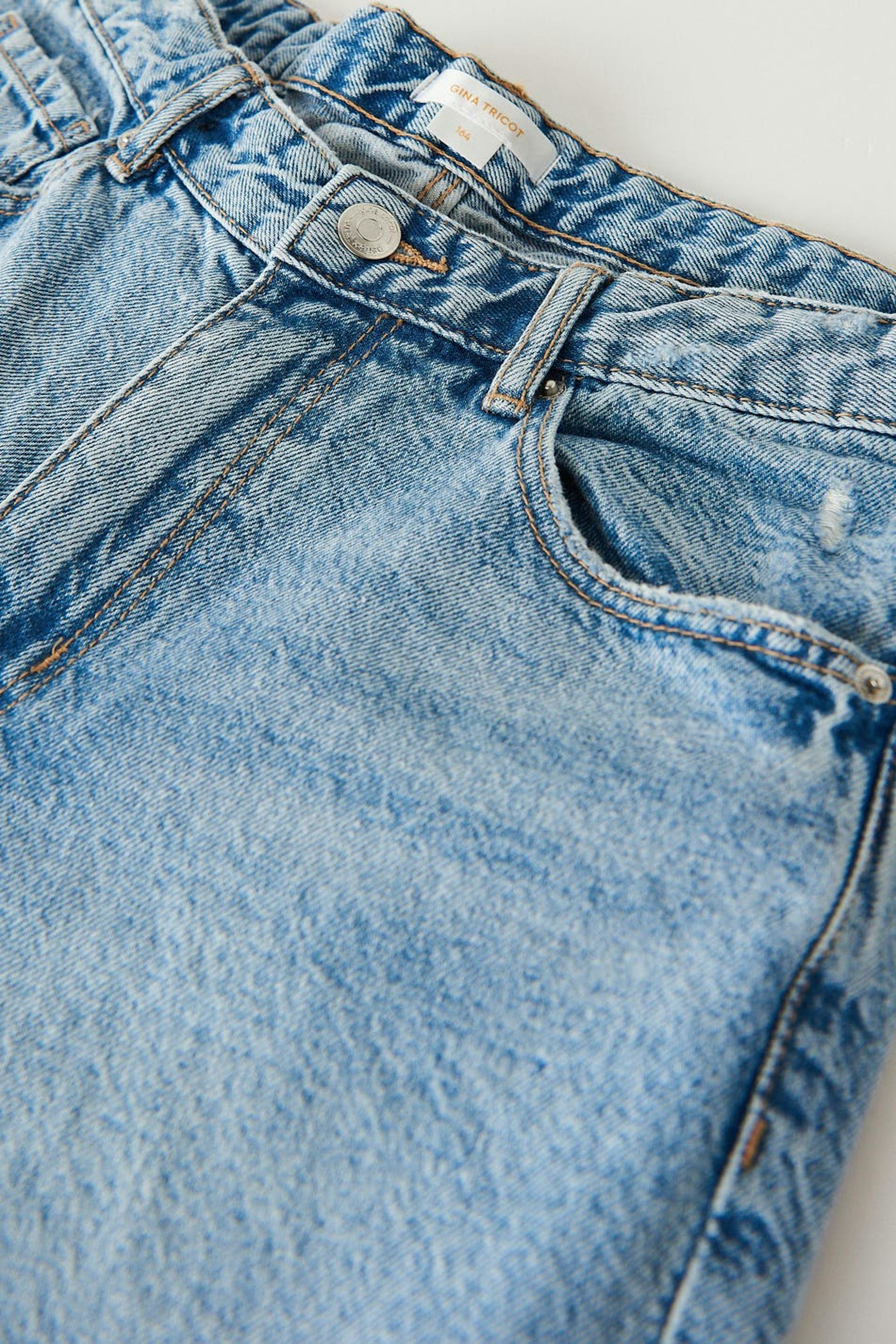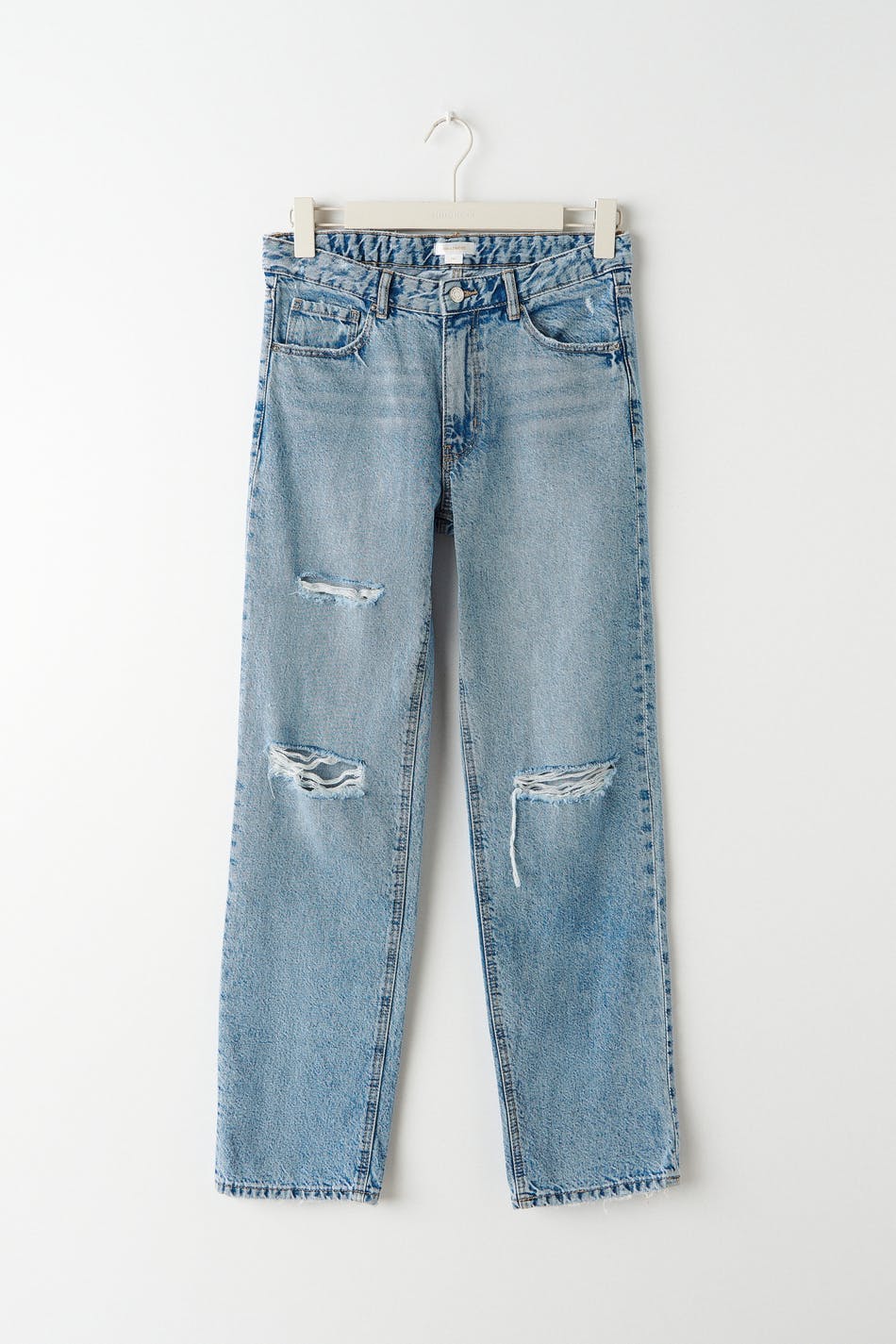 Low Waist Jeans mit gerissenen Knien. Die Jeans ist hellblau und hat Beine mit voller Länge aus nicht dehnbarem Denim. Sie hat weit-geschnittenen Style, einstellbares Gummiband in der Taille und Taschen vorne und hinten.