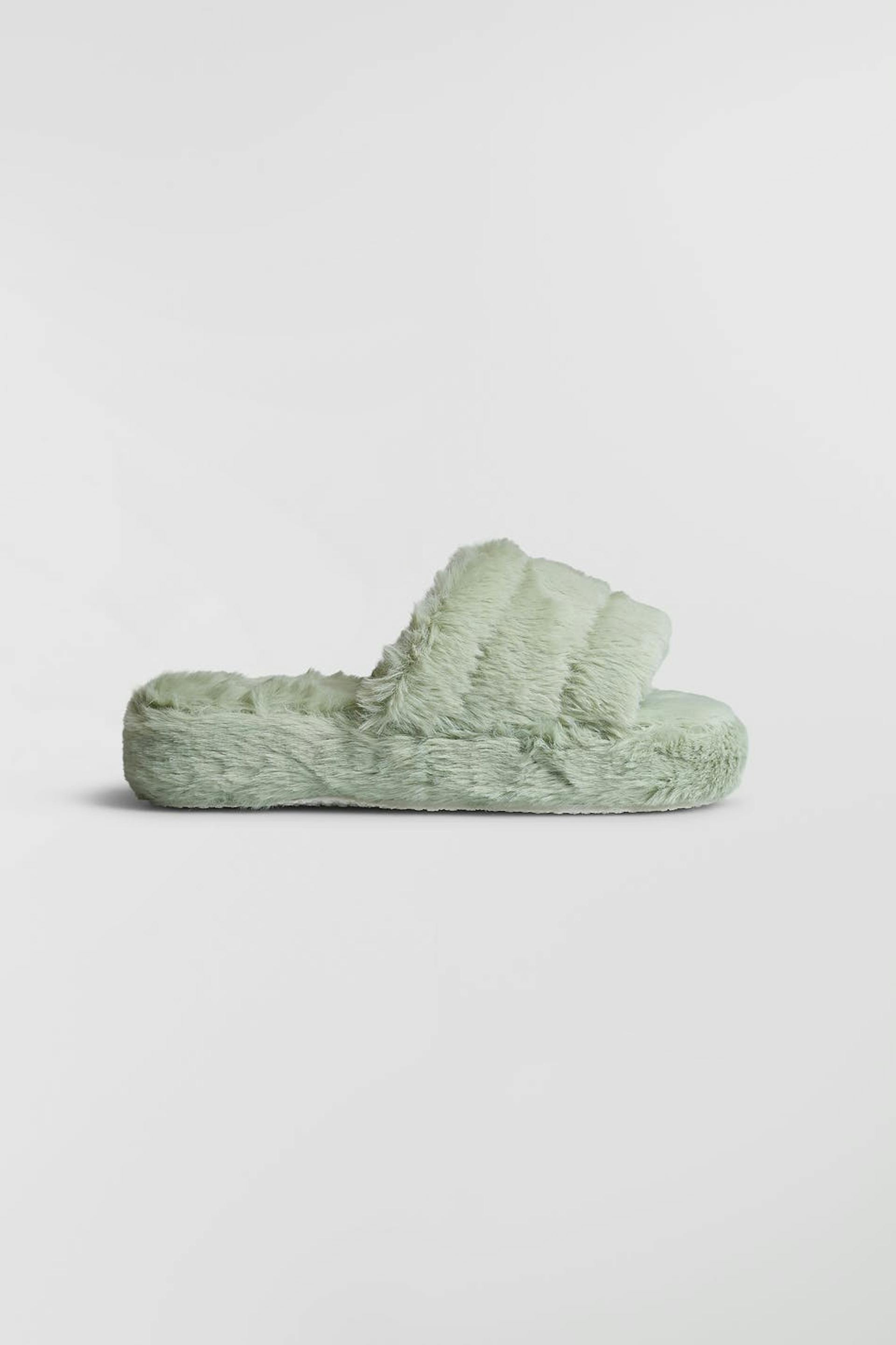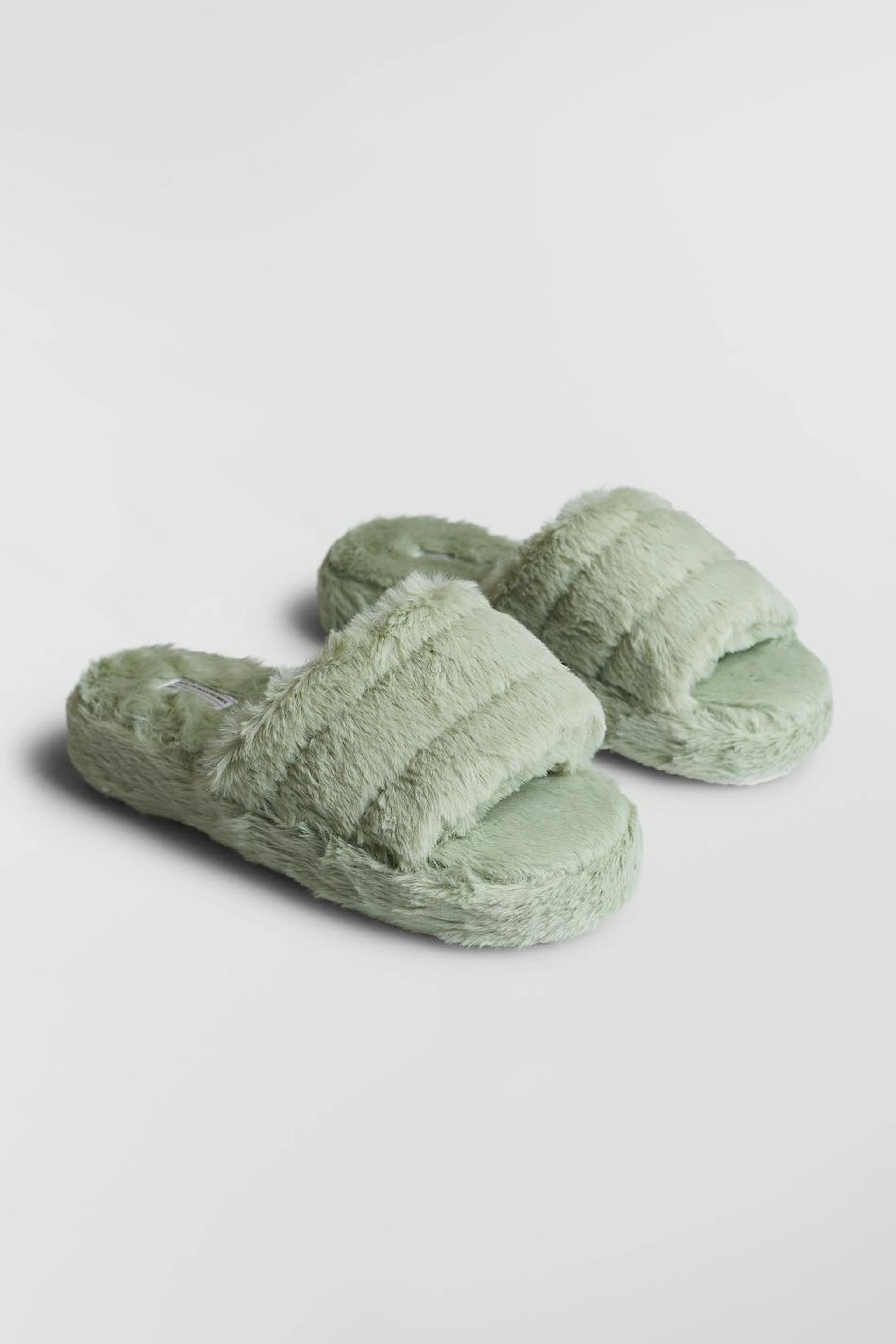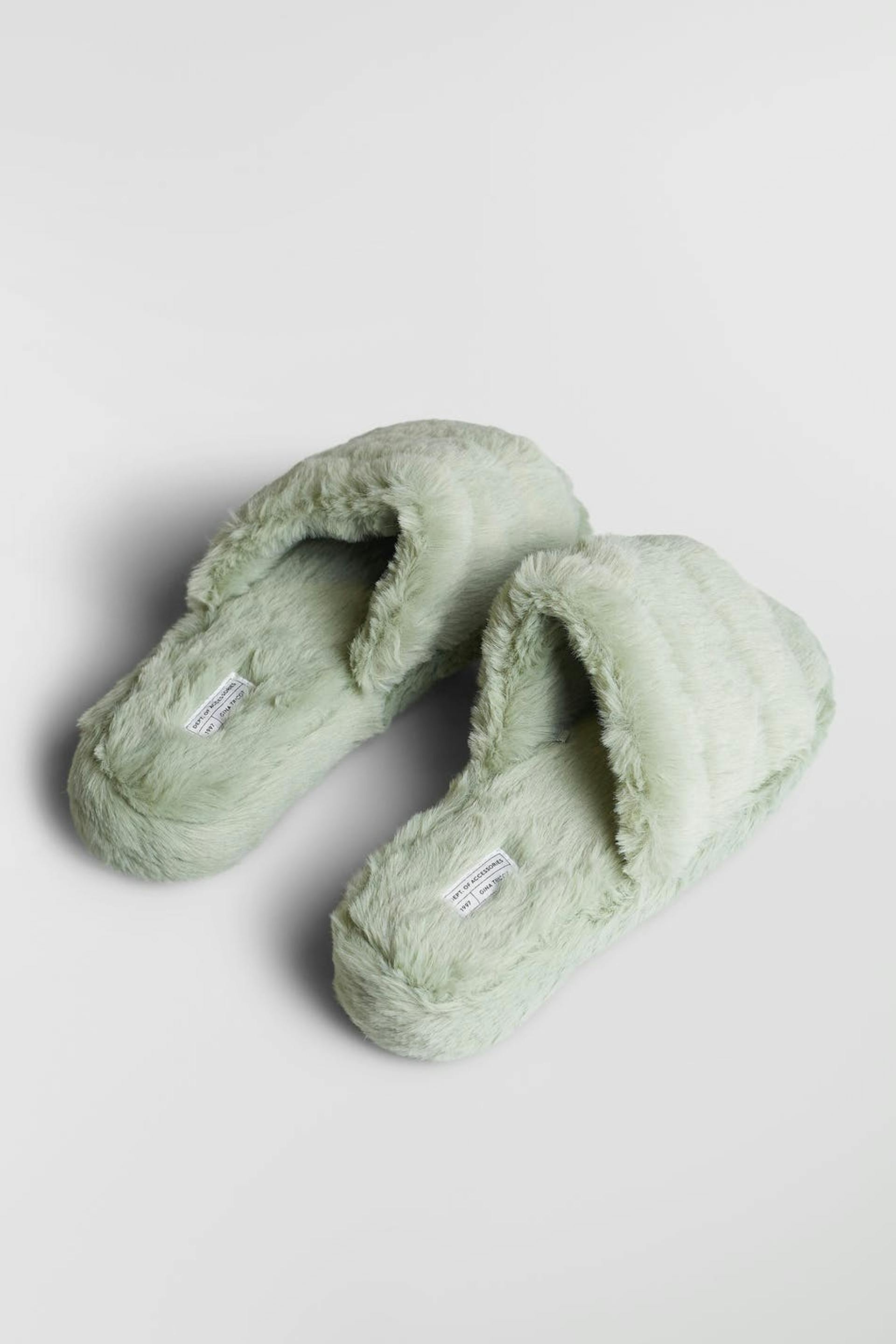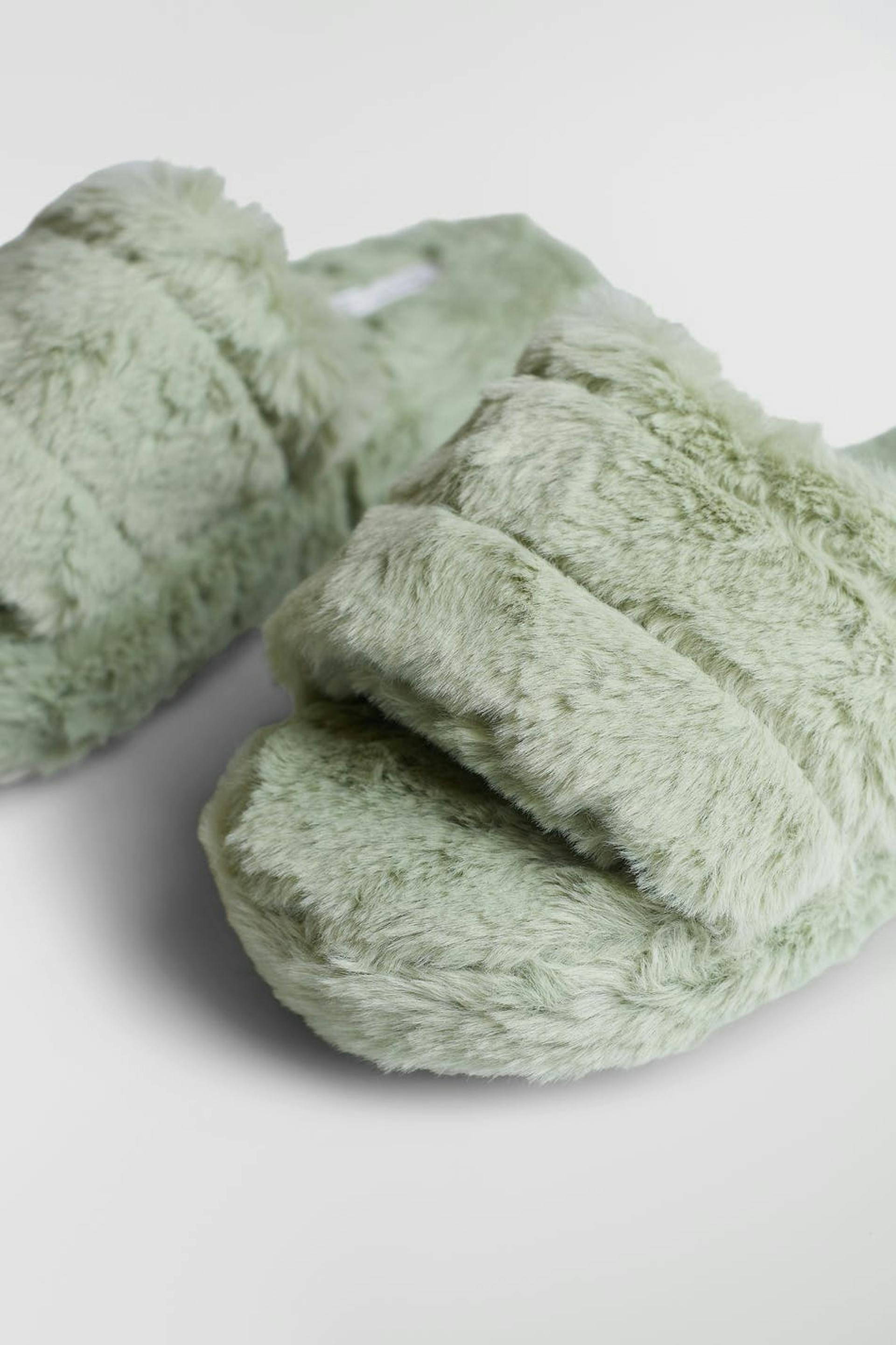 Flauschige Pantoffel von aus unserem Young-Sortiment mit Kunstpelz. Die Pantoffel sind grün und gemütlich und haben eine weiche Qualität. Sie haben Kunstpelz und ein Slip-In-Design.