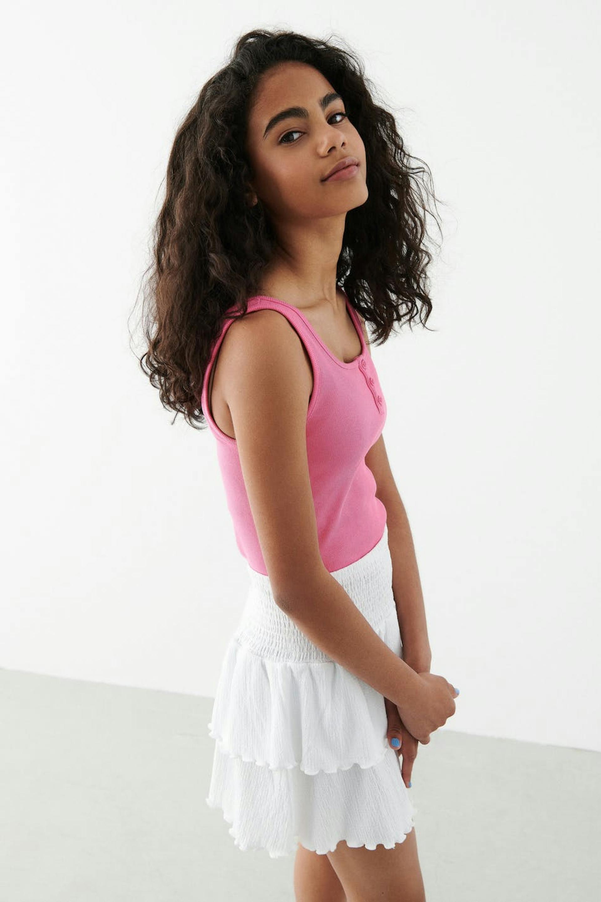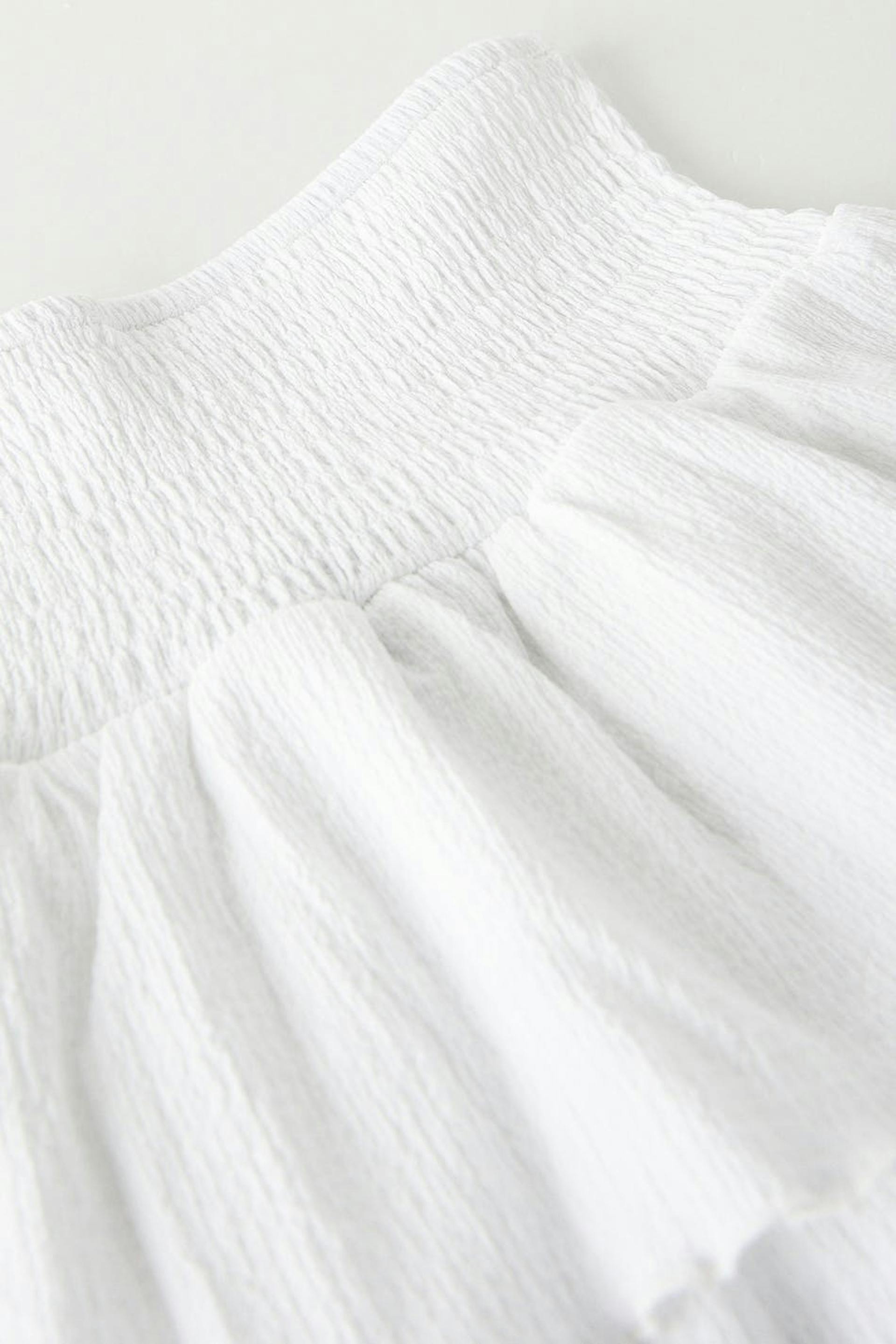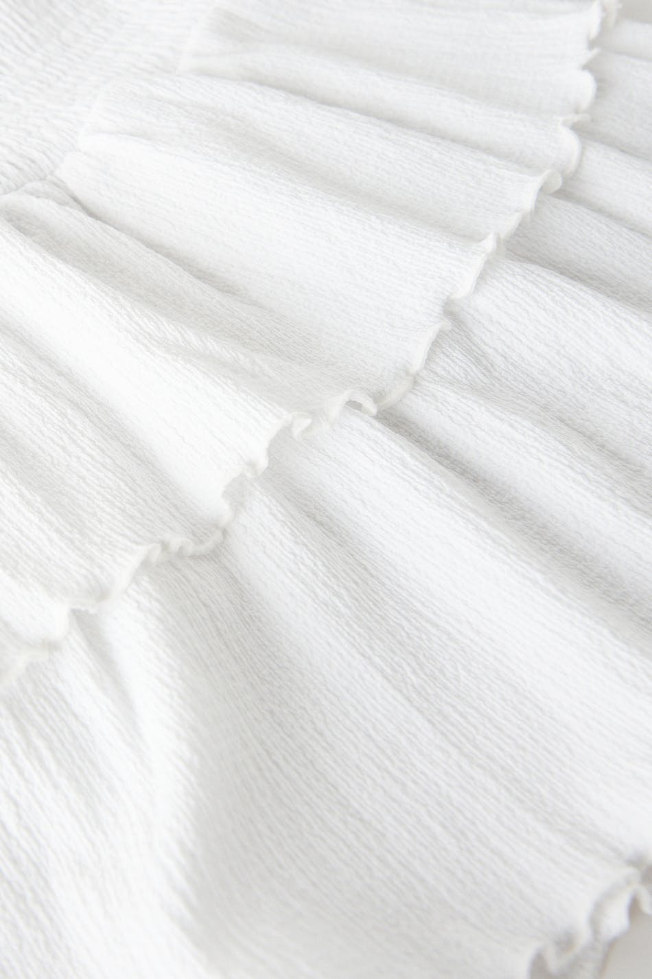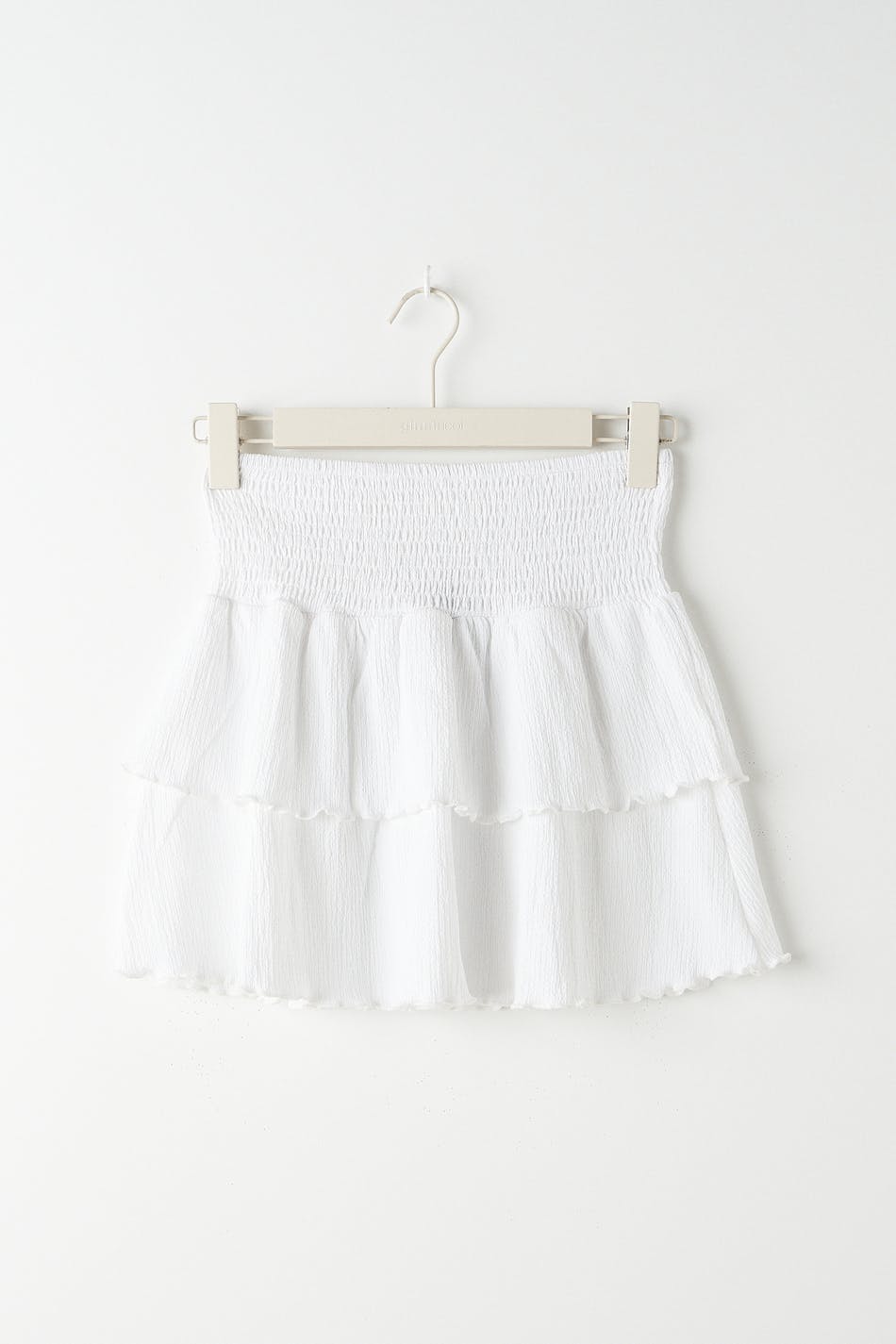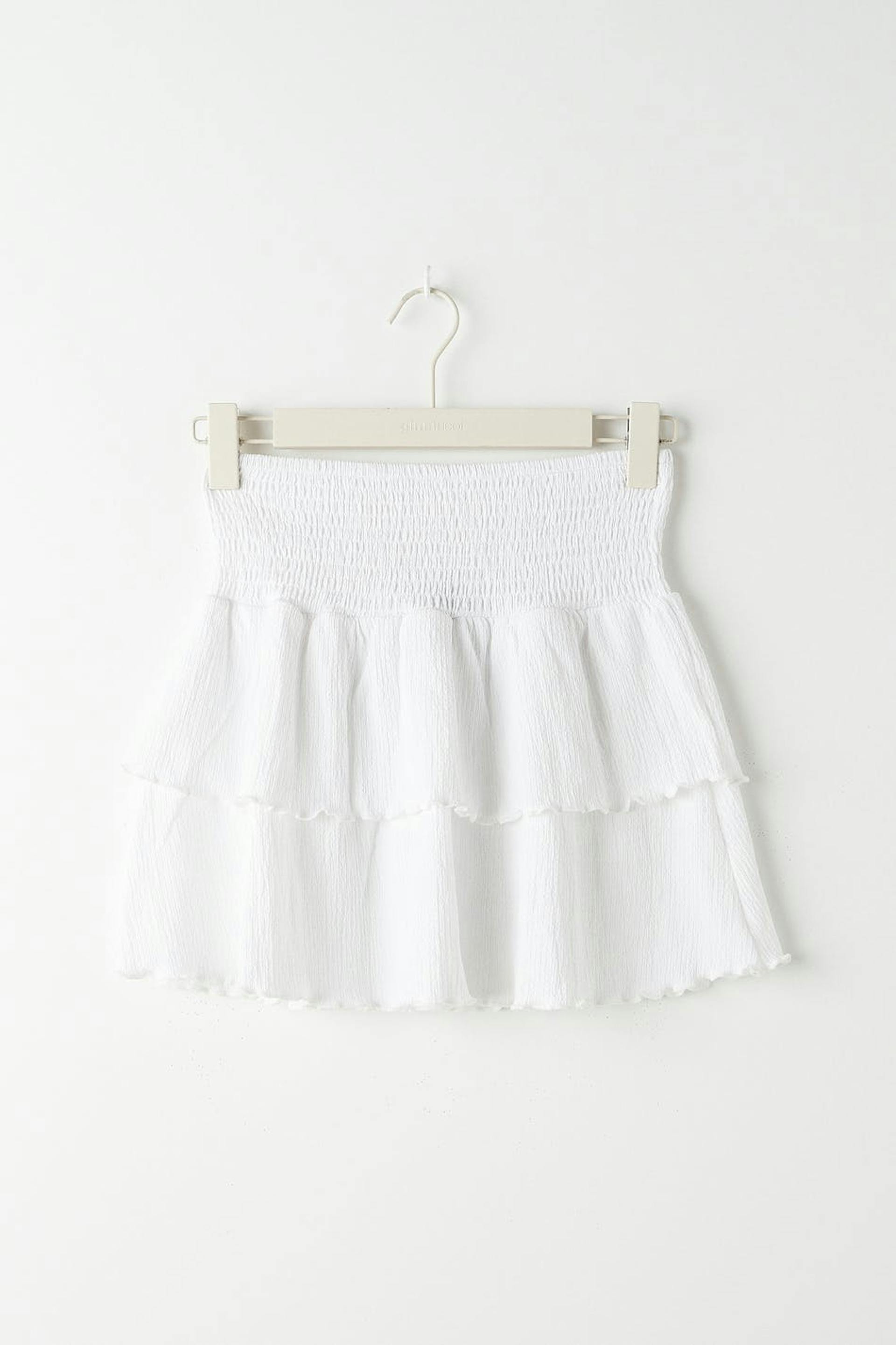 Kurzer Rüschenrock aus Jersey mit einer normalen Passform. Der Rock ist weiβ und hat einen Smoking in der Taille. Er hat Rüschenschichten mit gekräuselter unterer Saumlinie.