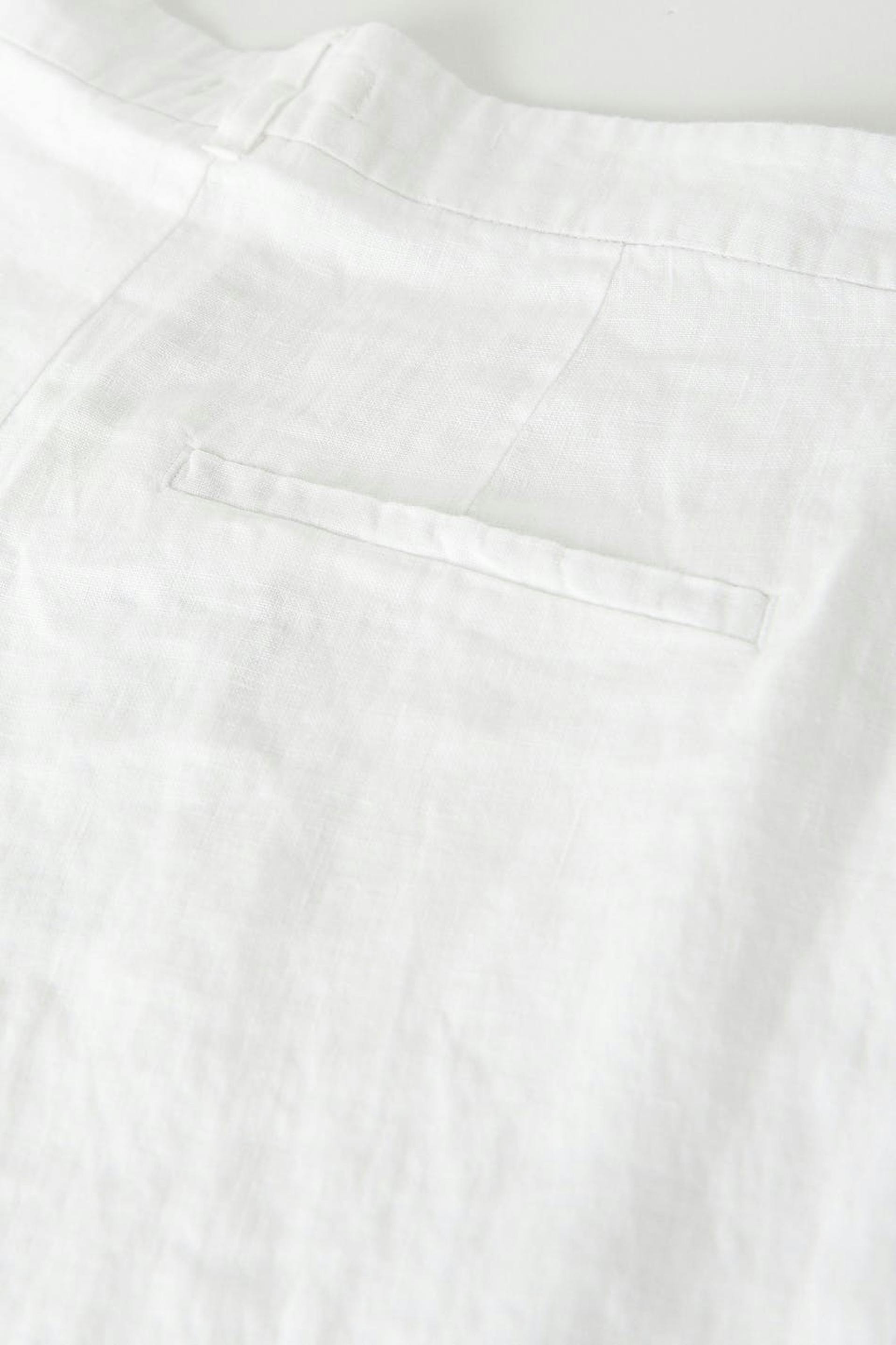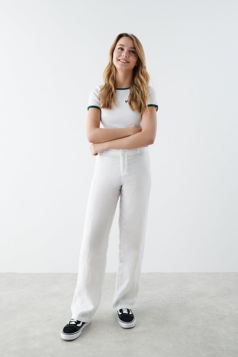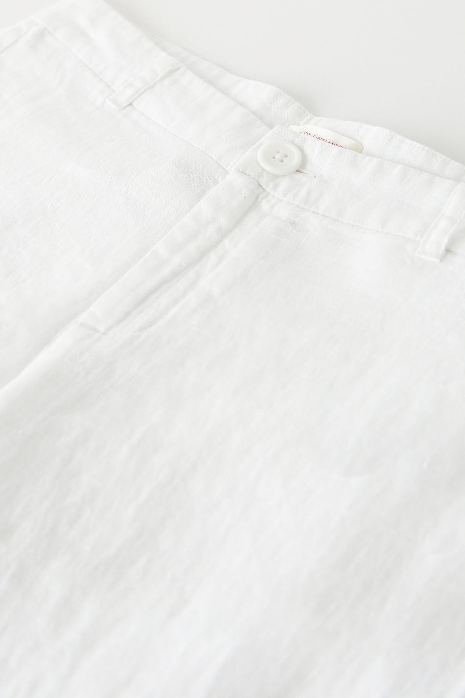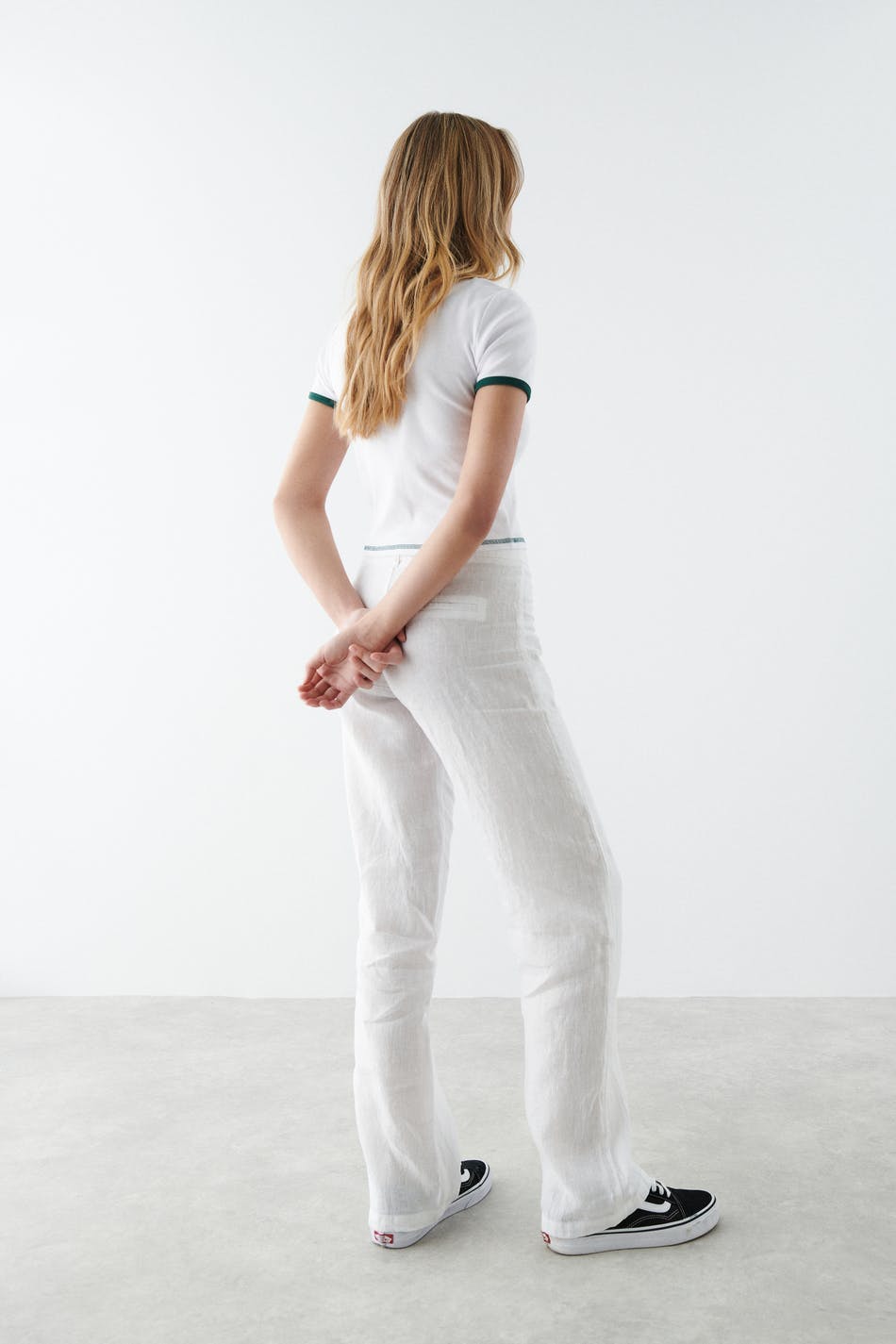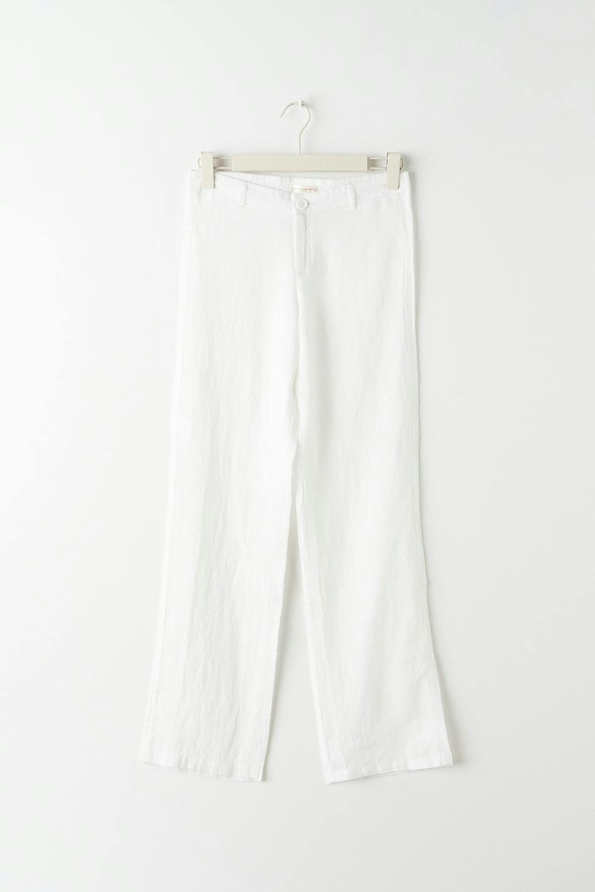 IZA & ELLE x YOUNG GINA TRICOT. Luftige Leinenhosen mit tiefer Taille. Die Leinenhosen sind weiβ und haben breite Beine. Sie haben Reißverschluss mit einem Knopf vorne, ein Material ohne dehnung und geschlitzte Taschen hinten.