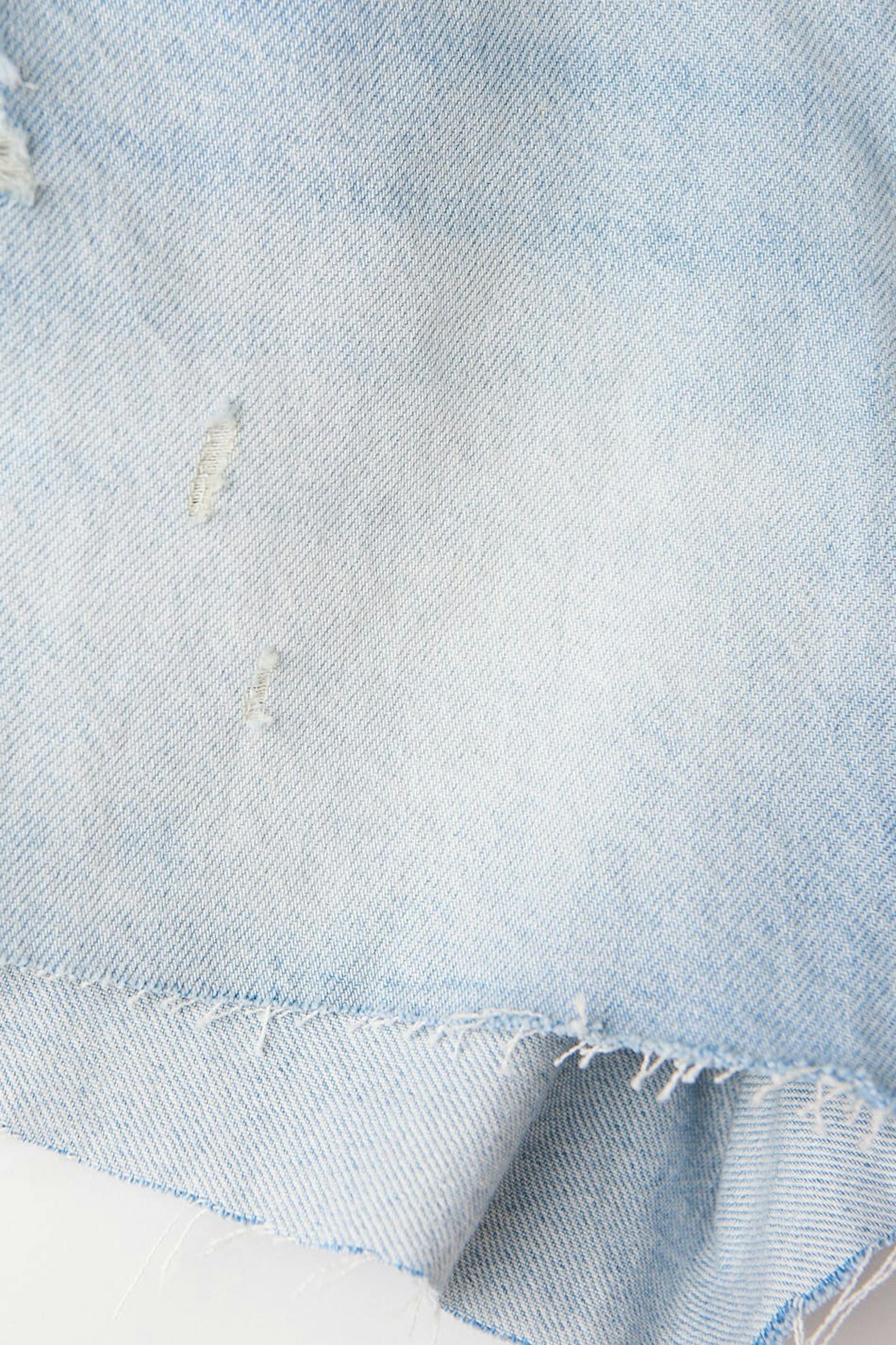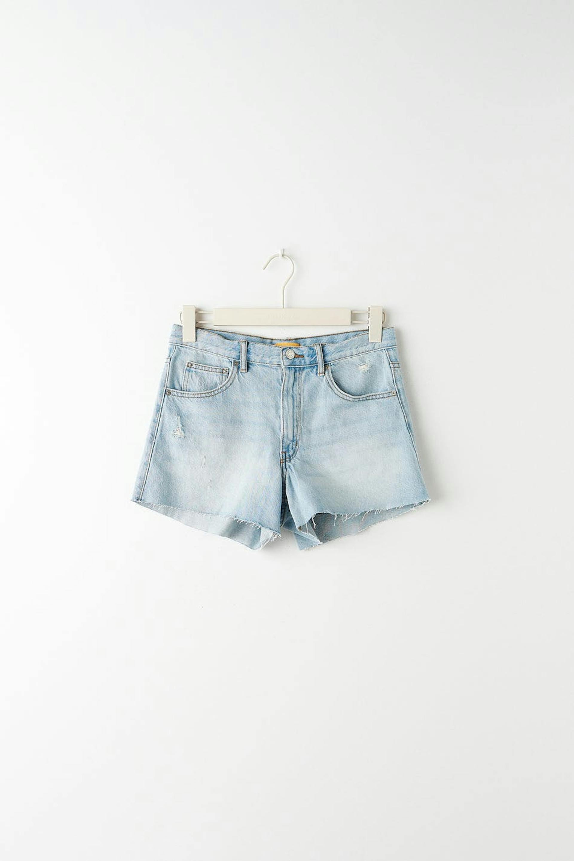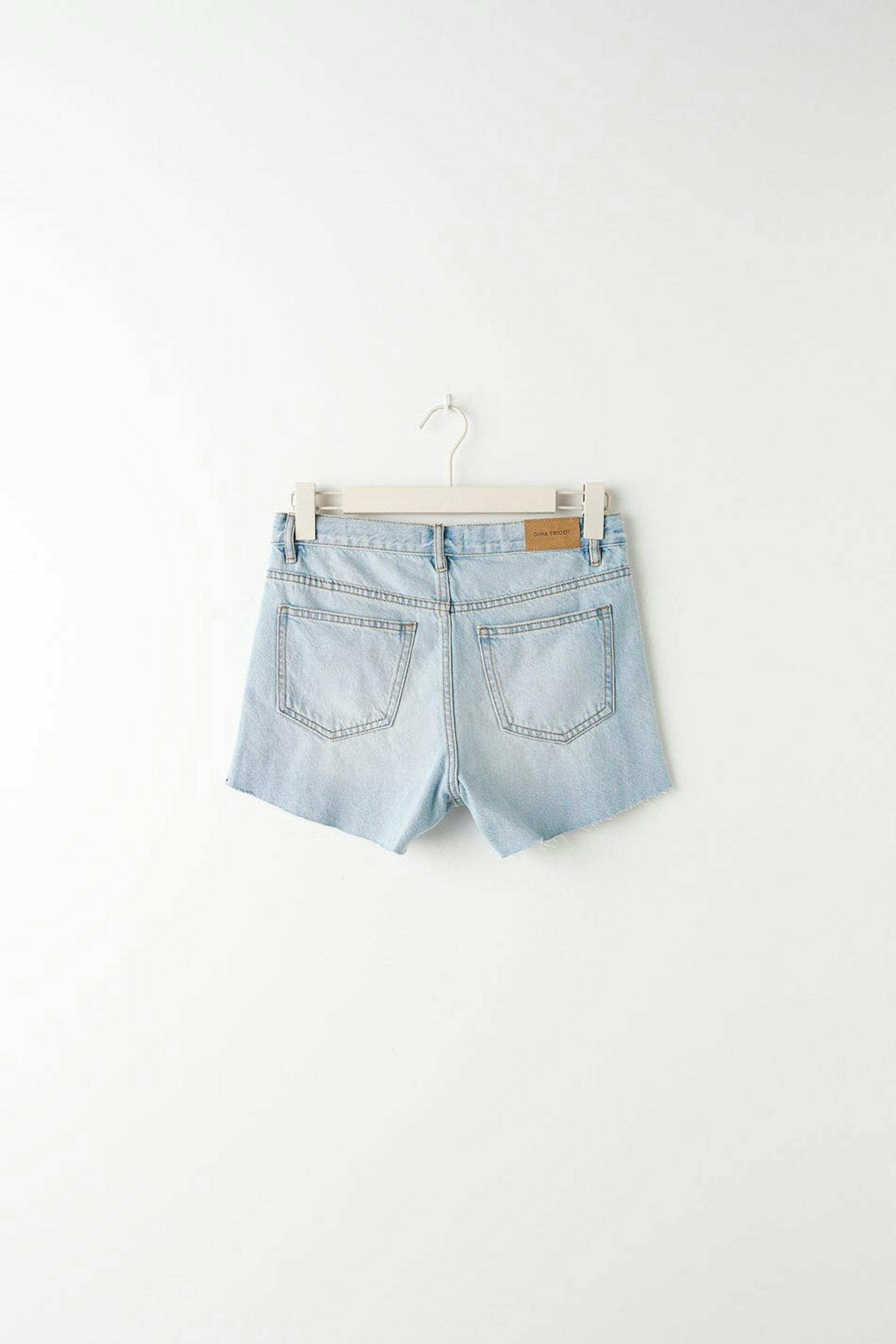 Vintage Denim-Shorts von aus unserem Young-Sortiment mit einer tiefer Taille. Die Shorts sind hellblau und haben einen weit-geschnittenen Style. Sie haben ein einstellbares Gummiband in der Taille, eine rohe Kante unten und Taschen vorne und hinten.