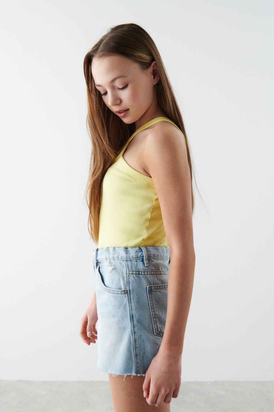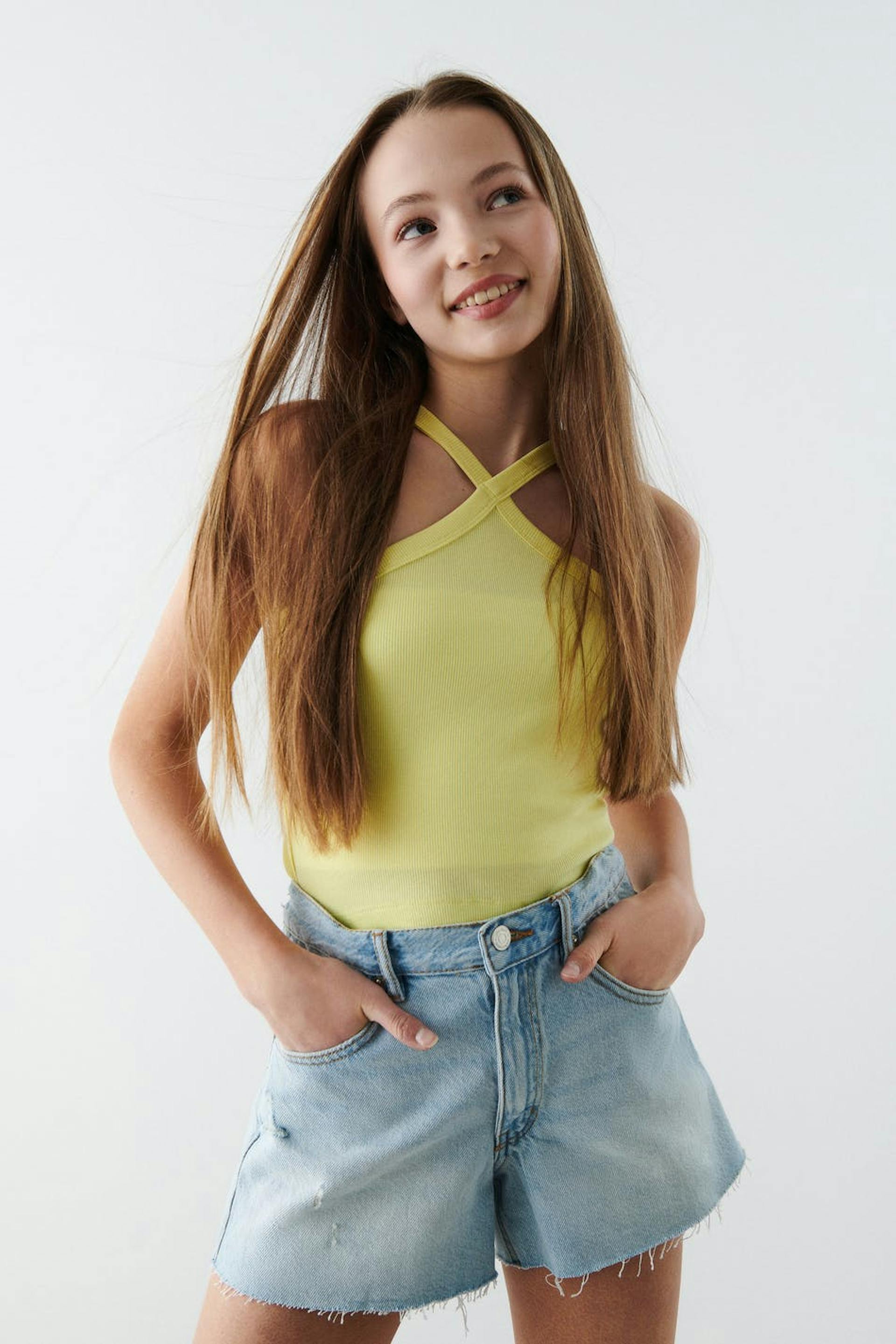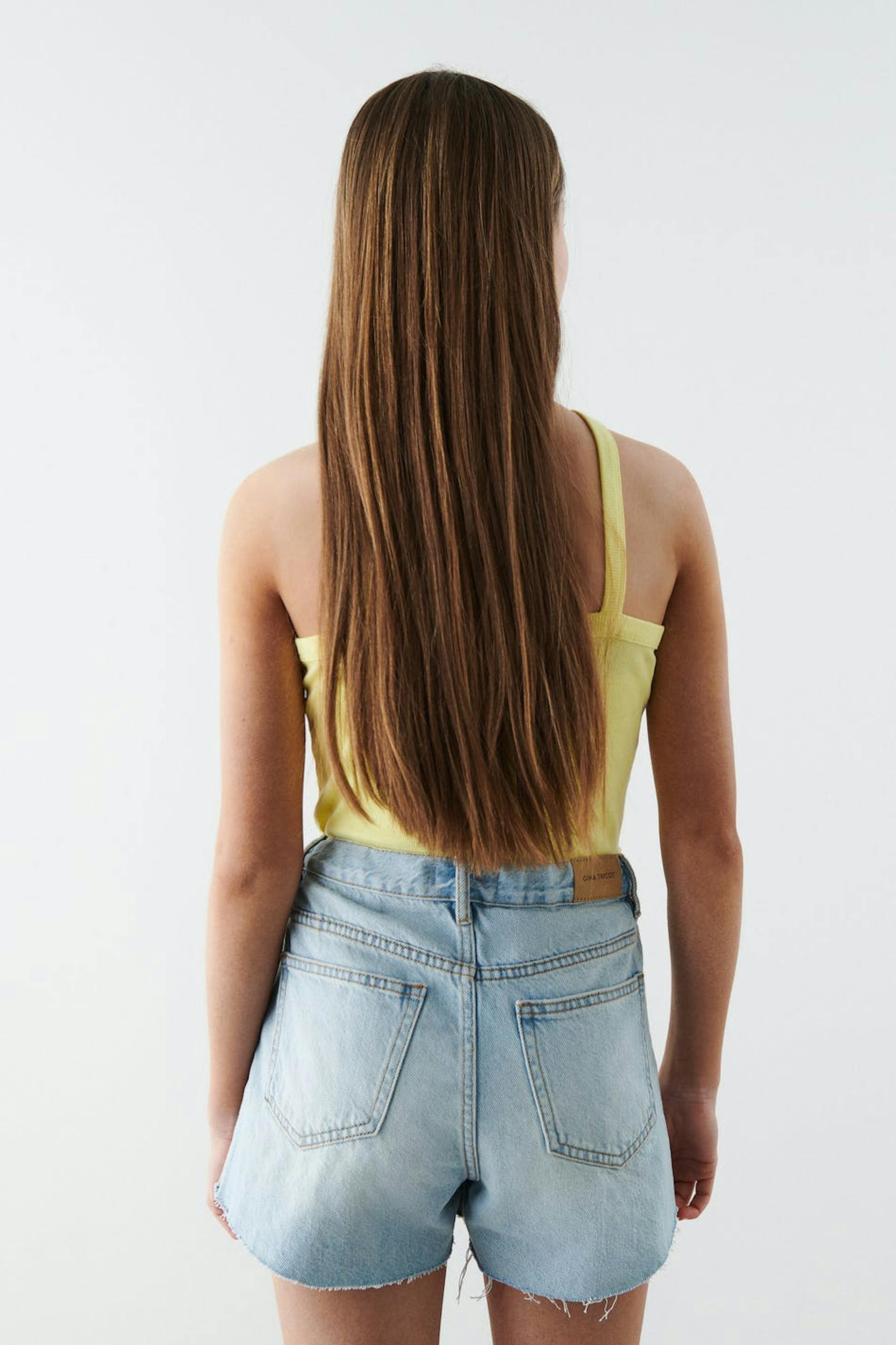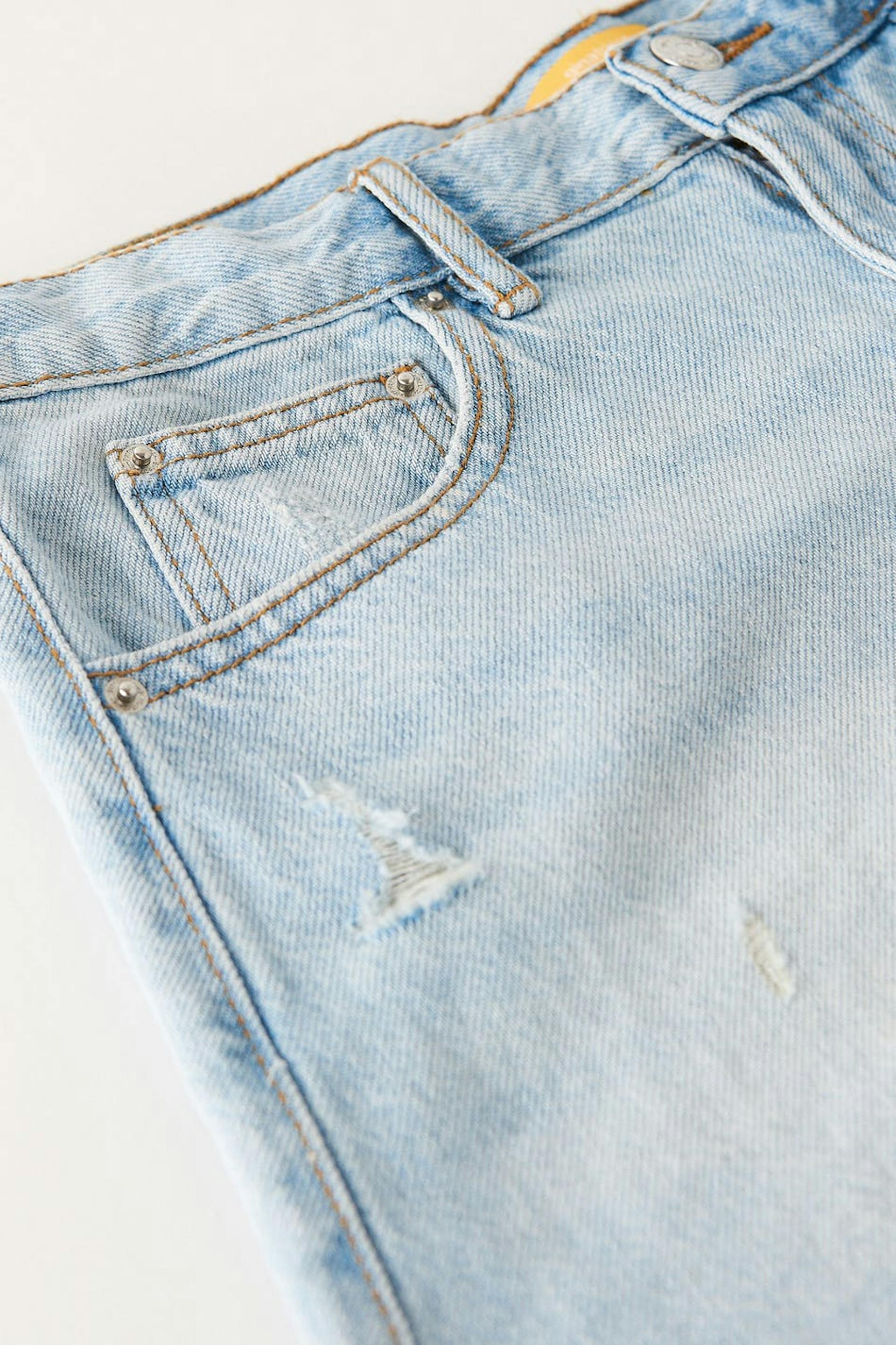 Vintage Denim-Shorts von aus unserem Young-Sortiment mit einer tiefer Taille. Die Shorts sind hellblau und haben einen weit-geschnittenen Style. Sie haben ein einstellbares Gummiband in der Taille, eine rohe Kante unten und Taschen vorne und hinten.