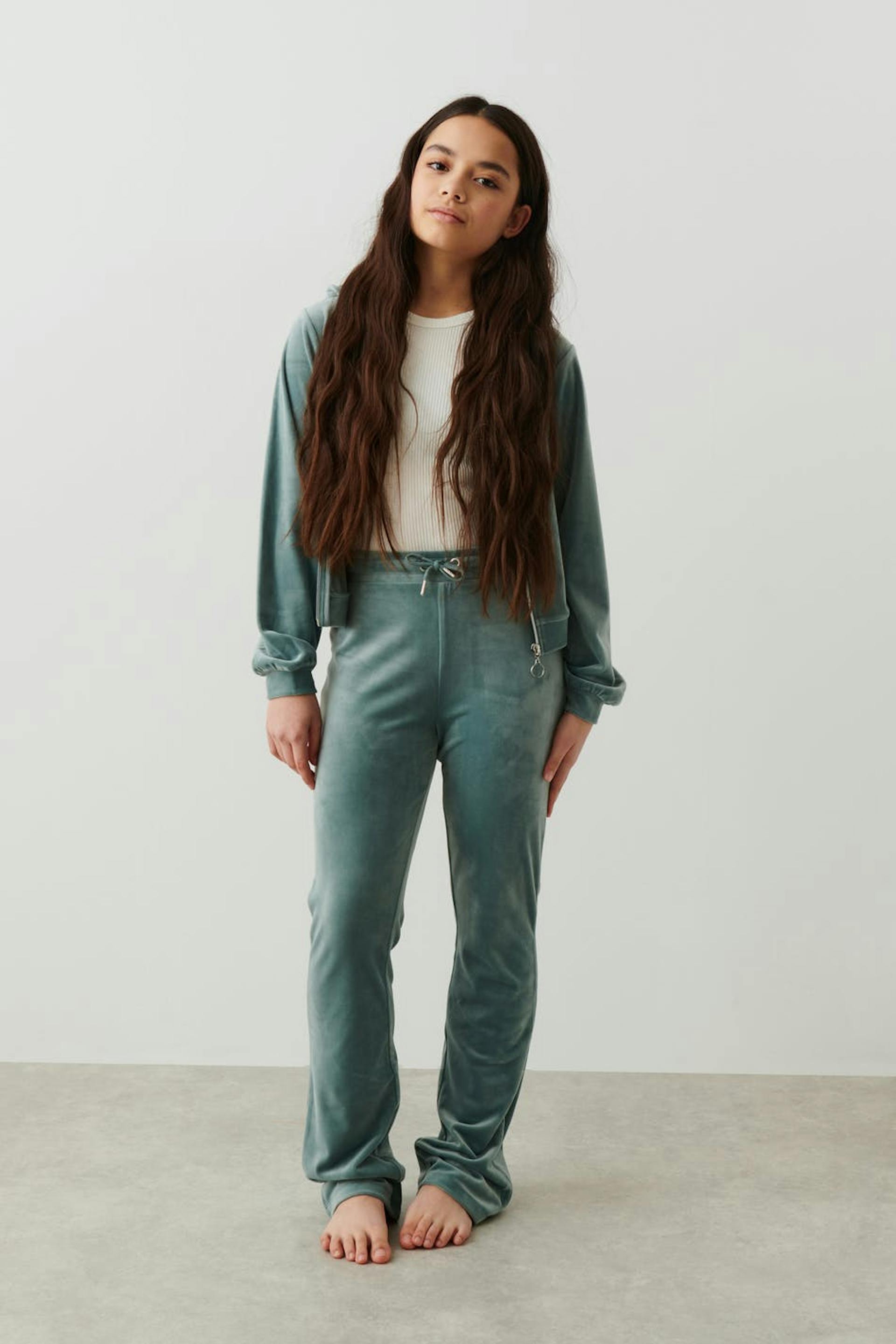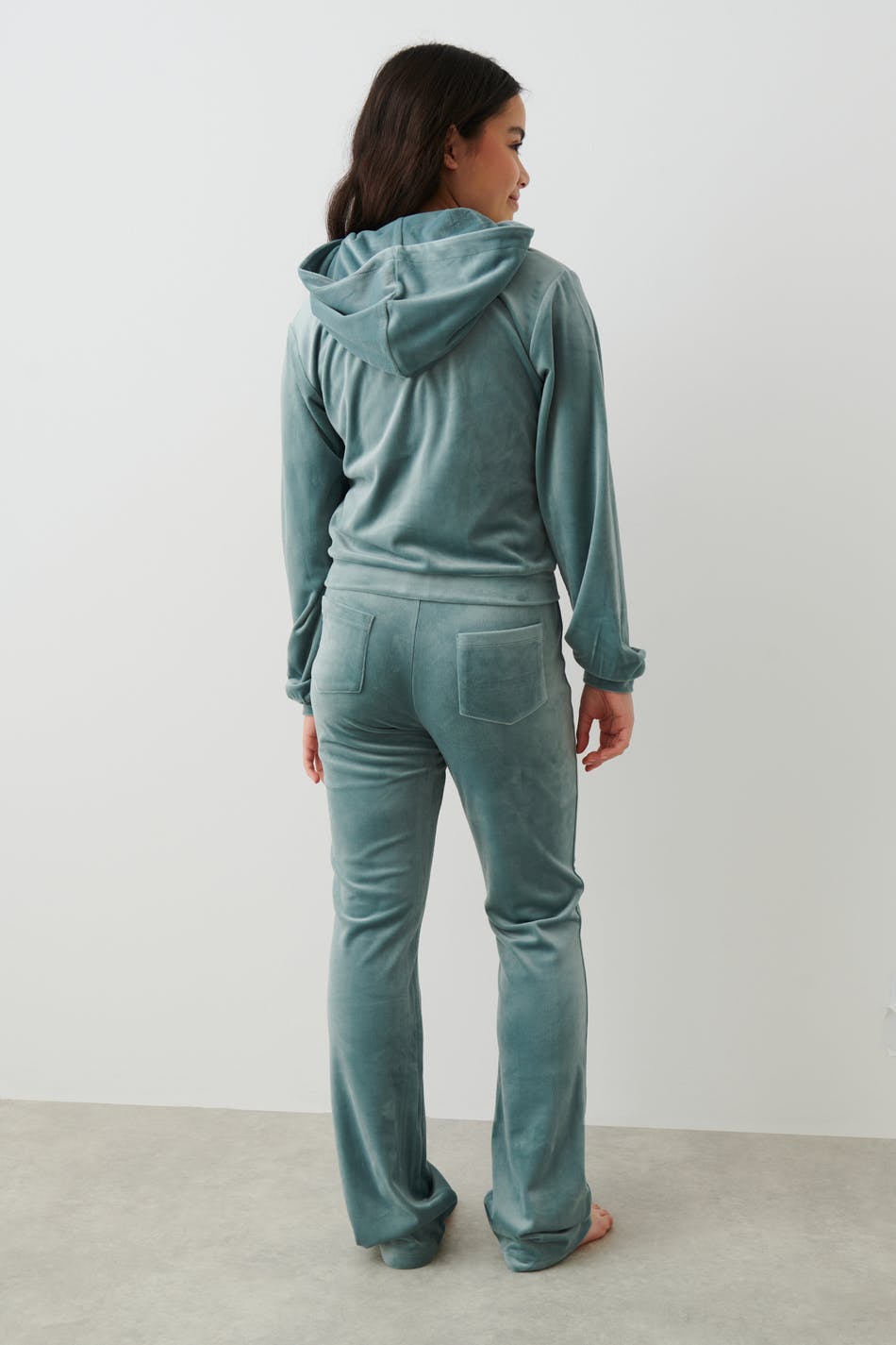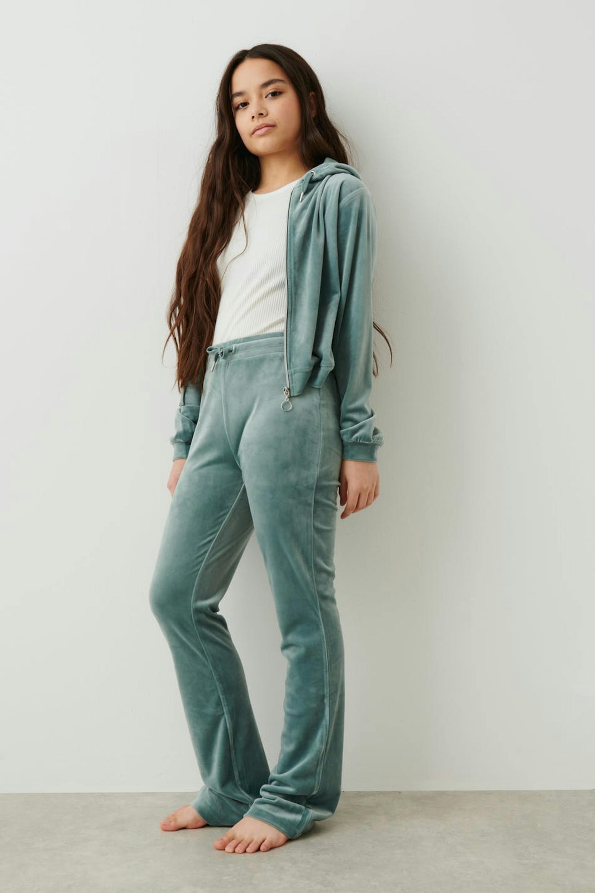 Weiche Jogginghosen aus Velours mit Gesäßtaschen. Die Hosen sind grün und haben einen elastischen Bund mit Bändern vorne.