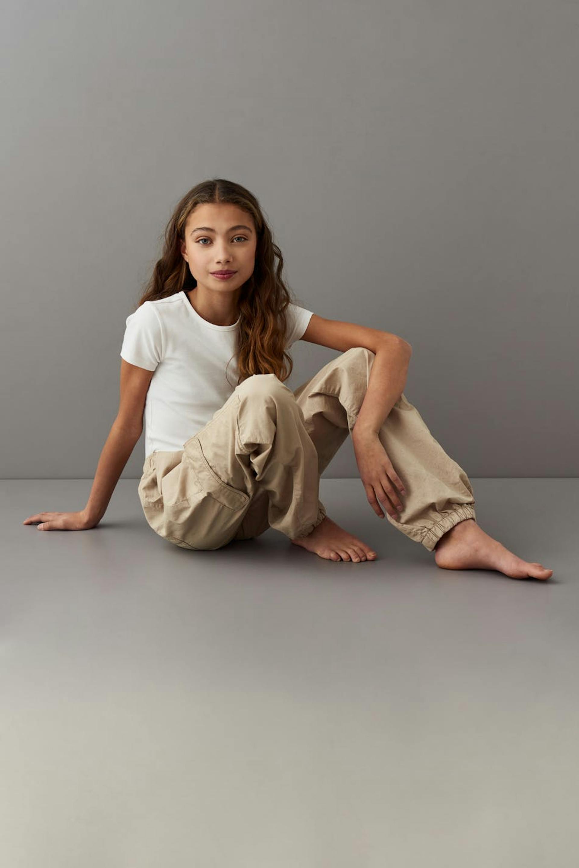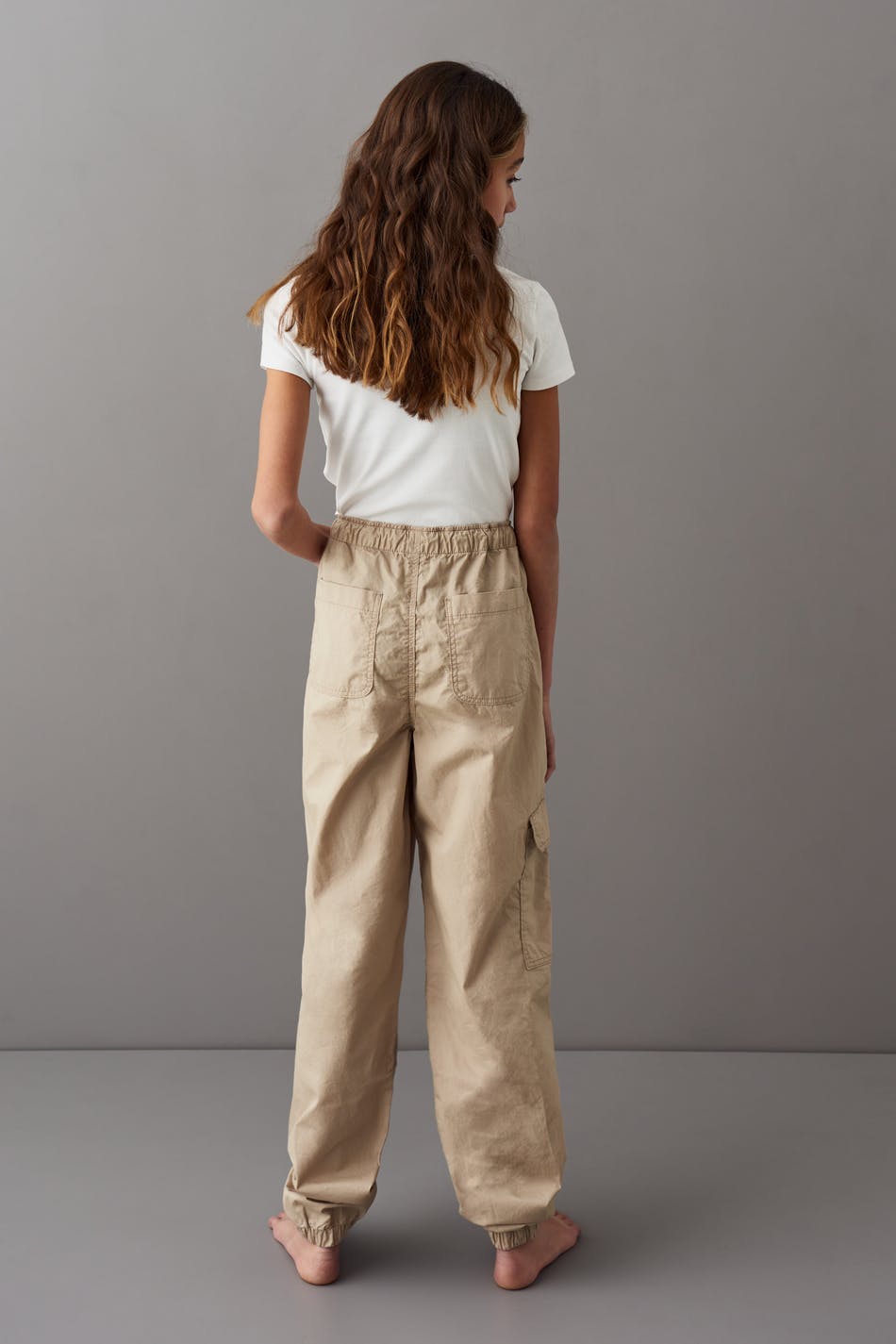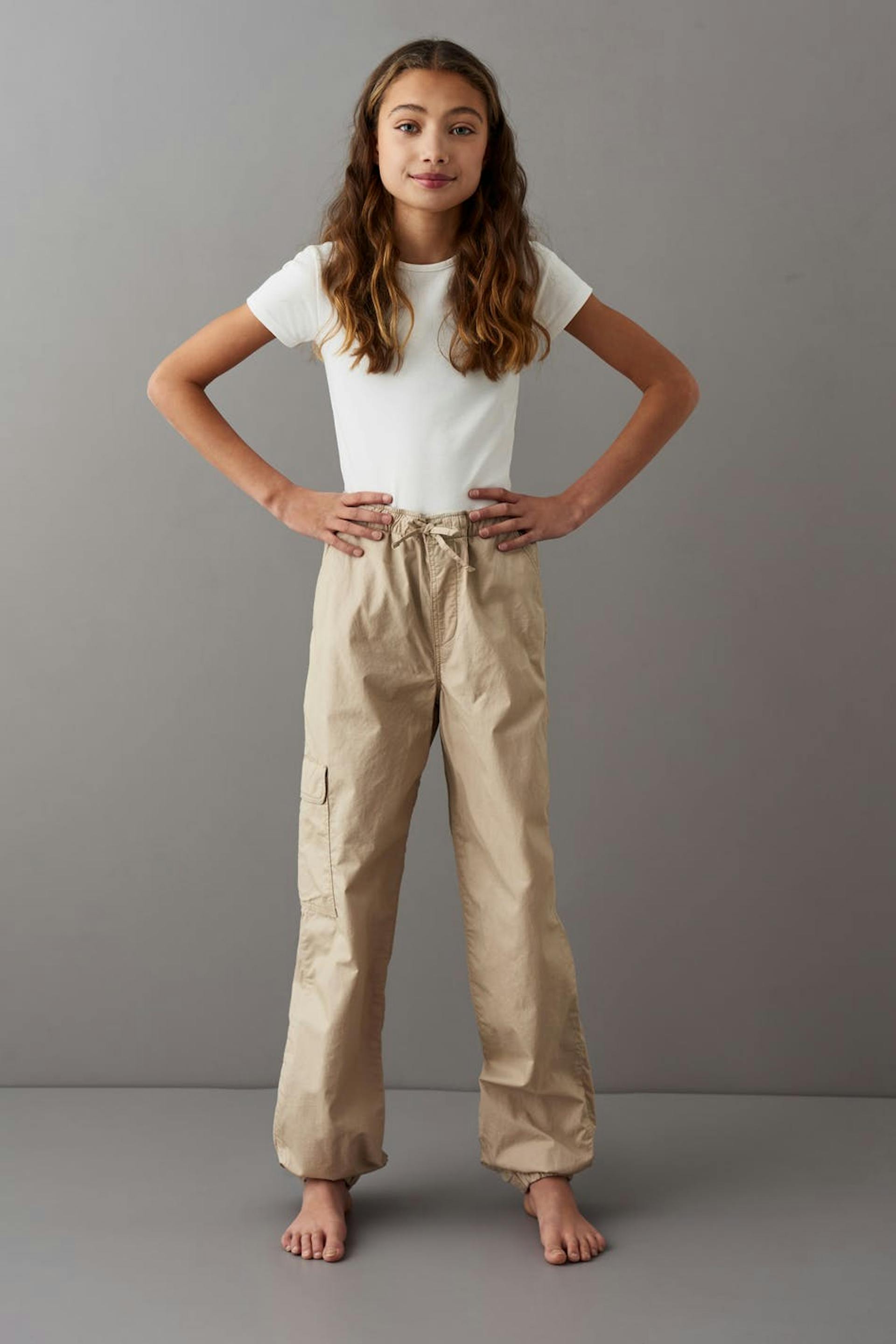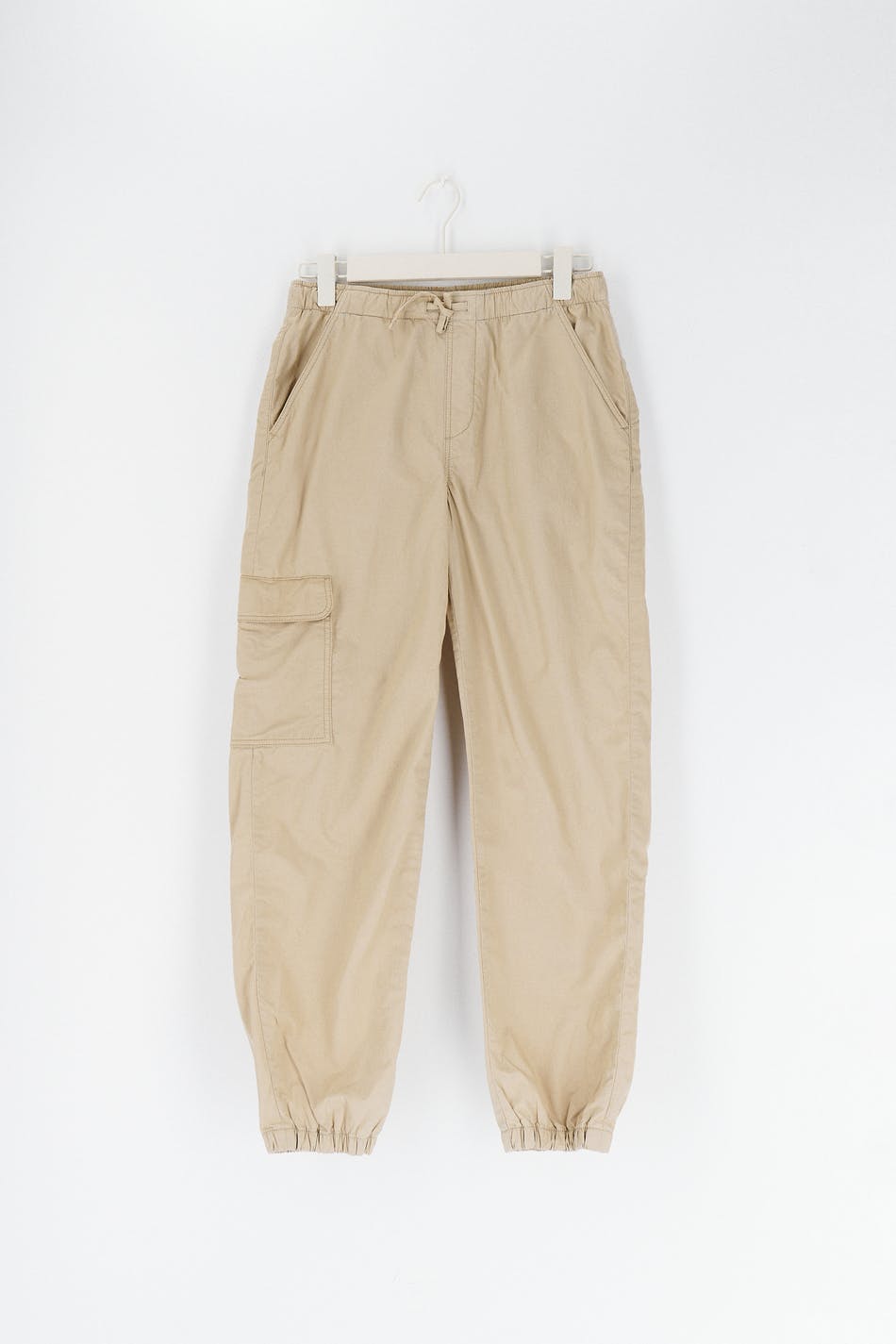 Fallschirmhose mit Cargodesign. Die Hose ist beige. Sie hat einen weit-geschnittenen Style mit voluminösen Hosenbeinen, eine Cargo-Tasche am Bein, Taschen vorne und hinten und Gummiband in der Taille und am Beinende.