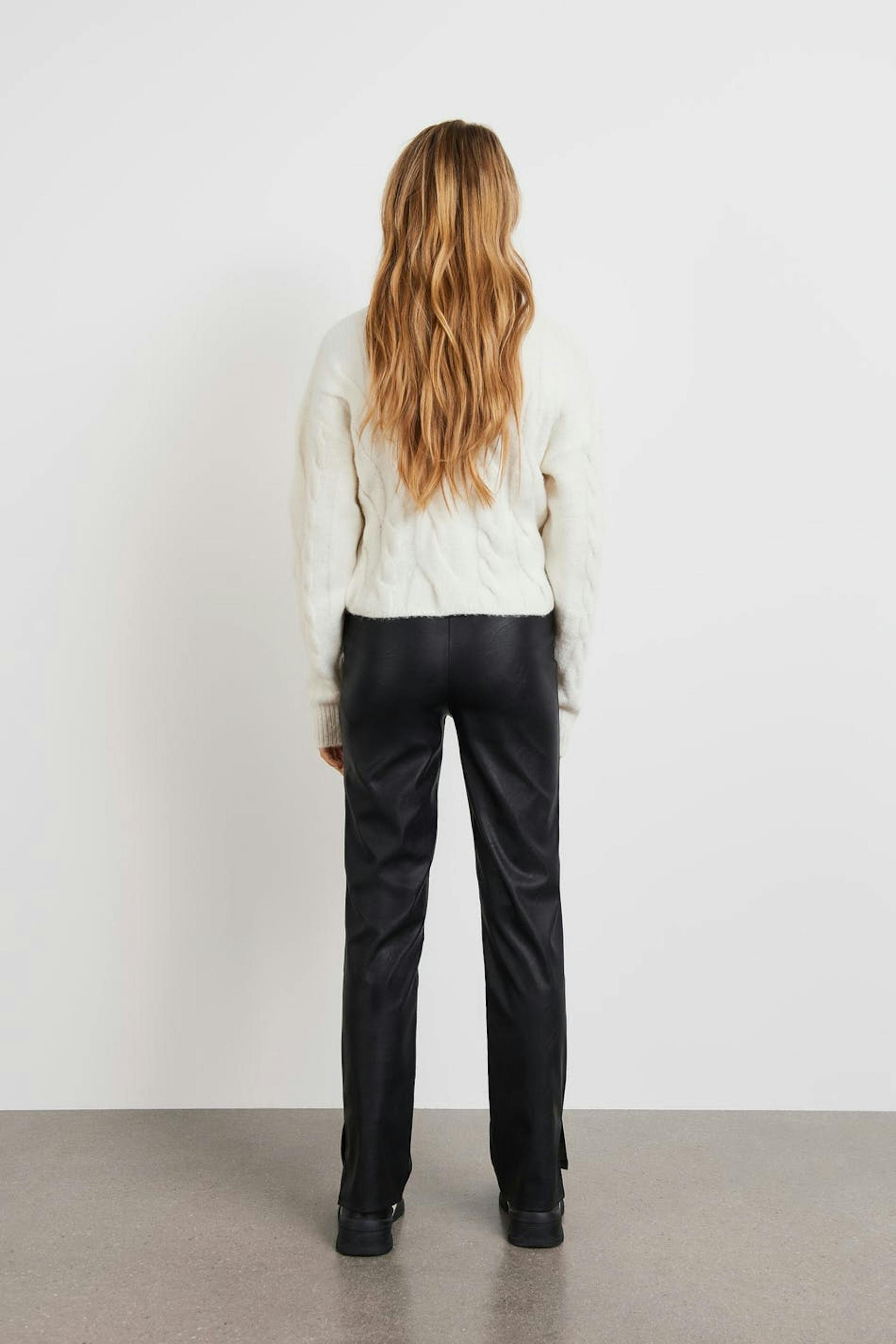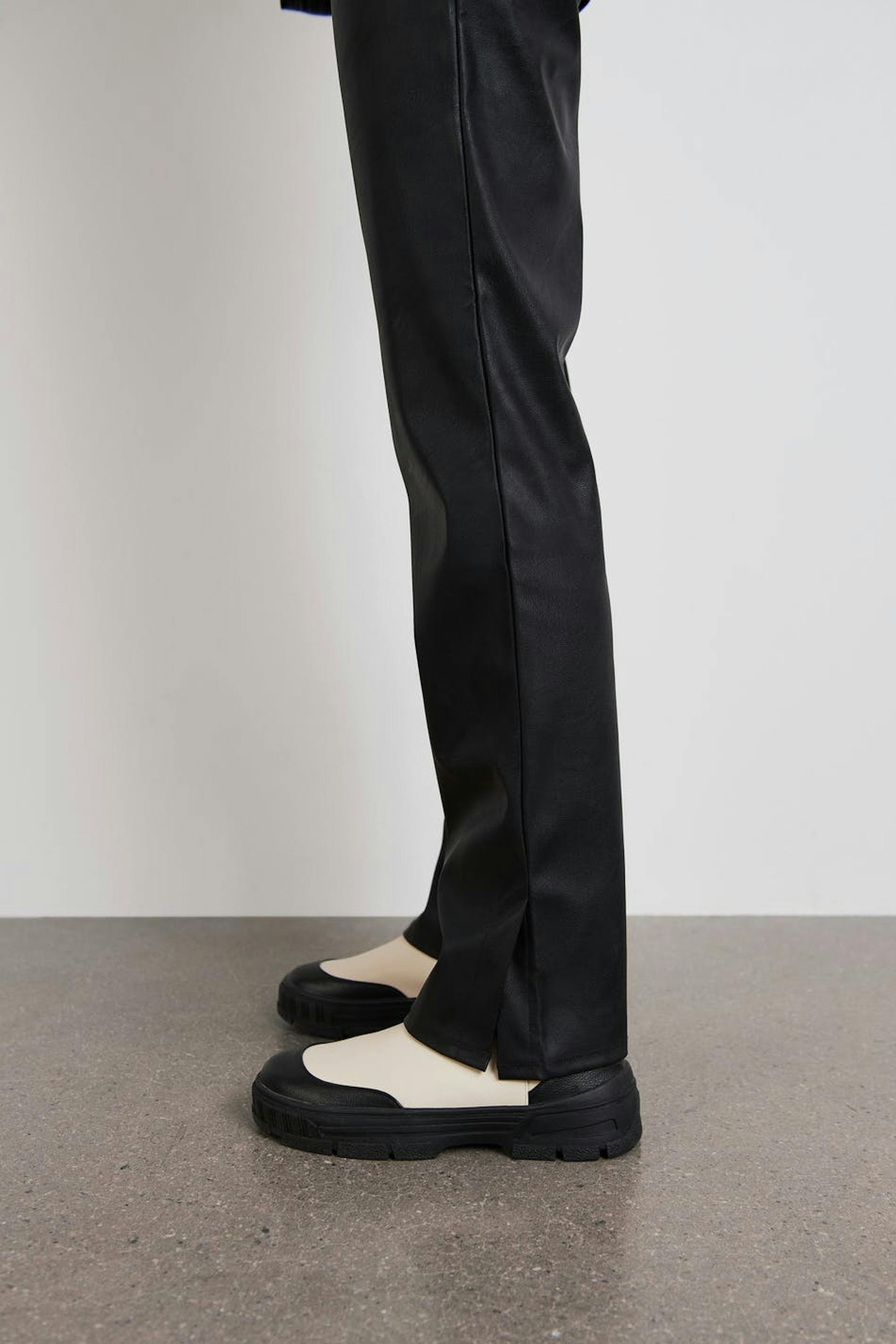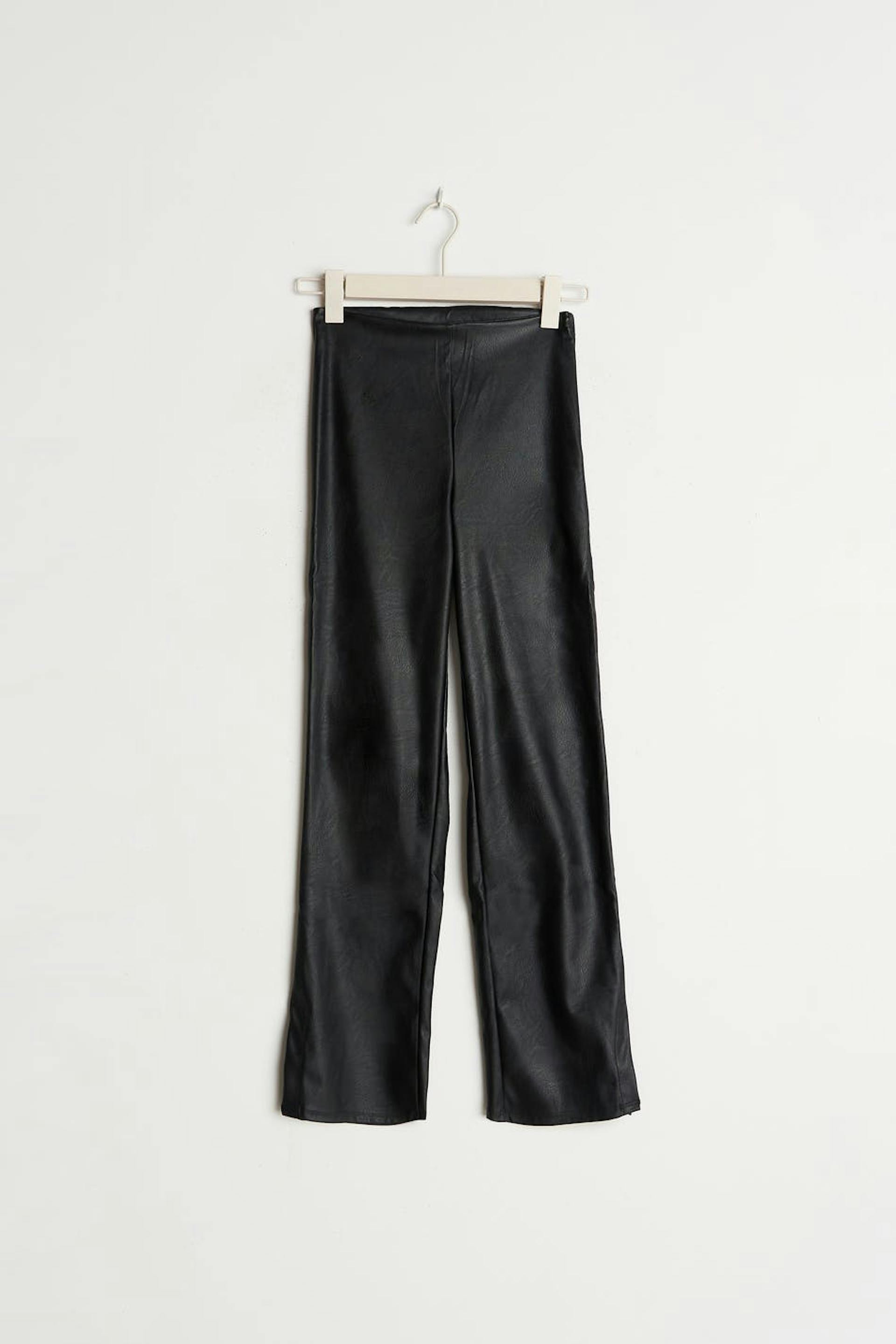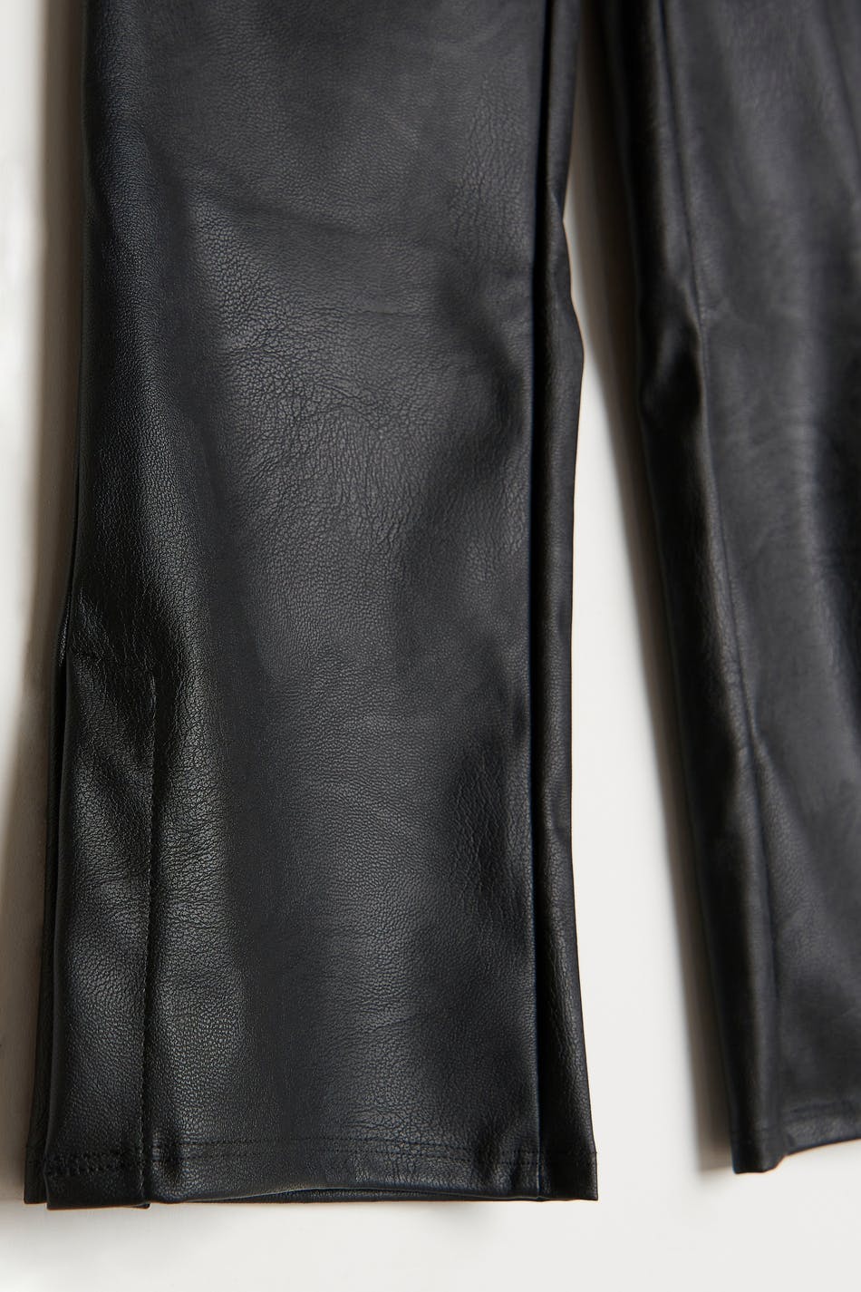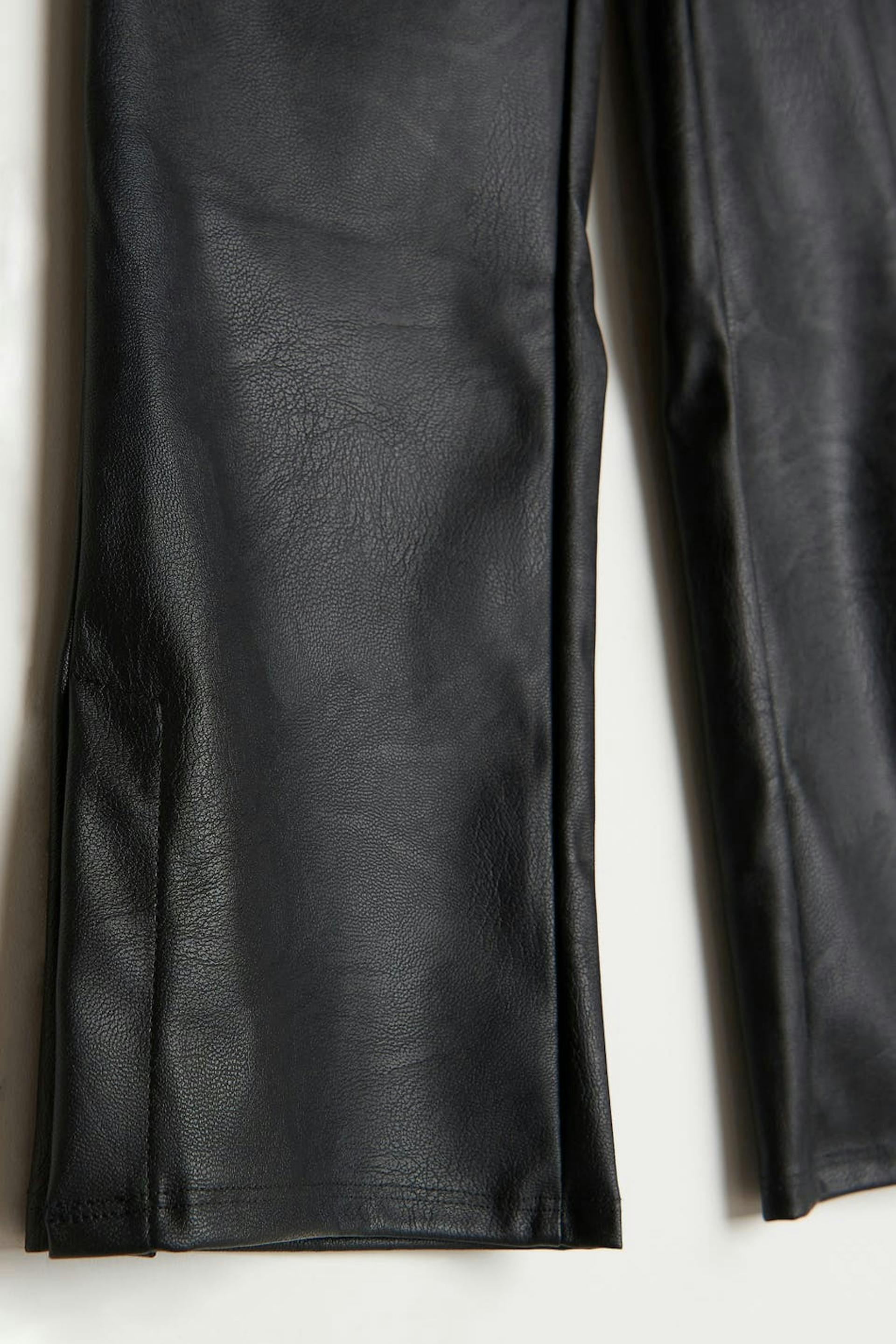 Hosen in Kunstleder mit einer taillierten Passform. Die Hosen sind schwarz und haben Schlitz am Beinende. Sie haben einen Reißverschluss in der Seitennaht.