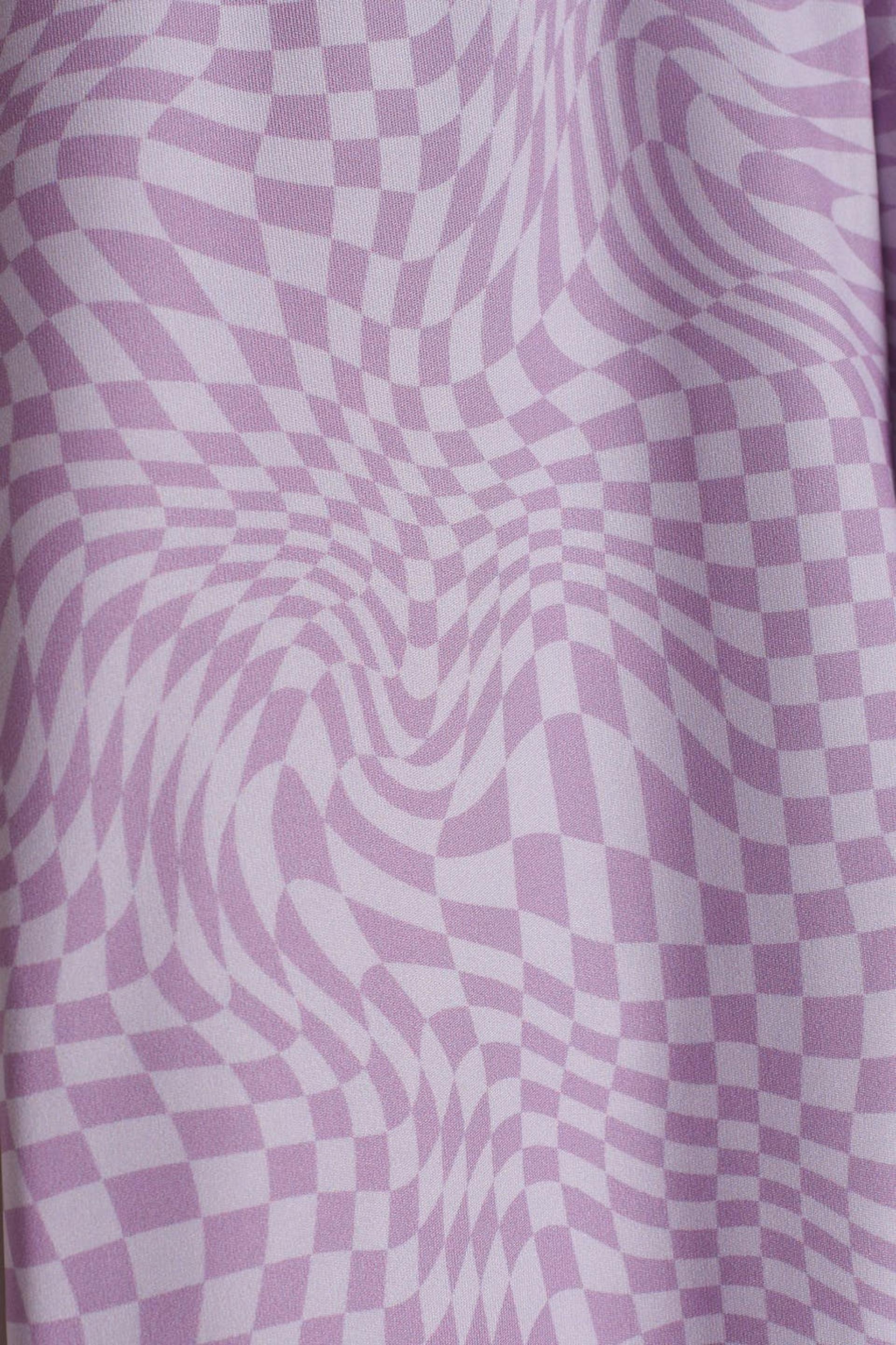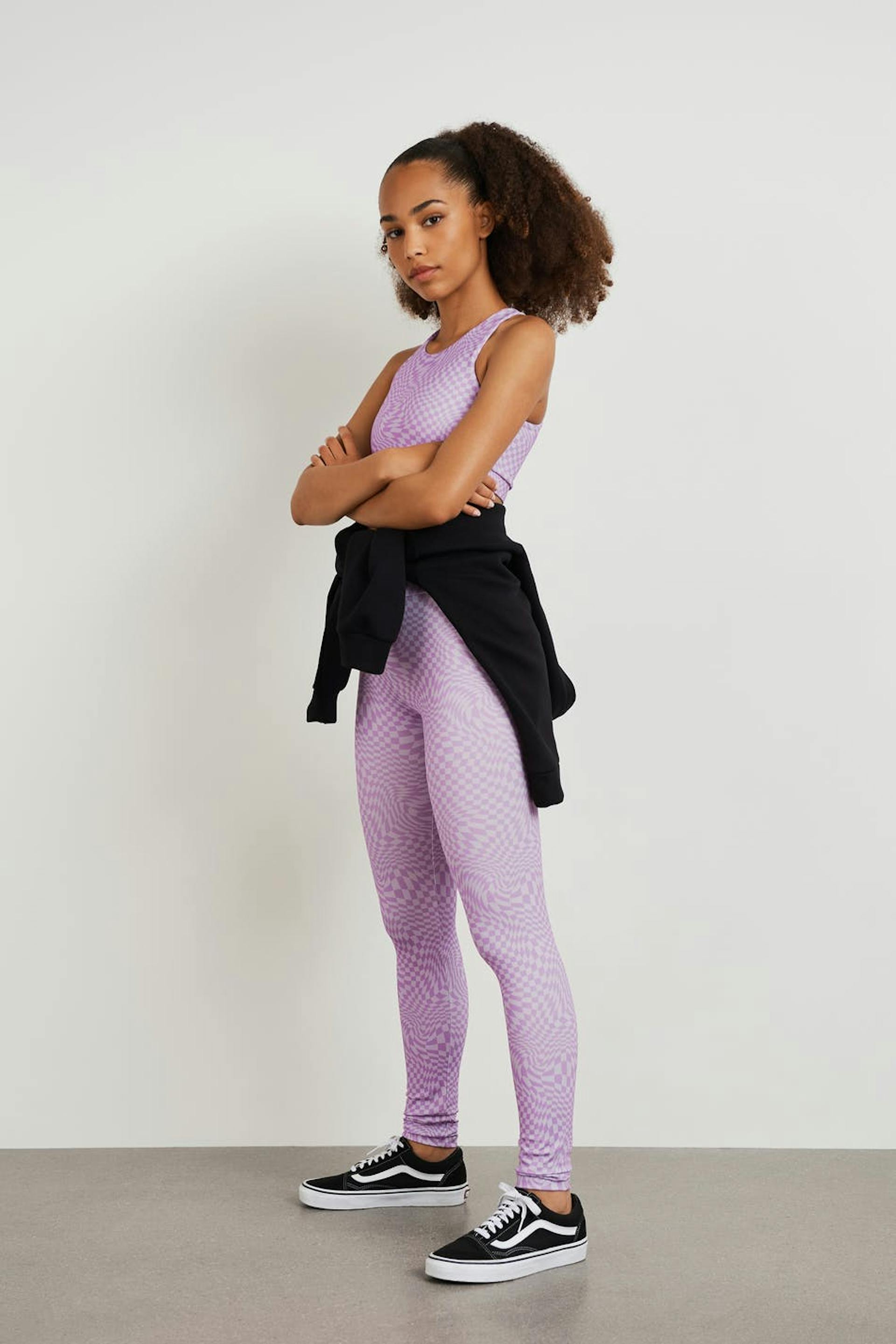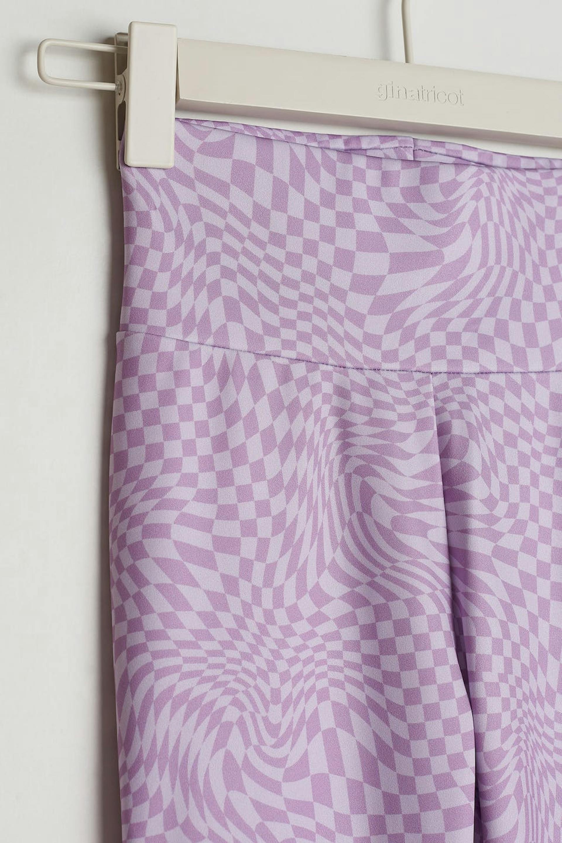 Bequeme Leggings von aus unserem Young-Sortiment mit einer taillierten Passform. Die Leggings sind lila und gemustert und haben ein glänzendes Material. Sie haben Comfort Stretch, ein Gummiband in der Taille und Hosenbeine mit einer voller Länge.