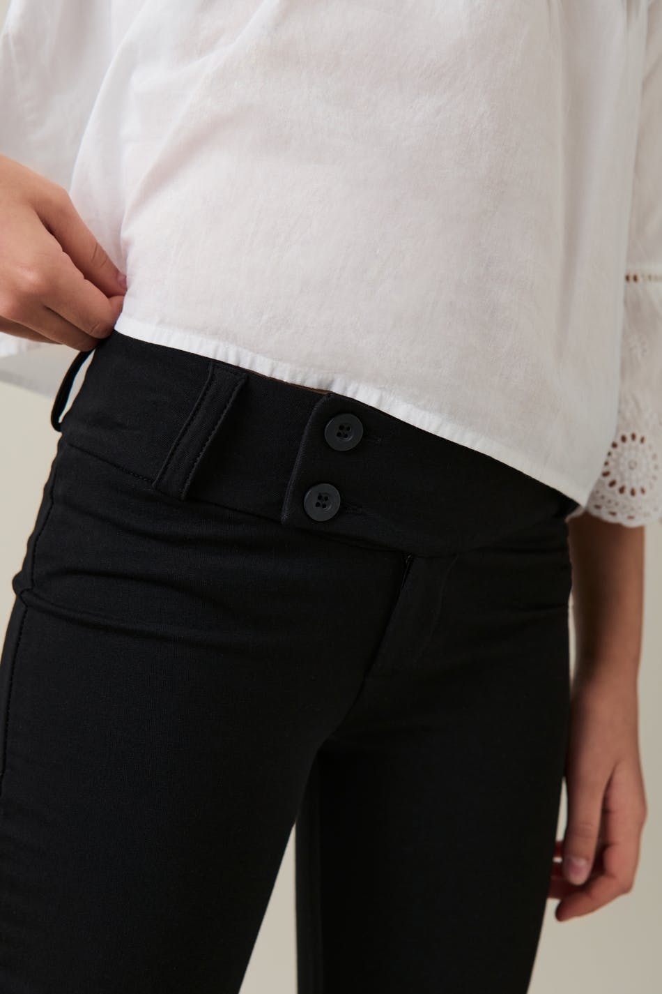 Ausgestellte Hosen aus Jersey mit tiefer Taille. Die Hosen sind schwarz und haben breiten Bund. Sie haben Reißverschluss und doppelte Knöpfe vorne.