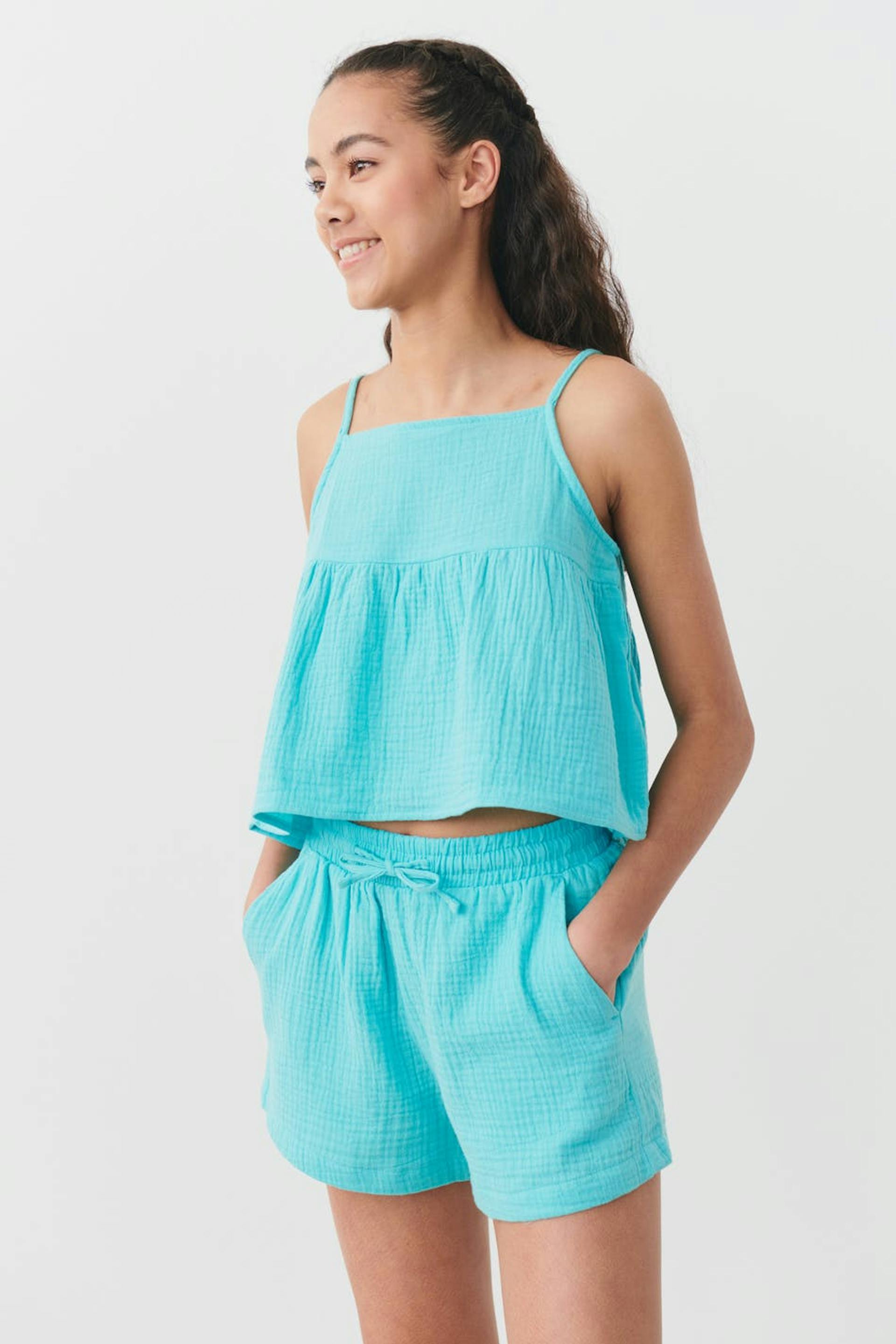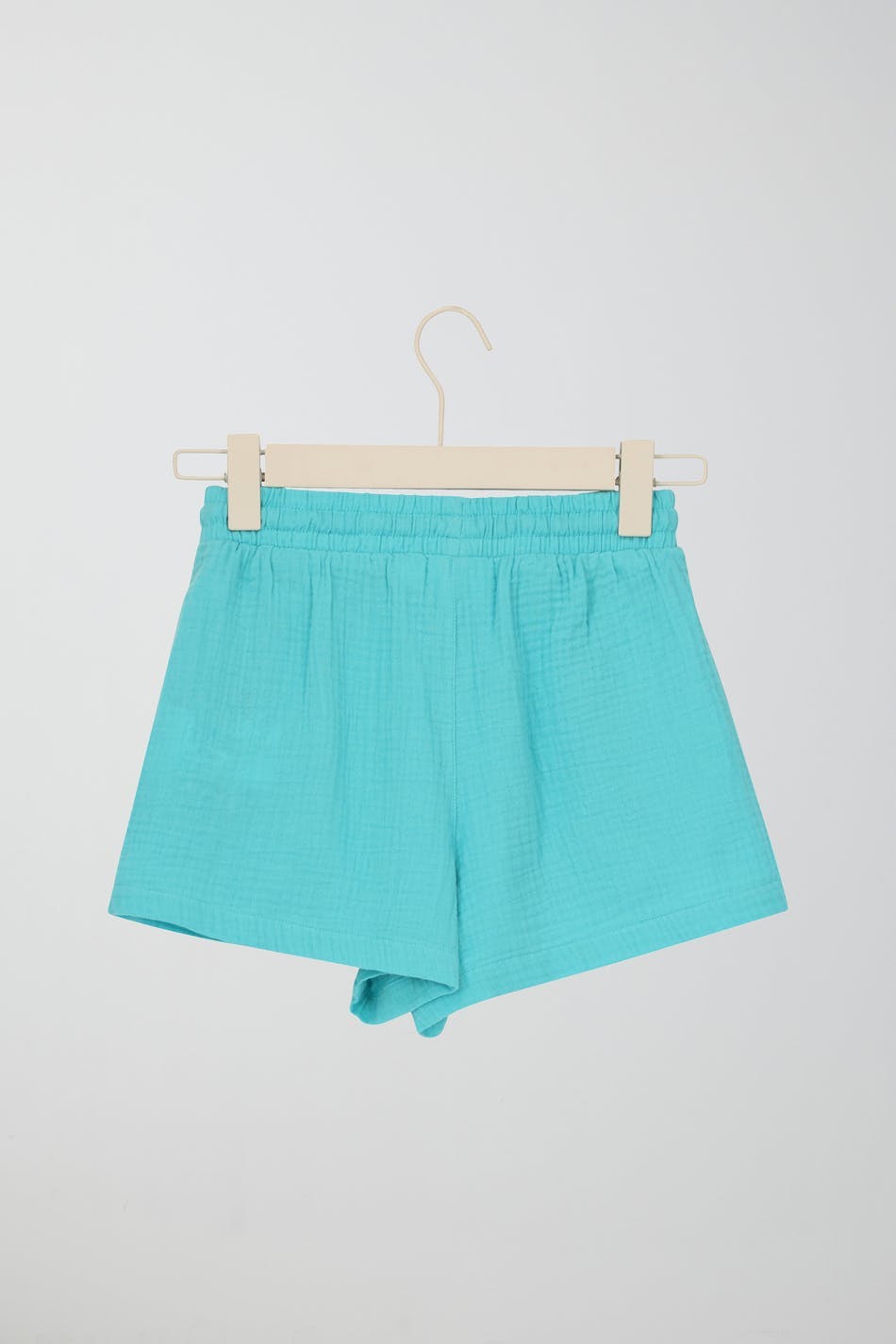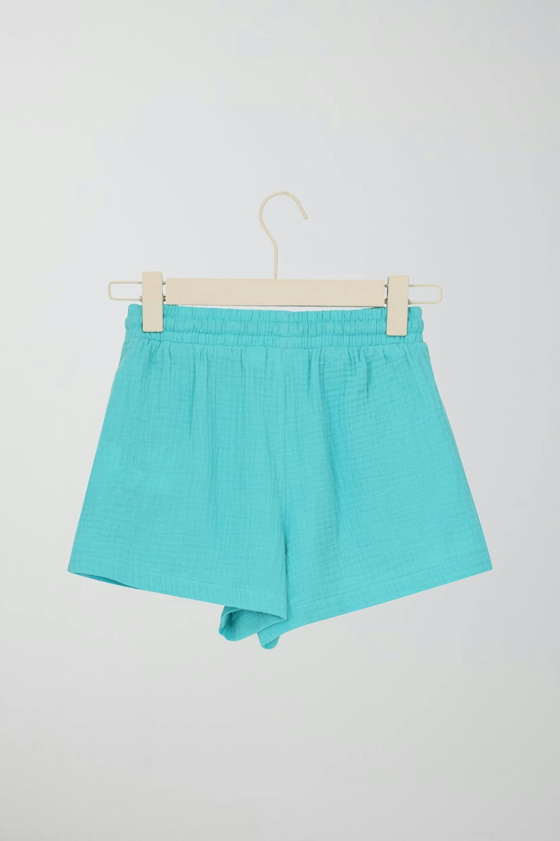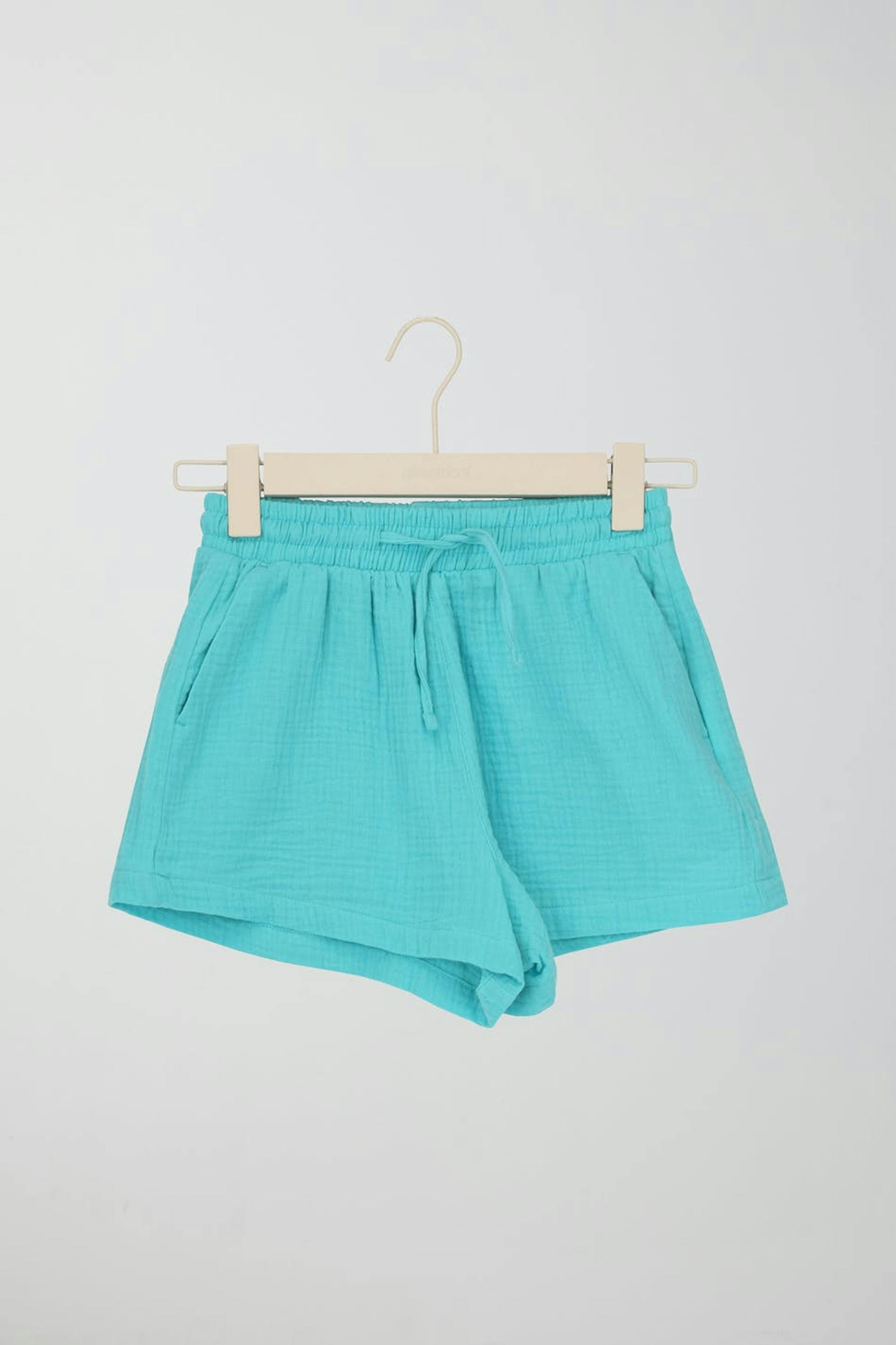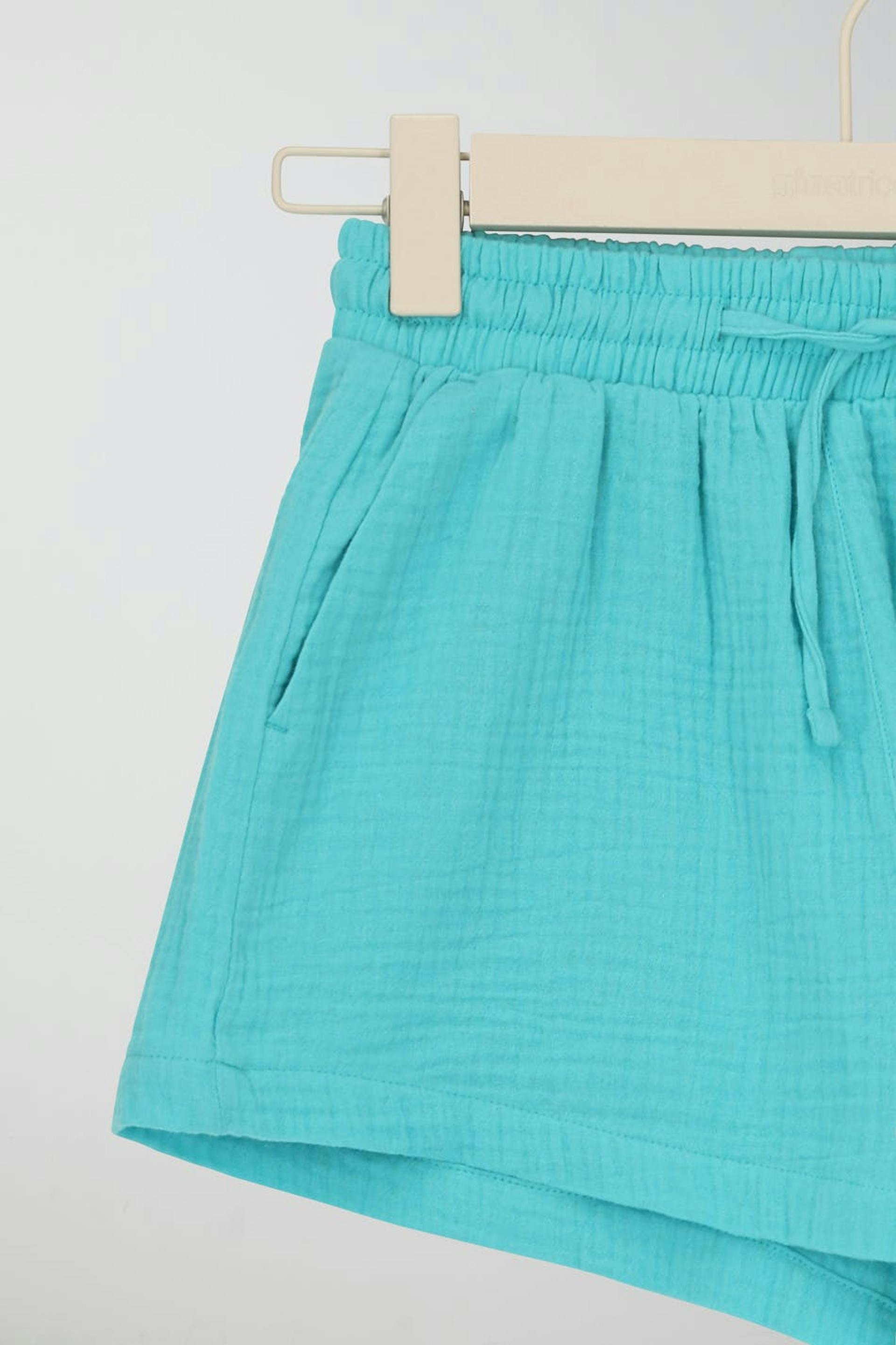 Shorts von Gina Tricot Young mit strukturierter, weicher doppelgewebter Baumwollqualität. Die Shorts sind blau und haben einen weit-geschnittenen Style. Sie haben Gummiband in der Taille mit Selbstbindung vorne und Taschen in den Seiten.