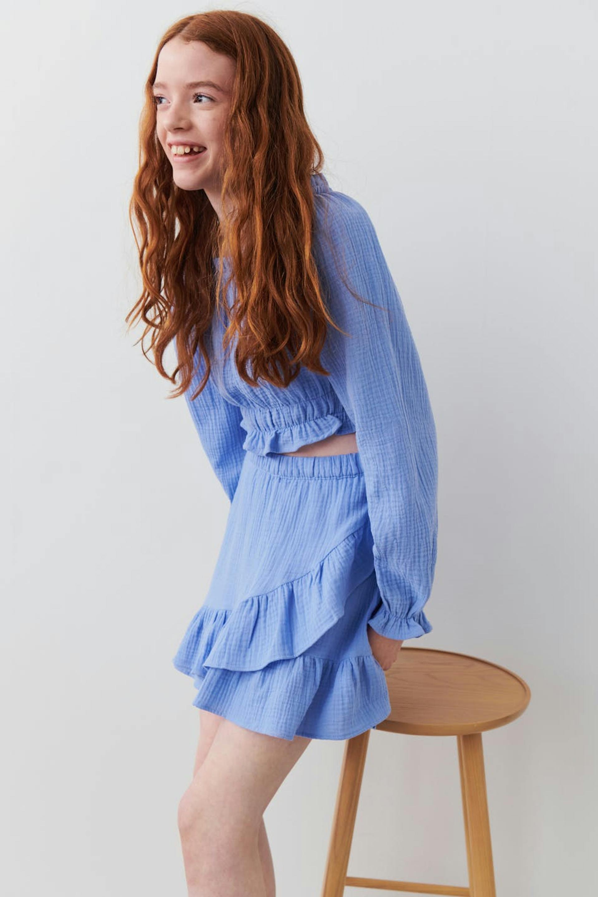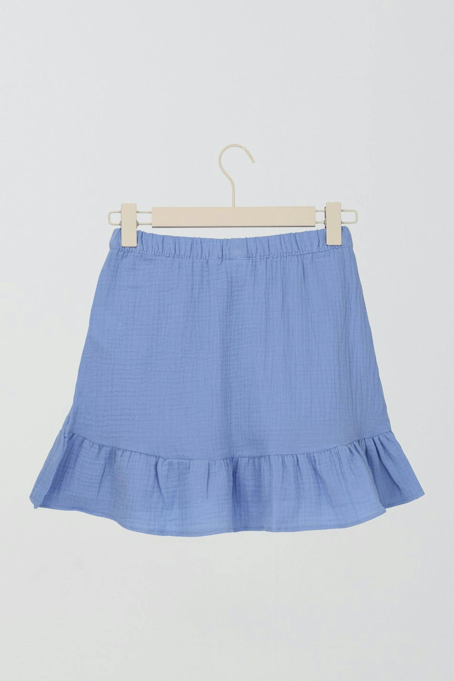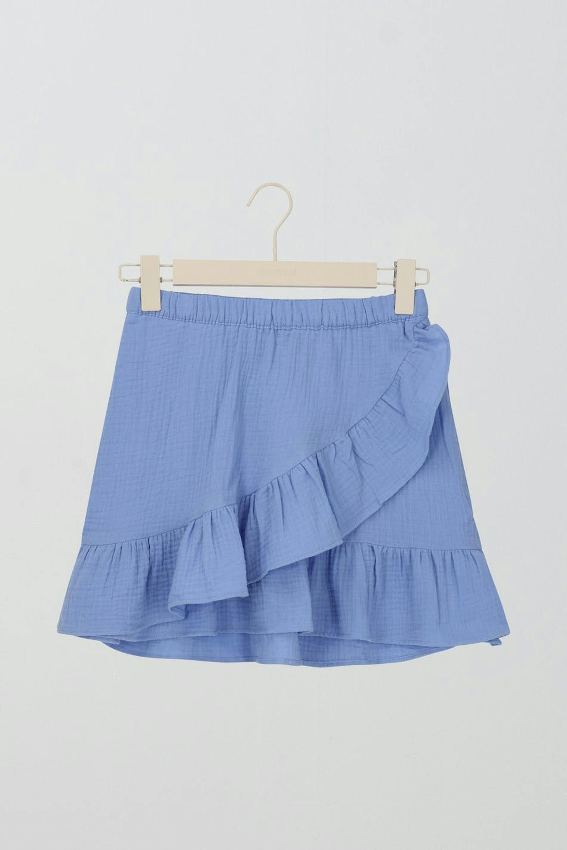Rüschenrock von Gina Tricot Young mit strukturierter, weicher doppelgewebter Baumwollqualität. Der Rock ist blau und hat ein Wickel-Design mit Rüschenkante unten. Er hat Gummiband in der Taille.