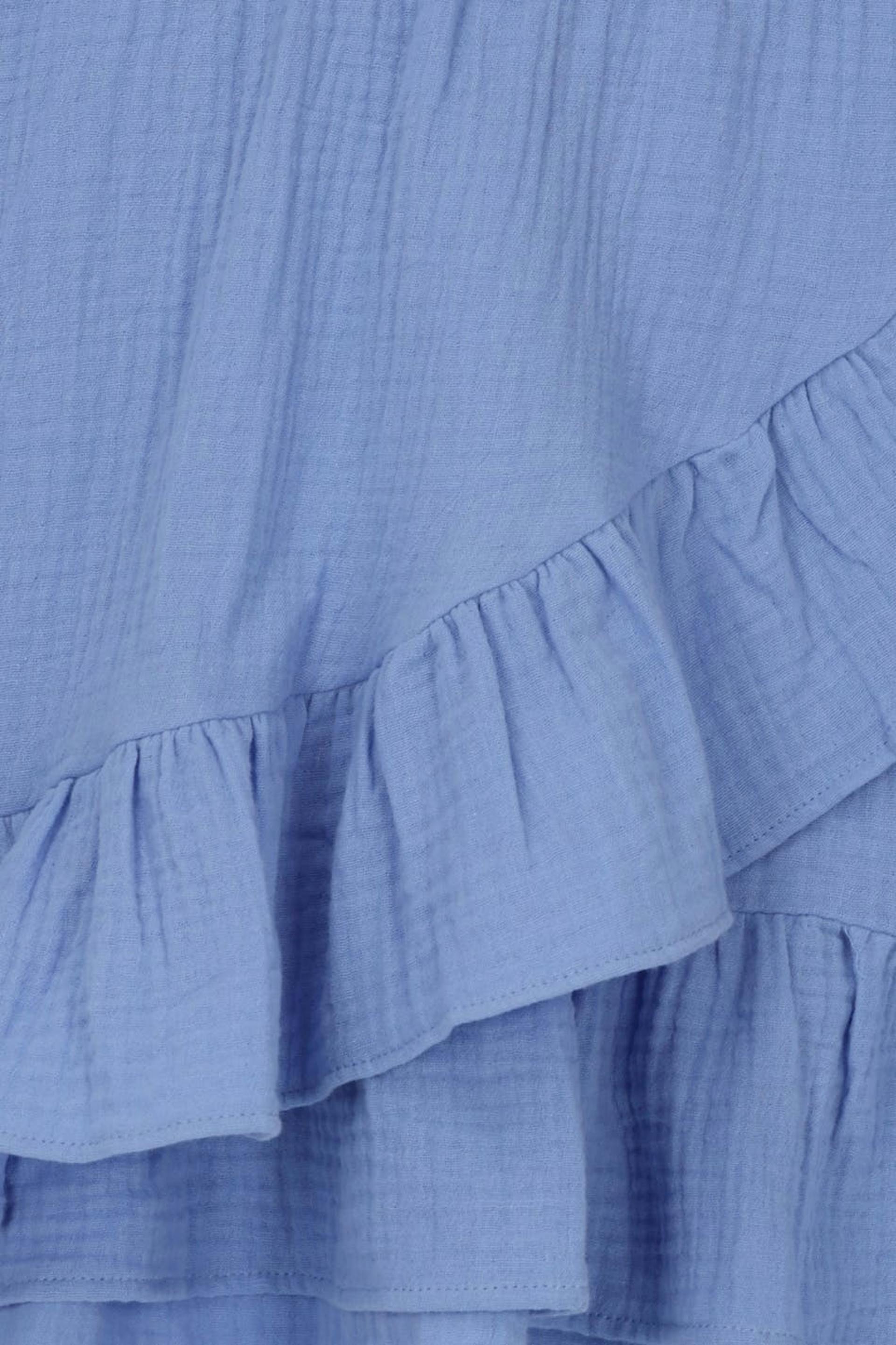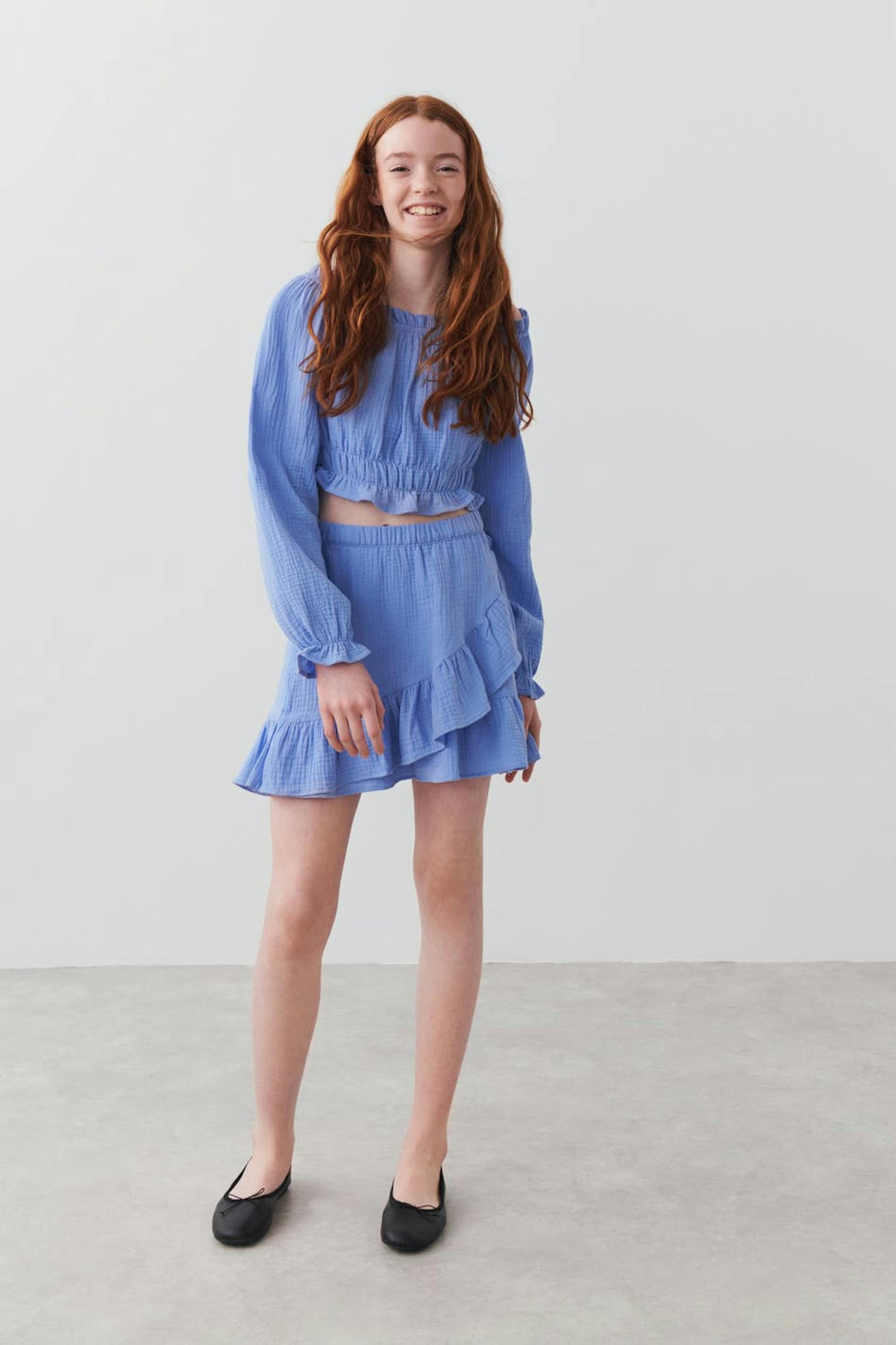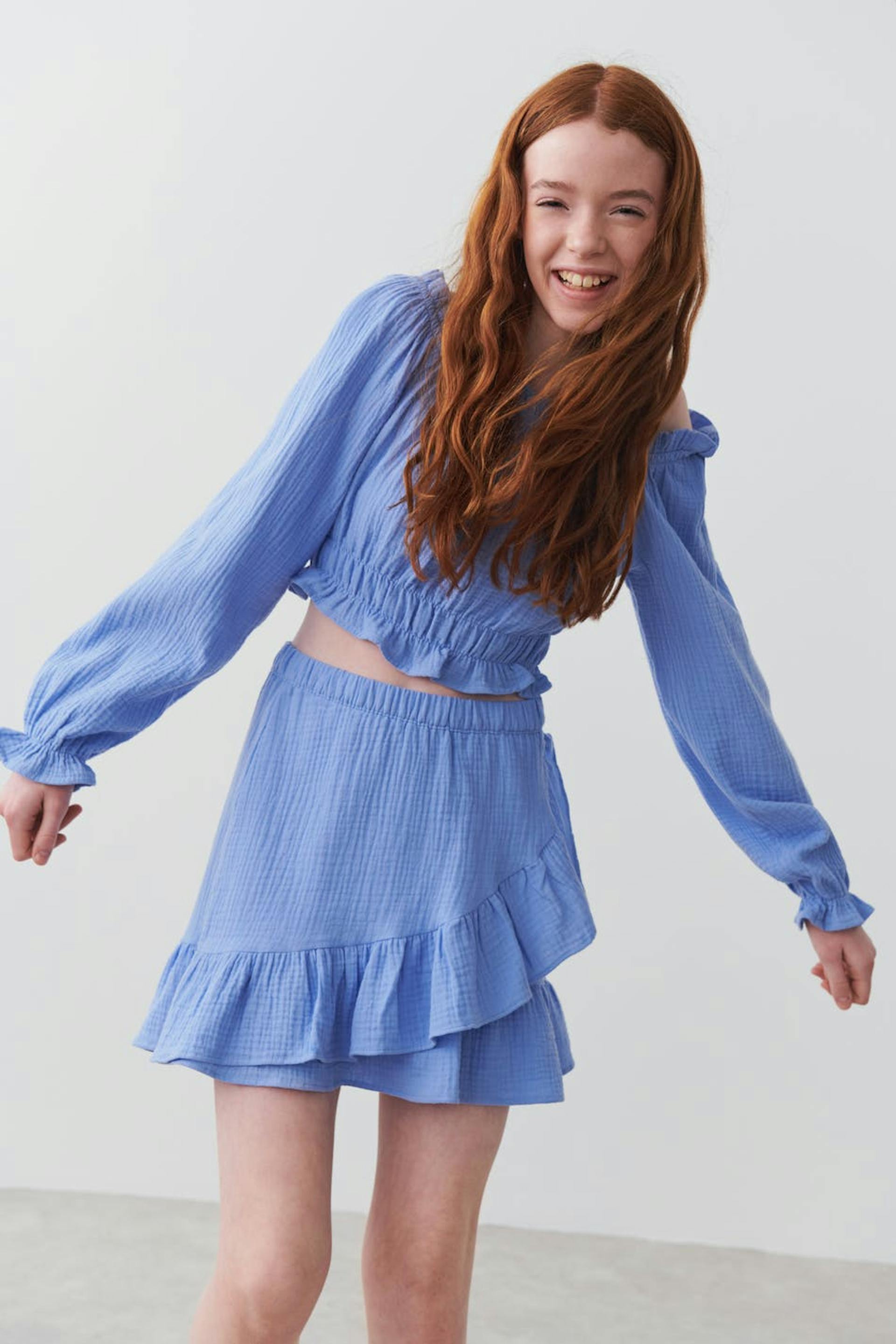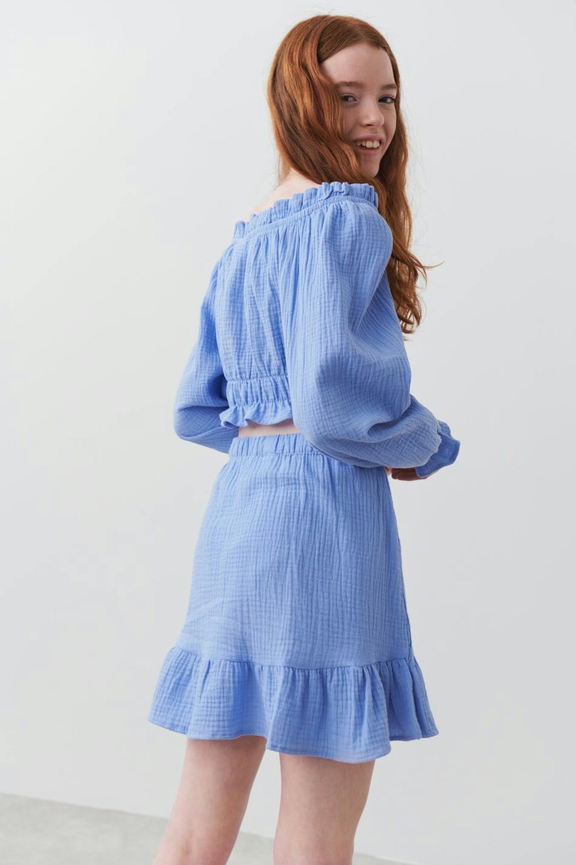 Rüschenrock von Gina Tricot Young mit strukturierter, weicher doppelgewebter Baumwollqualität. Der Rock ist blau und hat ein Wickel-Design mit Rüschenkante unten. Er hat Gummiband in der Taille.