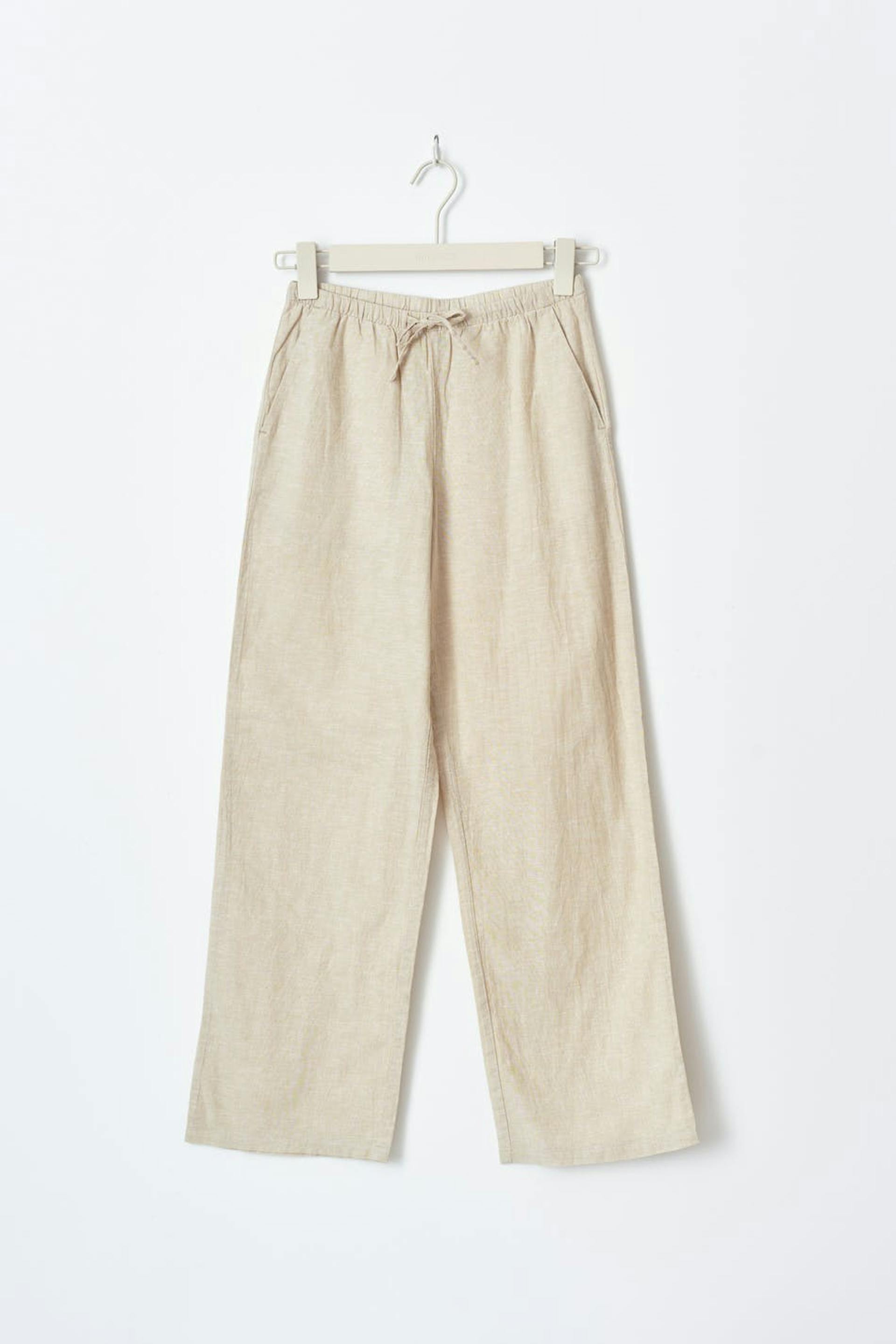 Leinenhosen mit lockerer Passform. Die Leinenhosen sind beige und haben eine weiche, gewebte Qualität. Sie haben breite Beine, Seitentaschen und Gummiband in der Taille mit Selbstbindung vorne.
