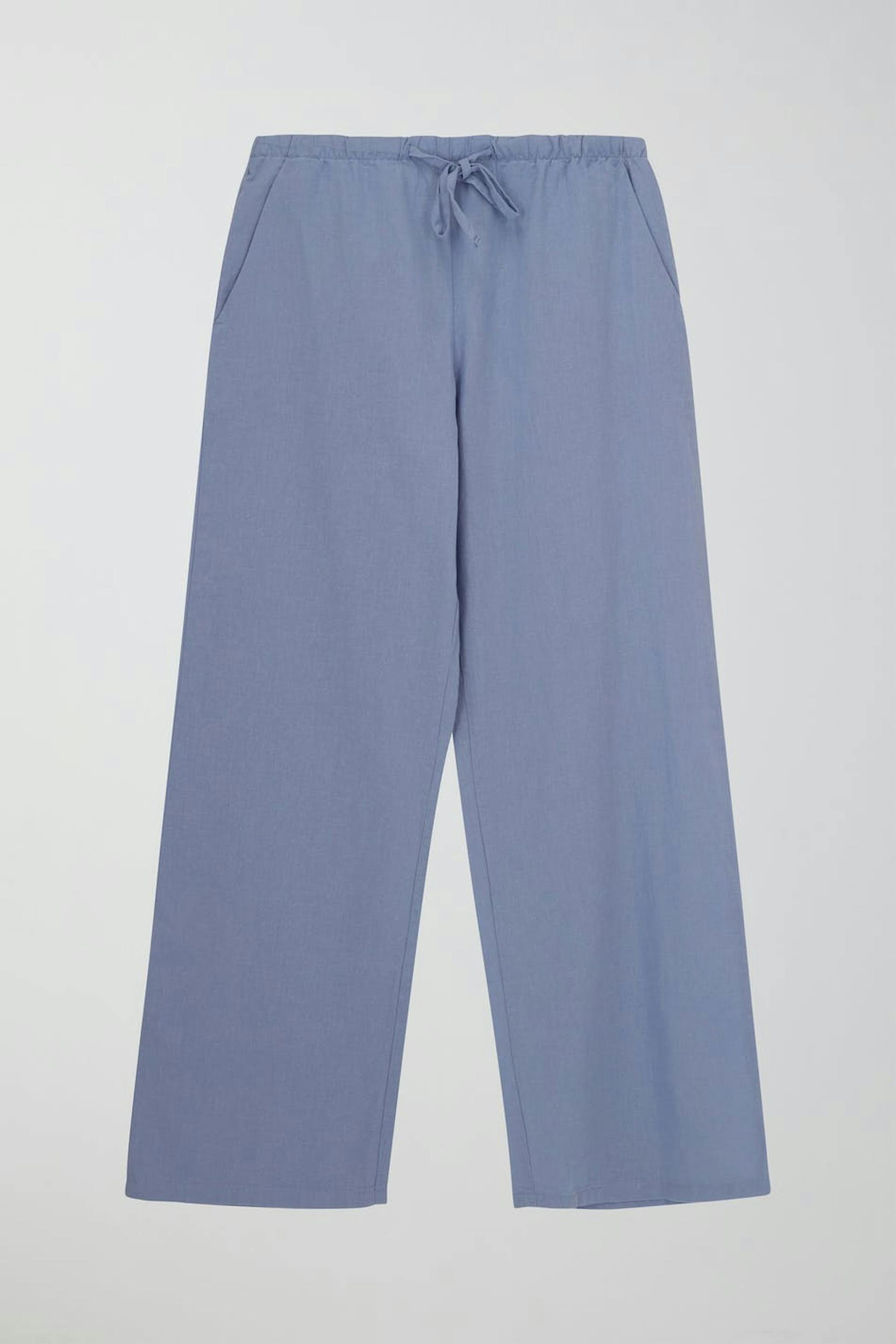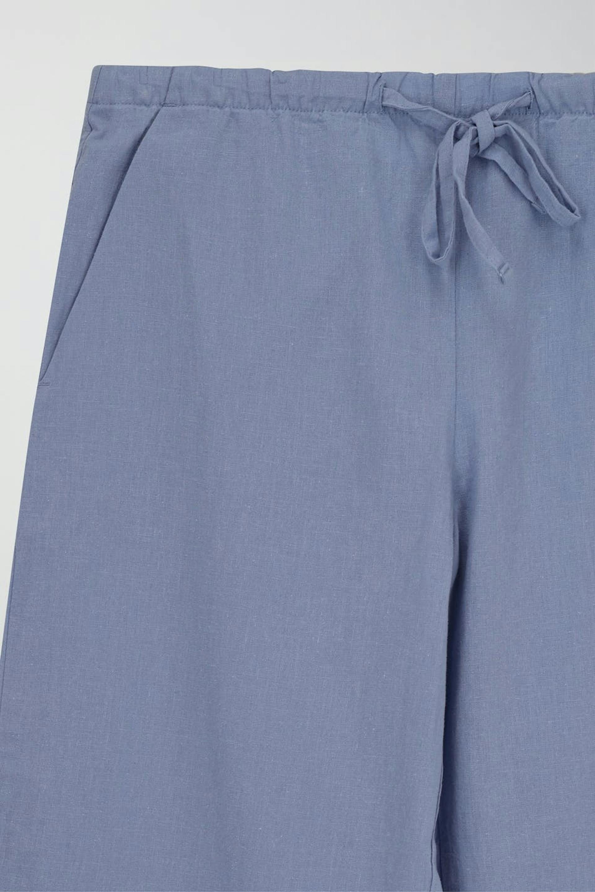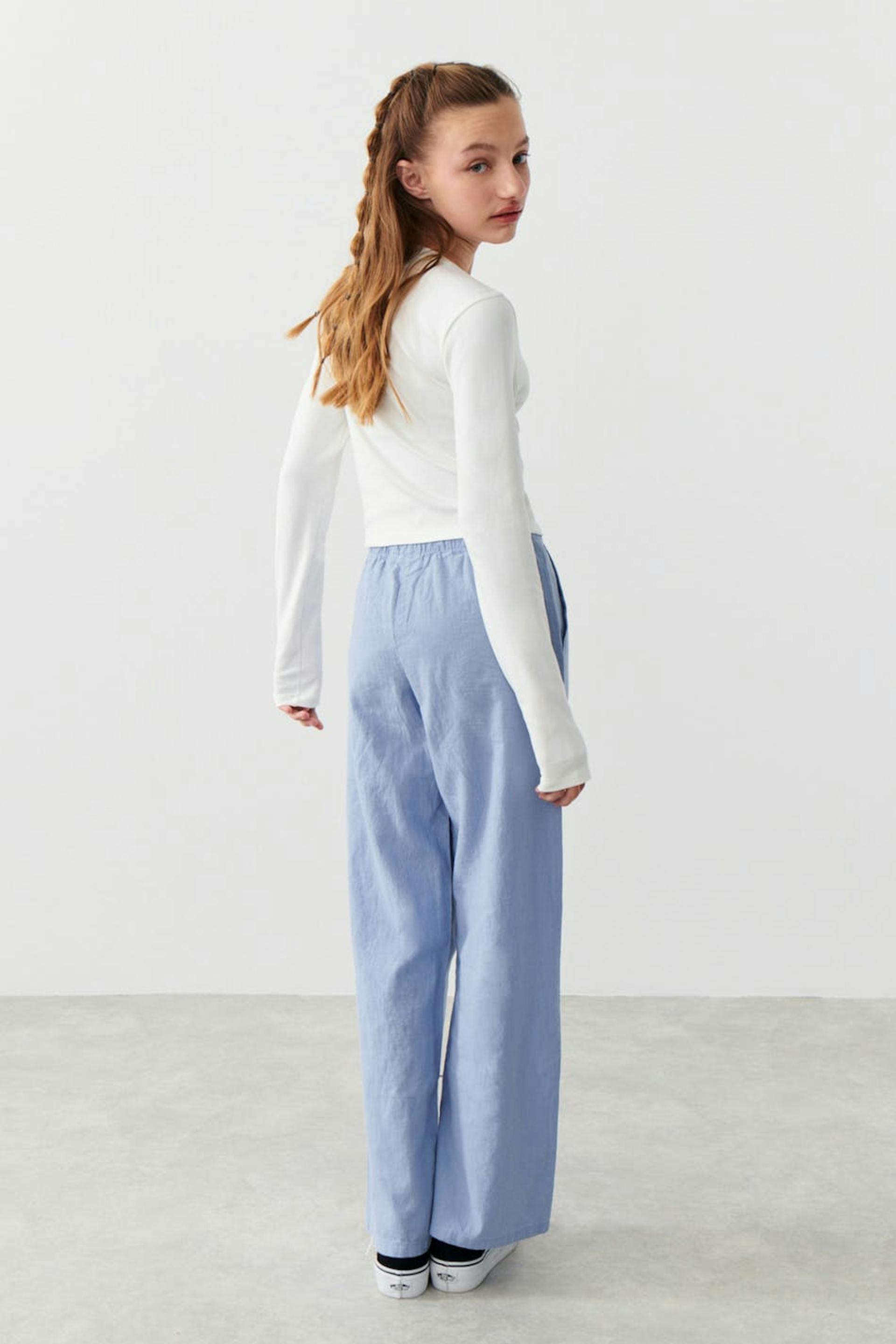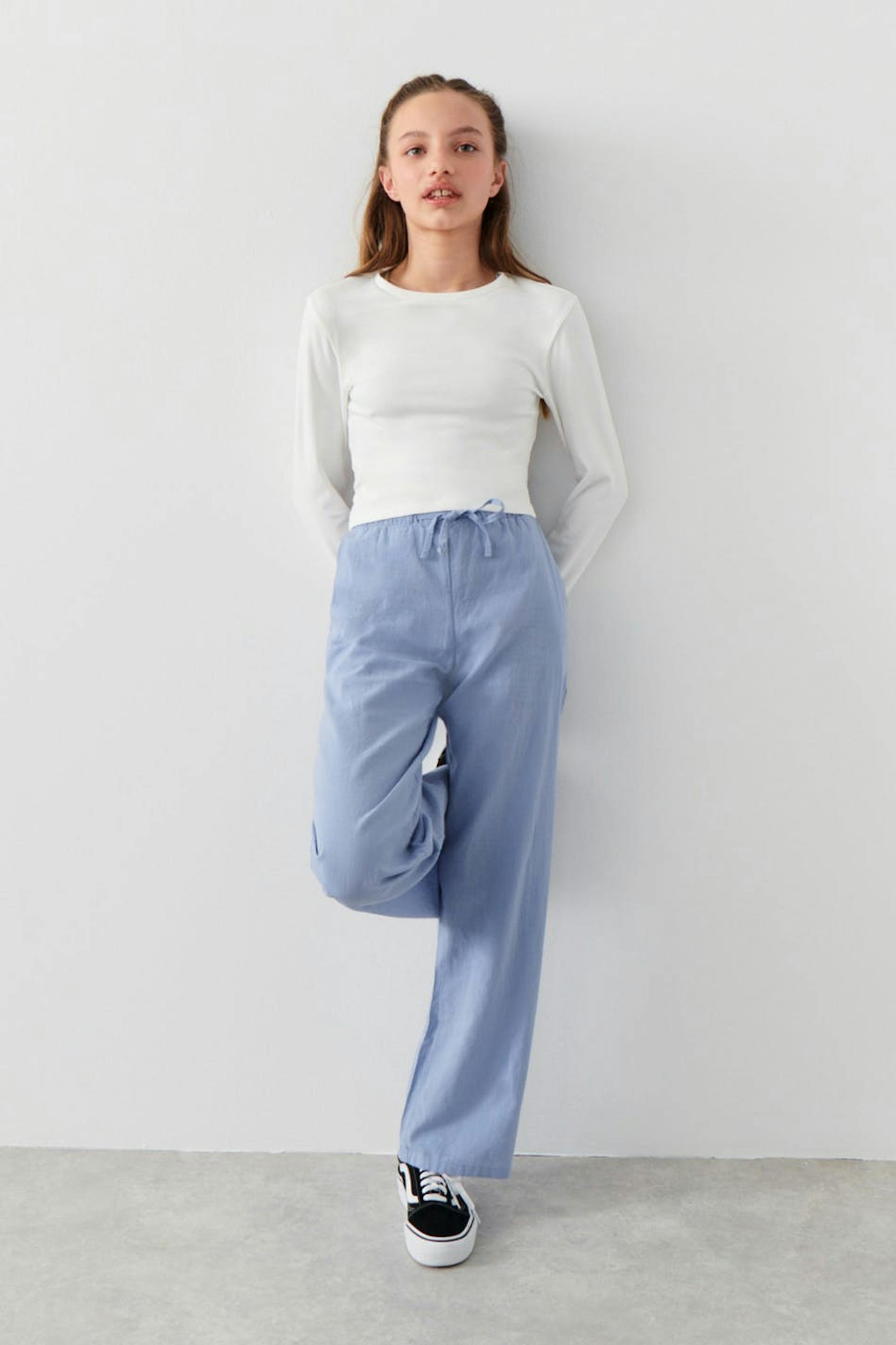 Leinenhosen von Gina Tricot Young mit lockerer Passform. Die Leinenhosen sind blau und haben eine weiche, gewebte Qualität. Sie haben breite Beine, Seitentaschen und Gummiband in der Taille mit Selbstbindung vorne.